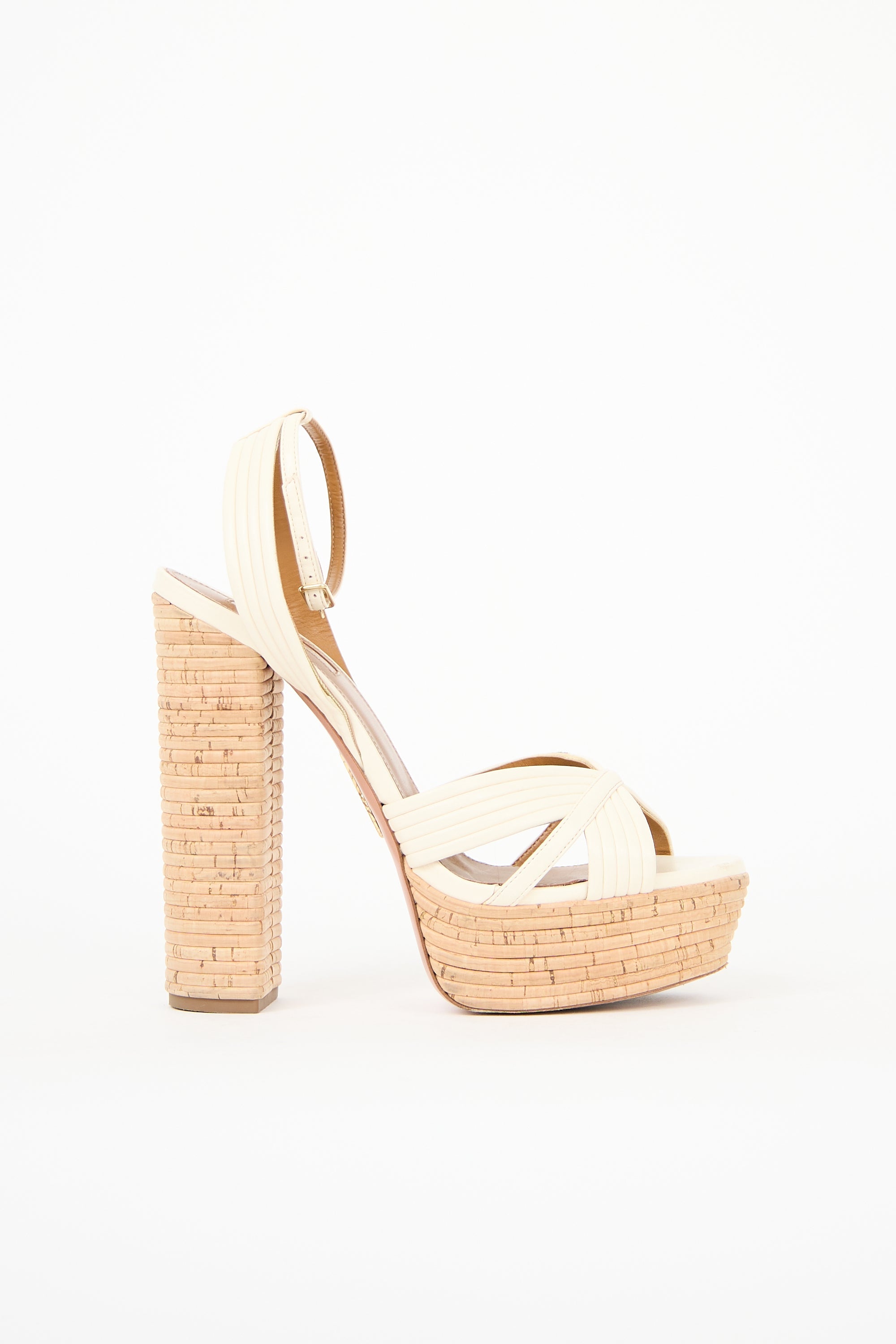 Pre-owned Aquazzura cream leather Sundance heels featuring open rounded toe, adjustable ankle strap, and brown cork platform and block heel.