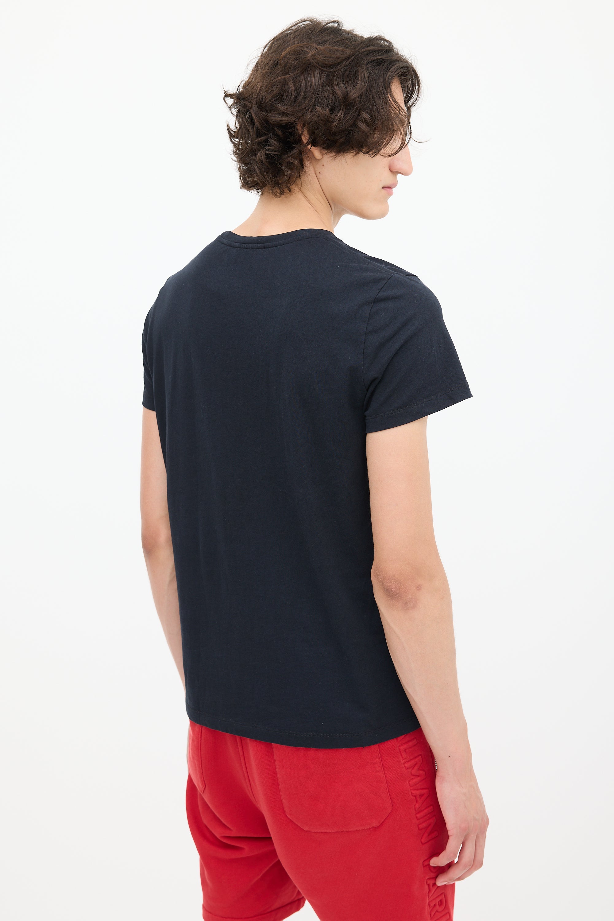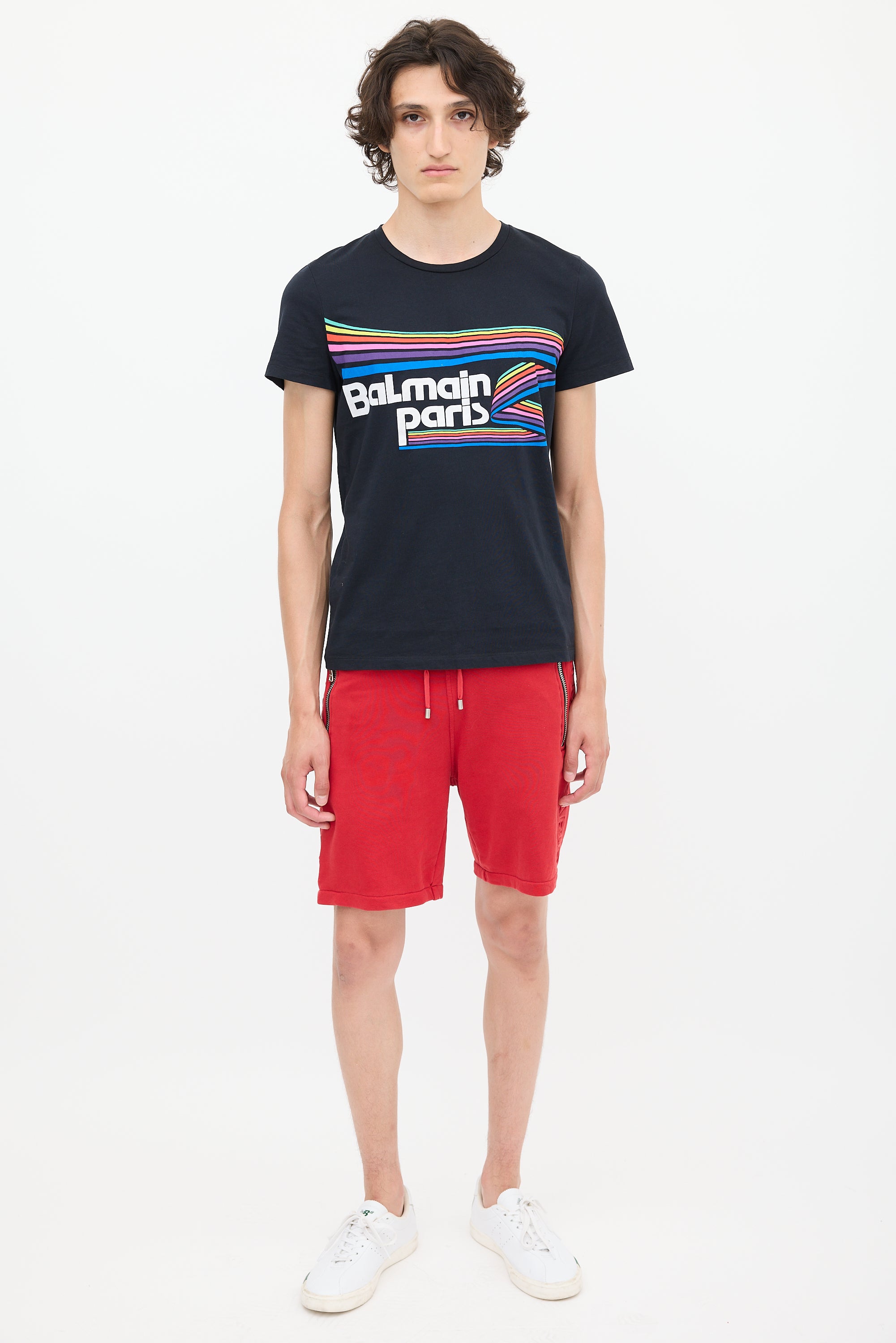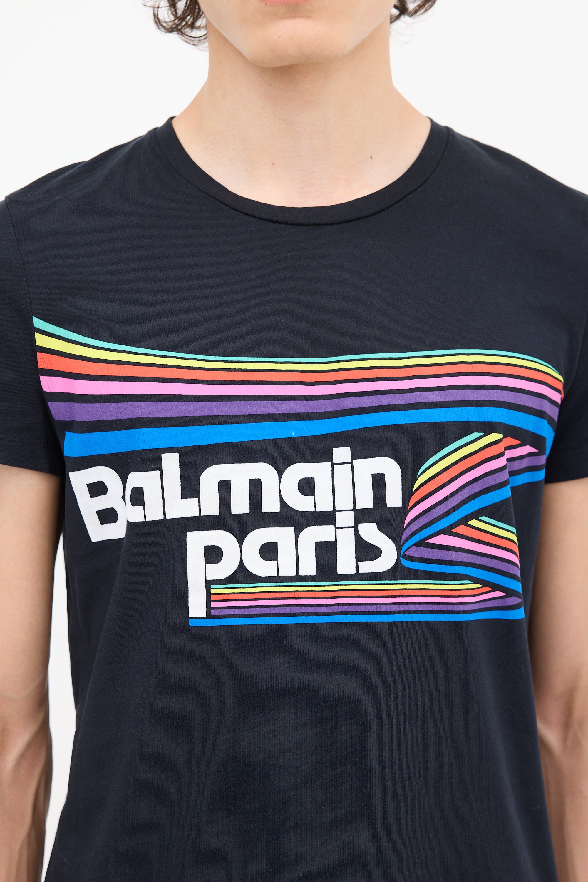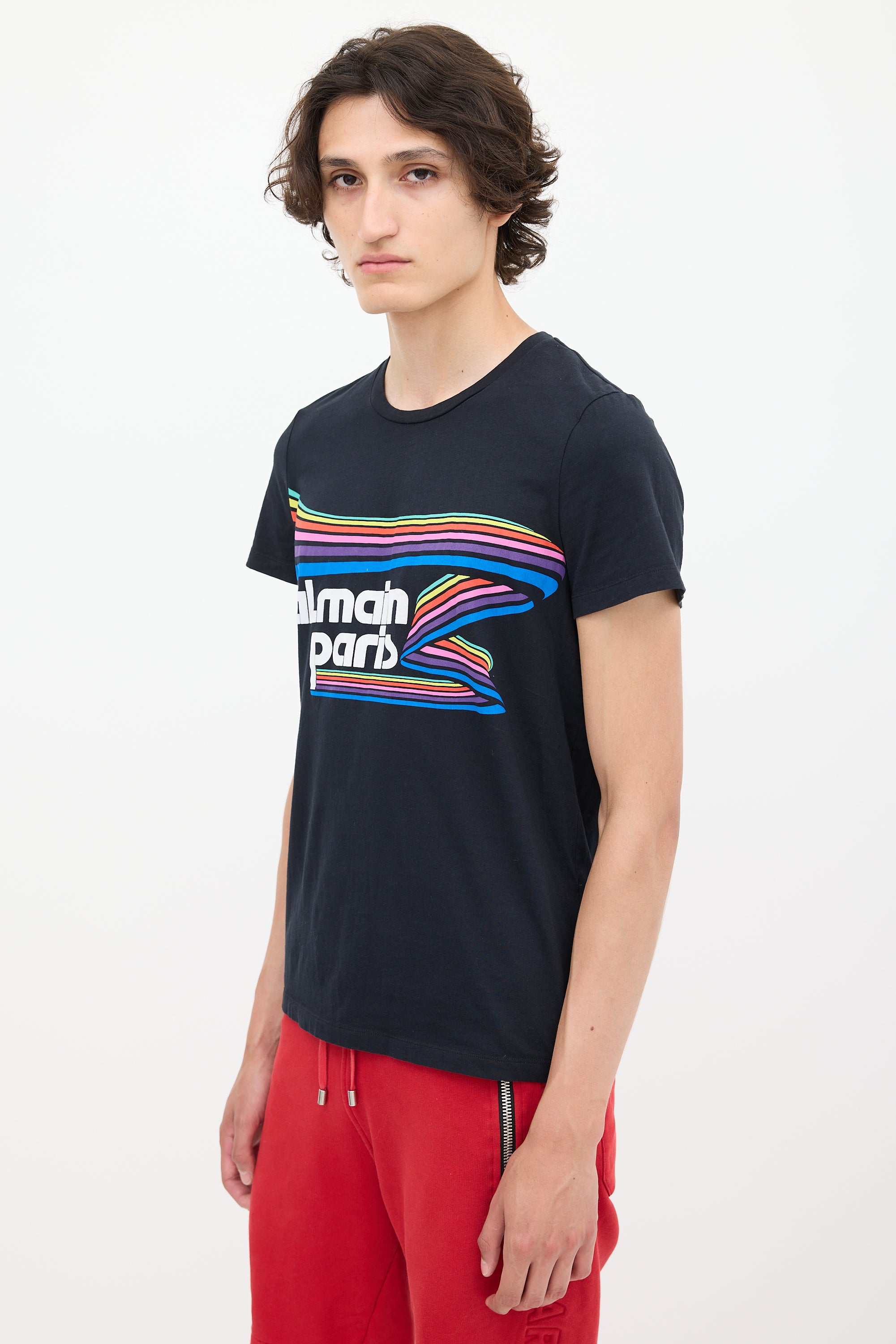 Pre-owned Balmain black T-shirt featuring a round neck, white velvet logo and multicolour rainbow print across chest, short sleeves, and even hem.