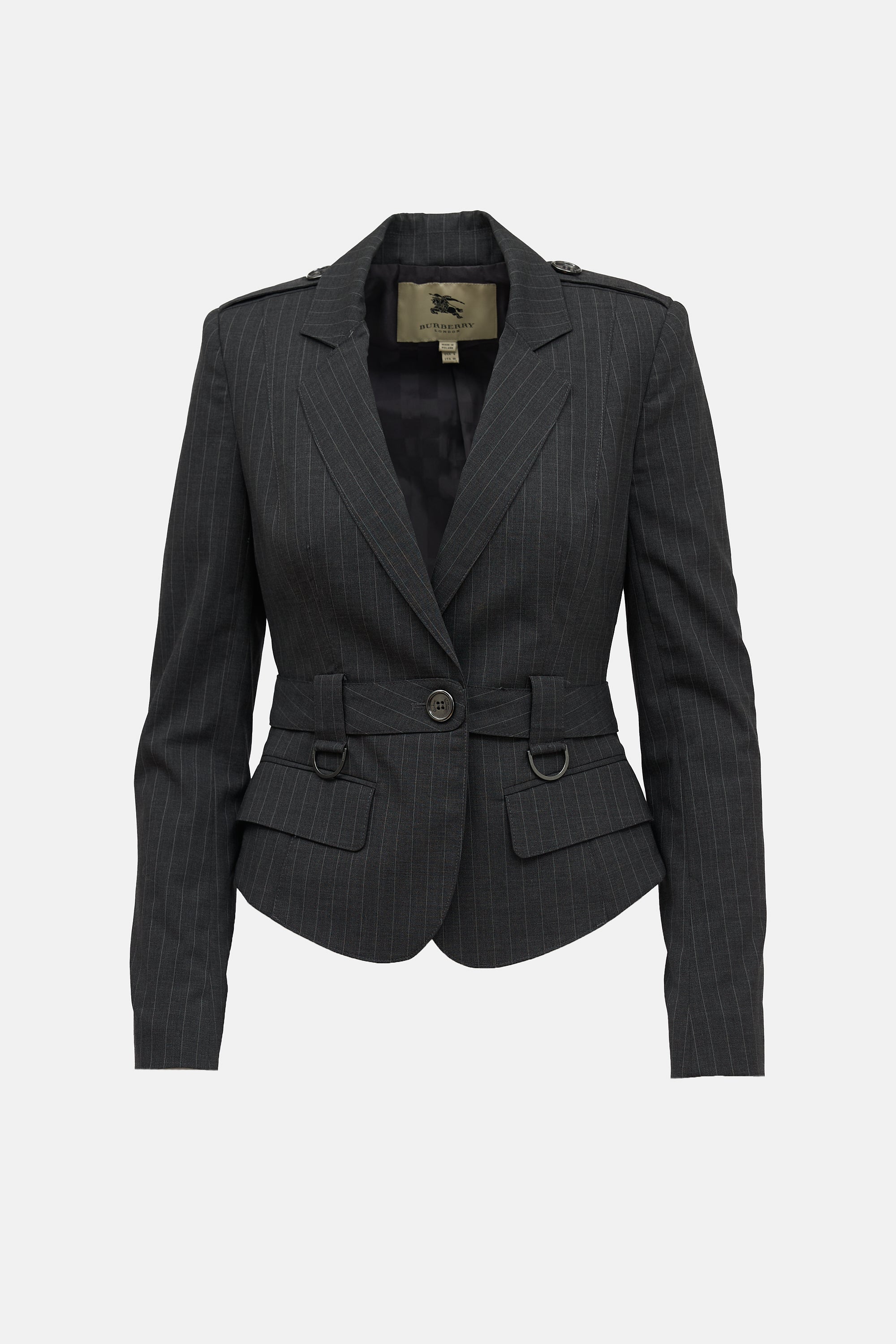 Pre-owned Burberry grey blazer featuring notch lapel, padded shoulders, pin stripe,belt loops with D-ring, attached belt, inverted pleats at back, peplum hem, and two hip pockets. Lined.