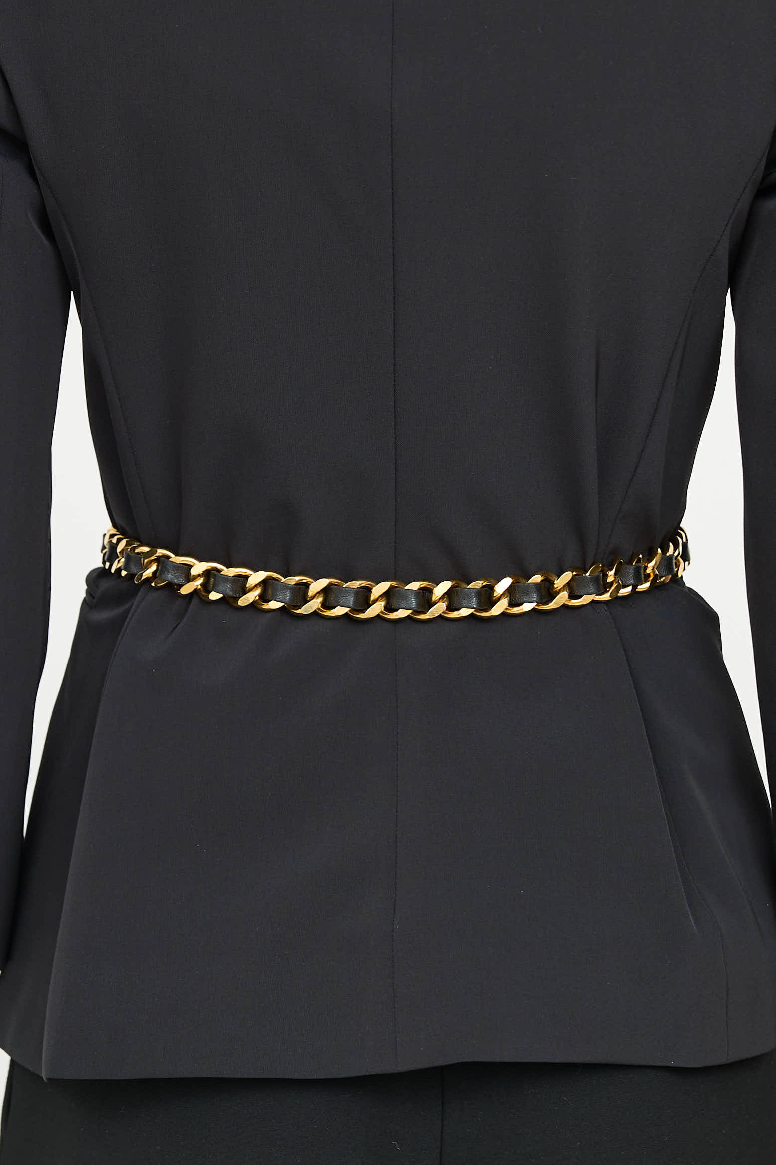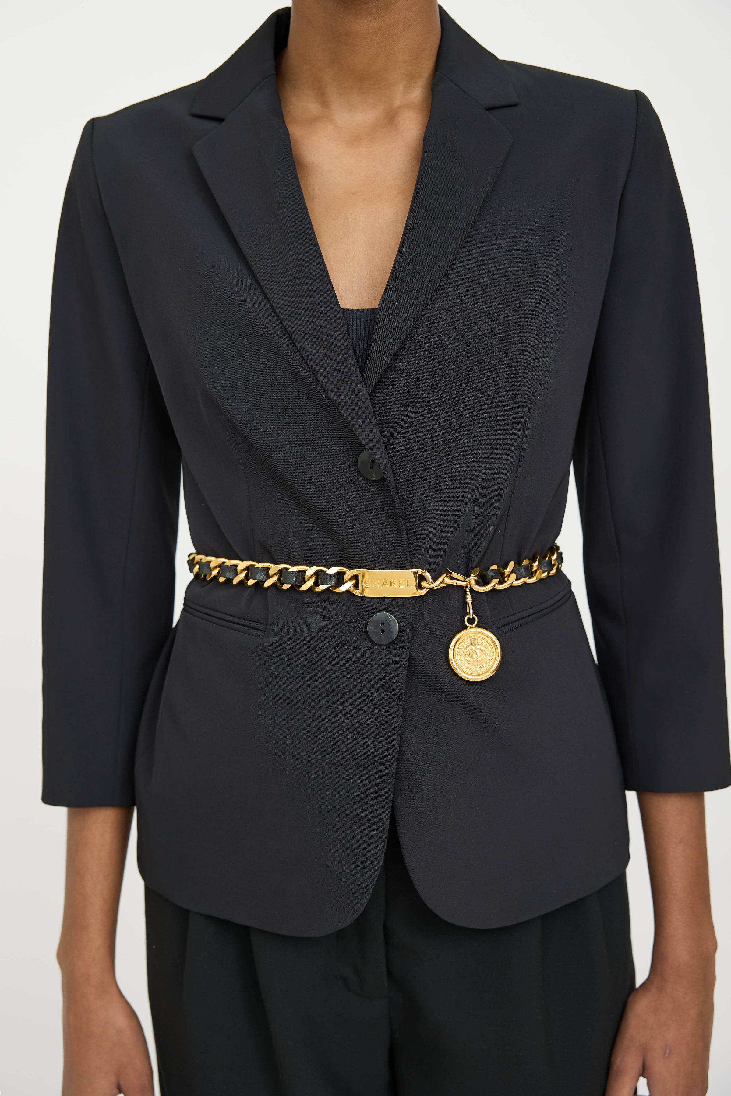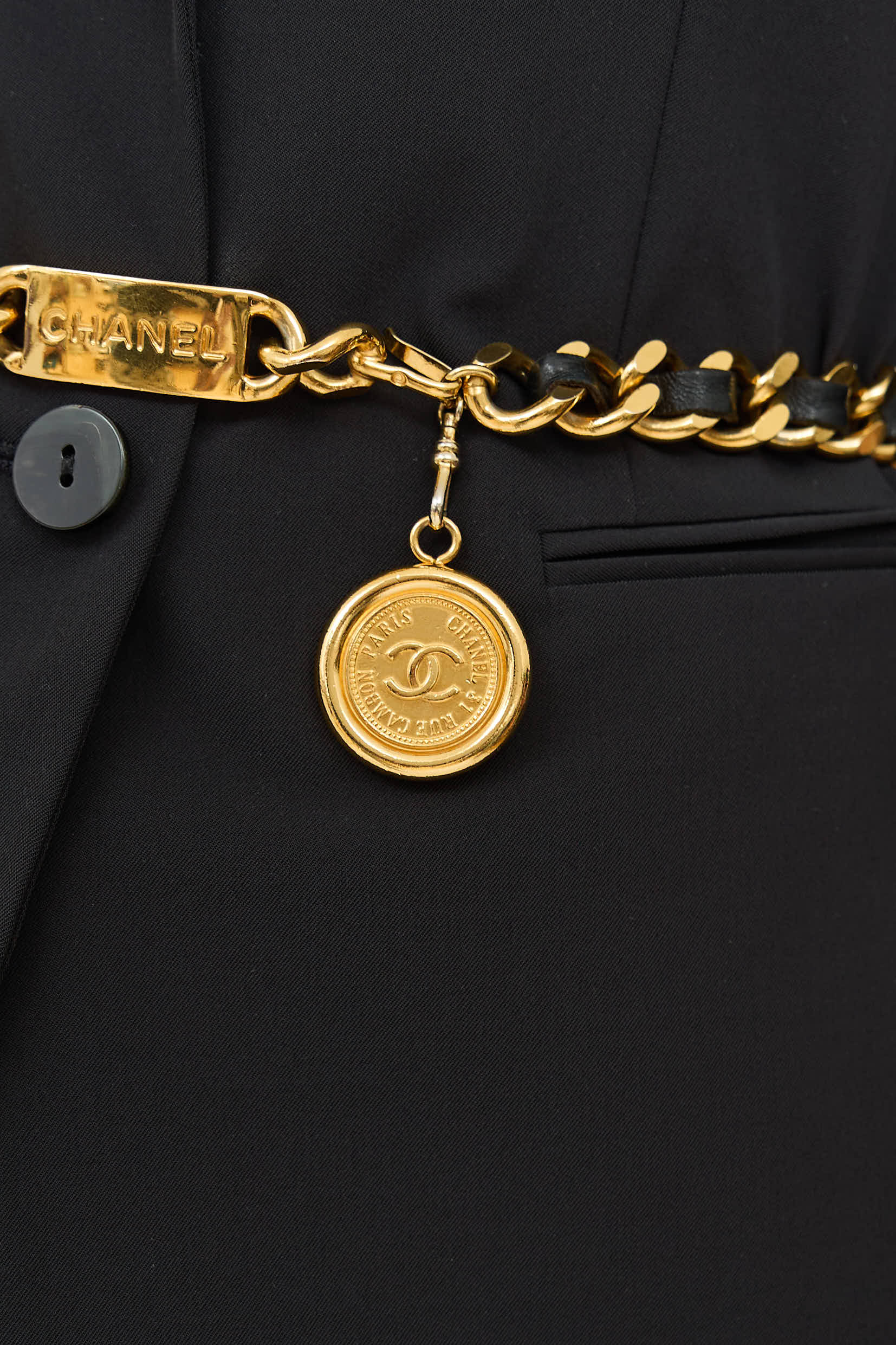 Pre-owned Chanel 1970's gold tone belt featuring a chain link, braided black leather trim, embossed logo plate, CC logo coin drop pendant, and hook closure.