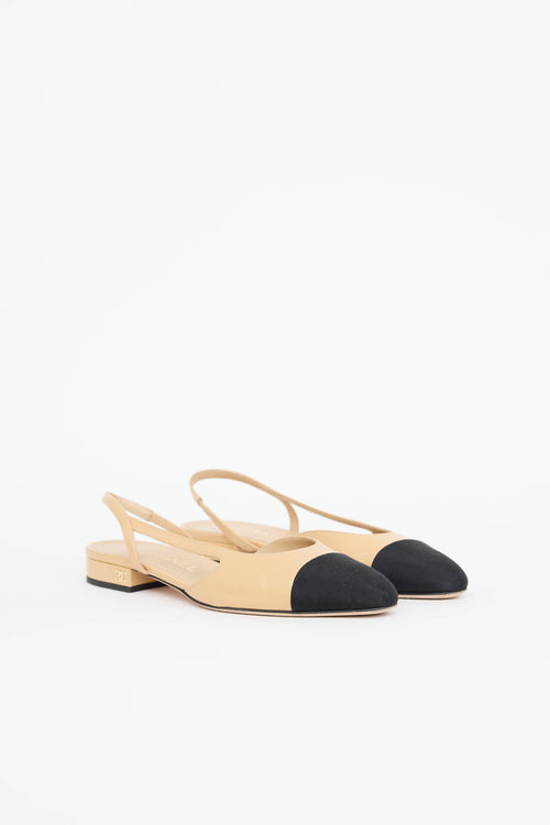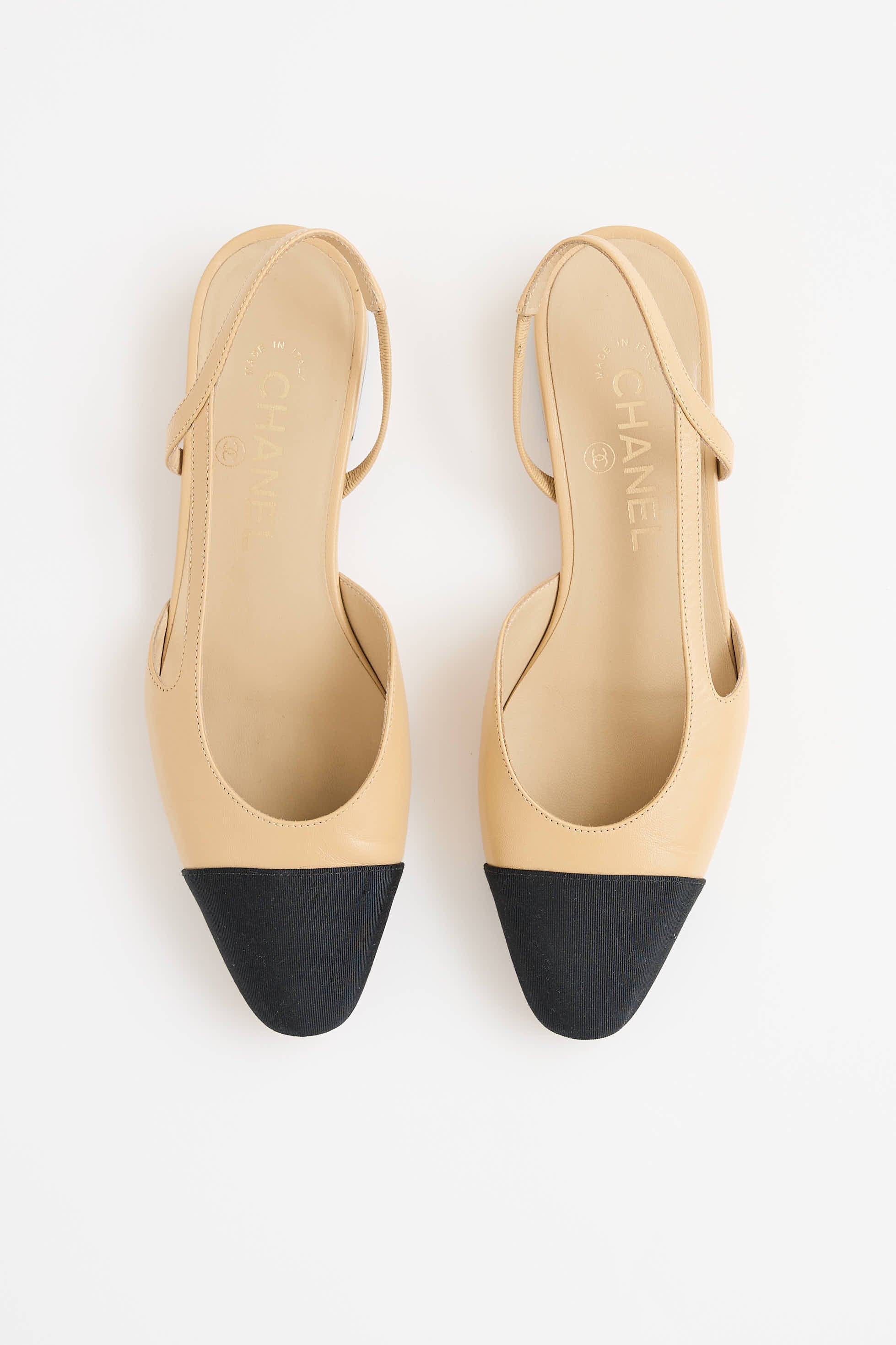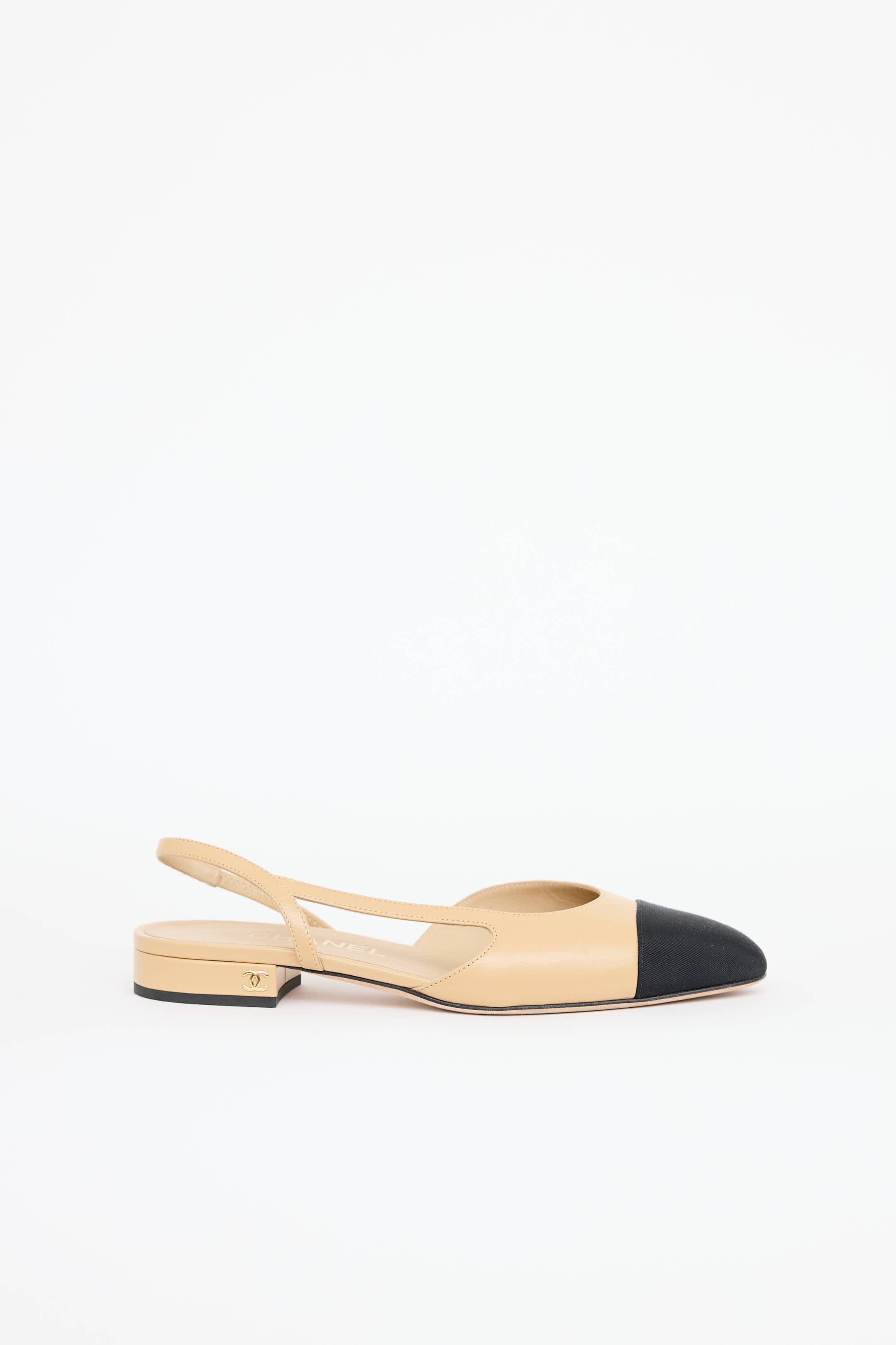 Pre-owned Chanel beige and black heels featuring round webbed cap toe, strap with cutout on side of upper, sling back and covered stacked heel with gold tone CC hardware.