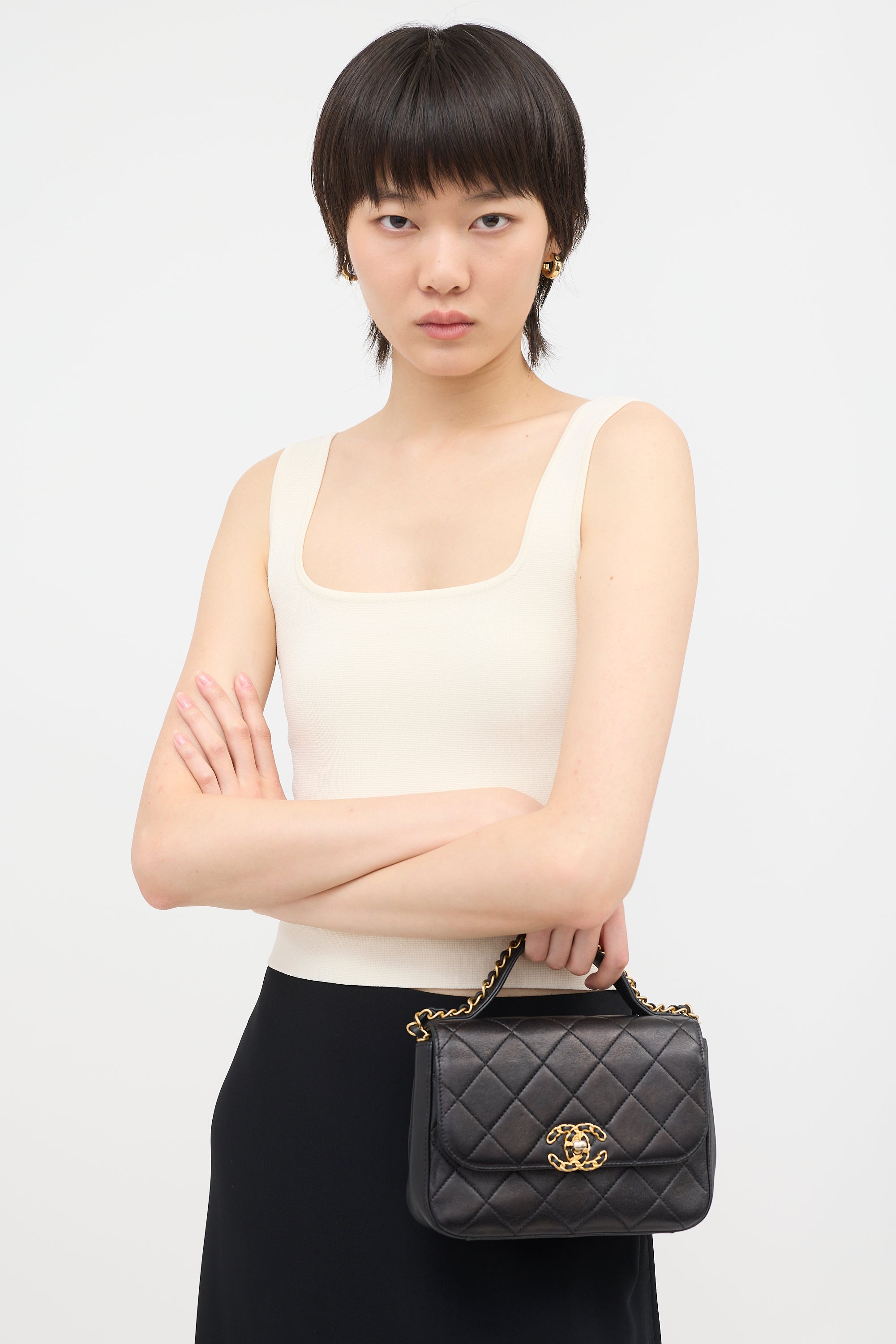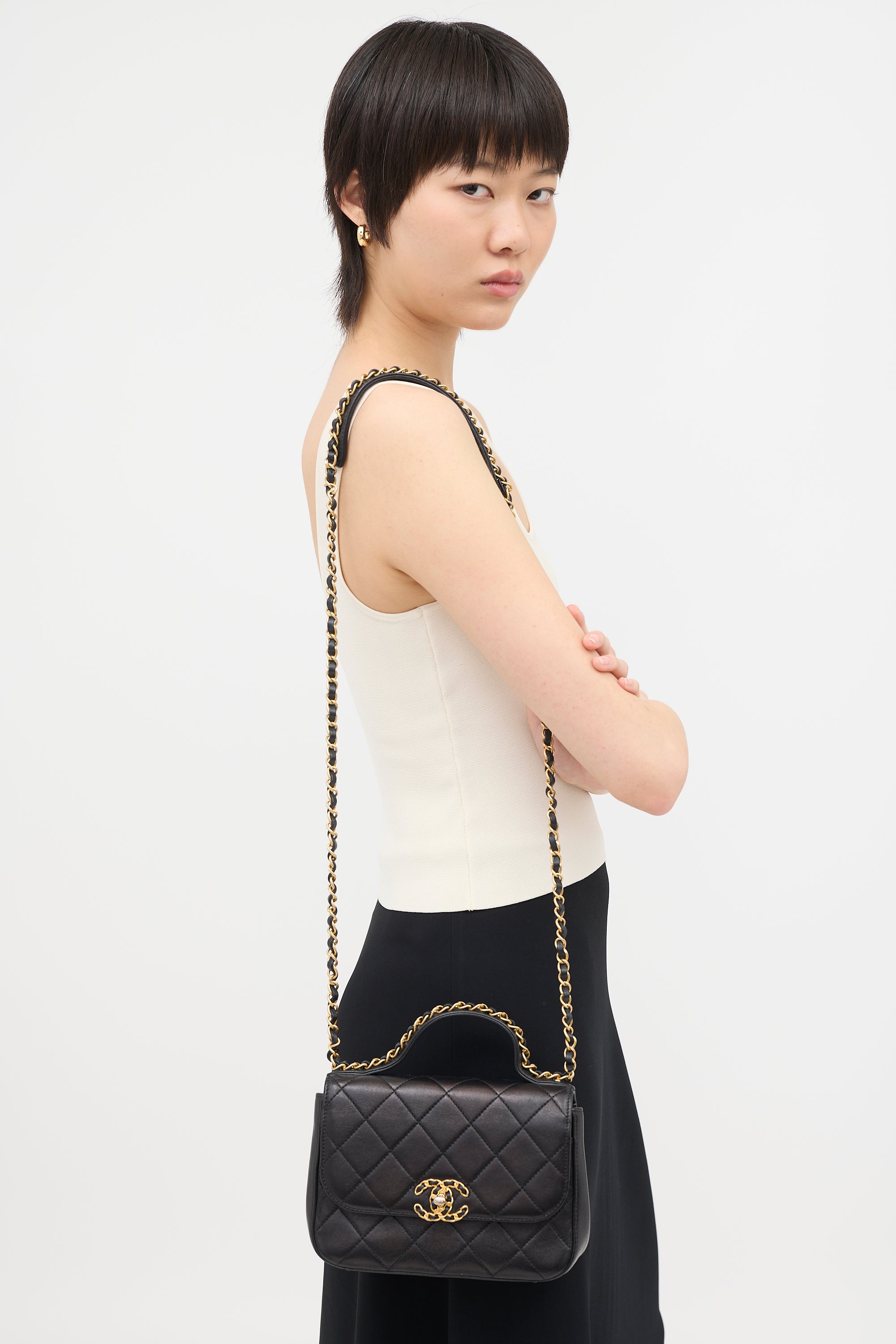 Pre-owned Chanel black quilted lambskin leather Infinity bag featuring matte gold hardware, flat top handle with woven leather and chain strap, back slip pocket, top flap with interwoven leather CC lock closure, one main compartment with burgundy canvas lining and one zip pocket, and one slip pocket under flap. Comes with original dust bags.