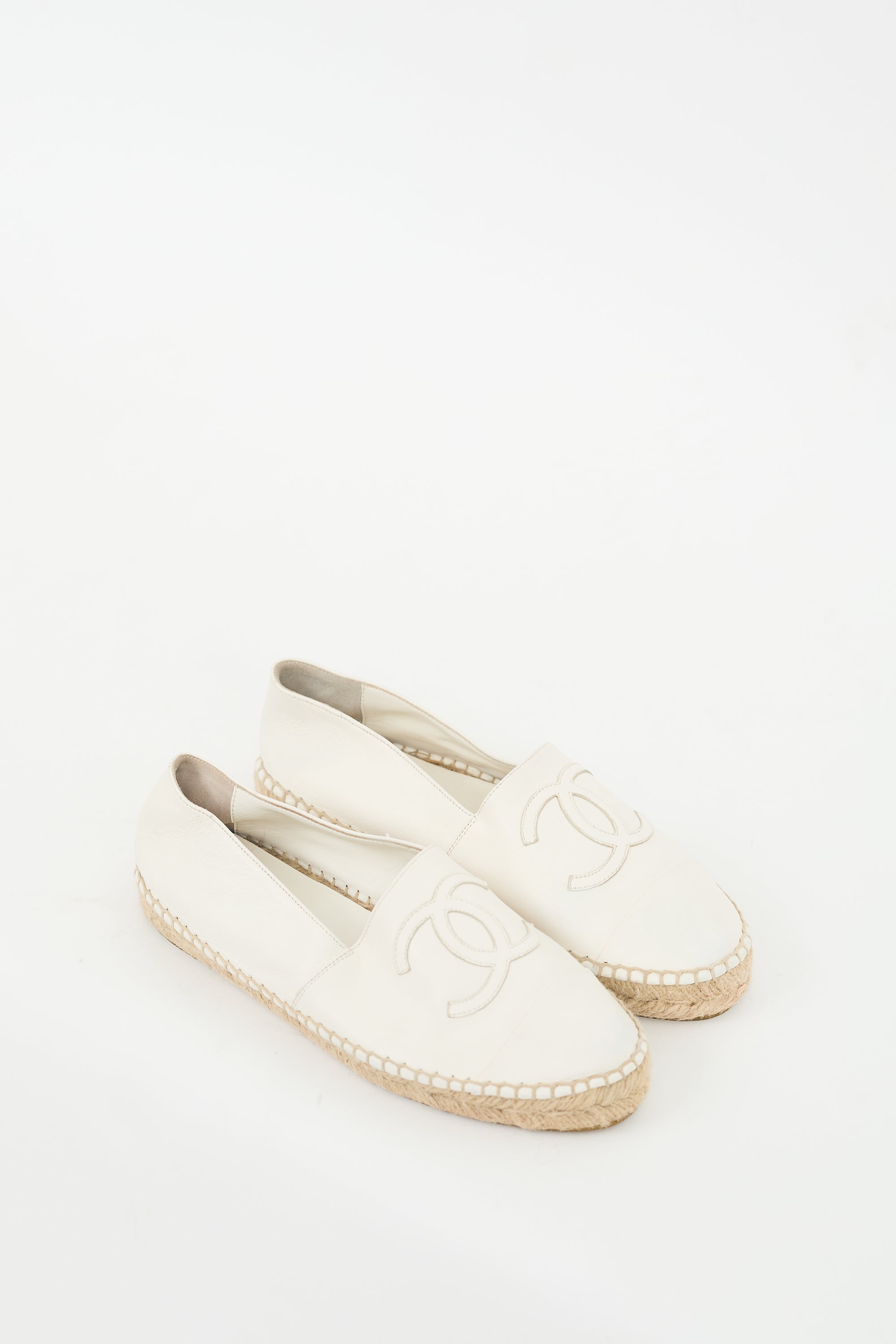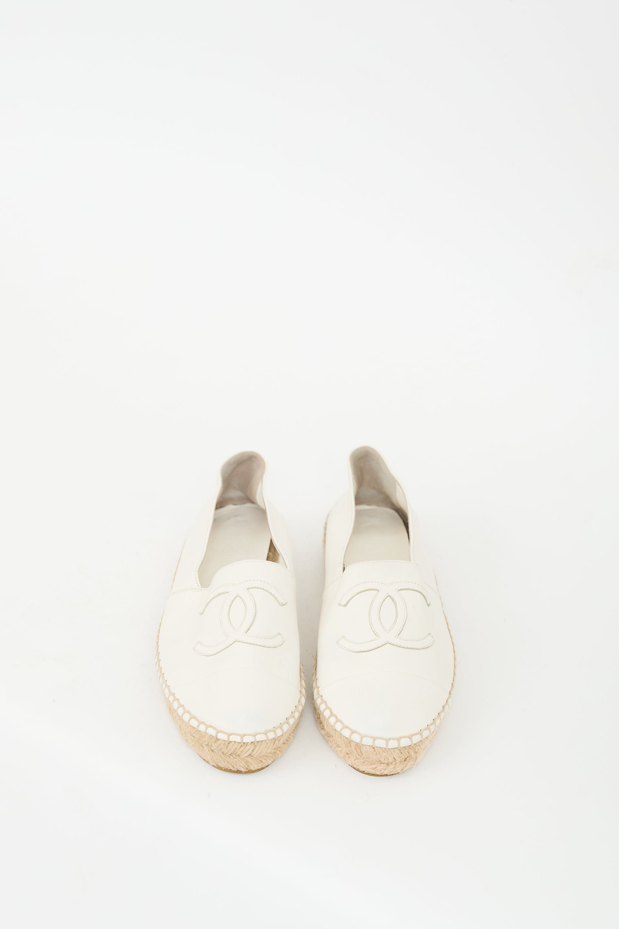 Pre-owned Chanel white leather espadrilles featuring a rounded toe, panelled construction, interlocking CC logo at vamp, slip on entry, and braided jute midsole.