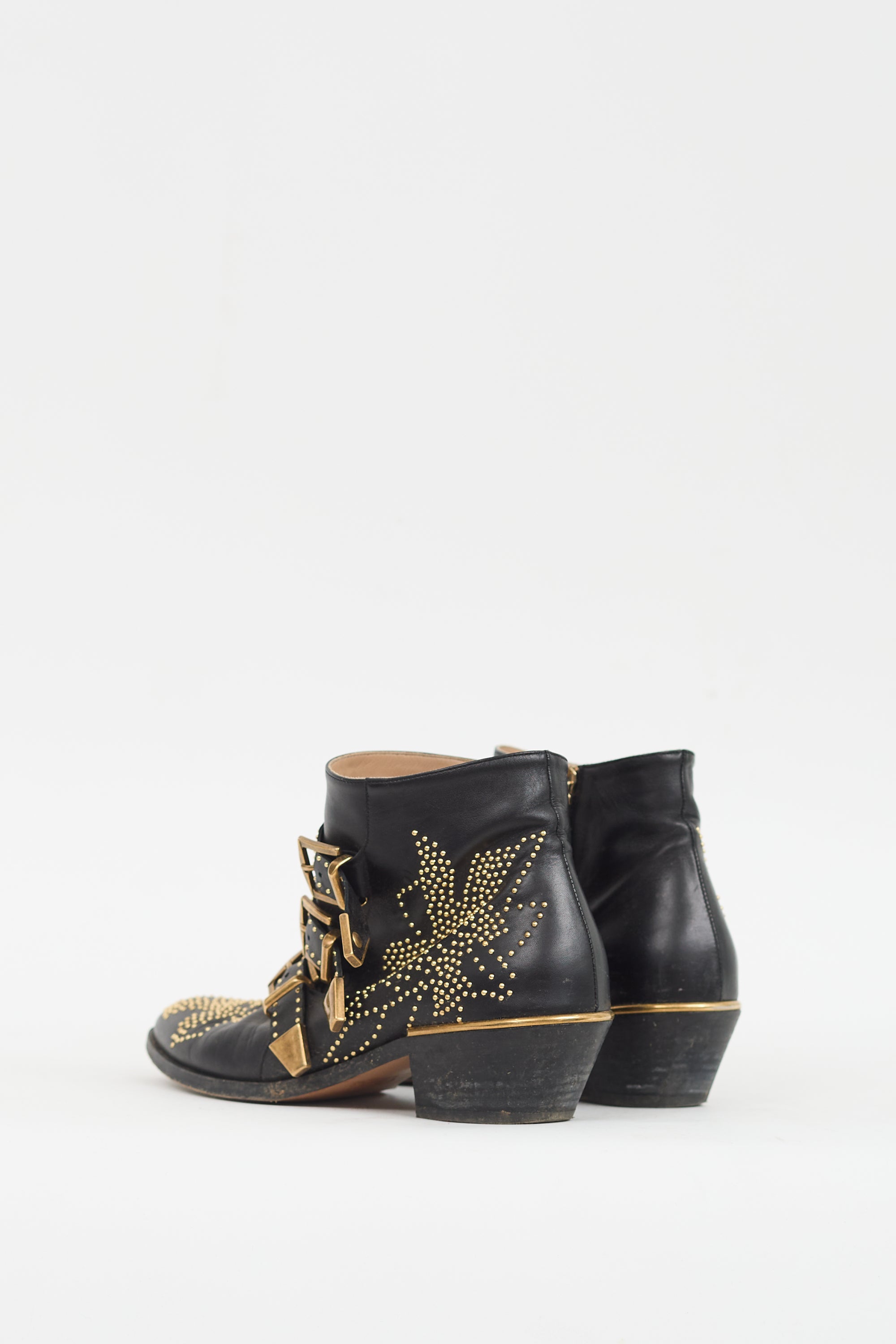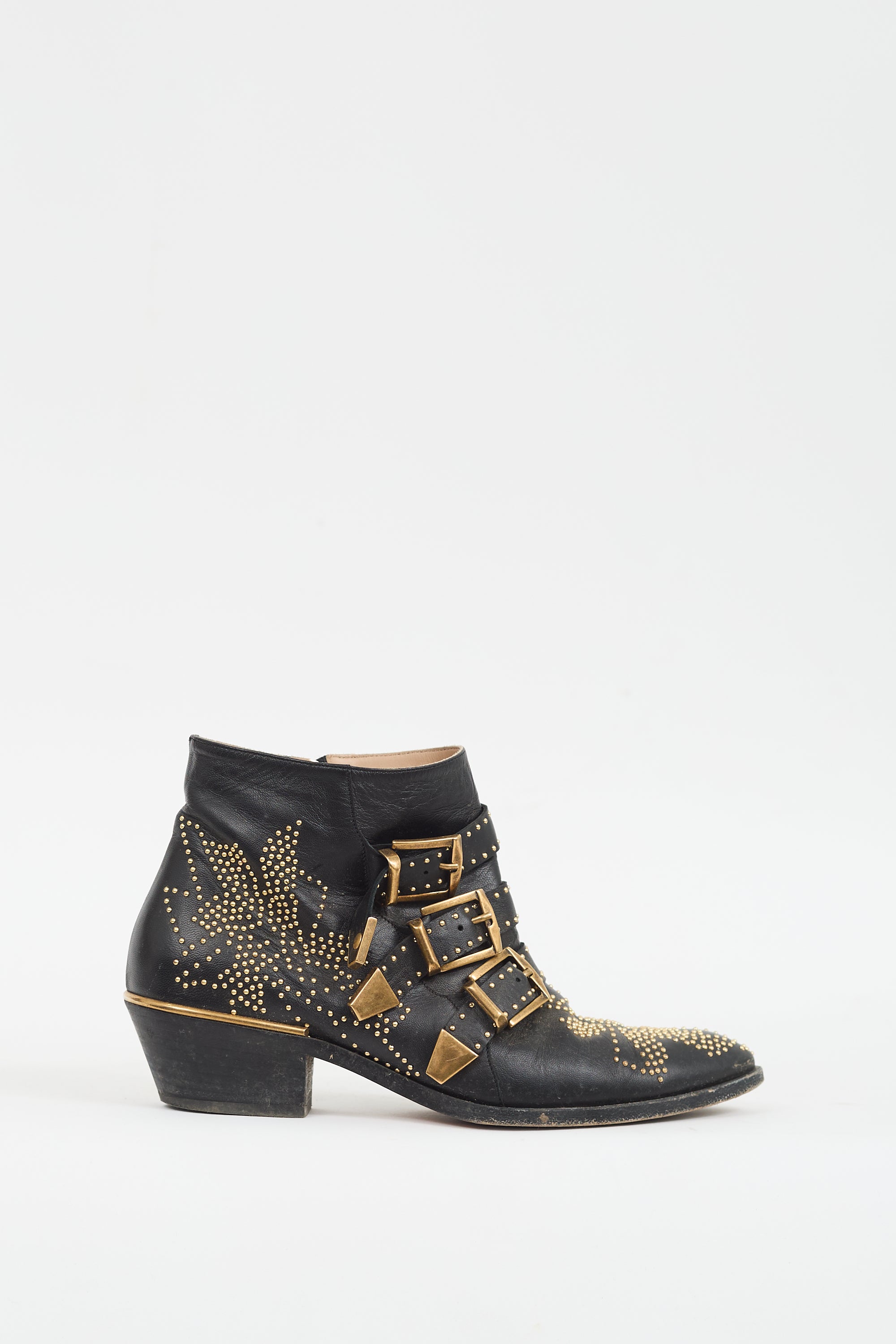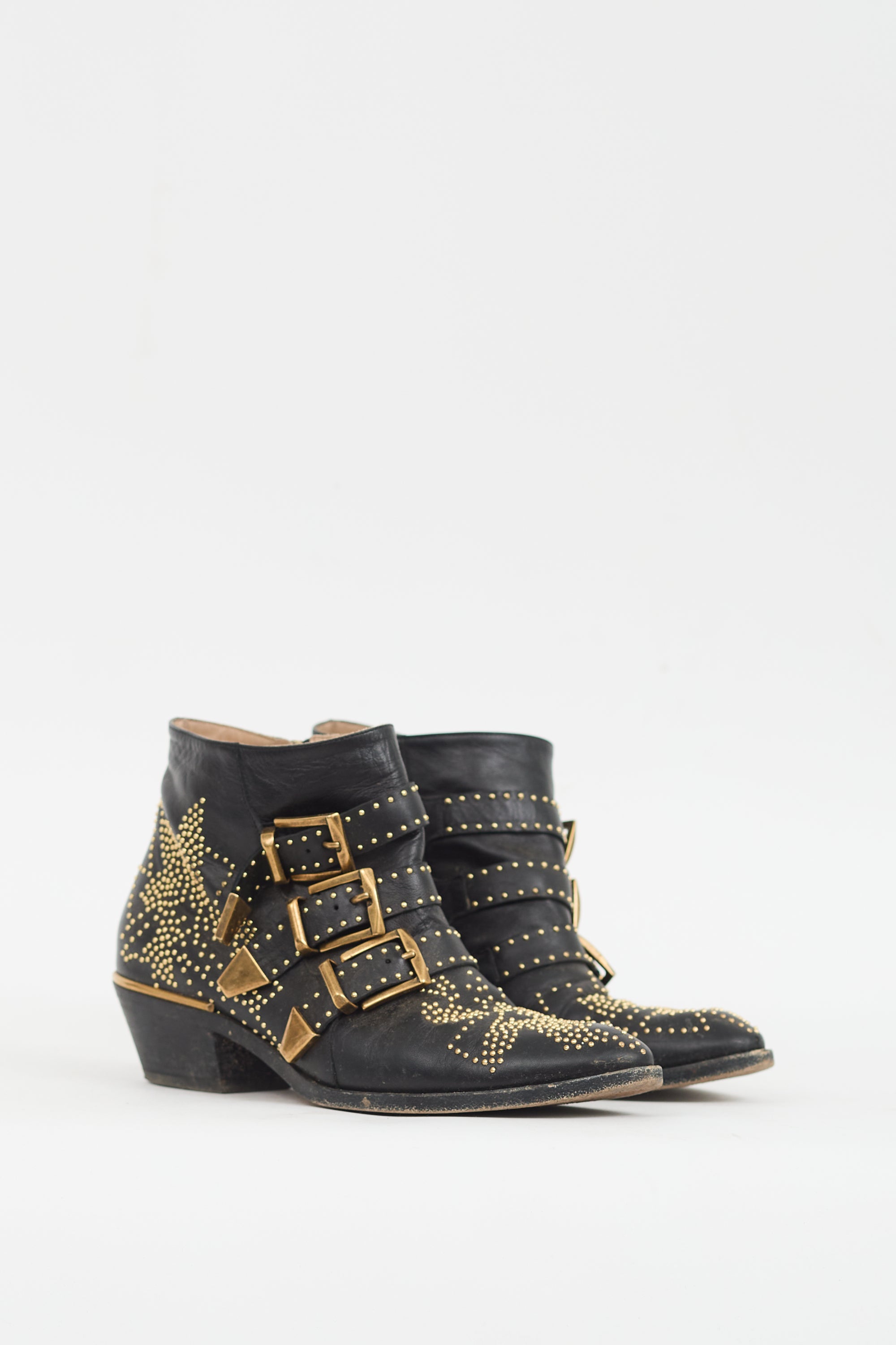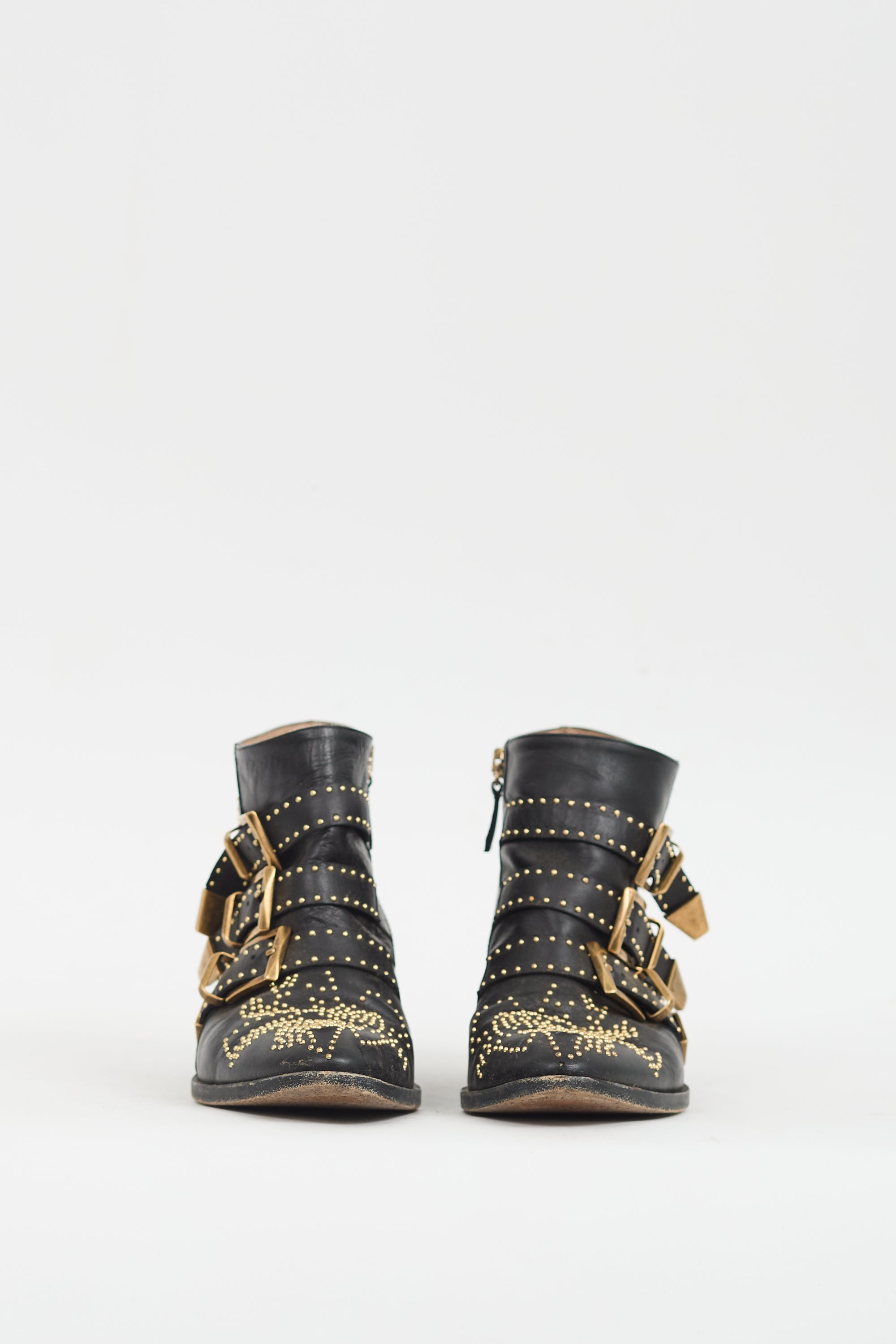 Pre-owned Chloé black leather Susanna ankle boots featuring an almond toe, studding throughout, three buckled straps at front shaft, inner side zip closure, and Cuban heel with gold tone metal accent. Comes with original box and dust bag.