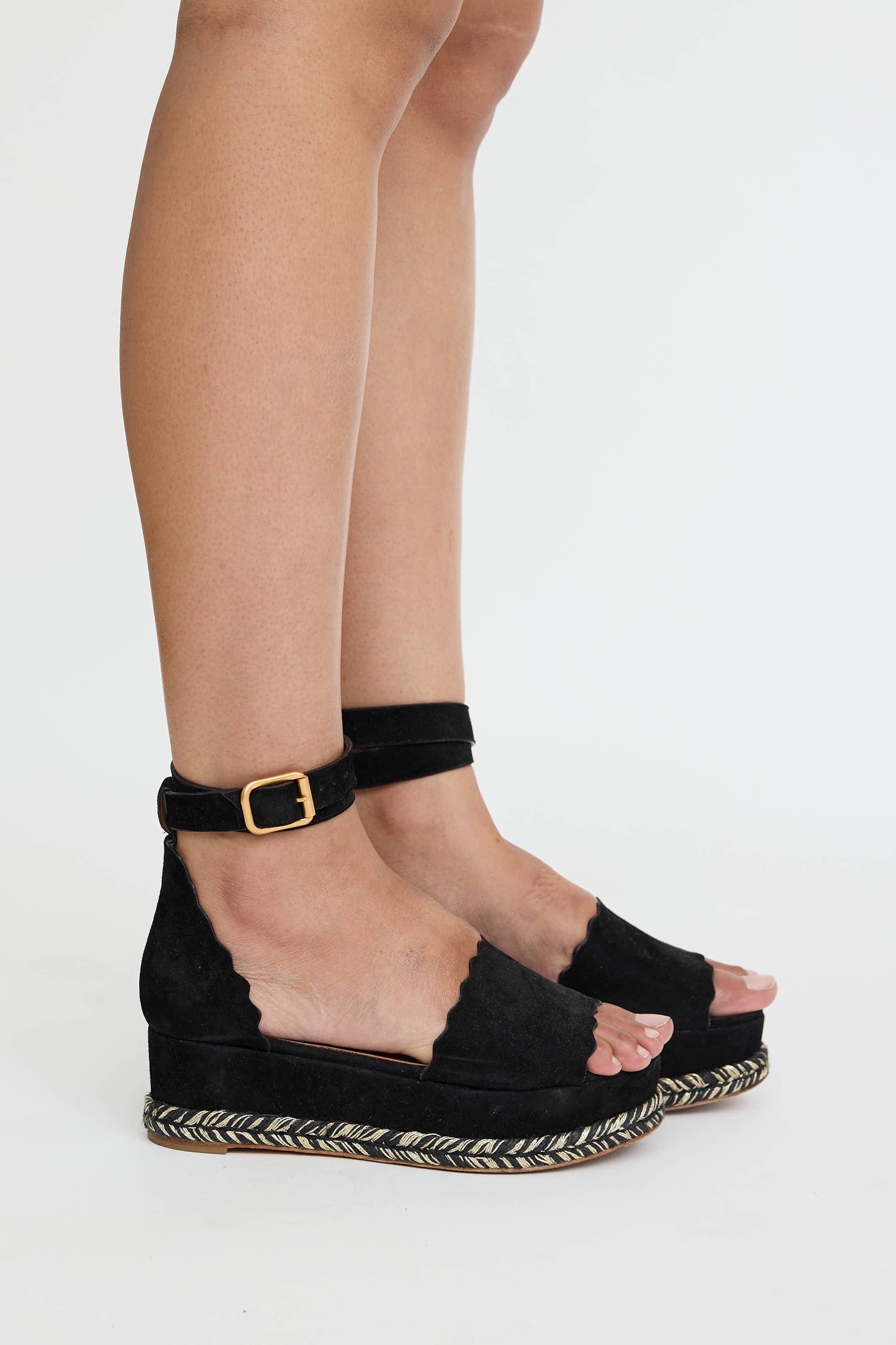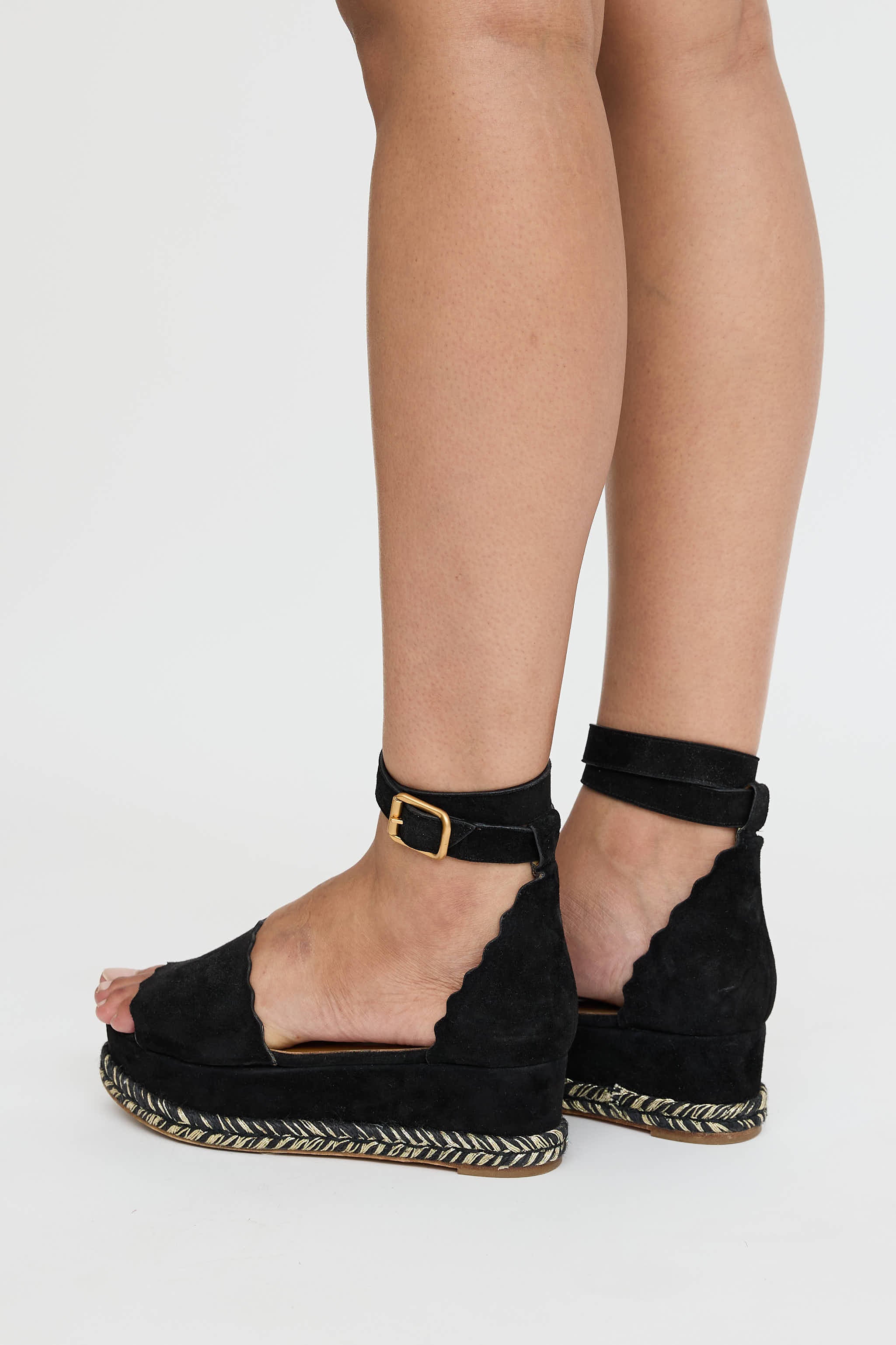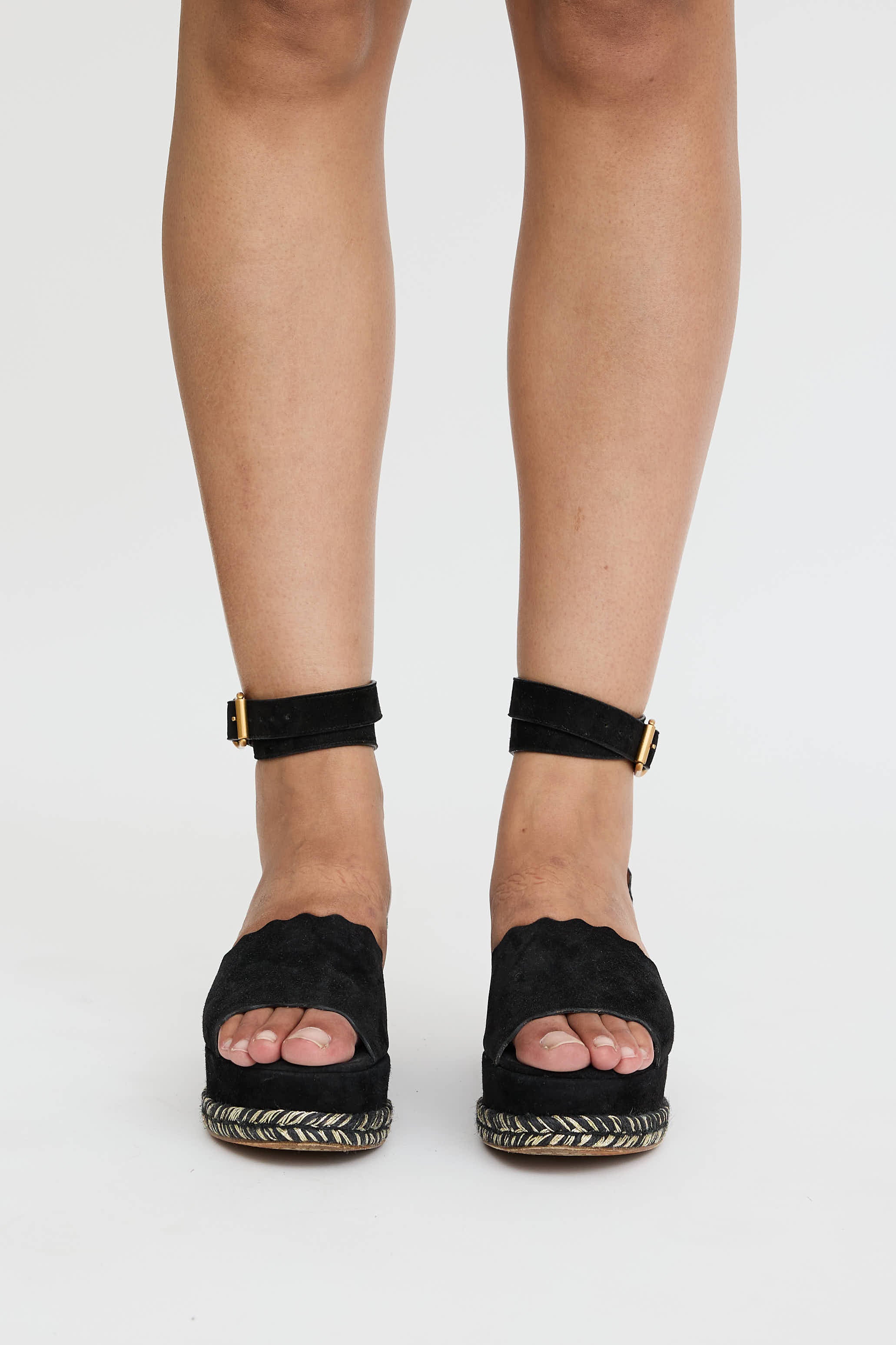 Pre-owned Chloé black suede espadrille featuring round open toe, platform midsole with braided metallic jute, scallop trim throughout, and adjustable ankle strap with gold tone hardware.