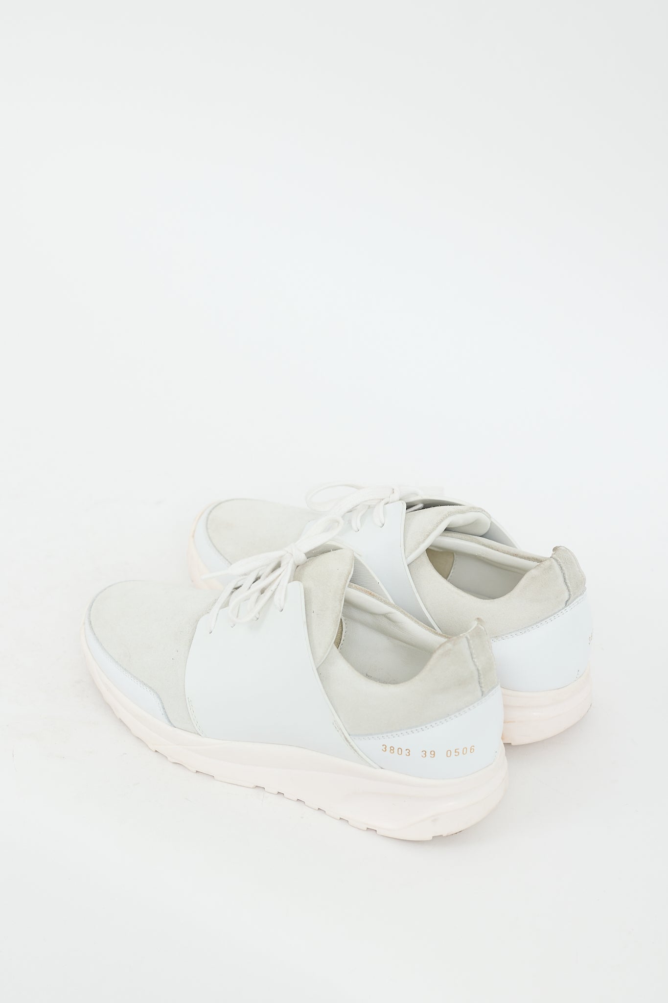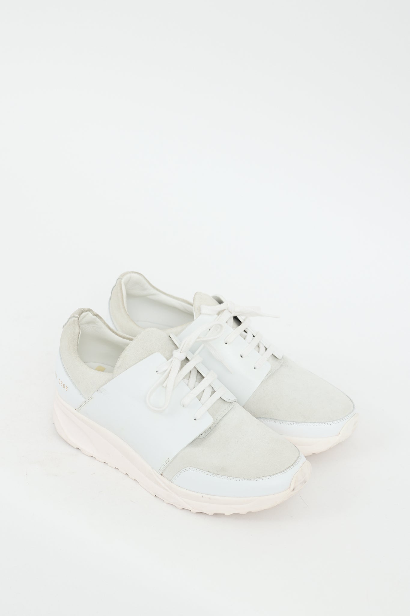 Pre-owned Common Projects white Track leather sneakers featuring a round toe, gold tone printed numbers at sides, treaded outsole, and lace up closure.
