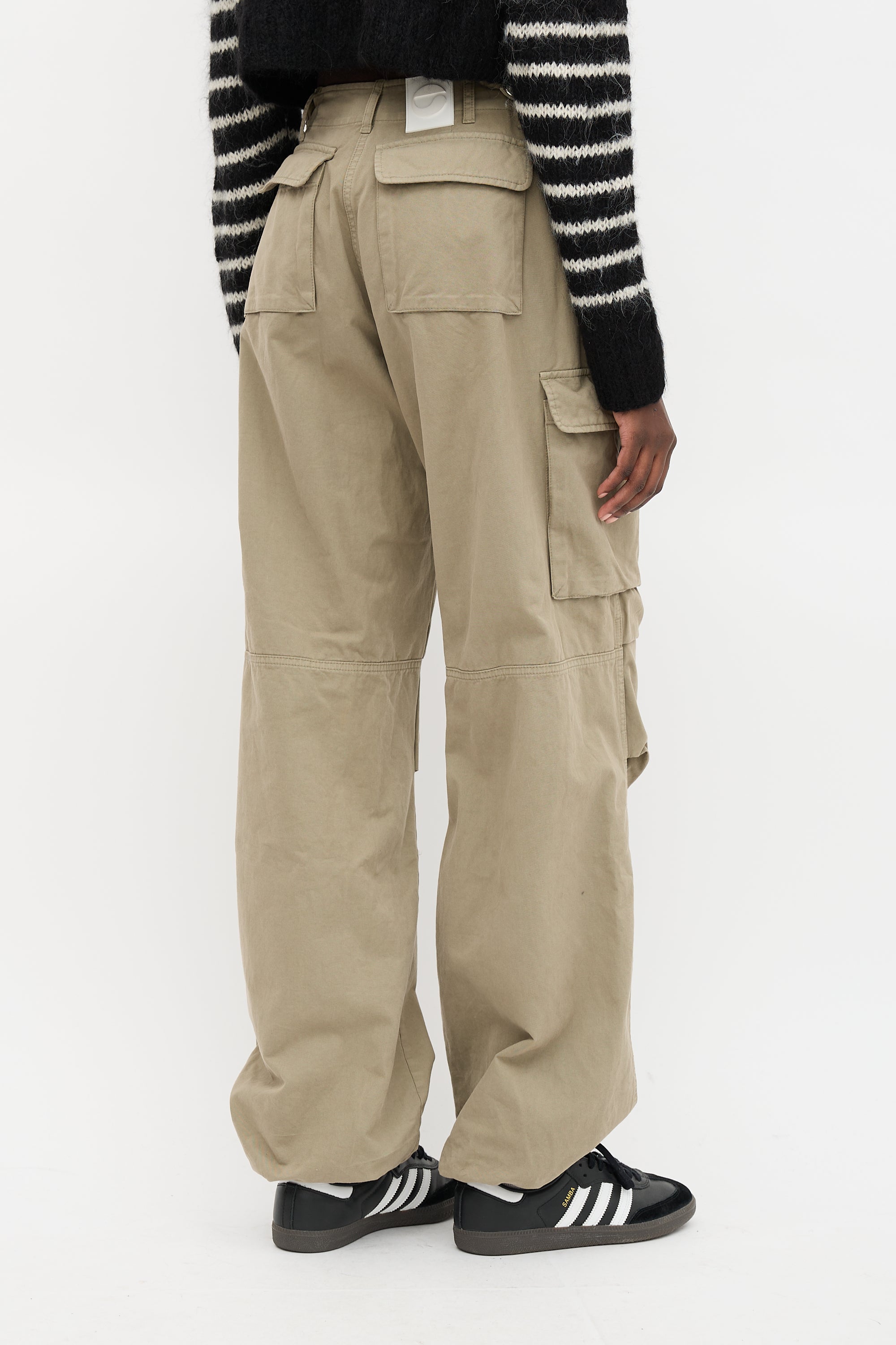 Pre-owned Coperni khaki brown cargo pants featuring wide leg, adjustable waist, four pocket styling, two cargo pockets at outseam, rubber logo tab at left cargo pocket, tucks at knees, drawstring hem, white rubber Jacron, and zip fly with silver tone logo snap button top closure.