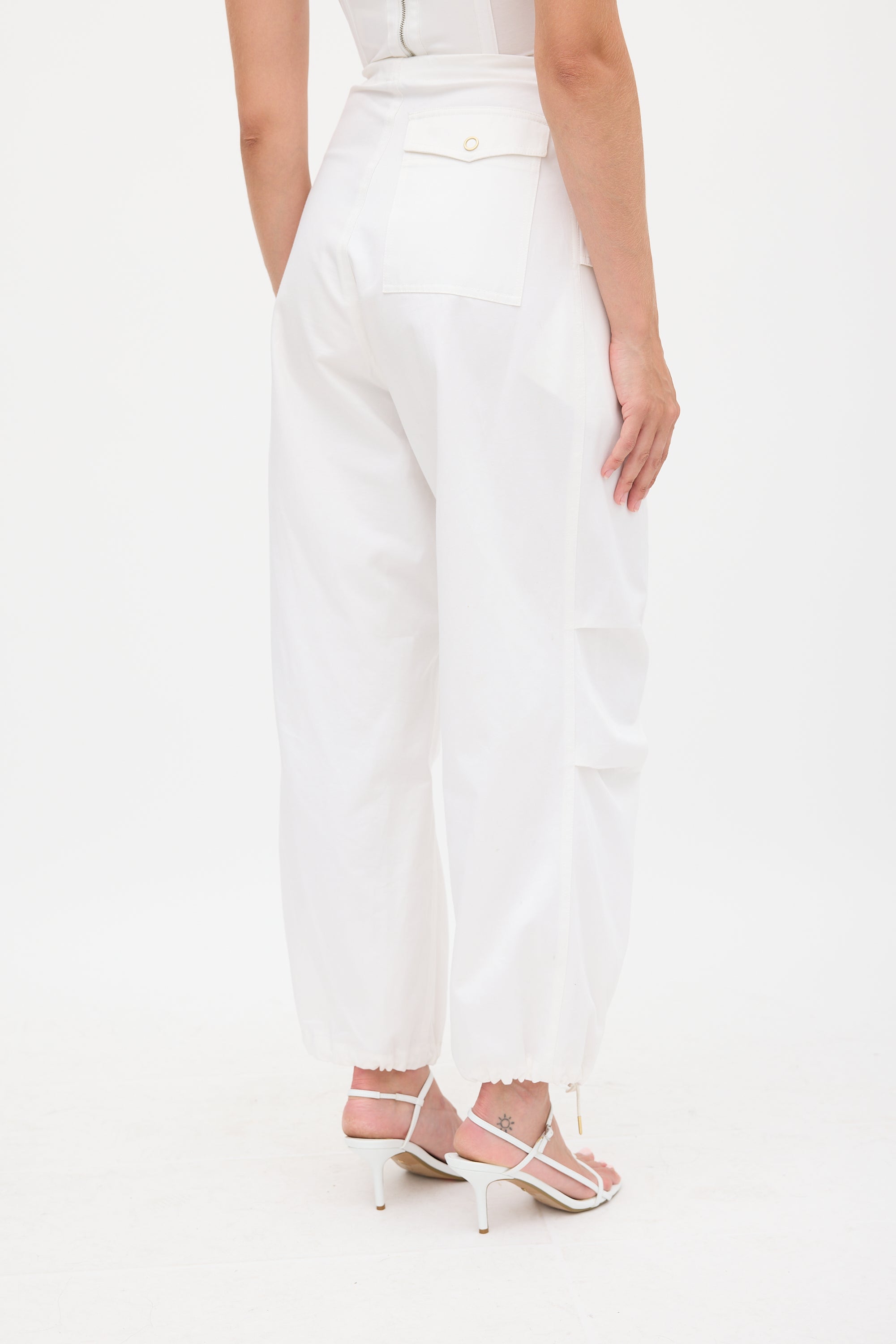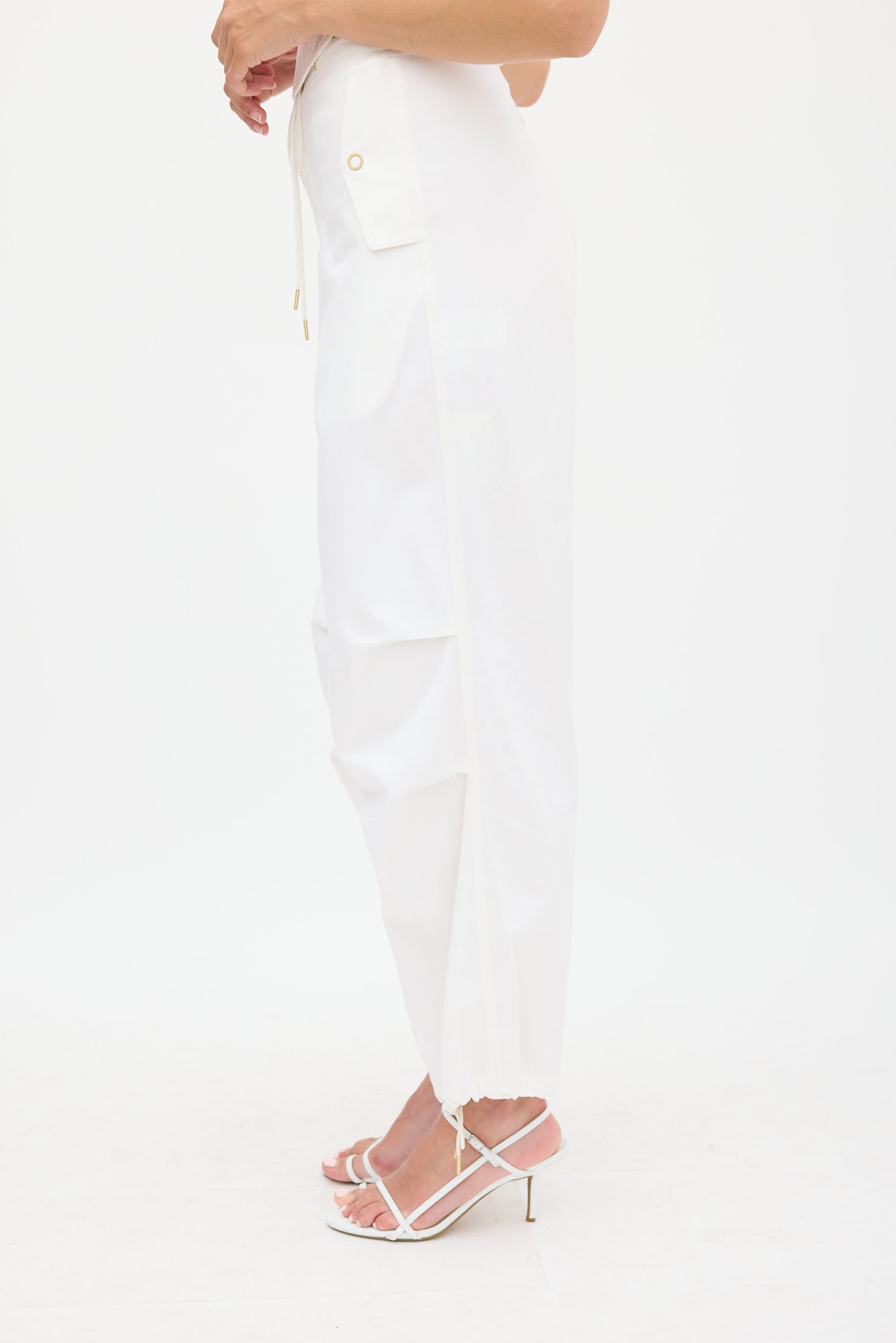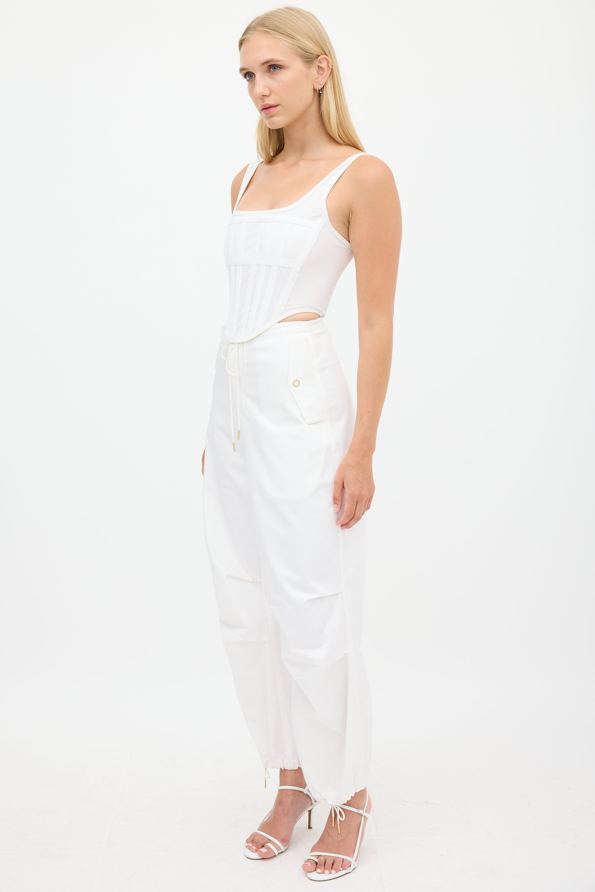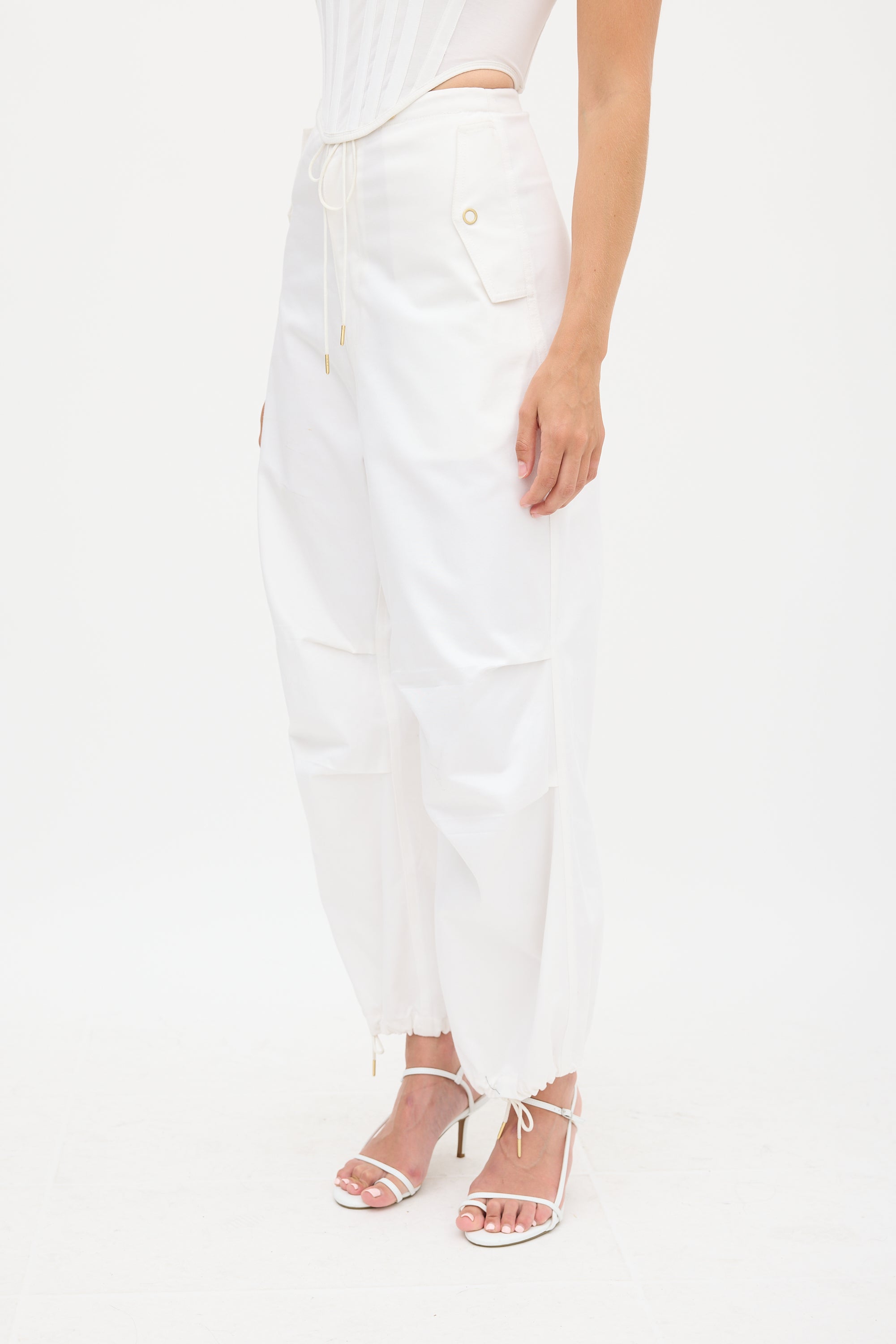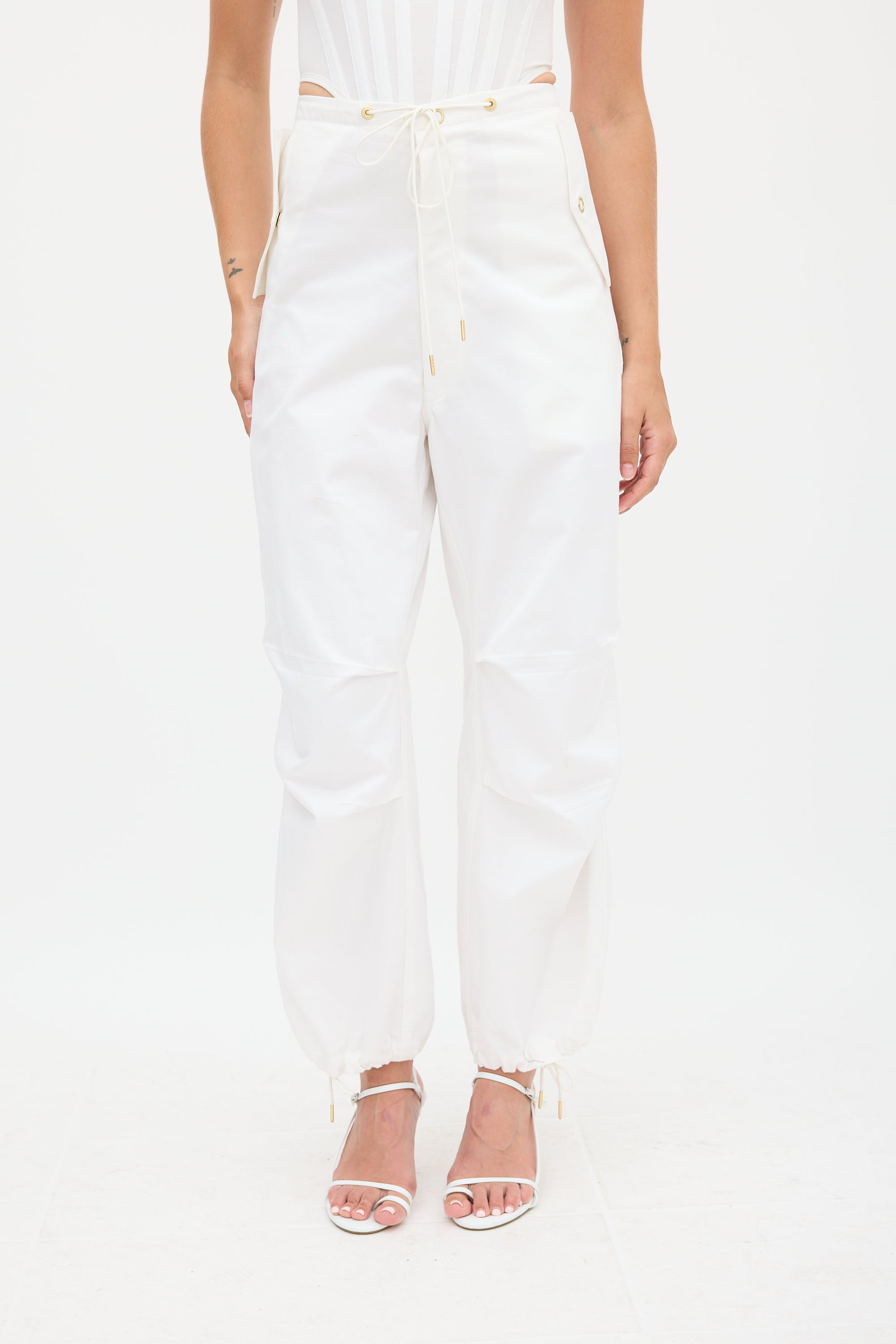 Pre-owned Dion Lee white trousers featuring a drawstring waist, two flap pockets at hip, one flap pocket at back, darted knee, wide leg, drawstring hem, and zip fly with button closure.