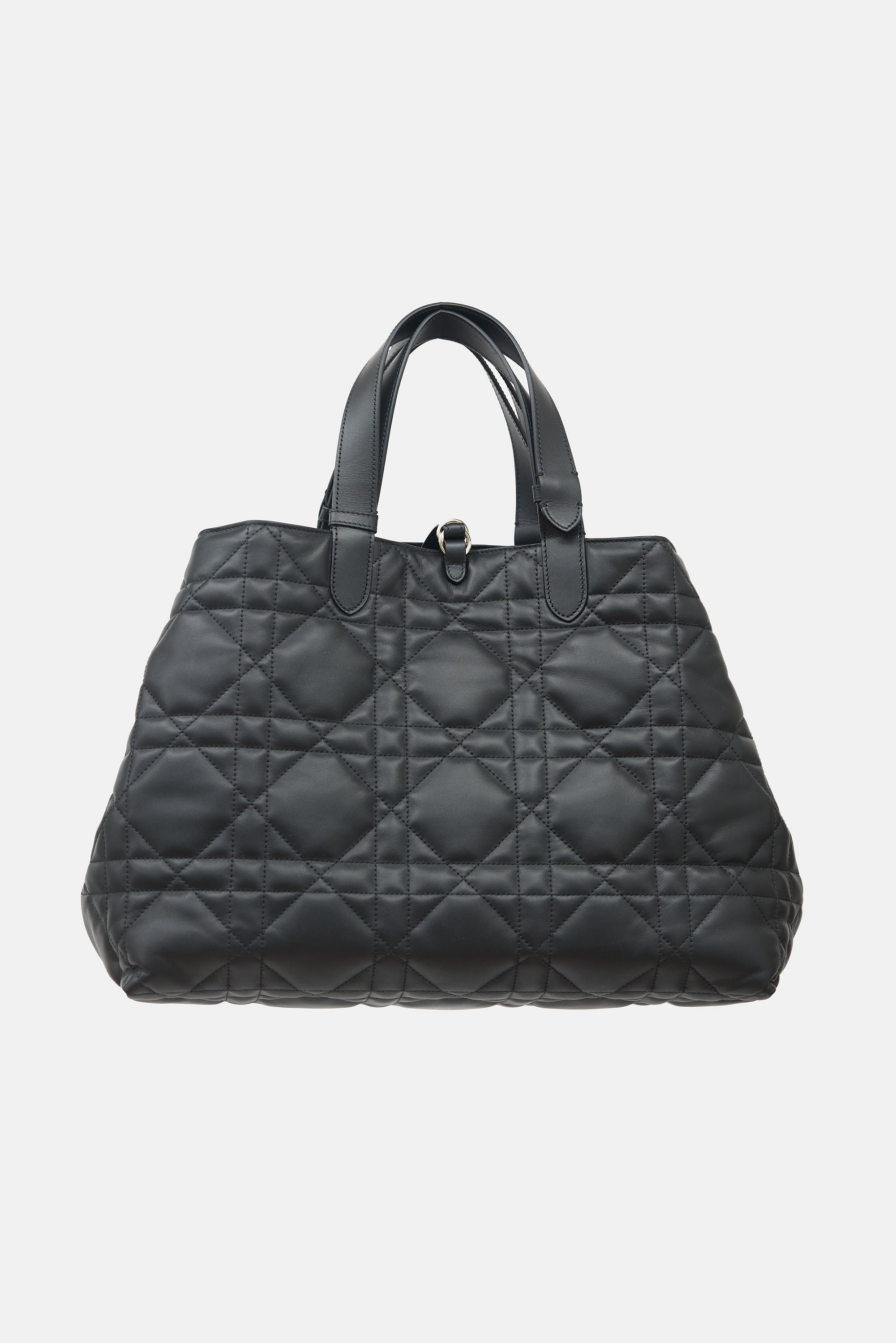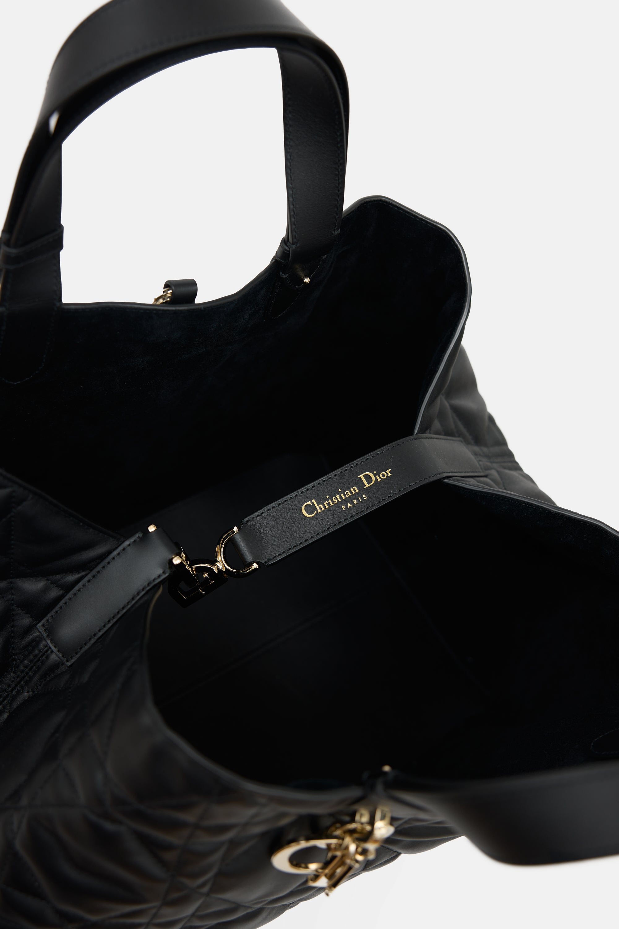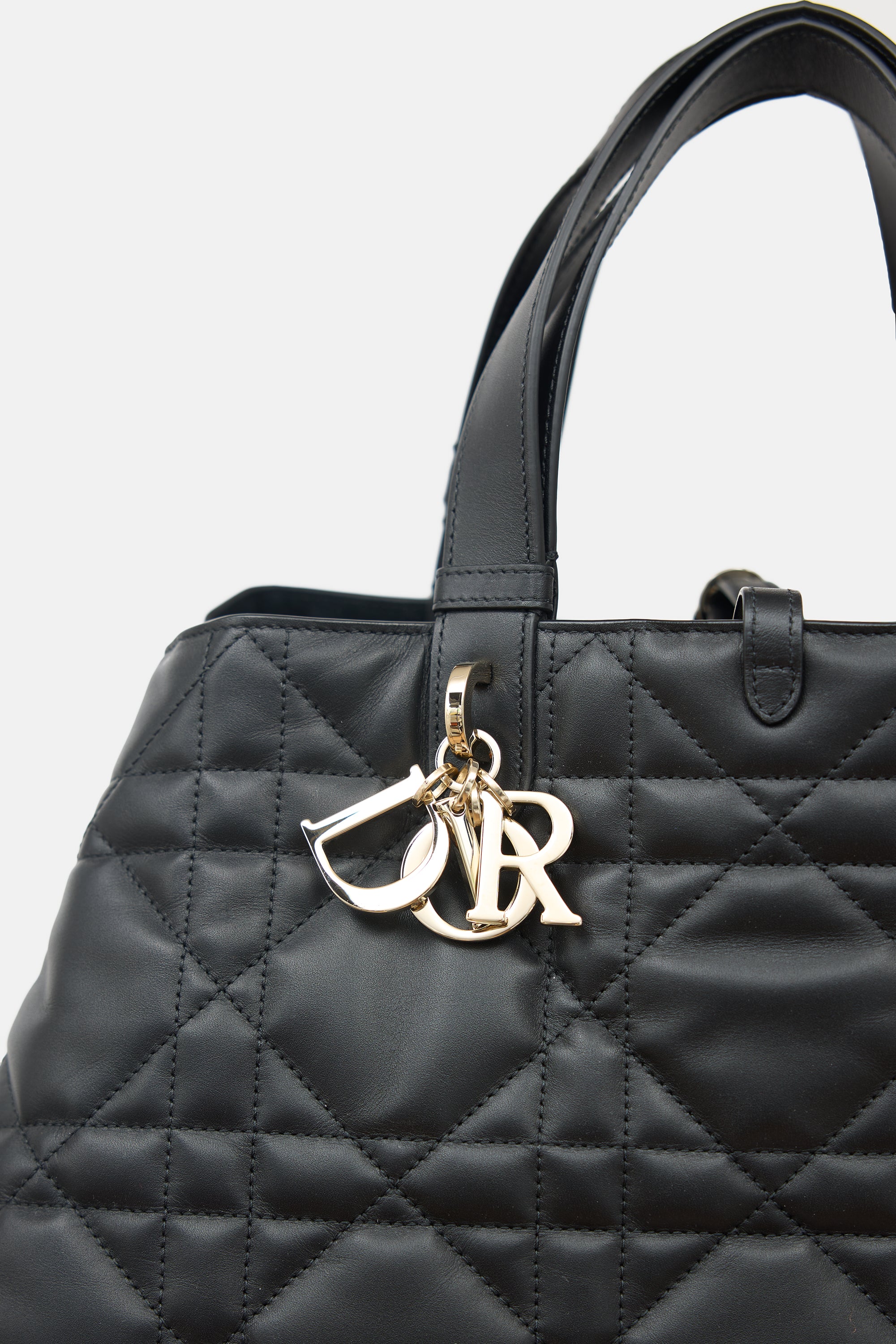 Pre-owned Christian Dior black leather Toujours tote bag featuring a Macrocannage quilted exterior, gold tone hardware, flat top handles, D.I.O.R. charms at handle, open top with CD twist lock fastening, and one main compartment with detachable zip pouch. Comes with original dust bag.