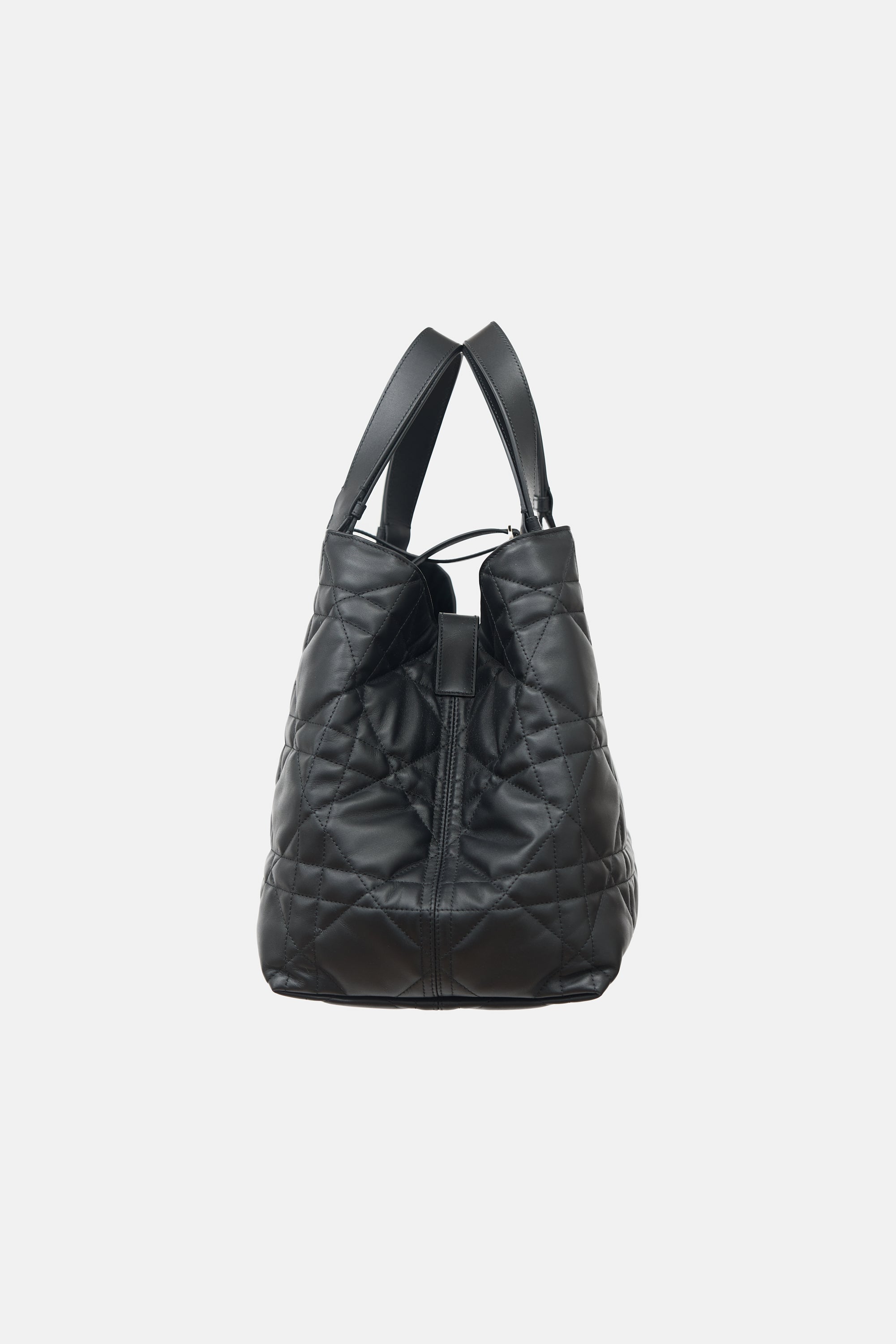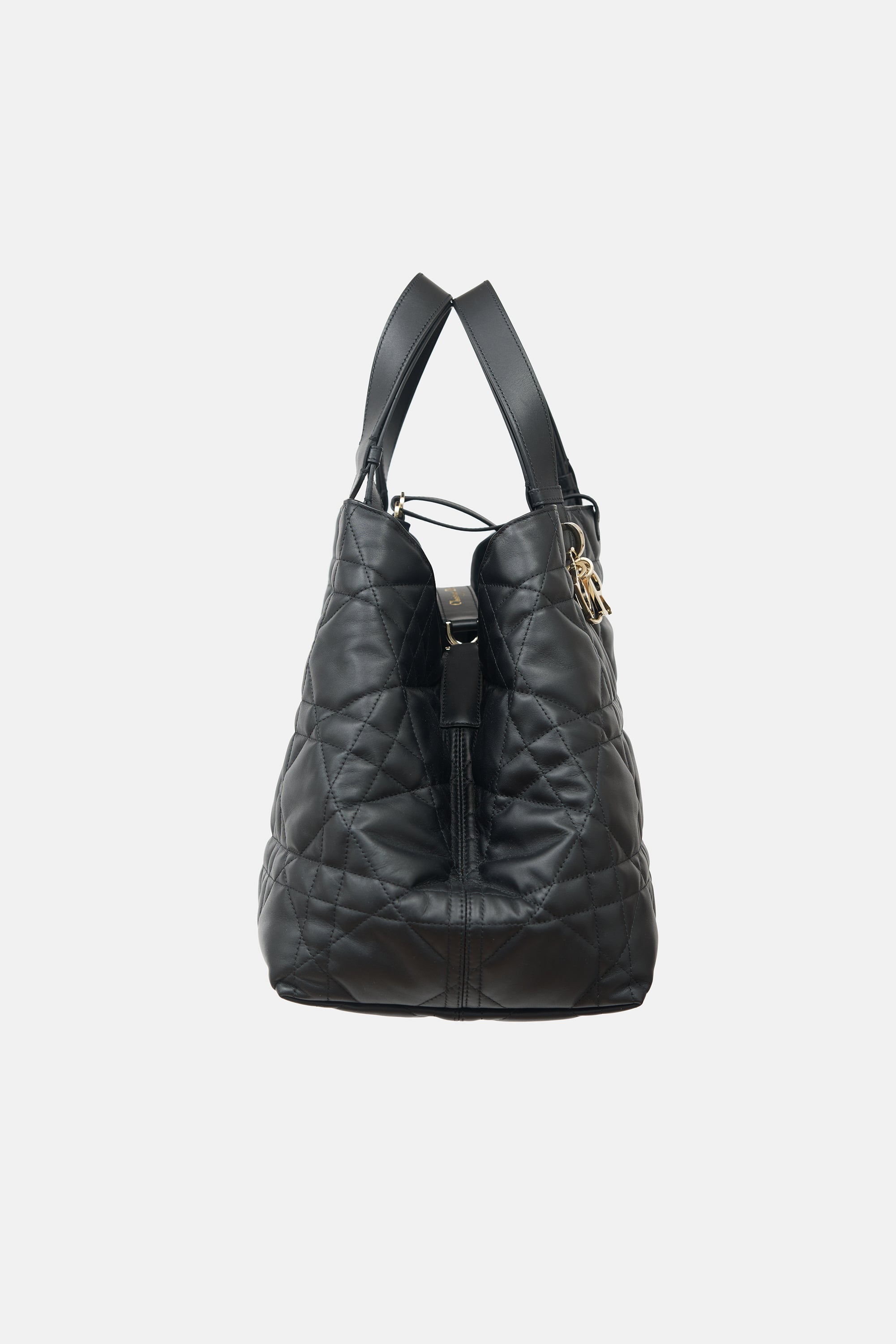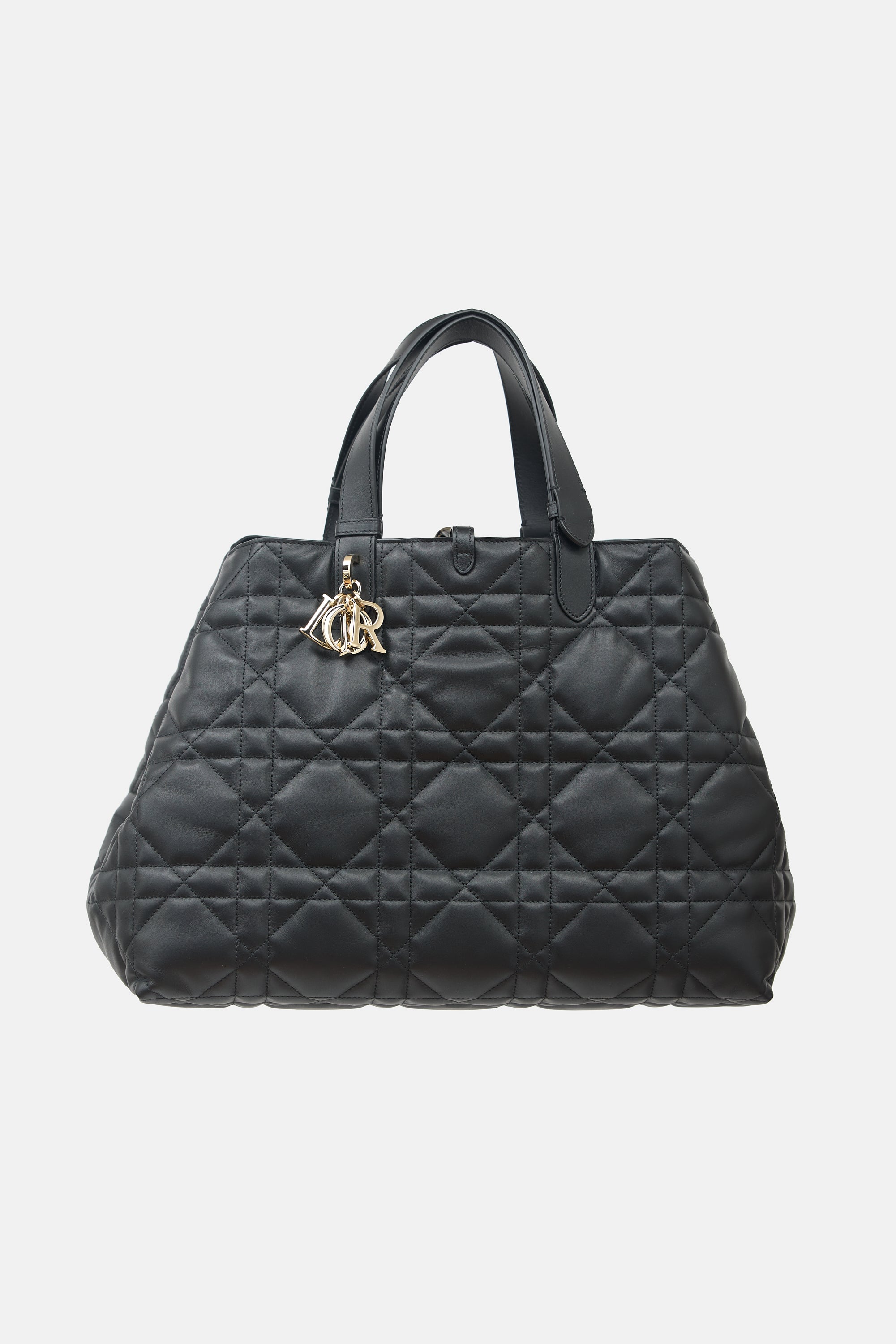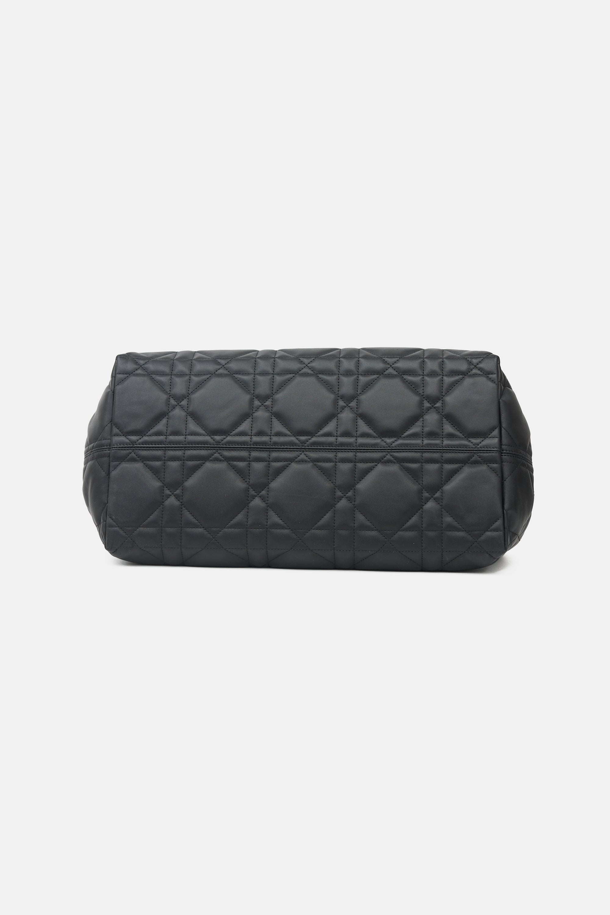 Pre-owned Christian Dior black leather Toujours tote bag featuring a Macrocannage quilted exterior, gold tone hardware, flat top handles, D.I.O.R. charms at handle, open top with CD twist lock fastening, and one main compartment with detachable zip pouch. Comes with original dust bag.