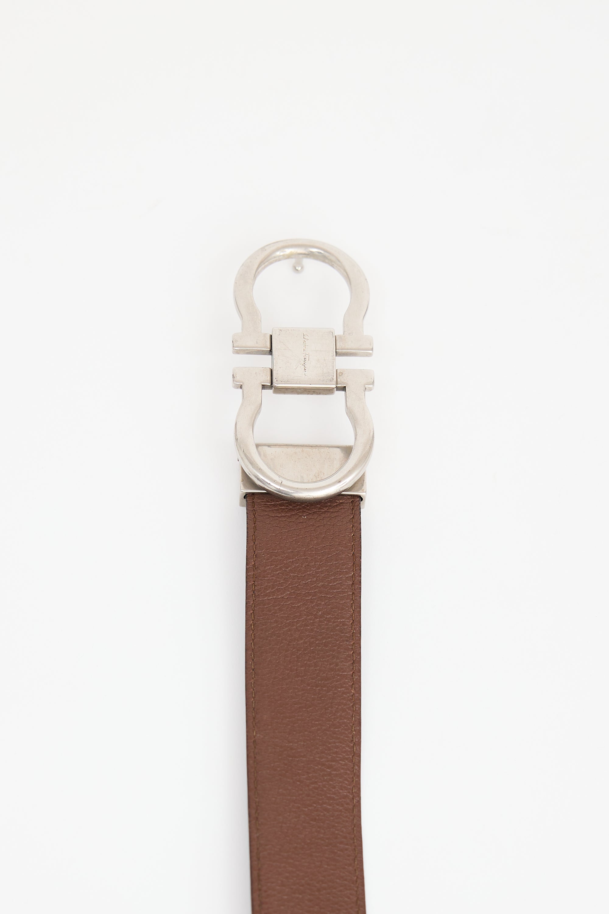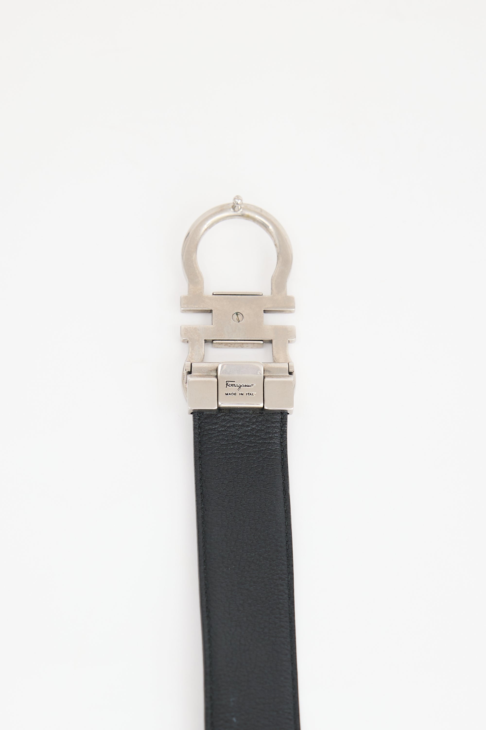 Pre-owned Ferragamo black and brown leather reversible belt featuring silver tone Gancini buckle, push pin closure, and engraved logo at buckle front and reverse.