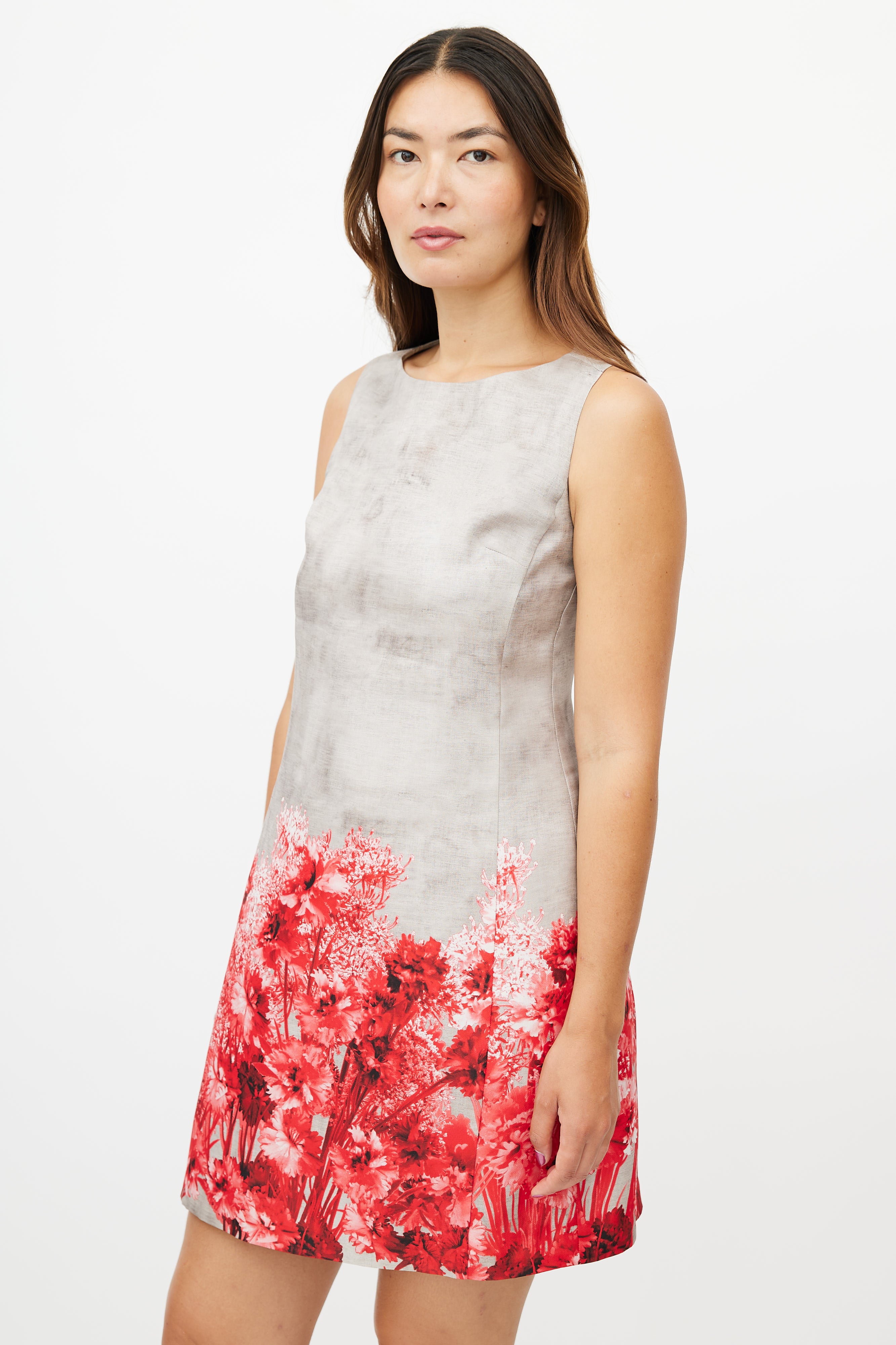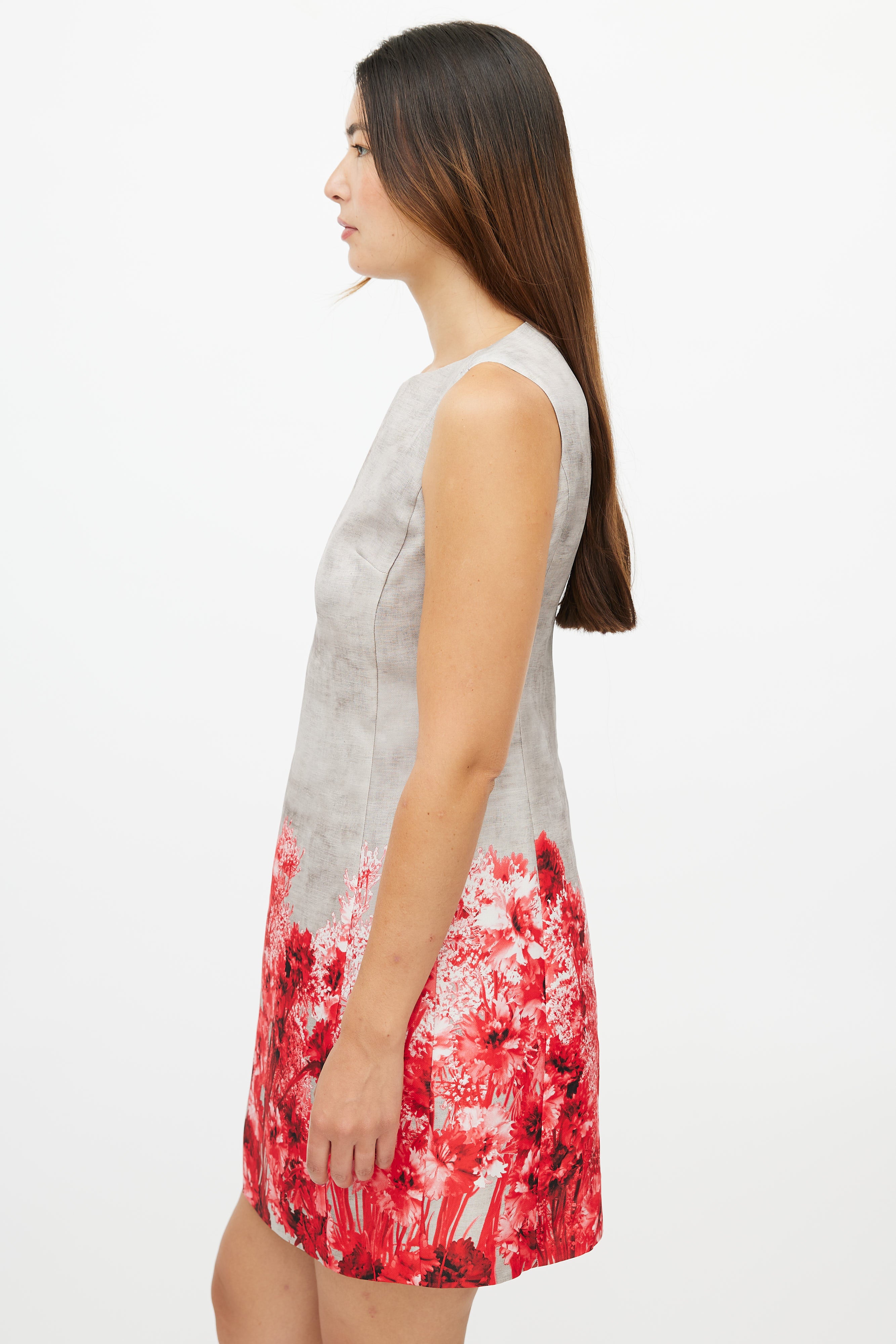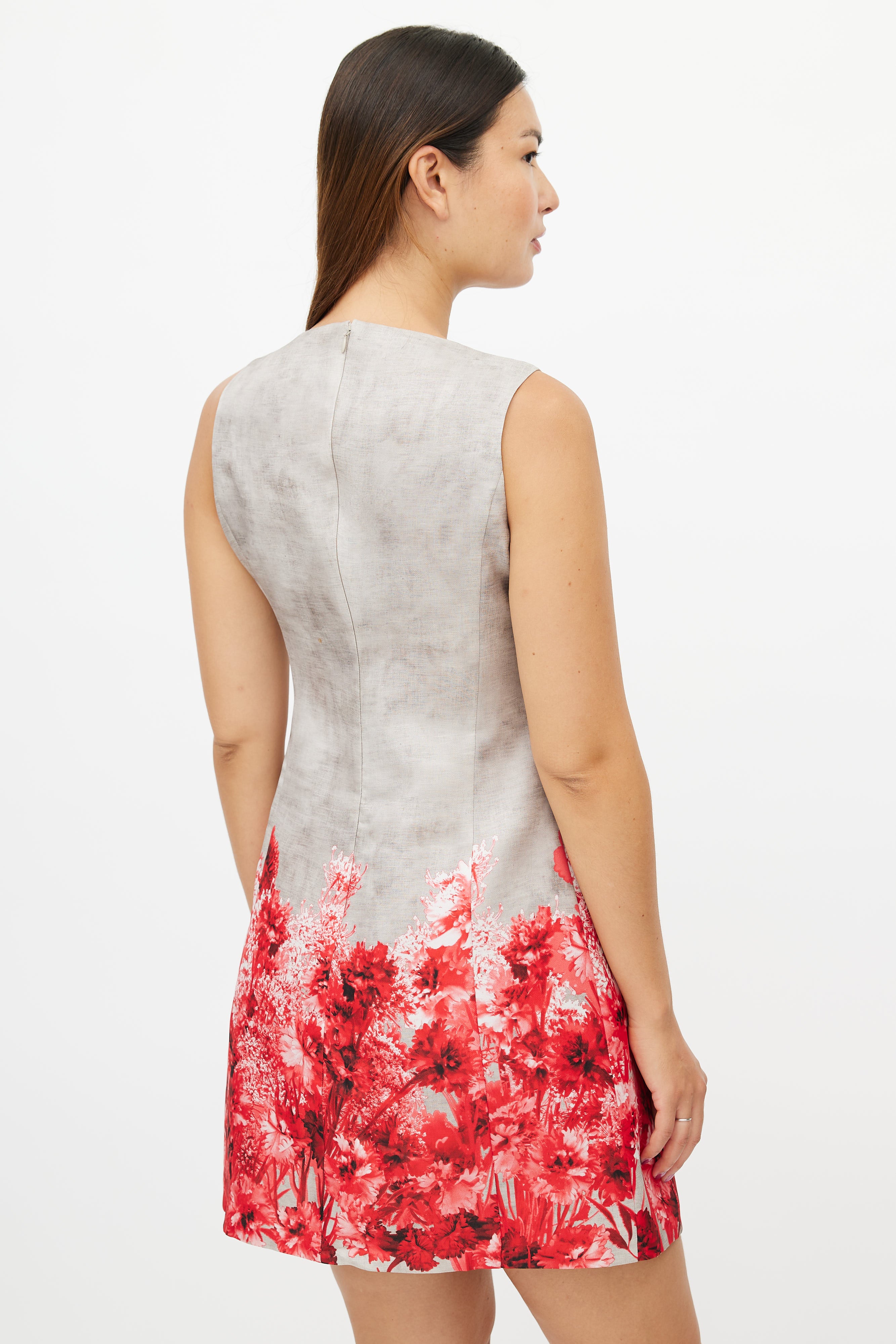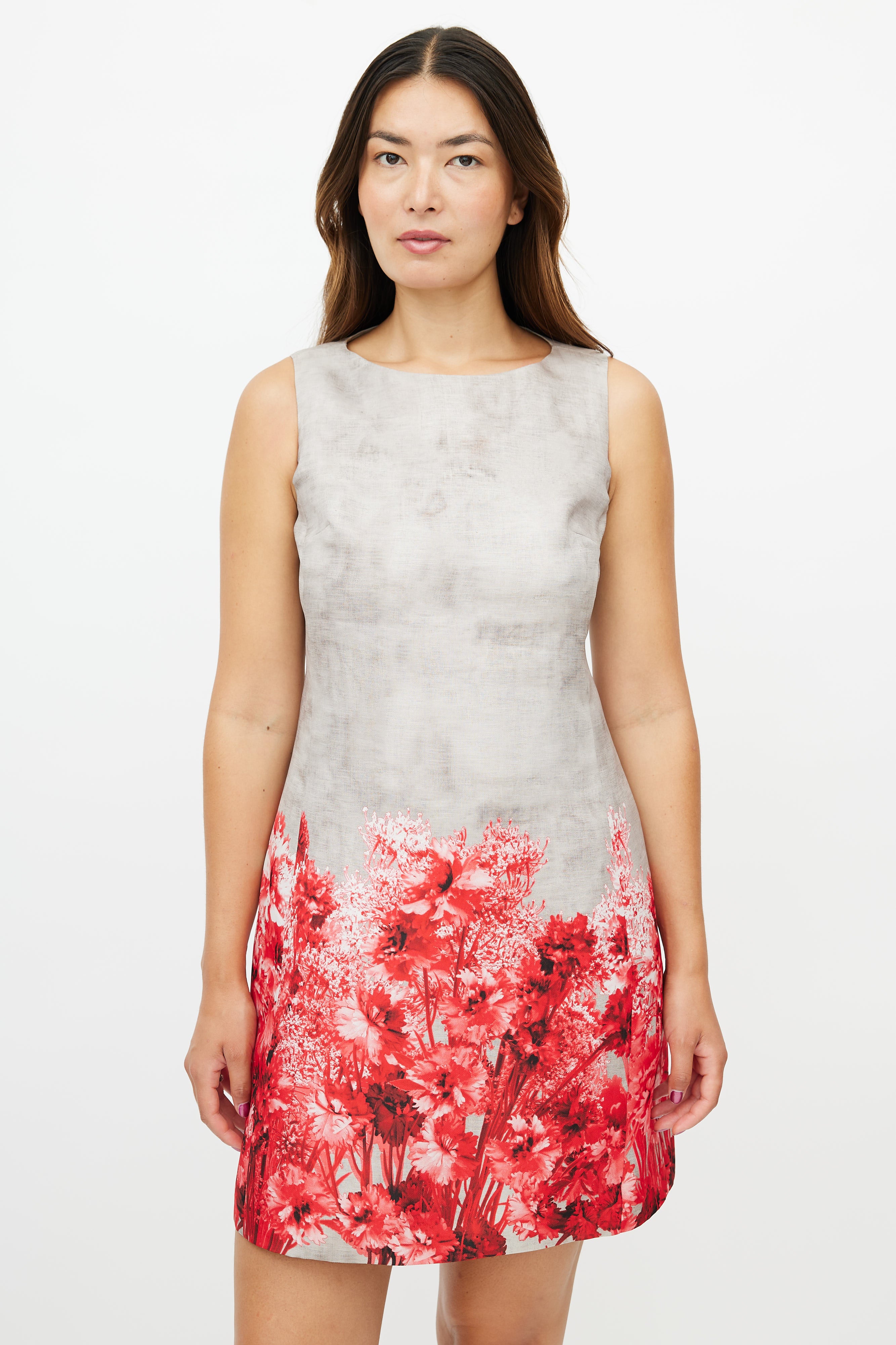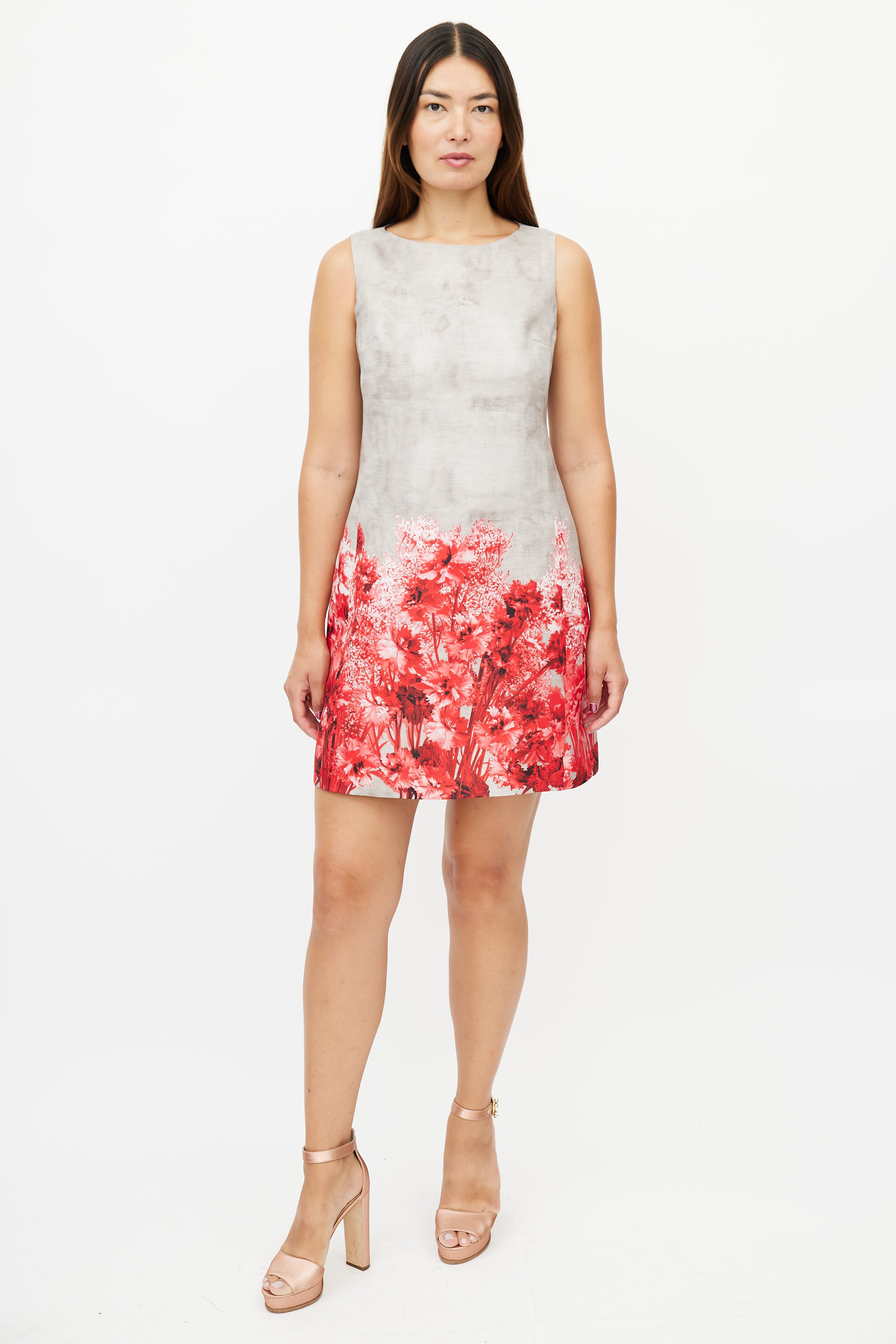 Pre-owned Giambattista Valli grey dress featuring round neckline, concealed zip closure at back, and red floral print at hem.