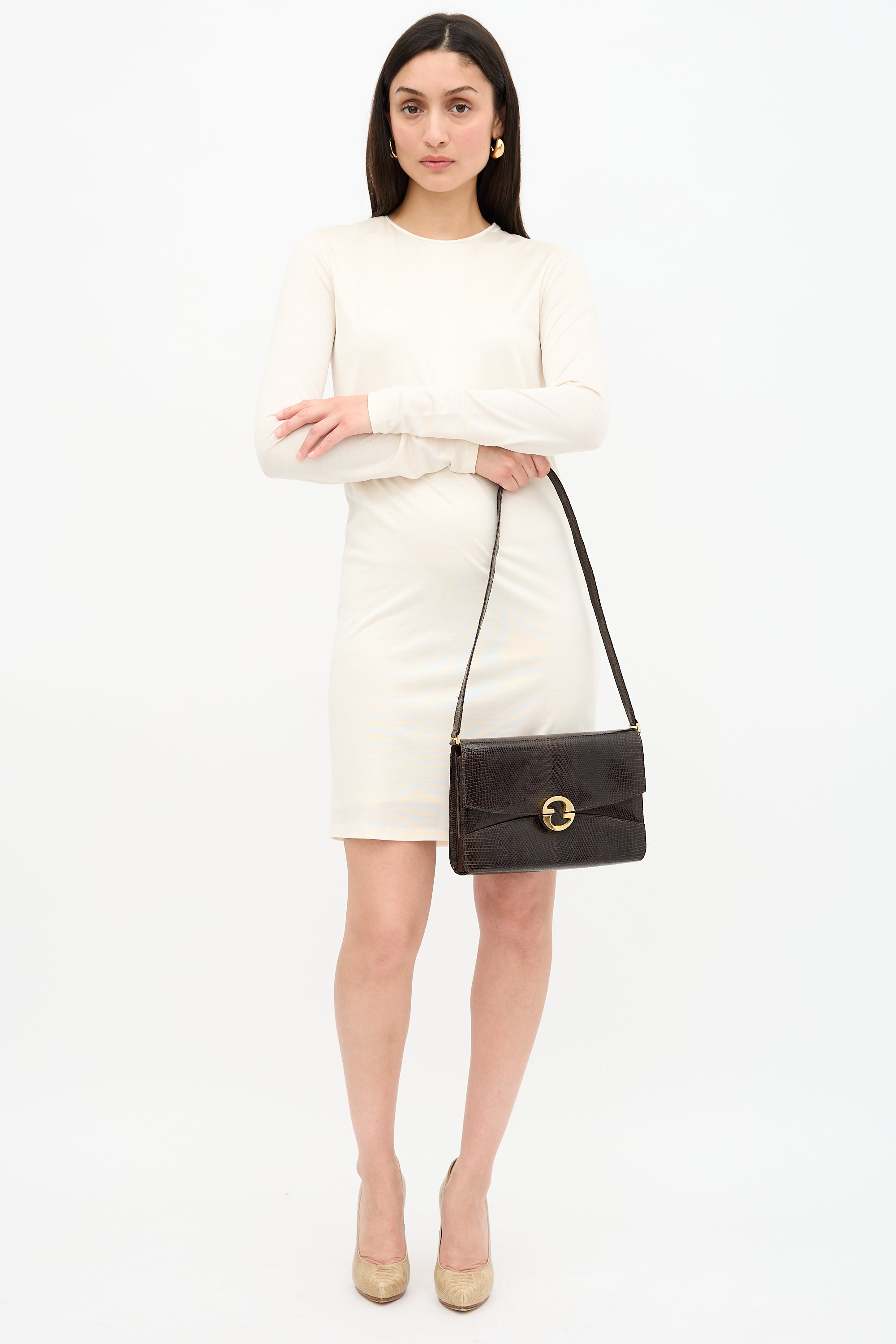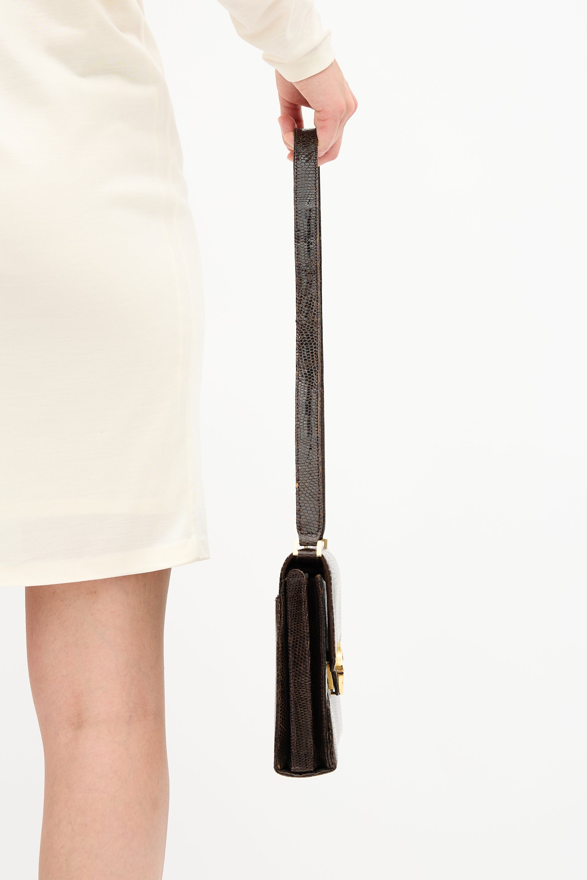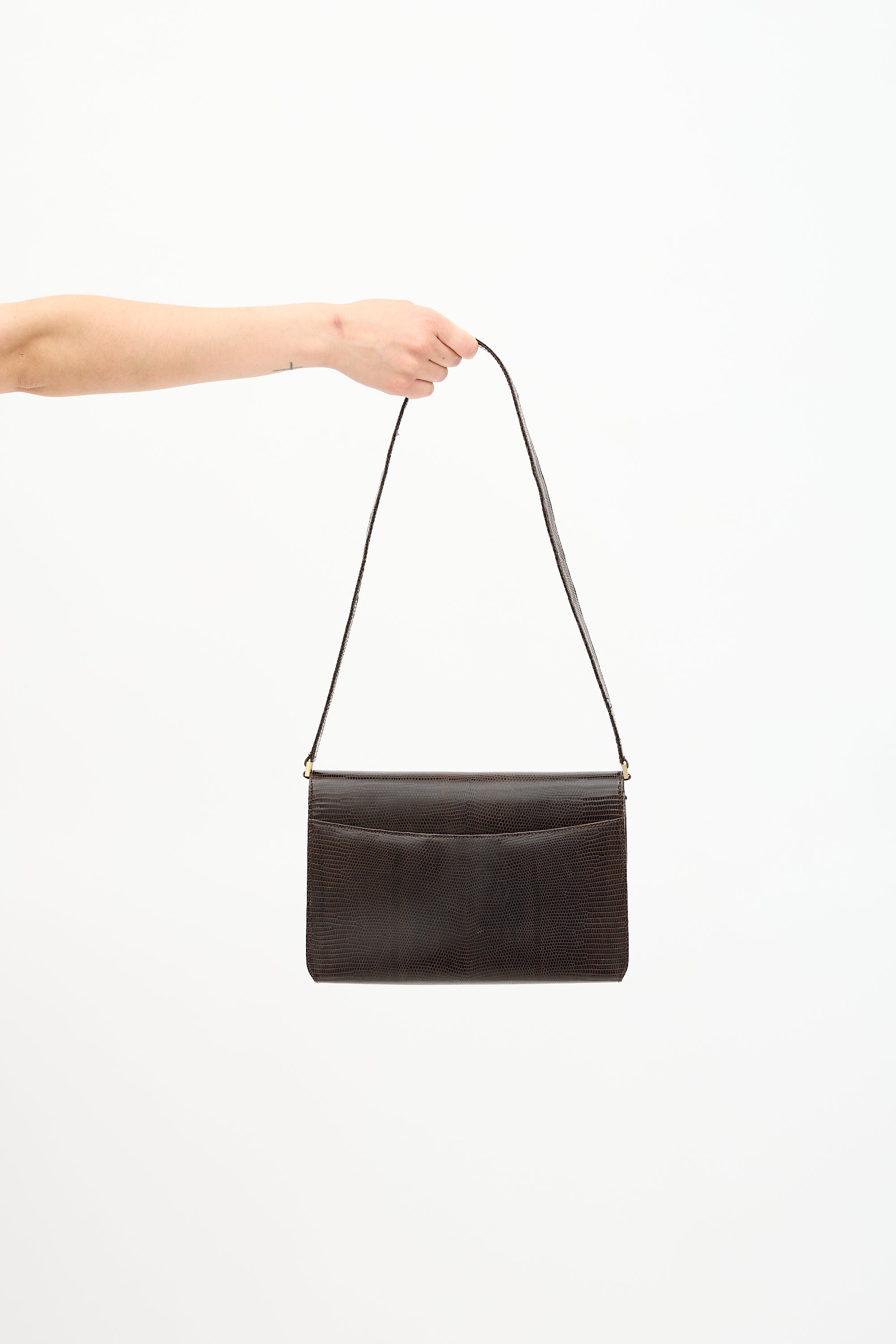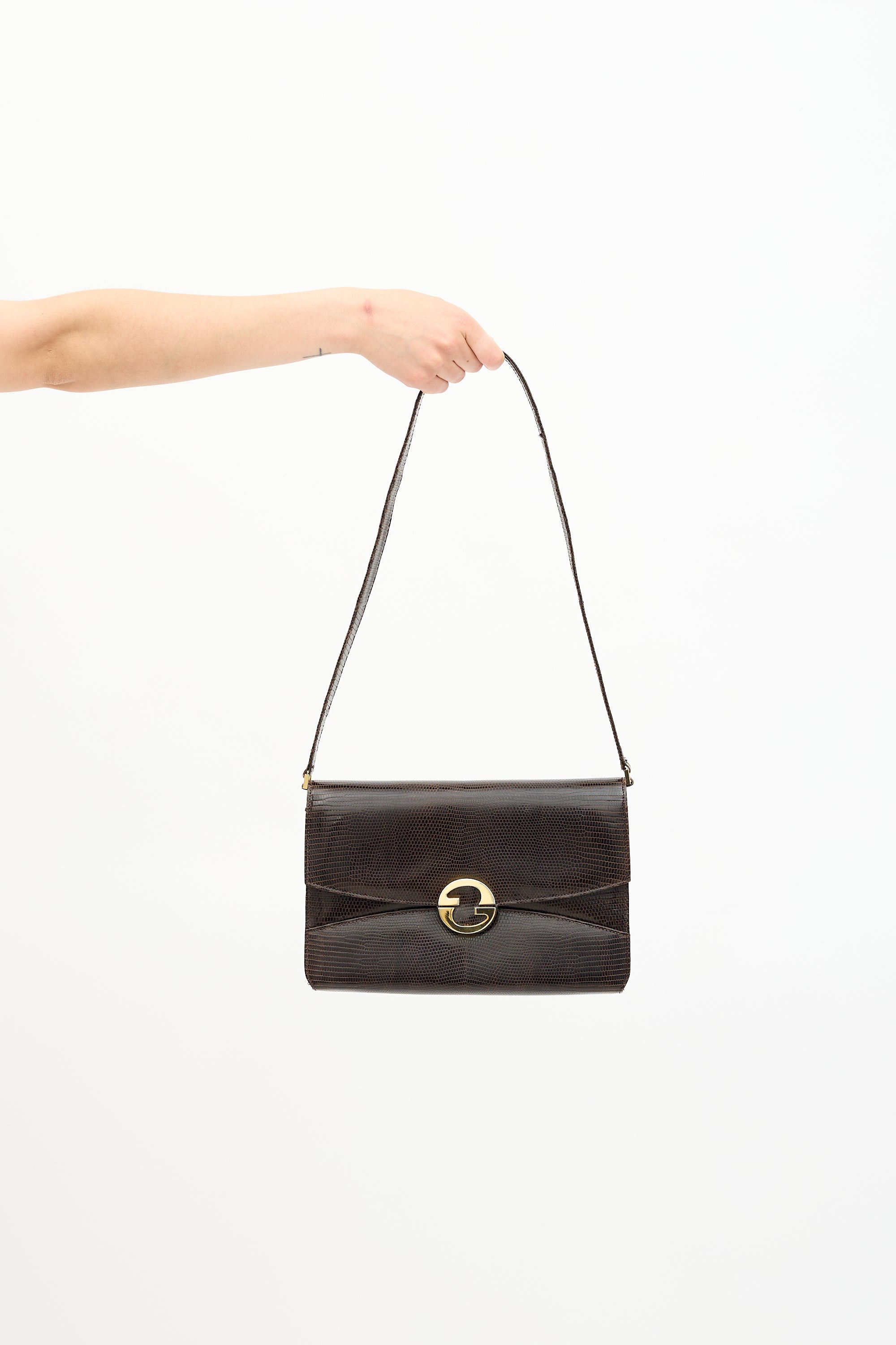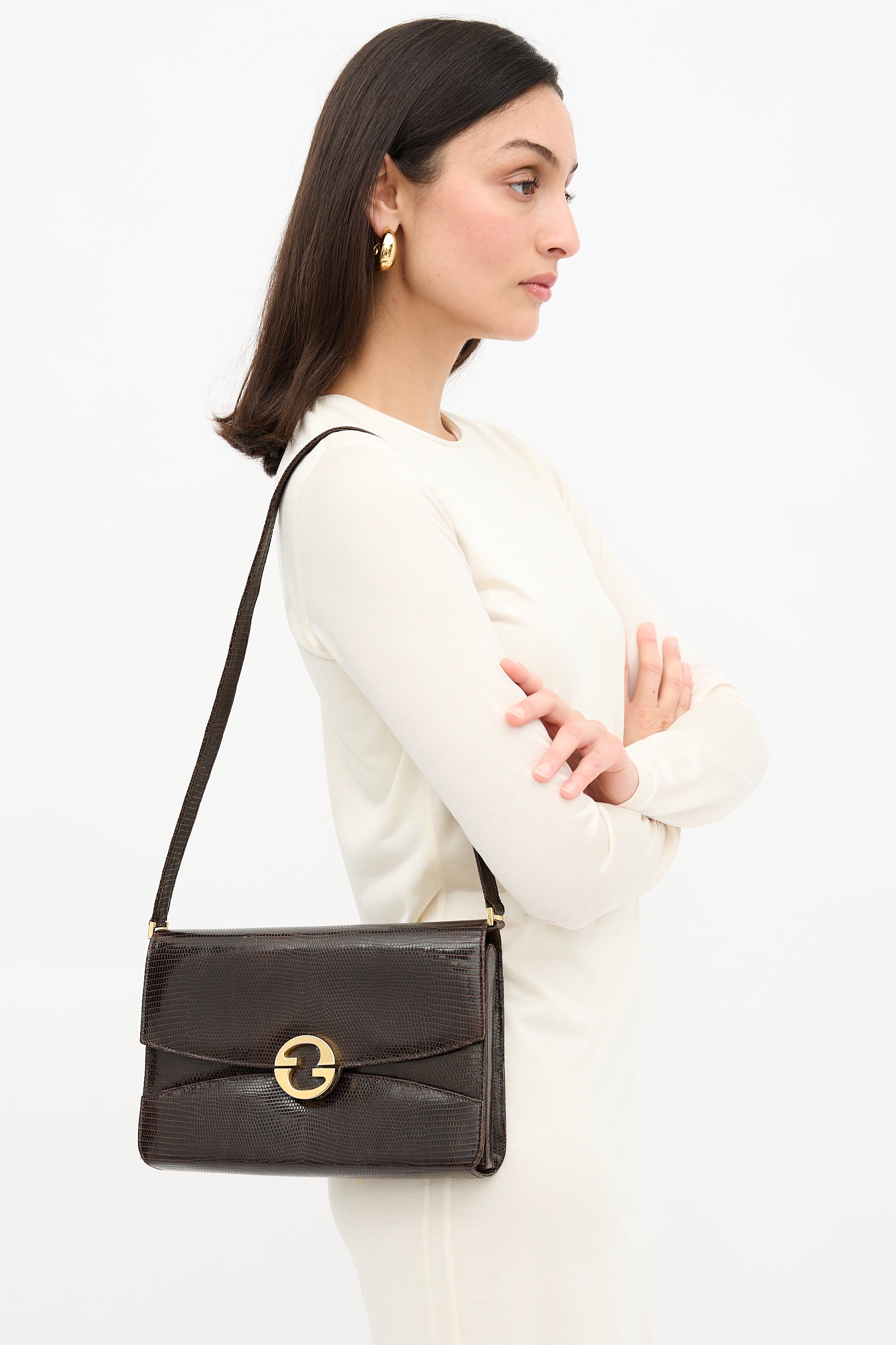 Pre-owned Gucci brown embossed leather shoulder bag featuring gold tone hardware, flat shoulder strap, front flap with GG logo and push lock closure, back slip pocket, and two main compartments with two slip pockets, one zip pocket, and one flap pocket.