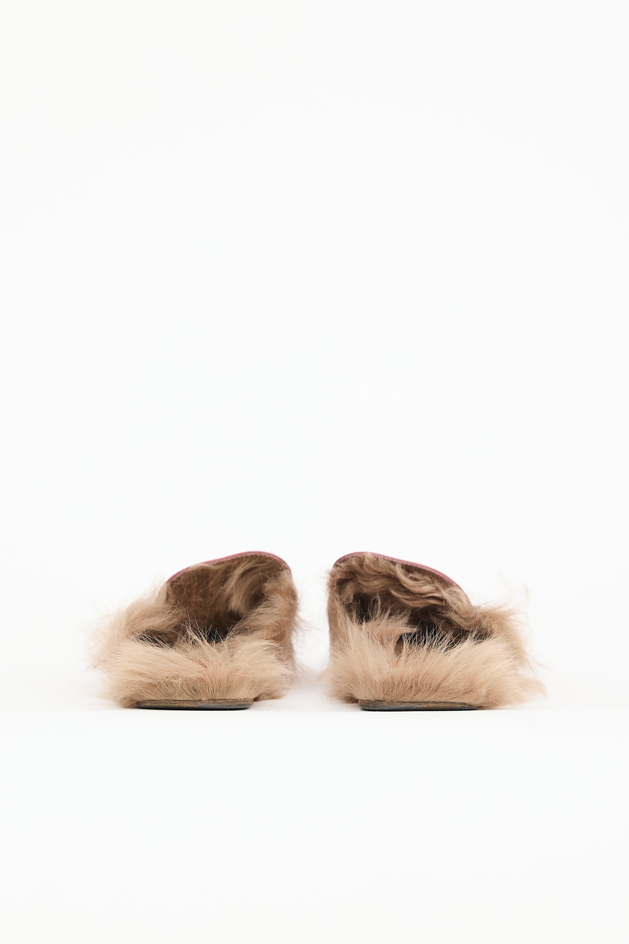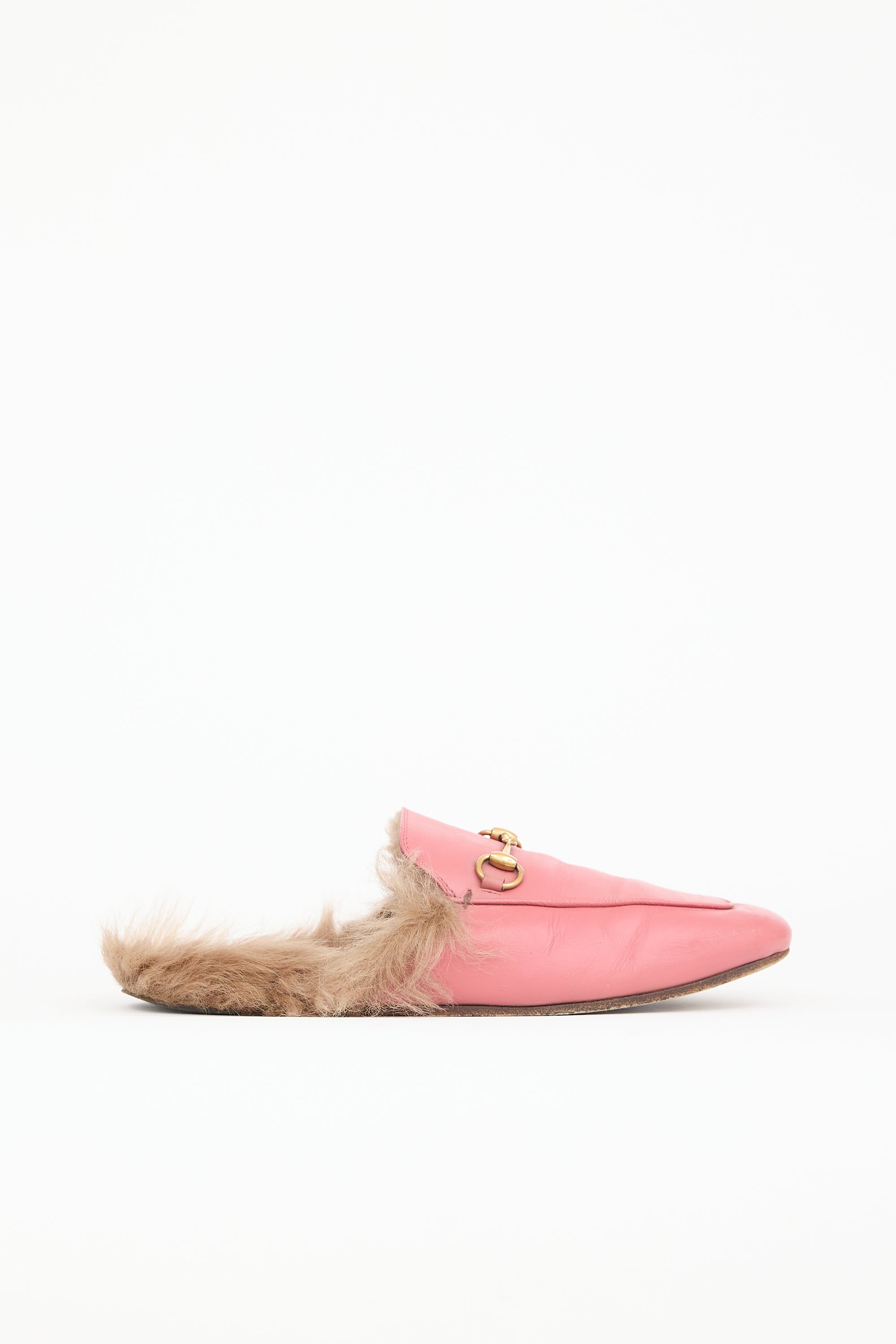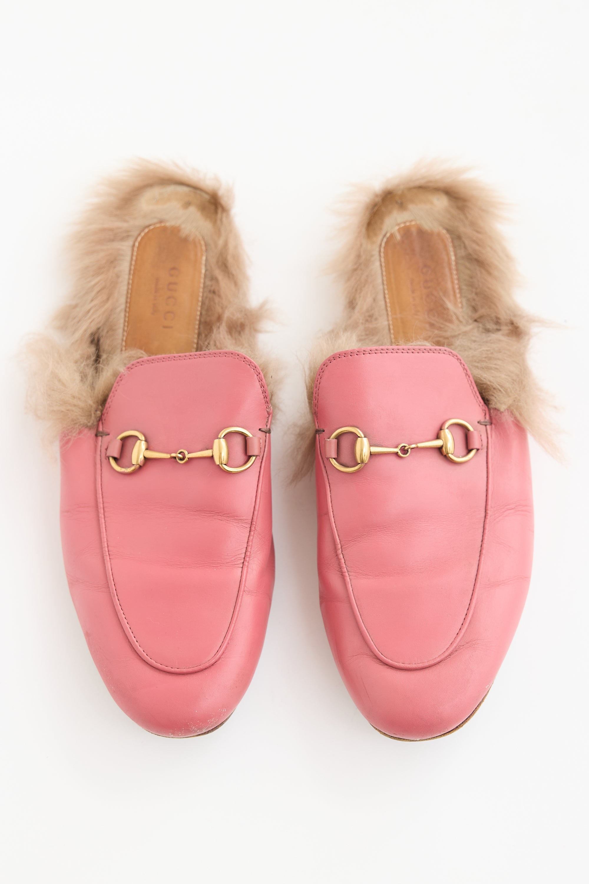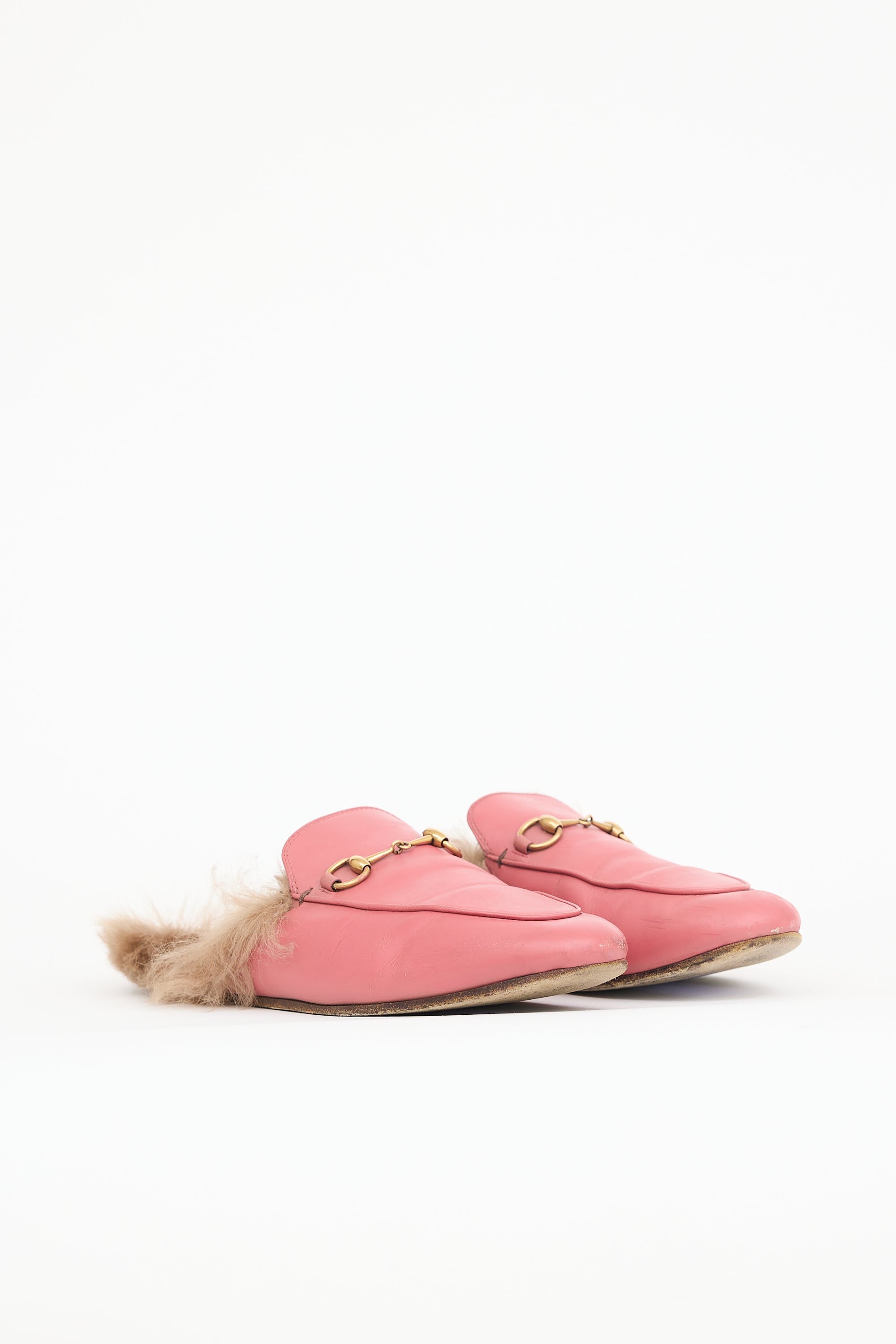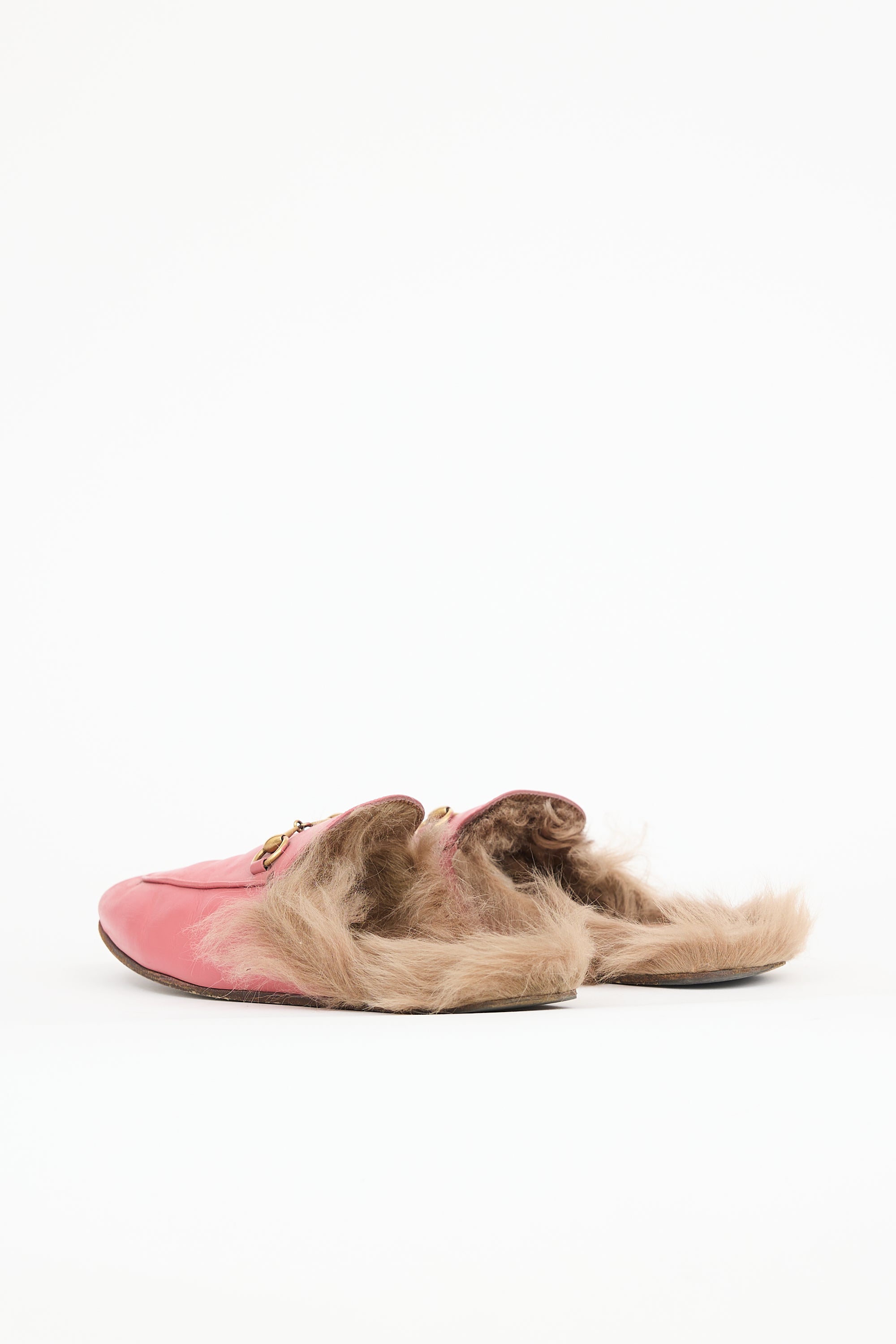Pre-owned Gucci pink leather Princetown mules featuring rounded toe, gold tone horse bit hardware, and fur lined insoles. Comes with original dust bags.