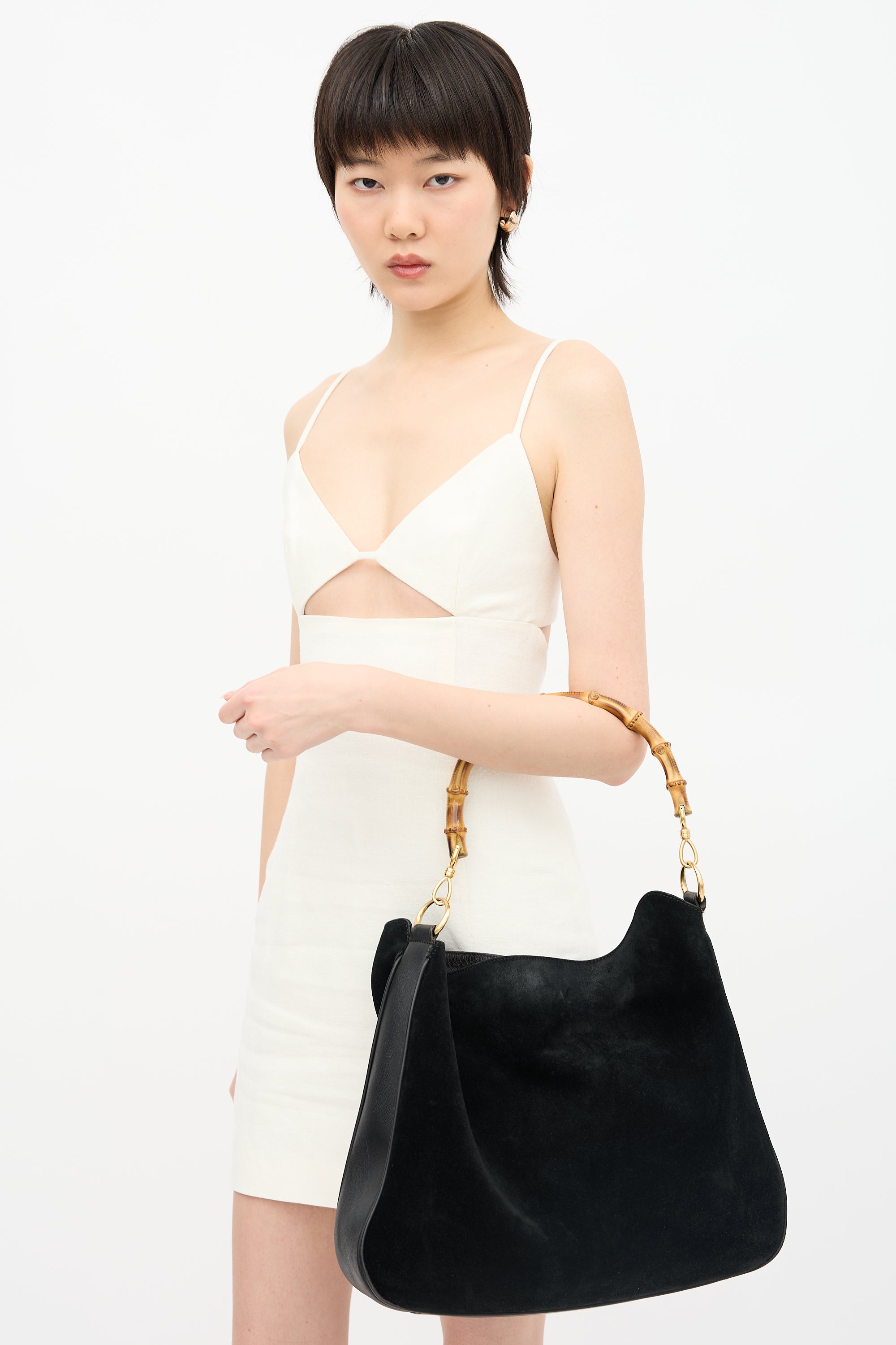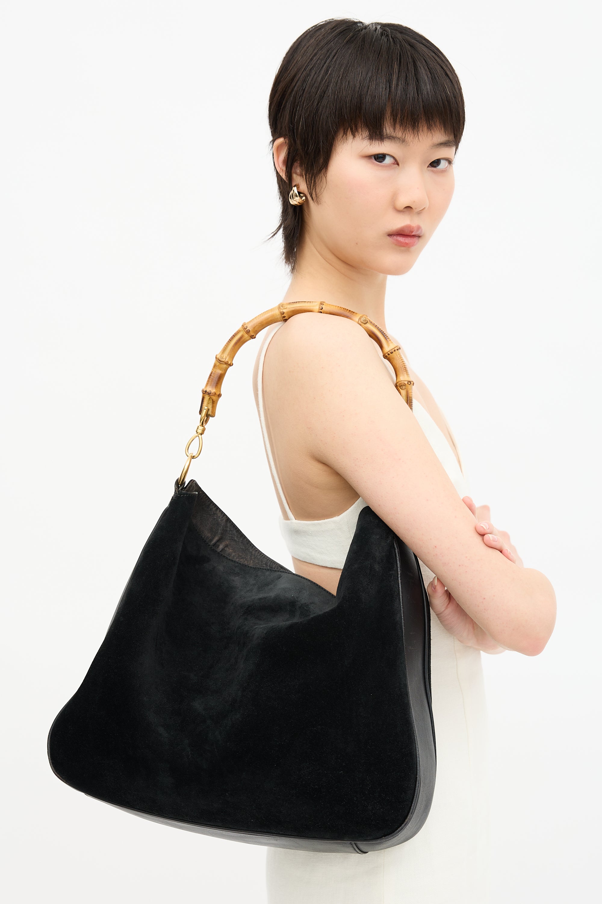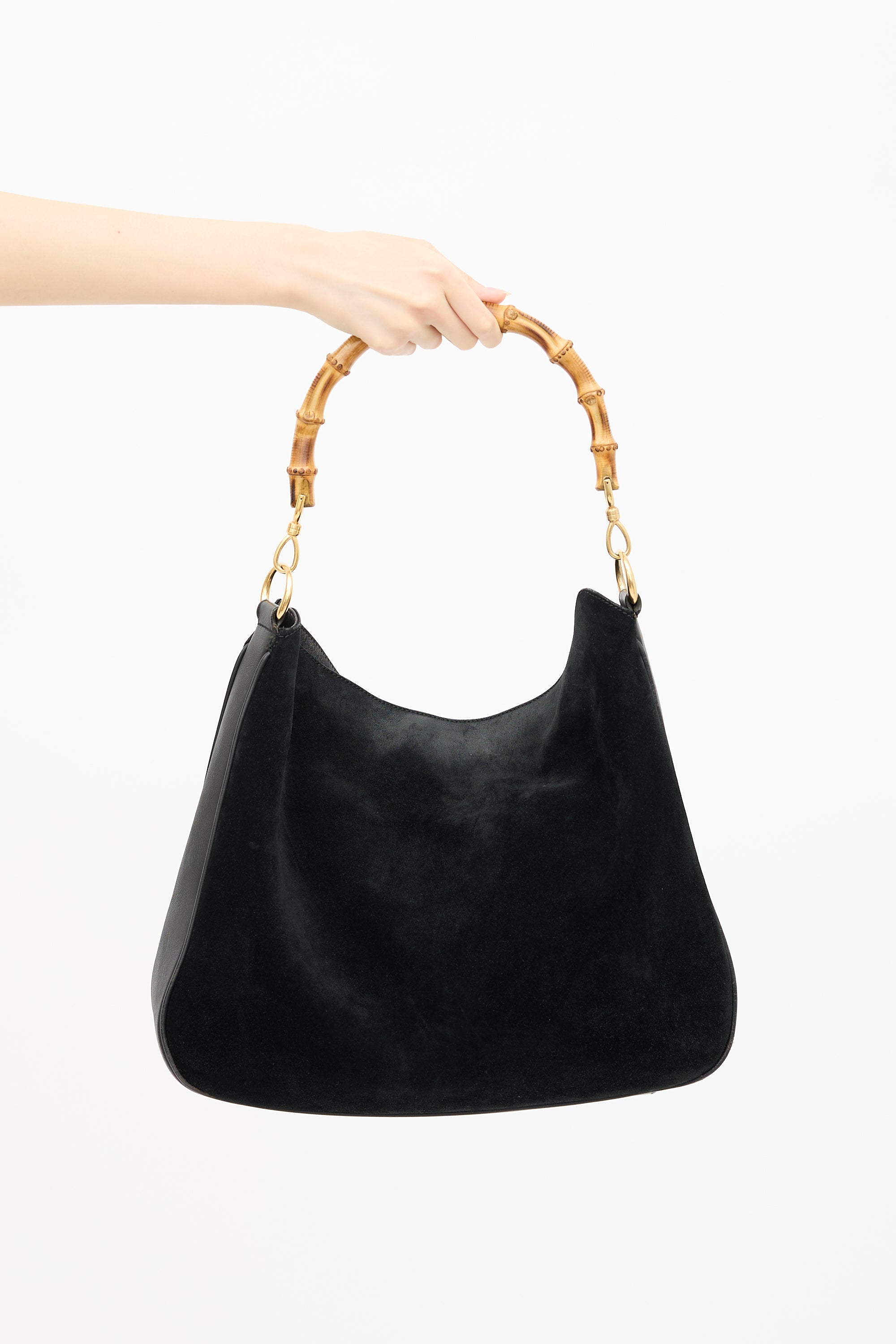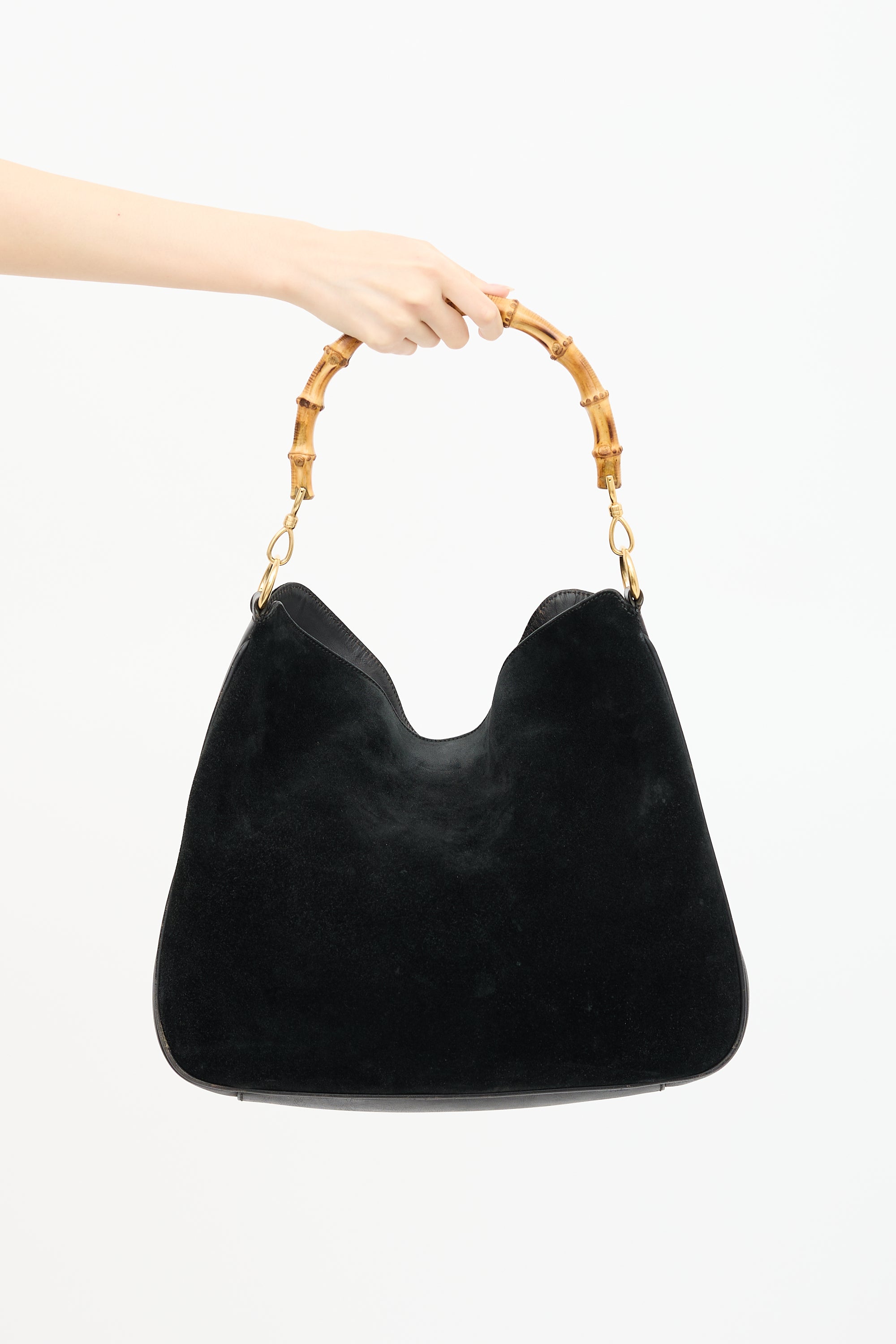 Pre-owned Gucci vintage black suede two way shoulder bag featuring leather panels, signature brown bamboo top handle, removable shoulder strap, gold tone hardware, magnetic top closure, and one lined main compartment with one zip pocket.