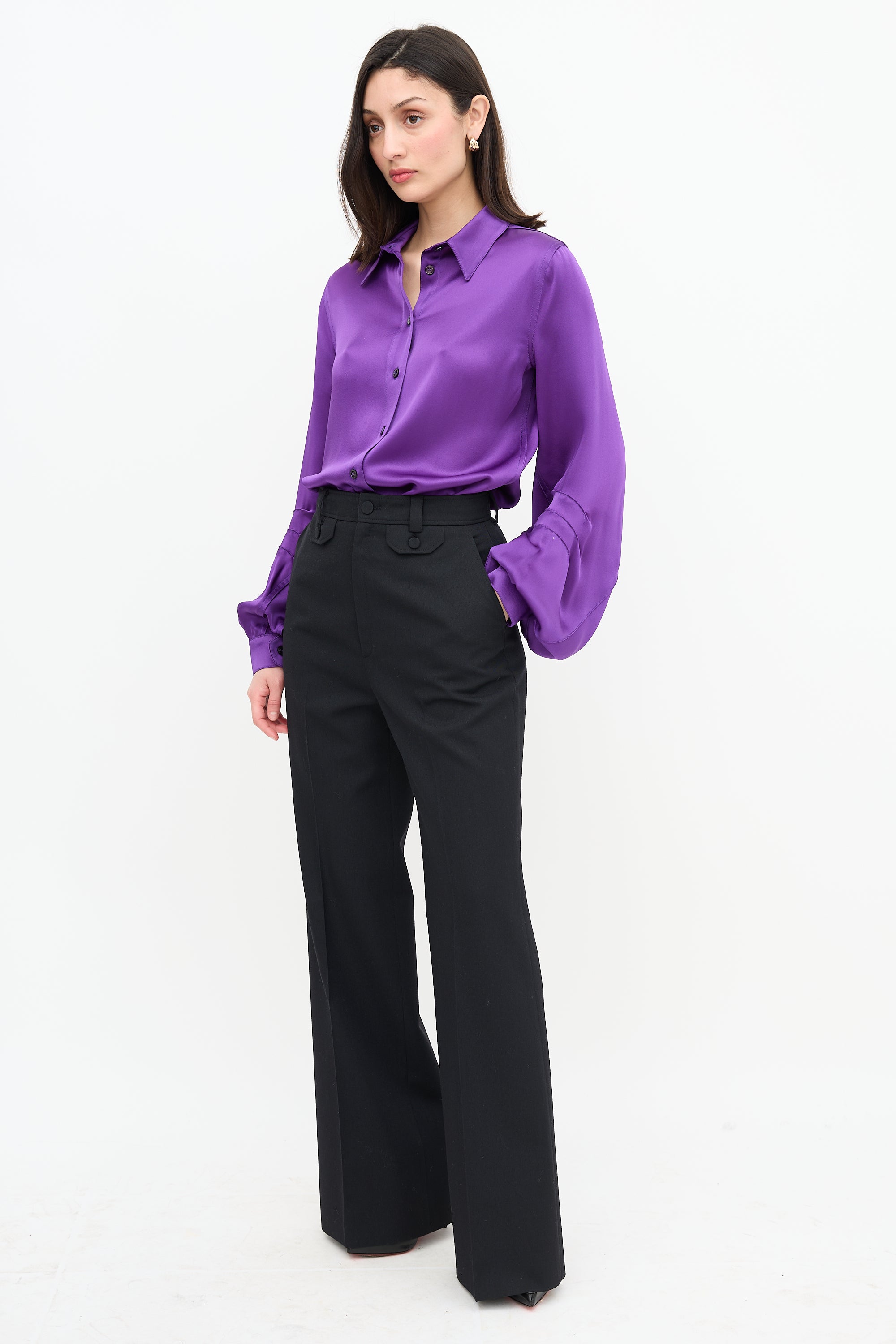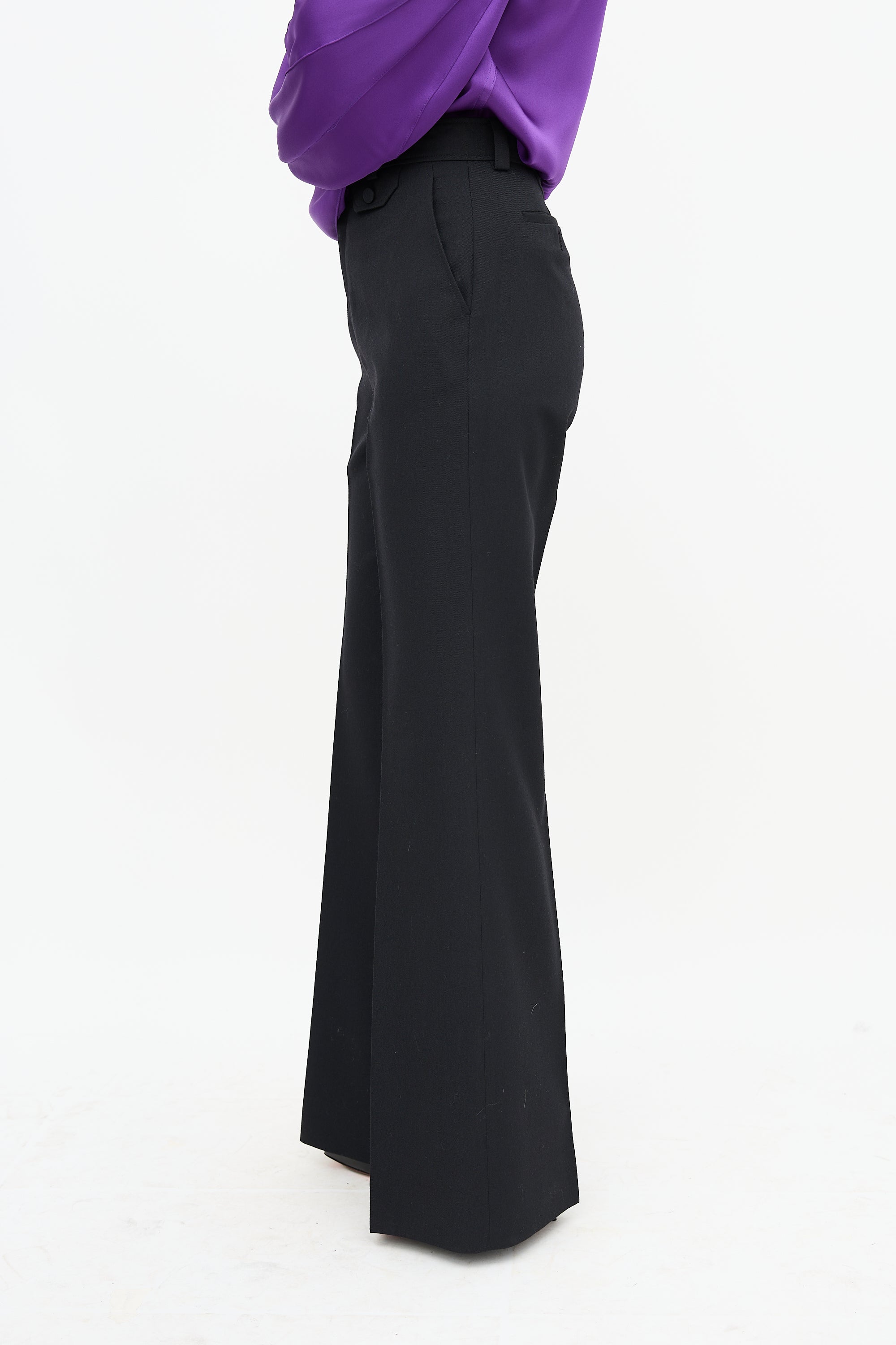 Pre-owned Gucci black twill trousers featuring high rise, belt loops, zip fly, six pocket styling, and wide leg. Unlined.