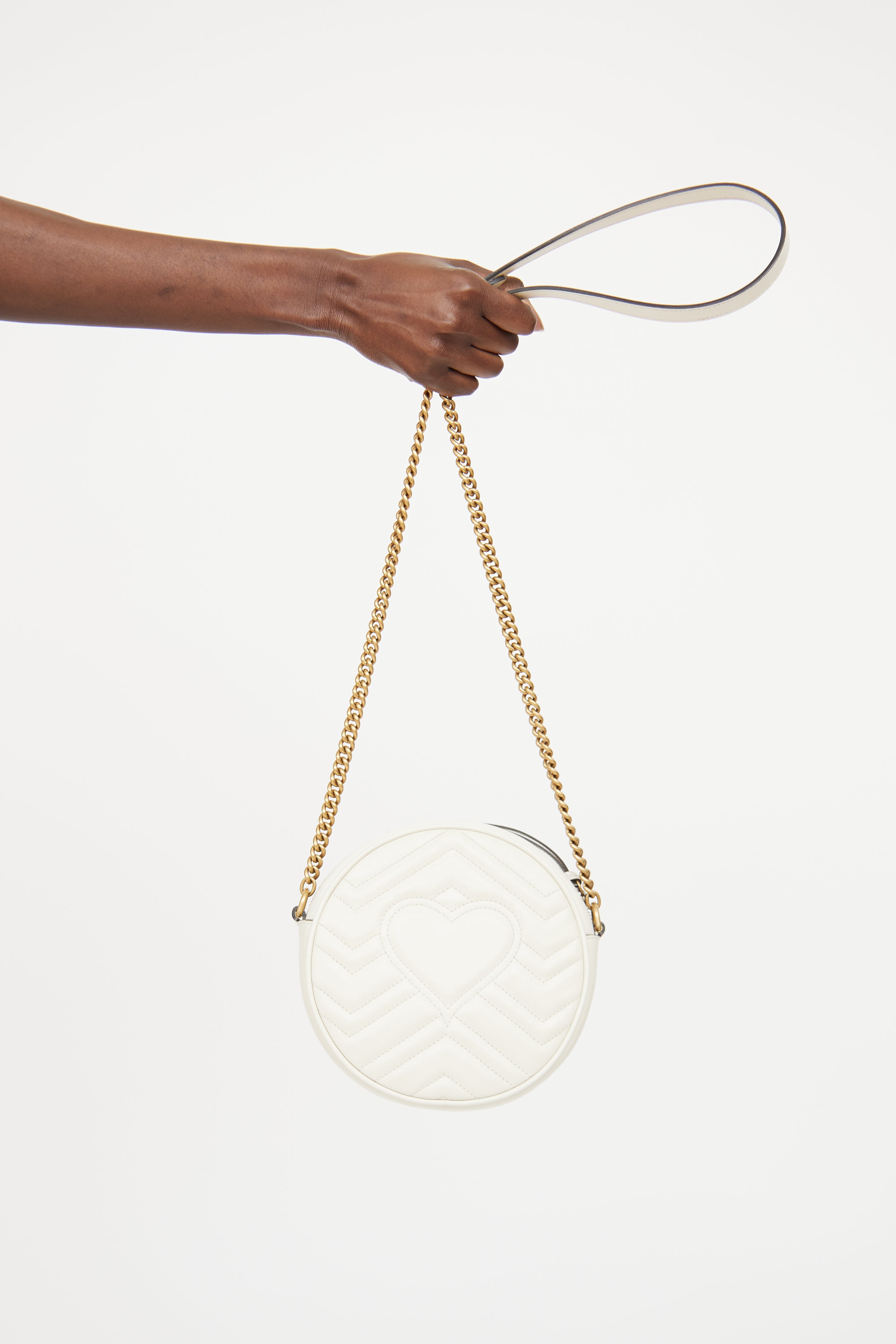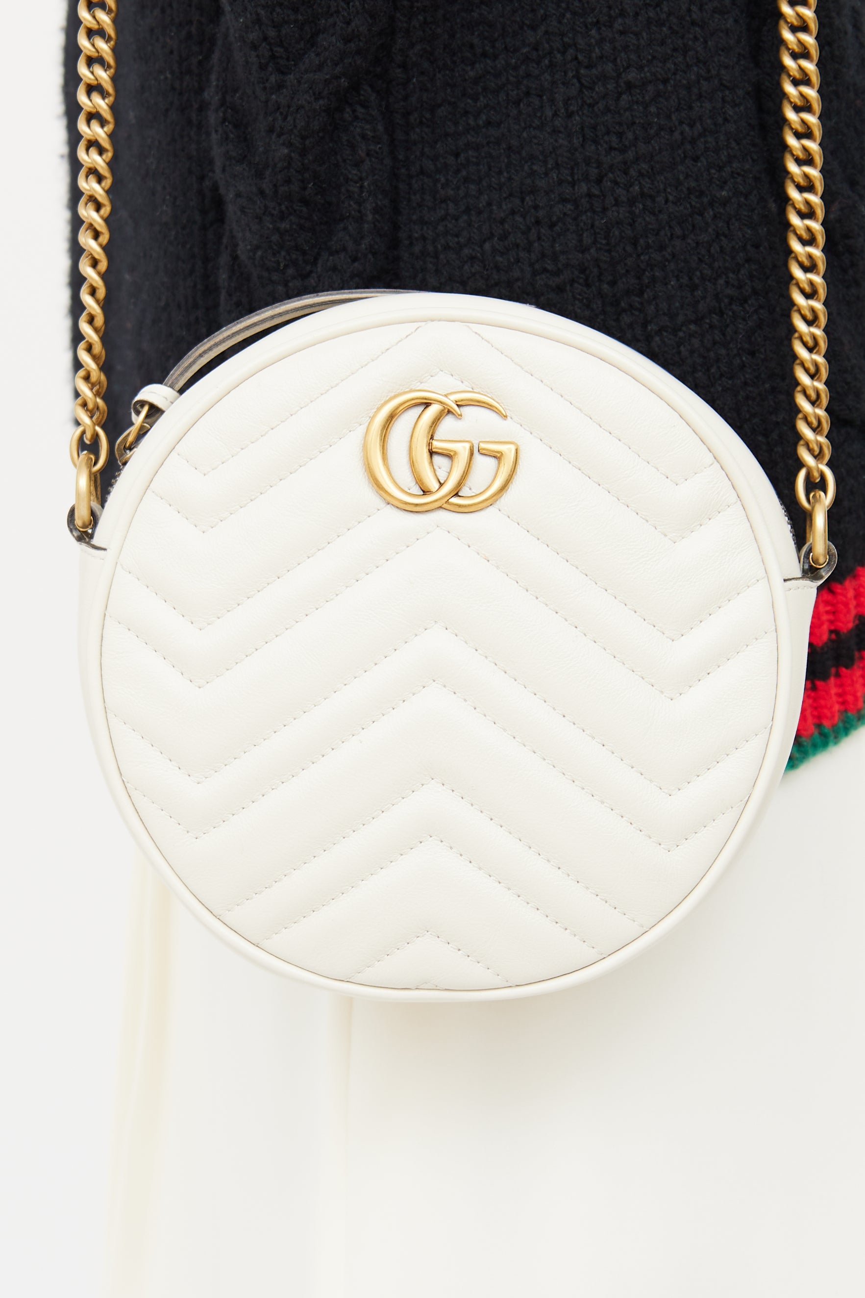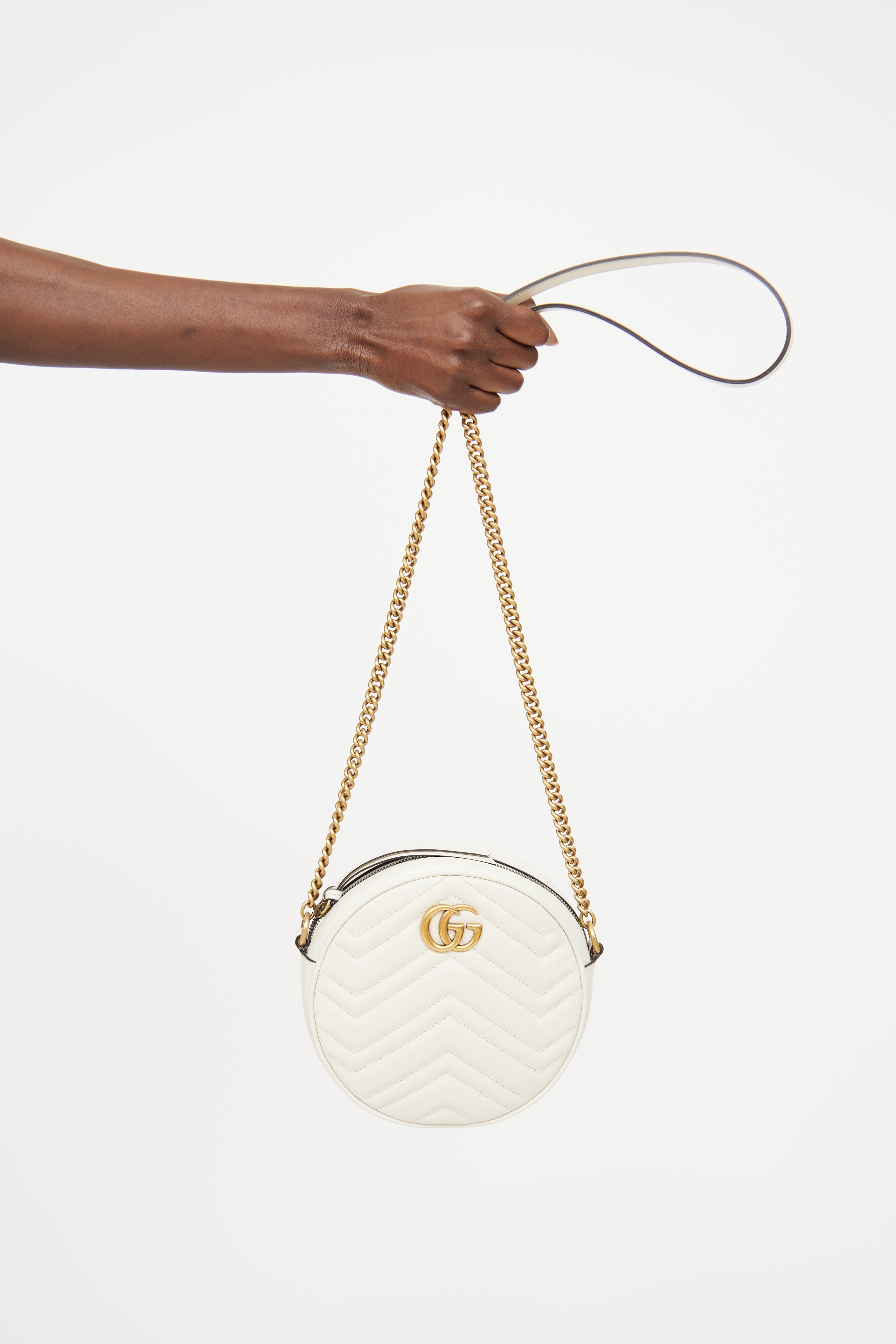 Pre-owned Gucci white Marmont Matelasse round bag featuring gold tone GG torchon logo at front, one main compartment, gold tone chain-link shoulder strap, and top zip closure.