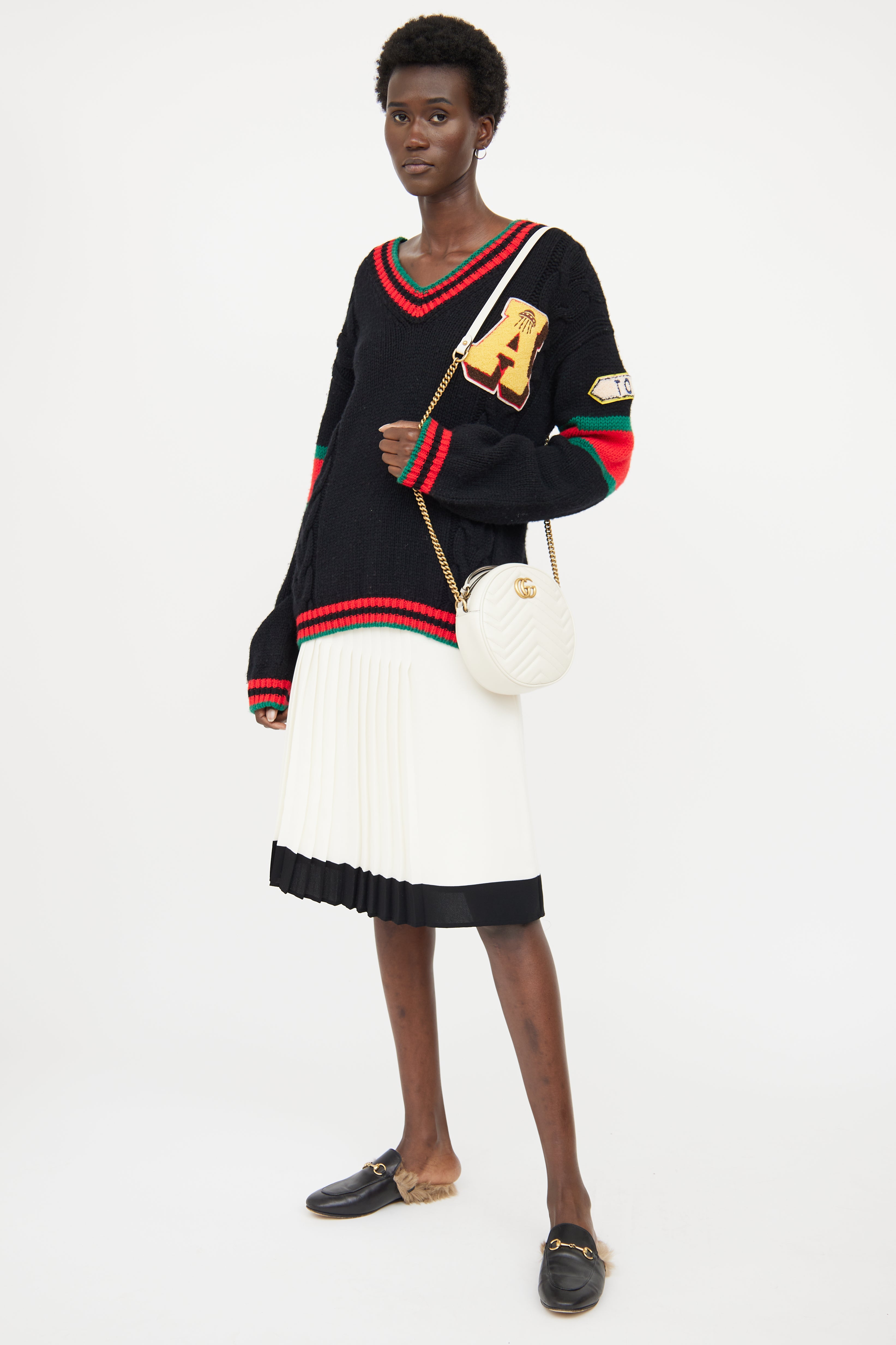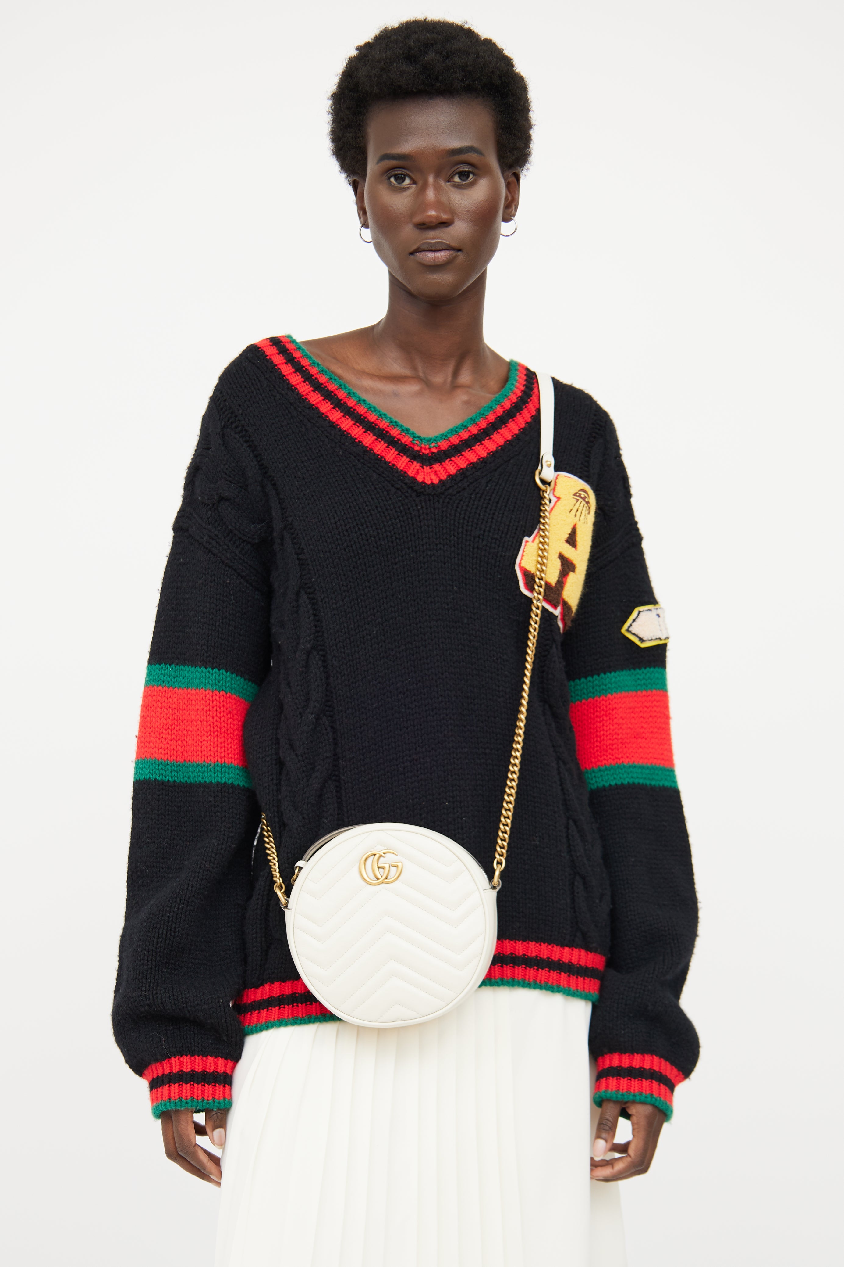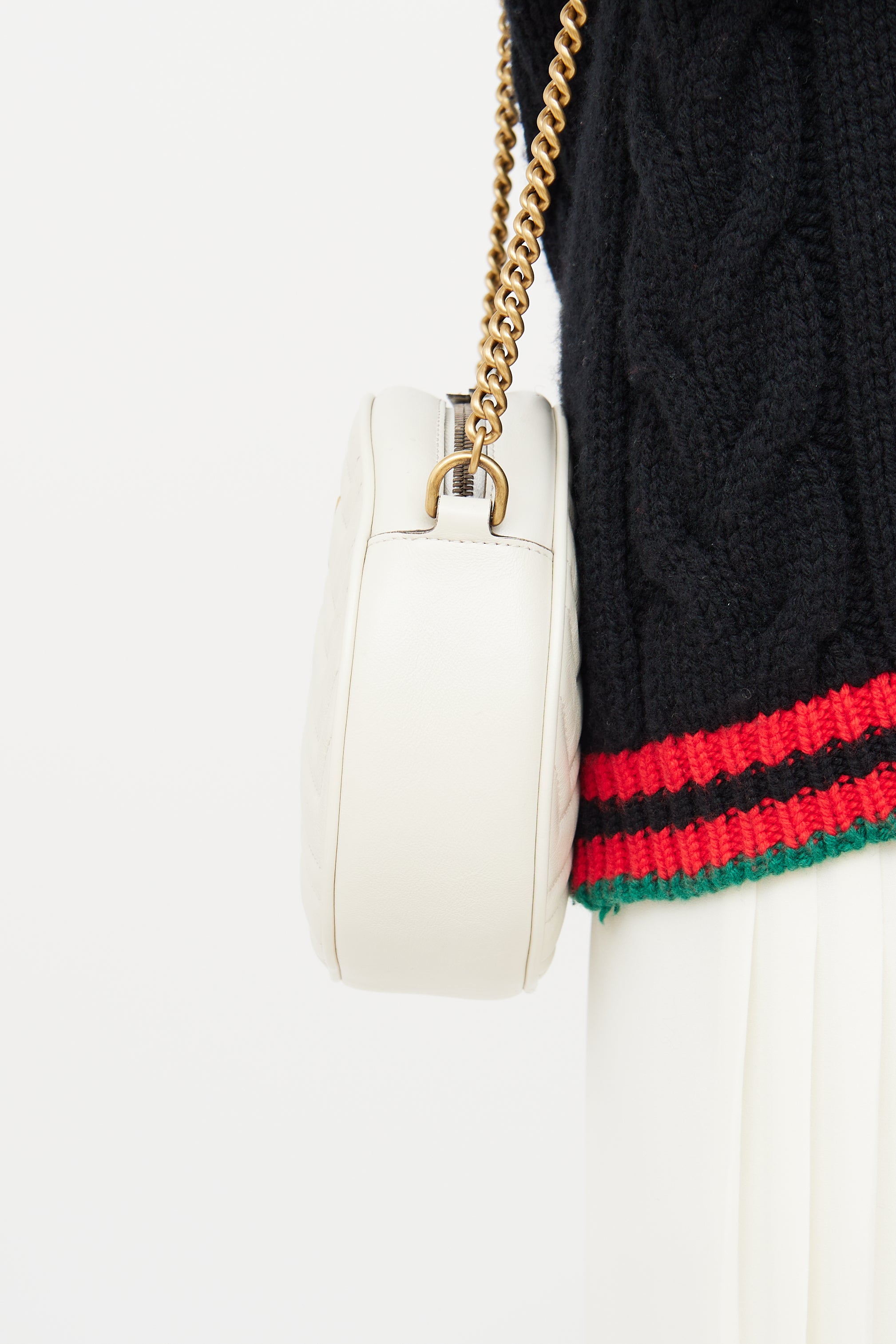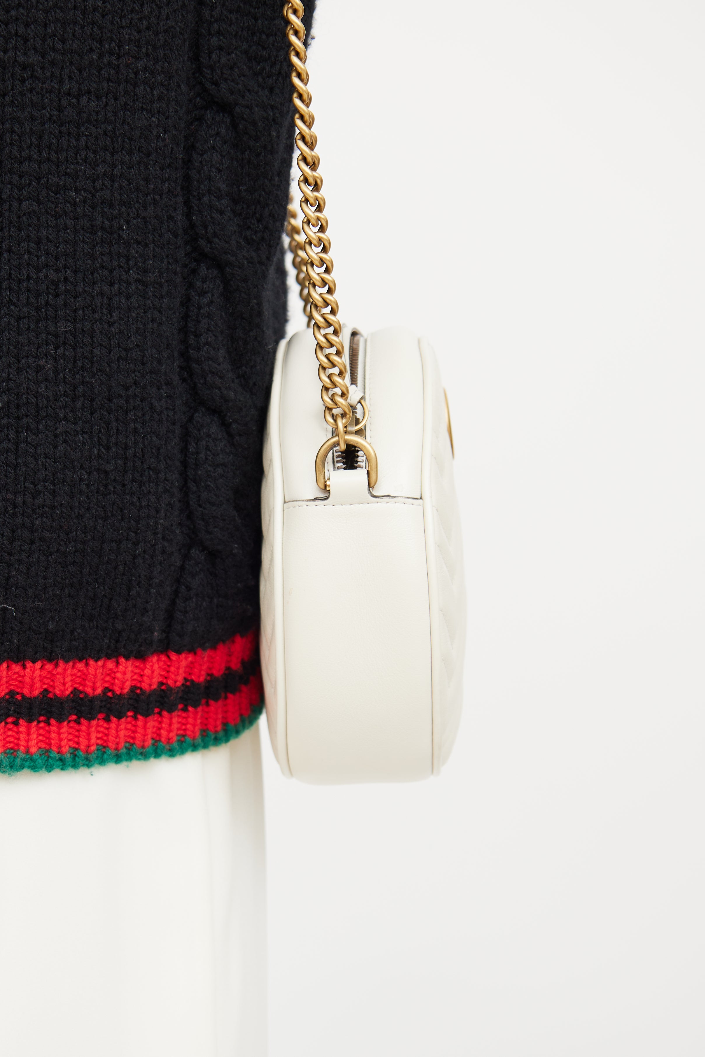 Pre-owned Gucci white Marmont Matelasse round bag featuring gold tone GG torchon logo at front, one main compartment, gold tone chain-link shoulder strap, and top zip closure.
