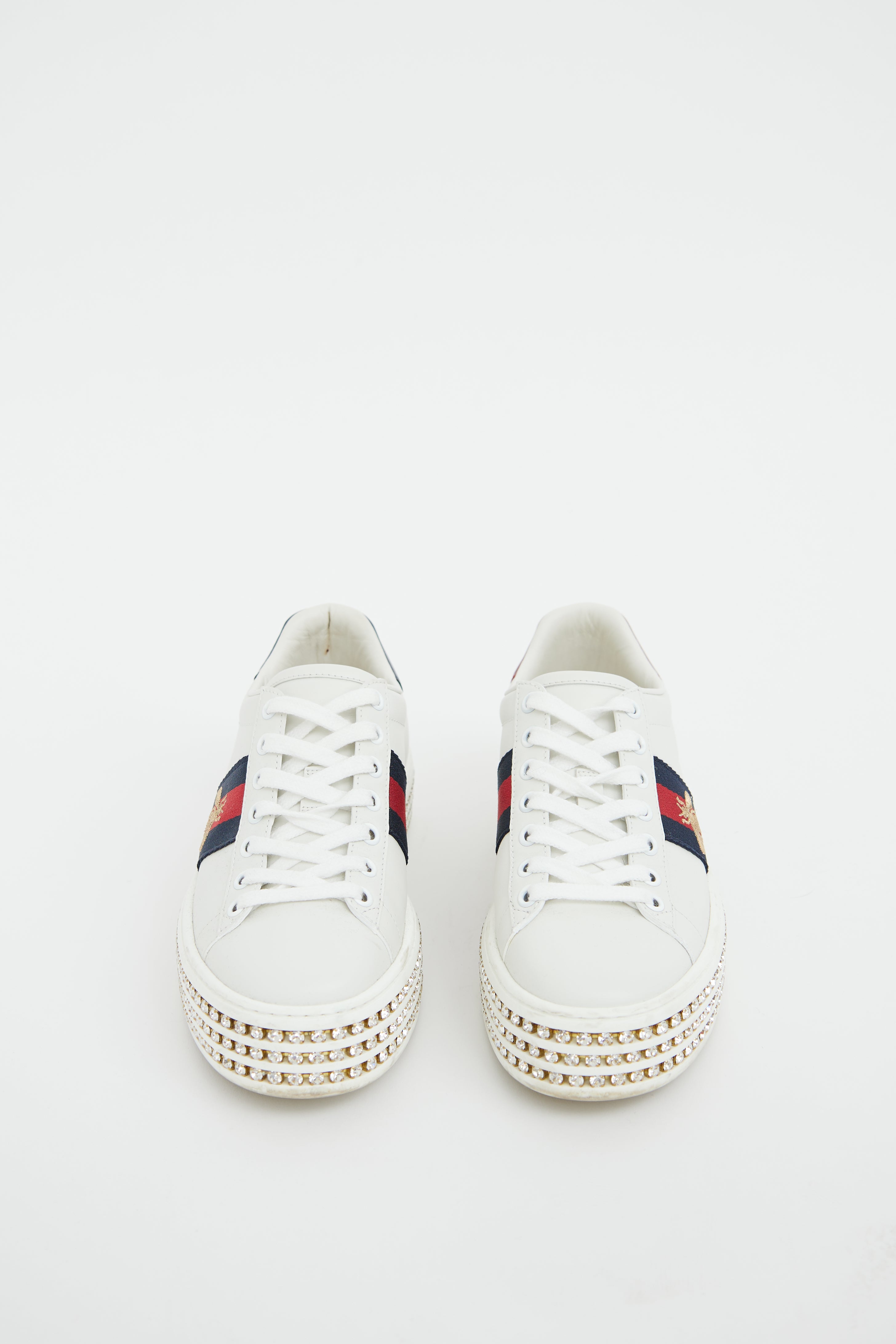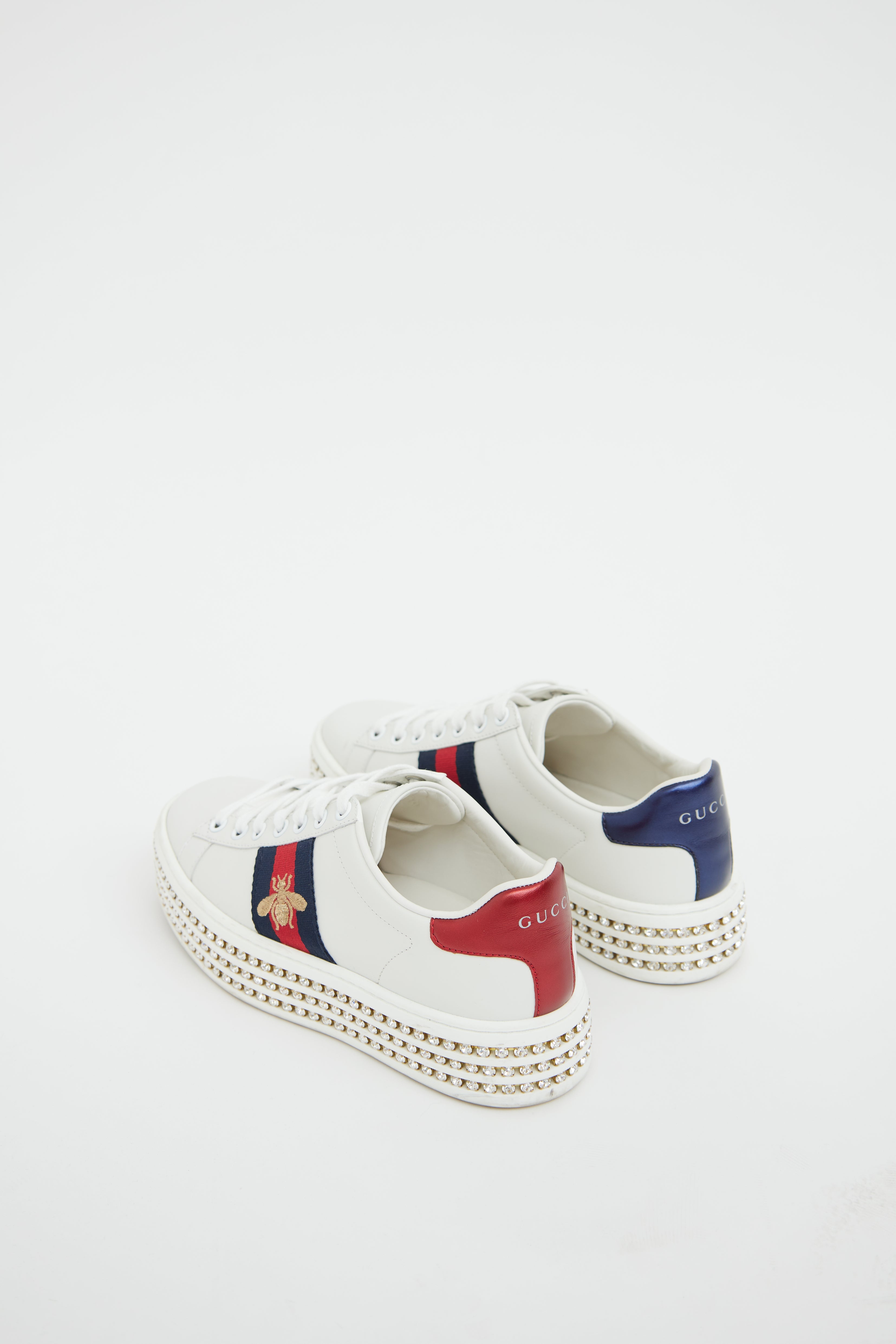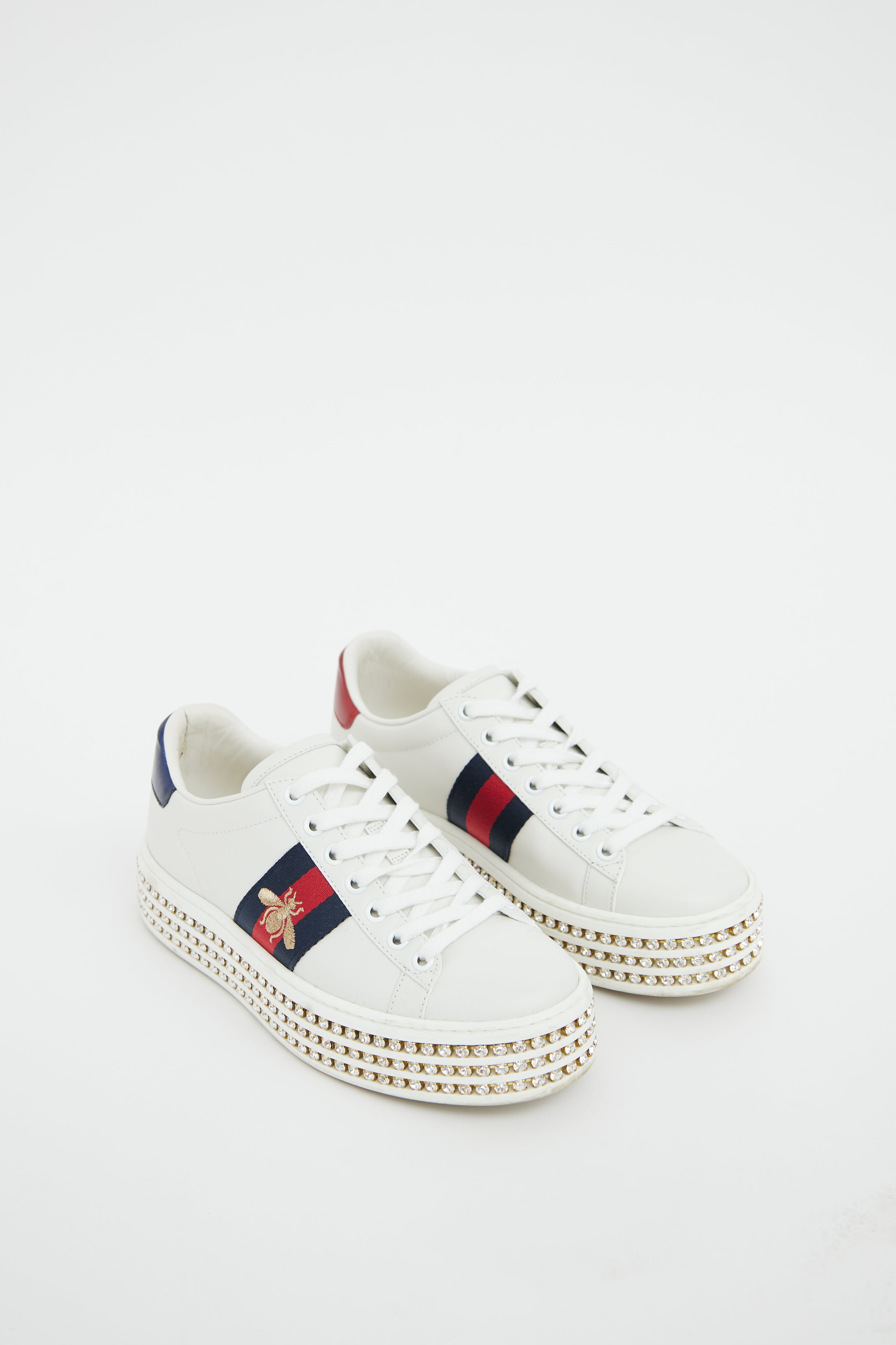 Pre-owned Gucci white Ace sneakers featuring round toe, rhinestone lined platform midsole, lace up, webbed upper with bee embroidery and red counter with logo text.