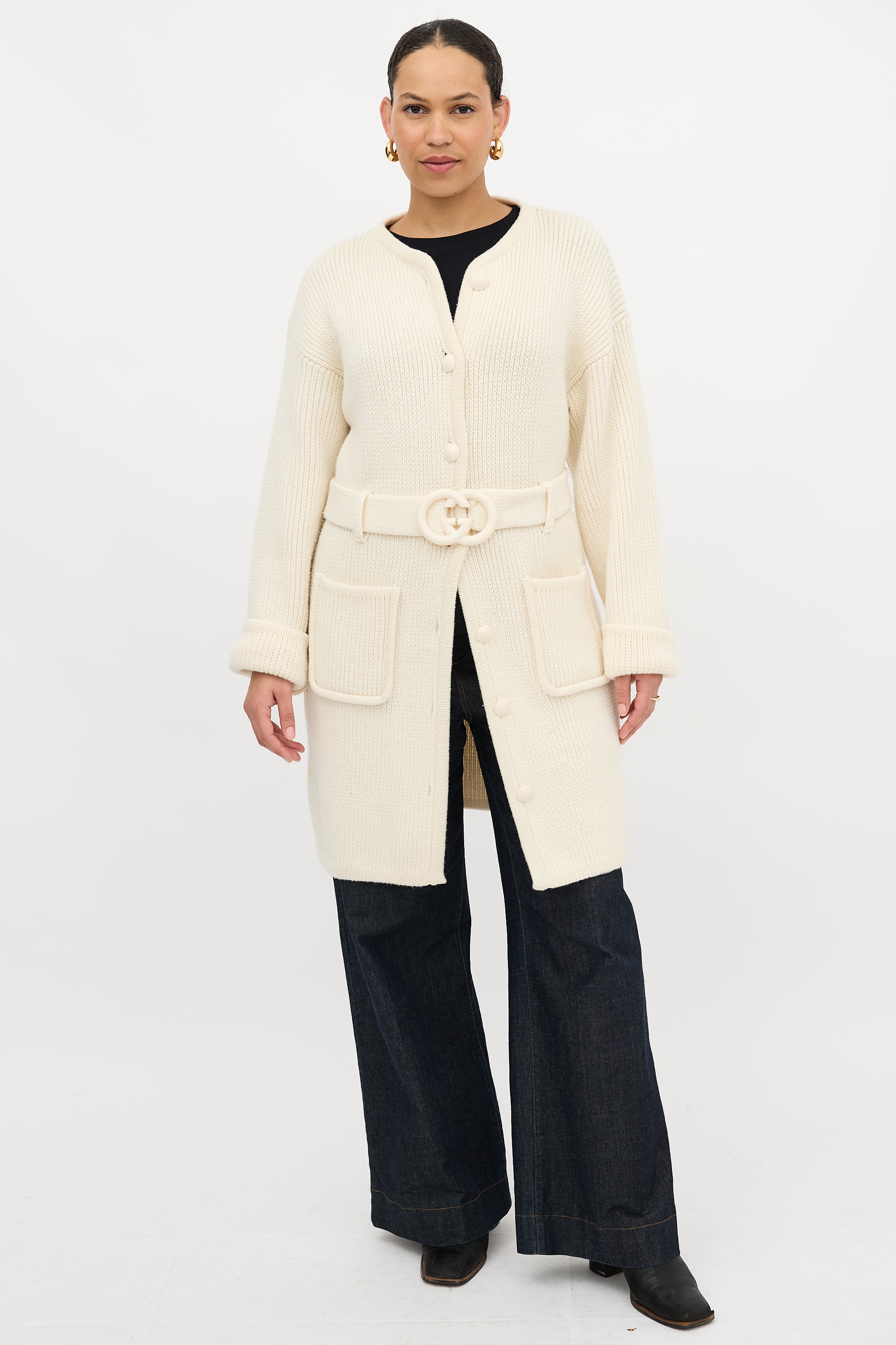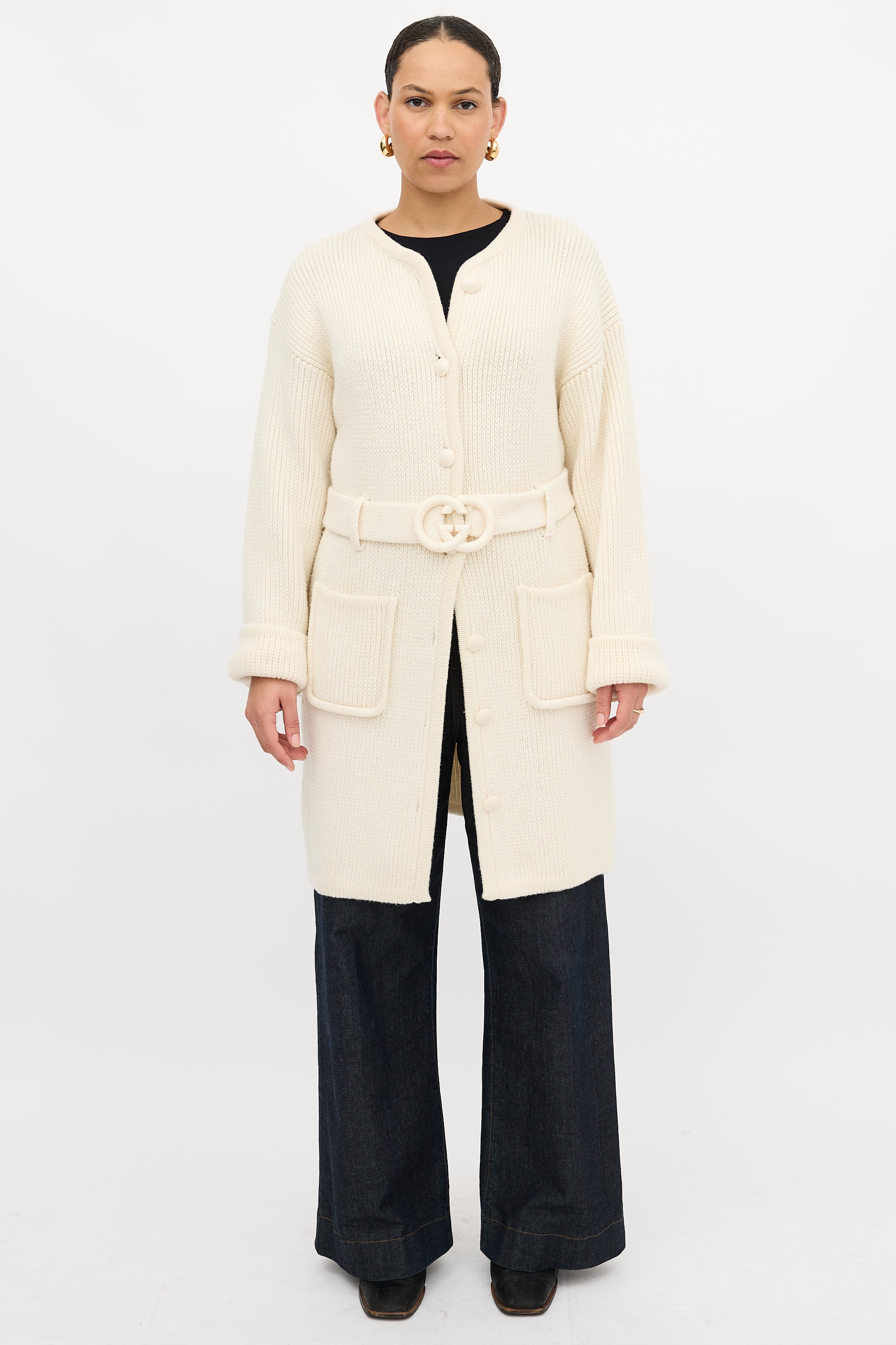 Pre-owned Gucci cream wool long cardigan featuring a round neckline, button front, two patch pockets at hip, belted waist with tonal GG buckle, and wide sleeves.