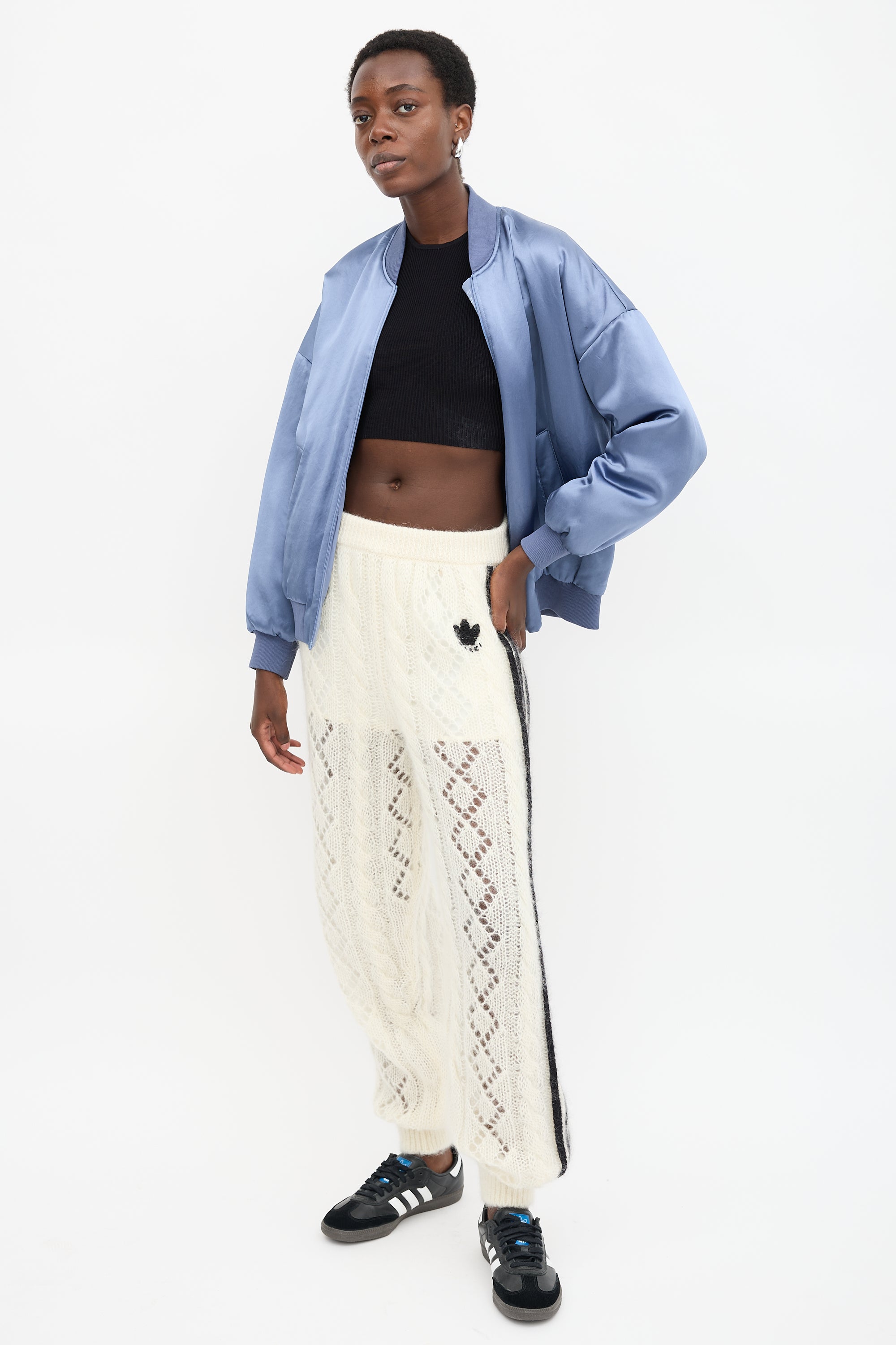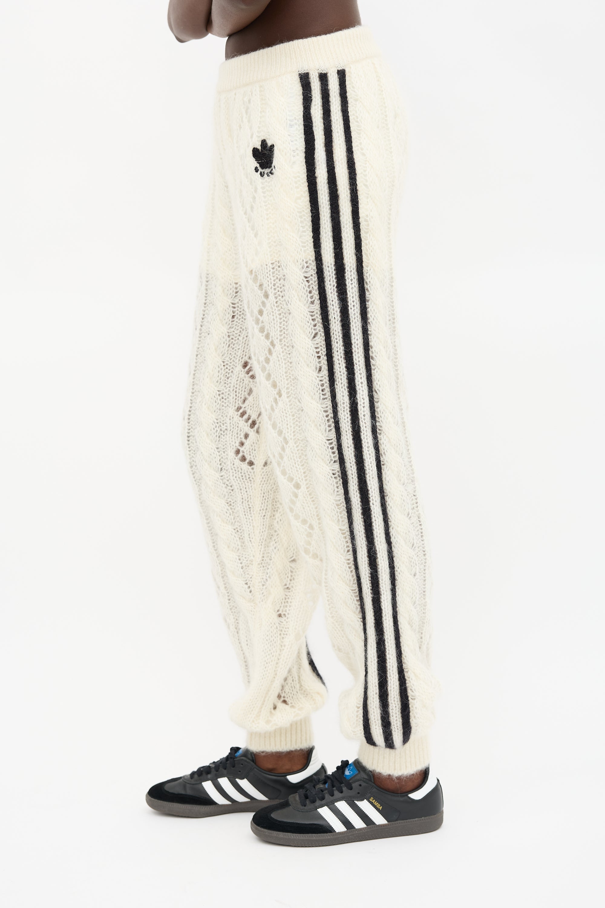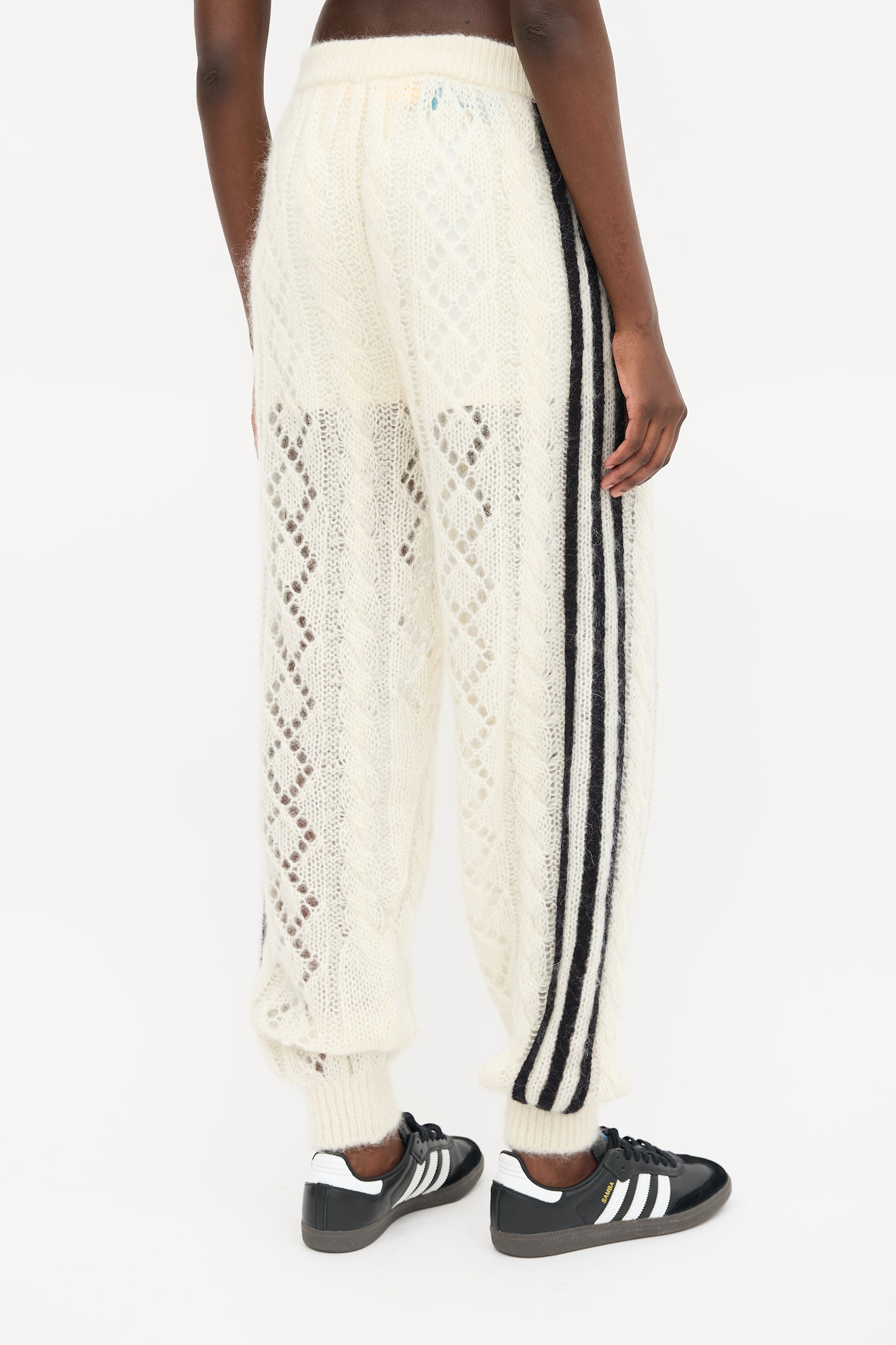 Pre-owned Gucci X Adidas cream mohair blend pants featuring a high rise, elasticized waistband, black signature 3 stripes at sides, black Trefoil logo at left hip, cable knit and pointelle detailing, wide leg, and ribbed hems. Partially lined.