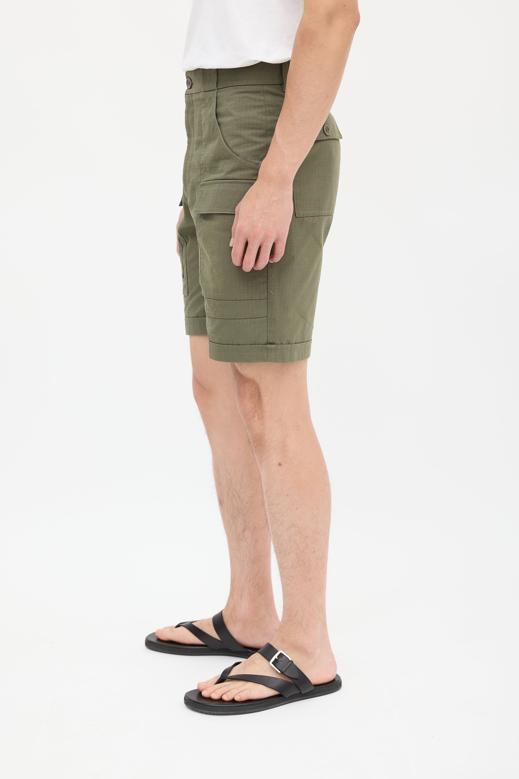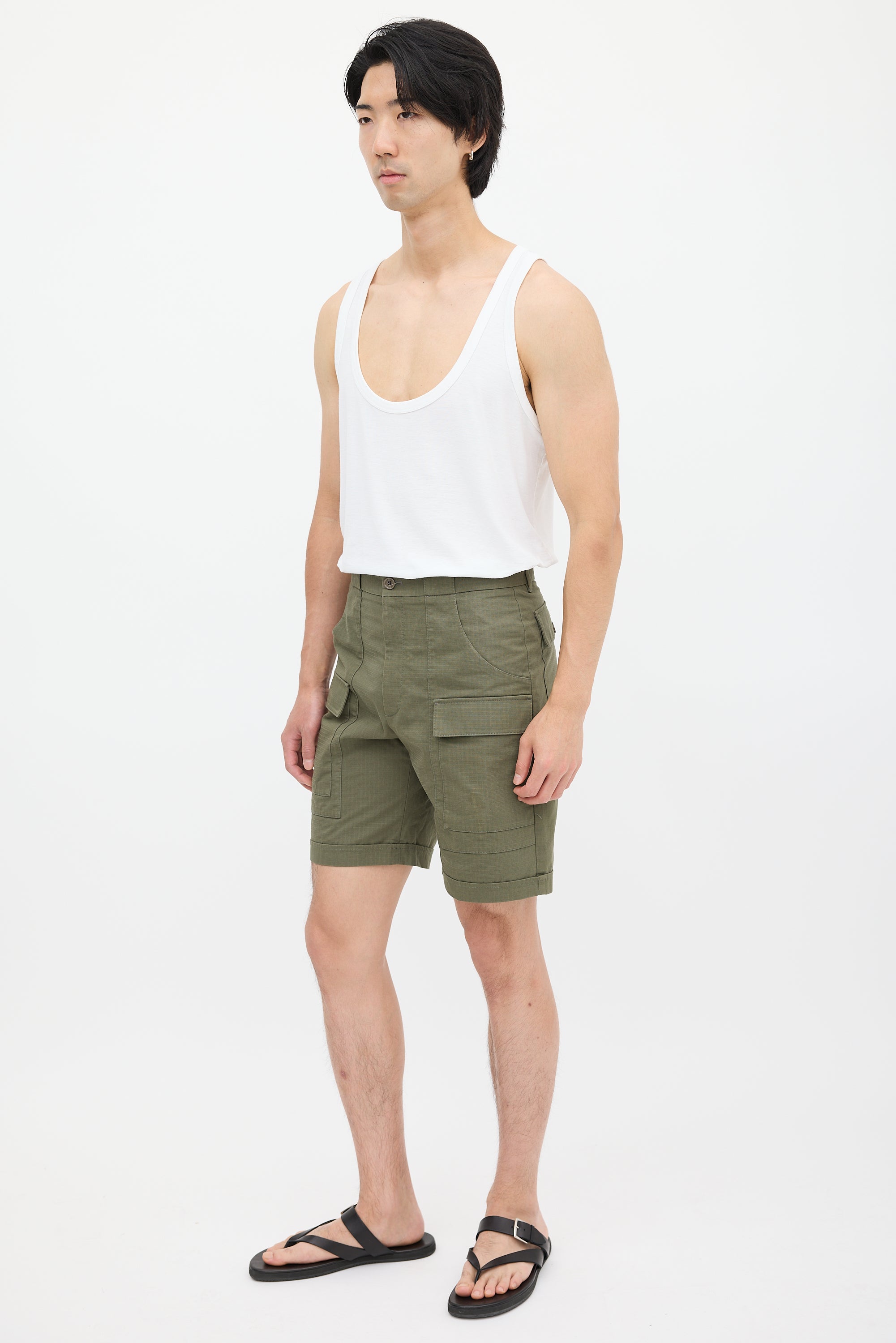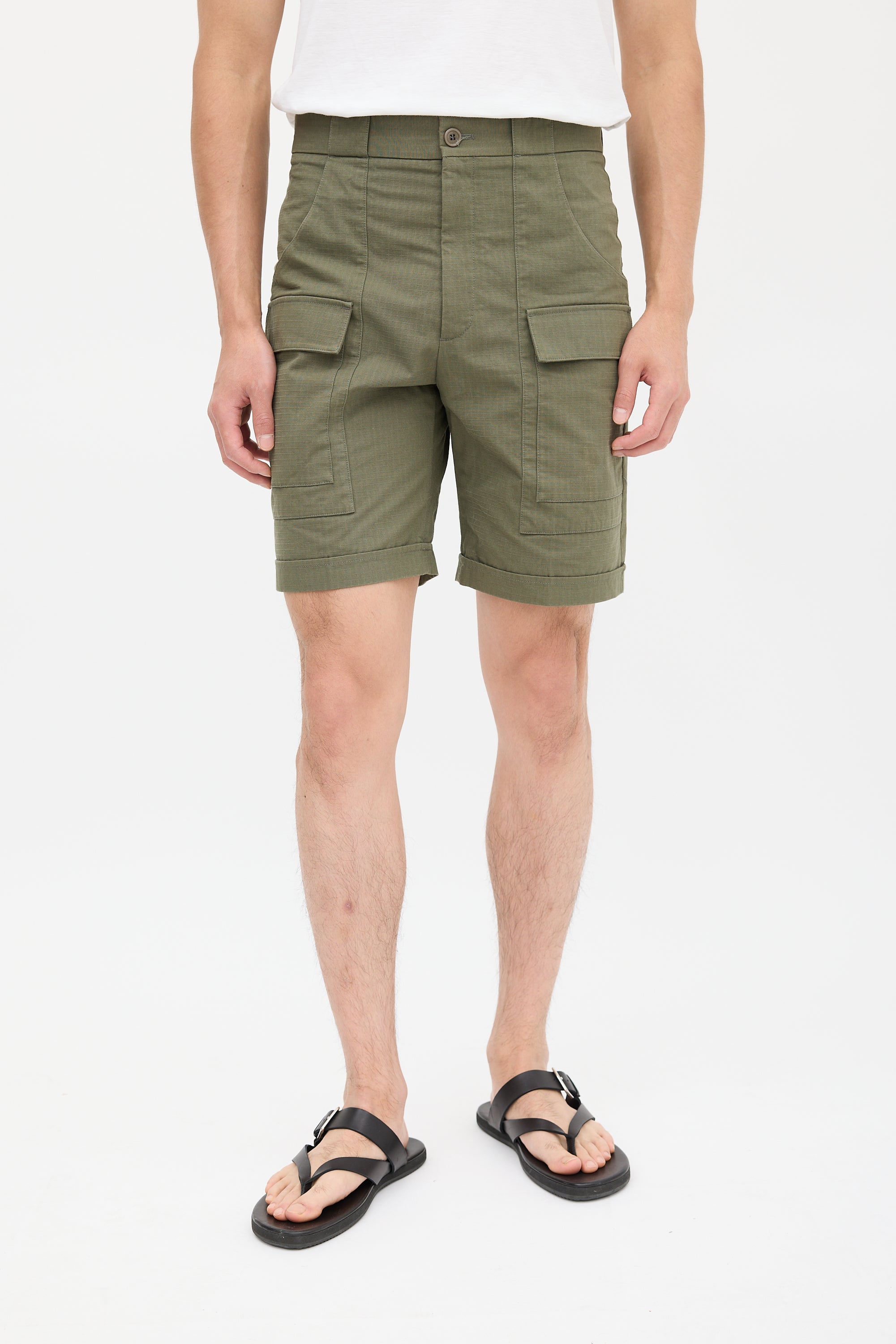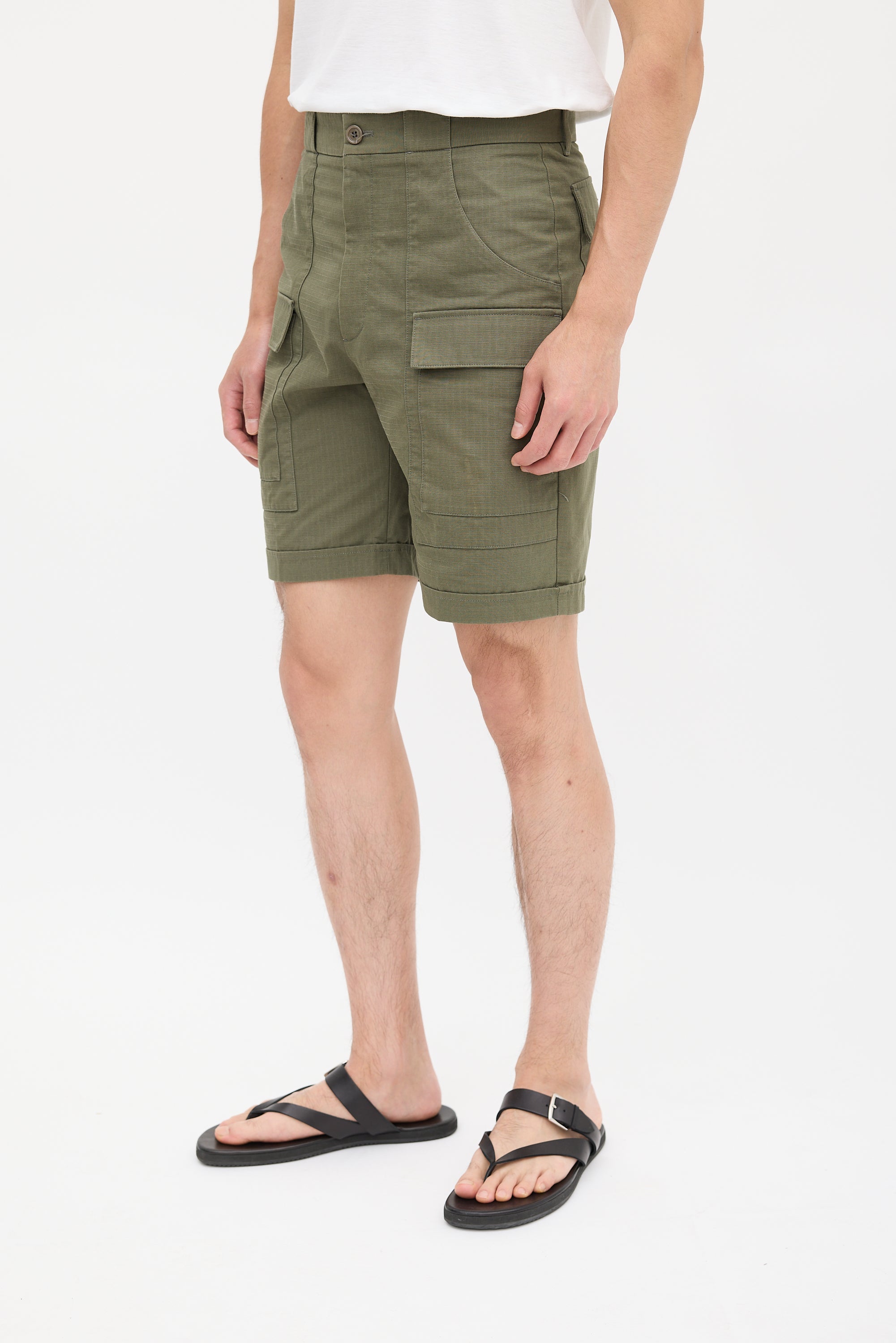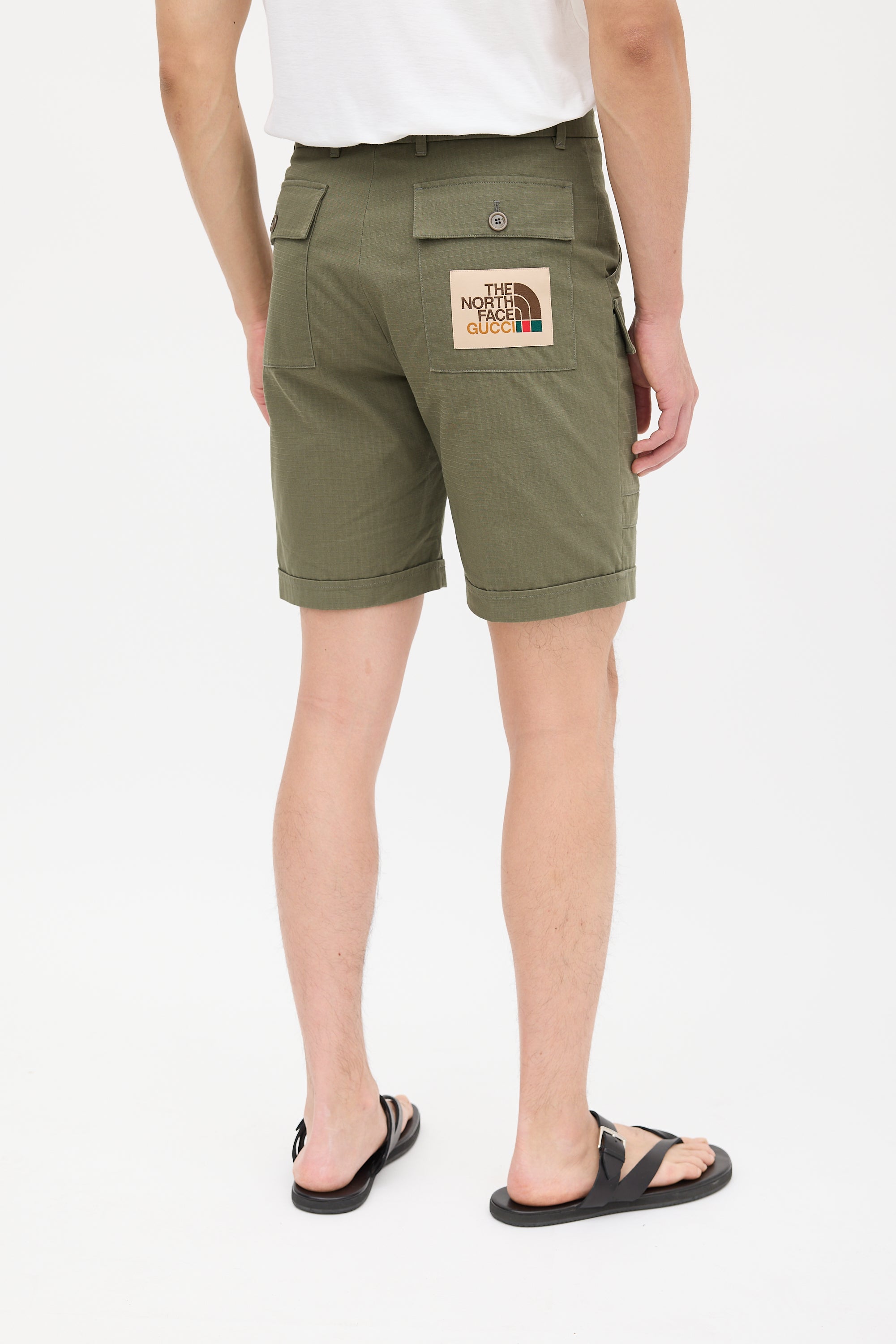 Pre-owned Gucci x The North Face green ripstop shorts featuring two slip pockets at hip, two flap pockets at back with embroidered logo patch, two cargo pockets at thigh, cuffed hem, and zip fly with button closure.