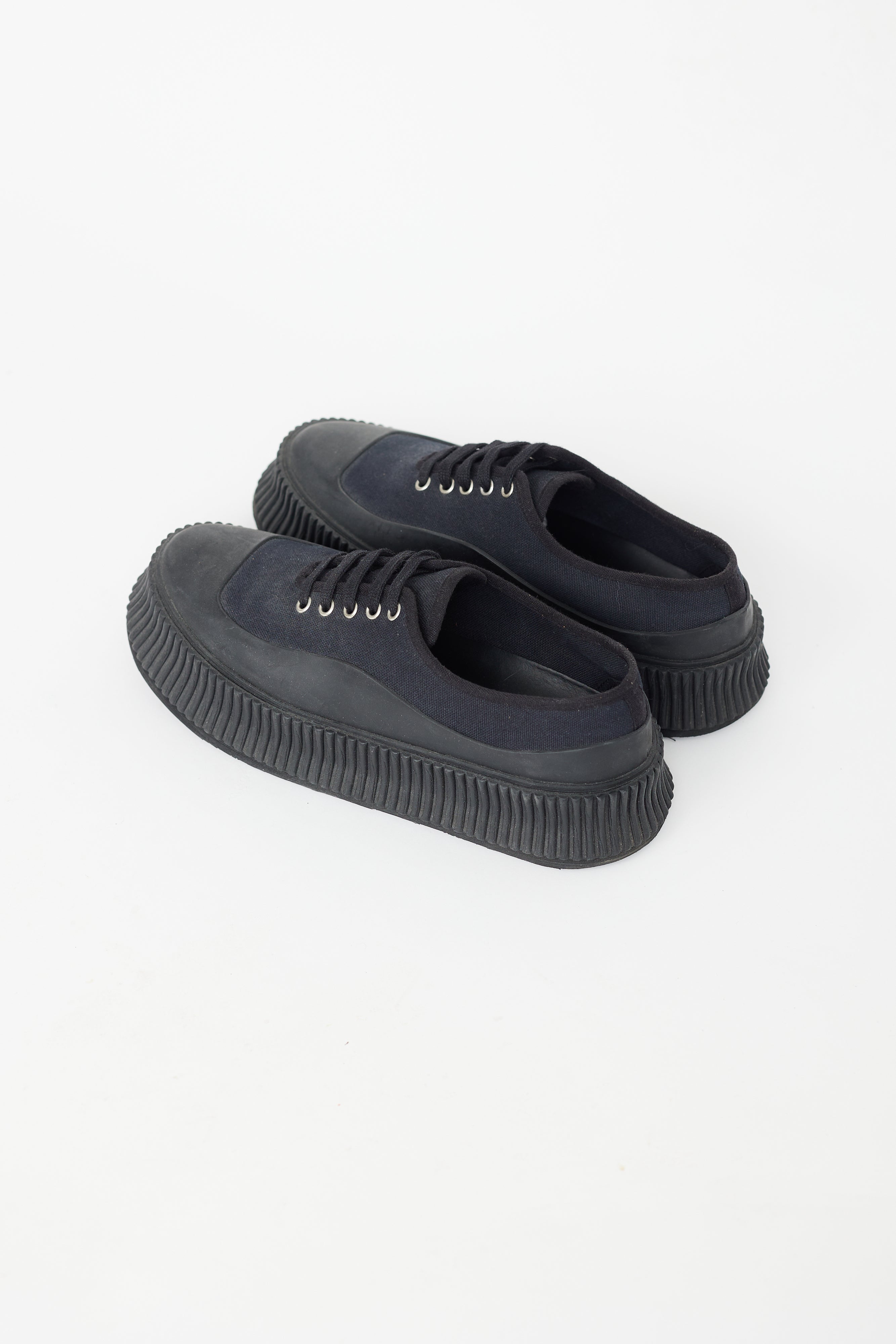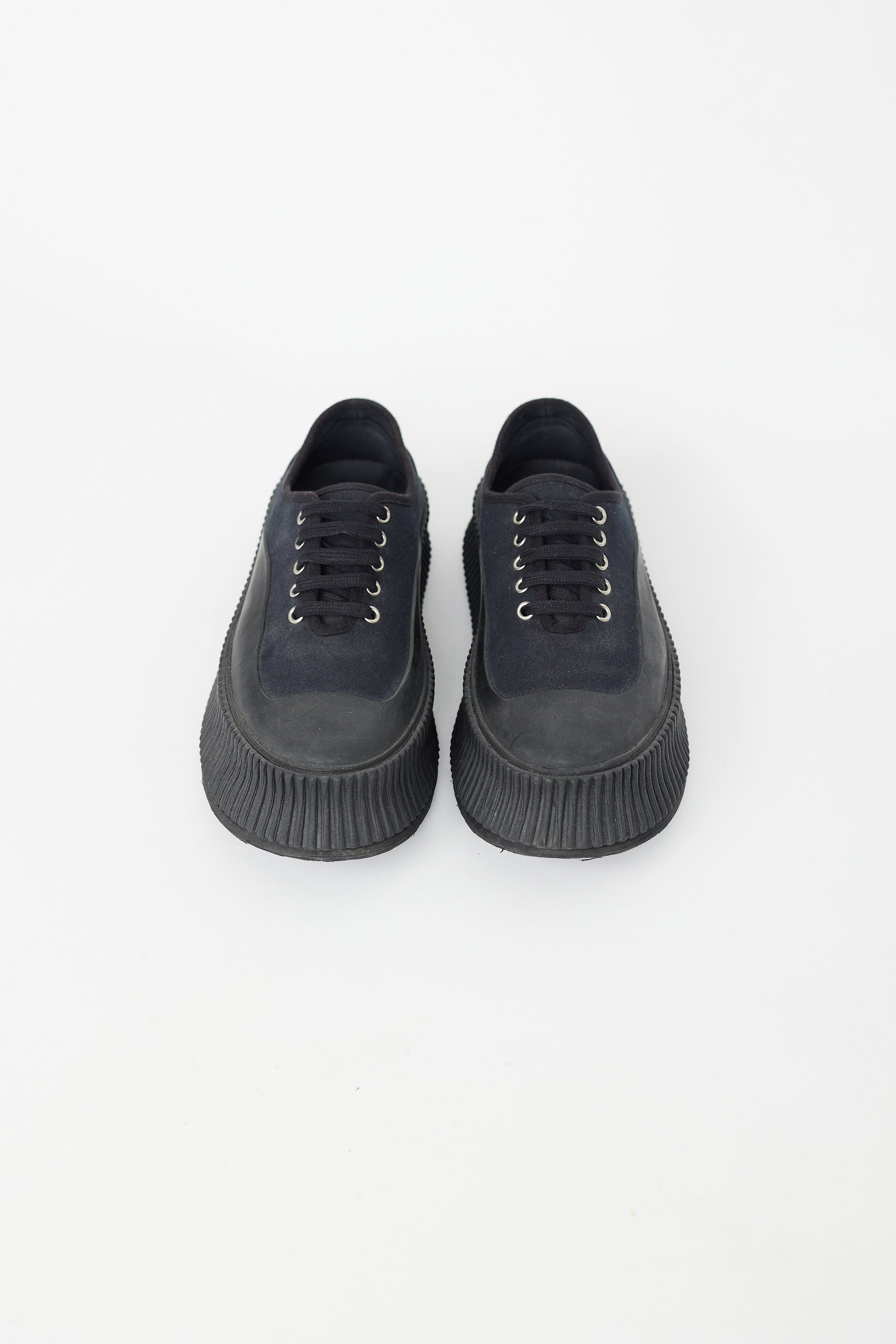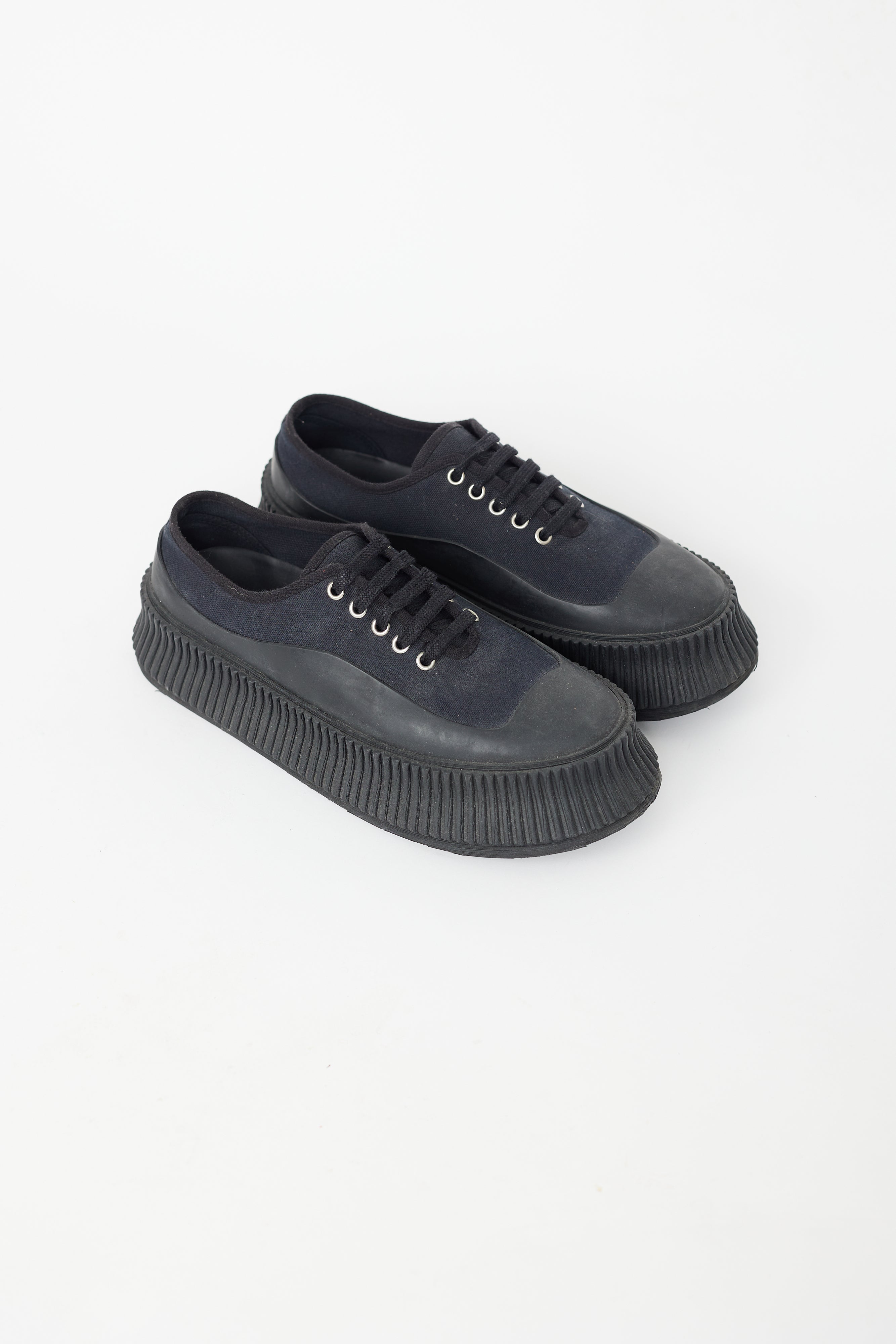 Pre-owned Jil Sander navy and black platform sneakers featuring combined canvas and rubber upper, serrated rubber platform midsole, lace up vamp and leather insole.
