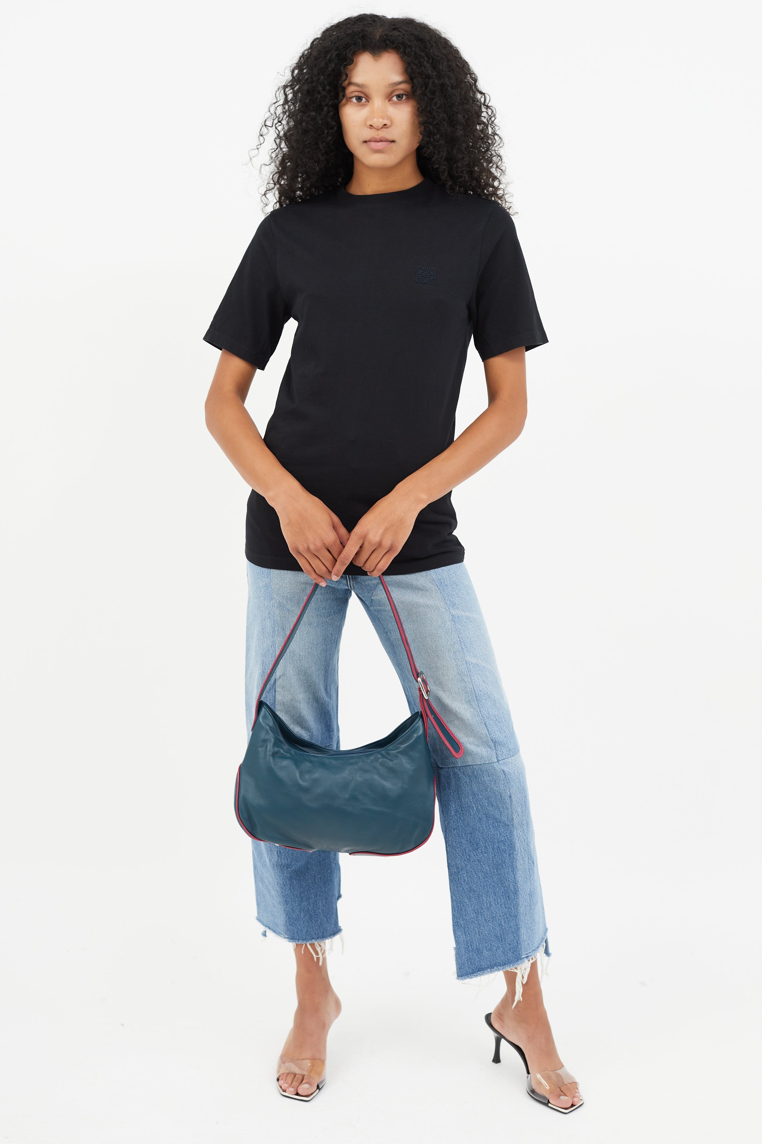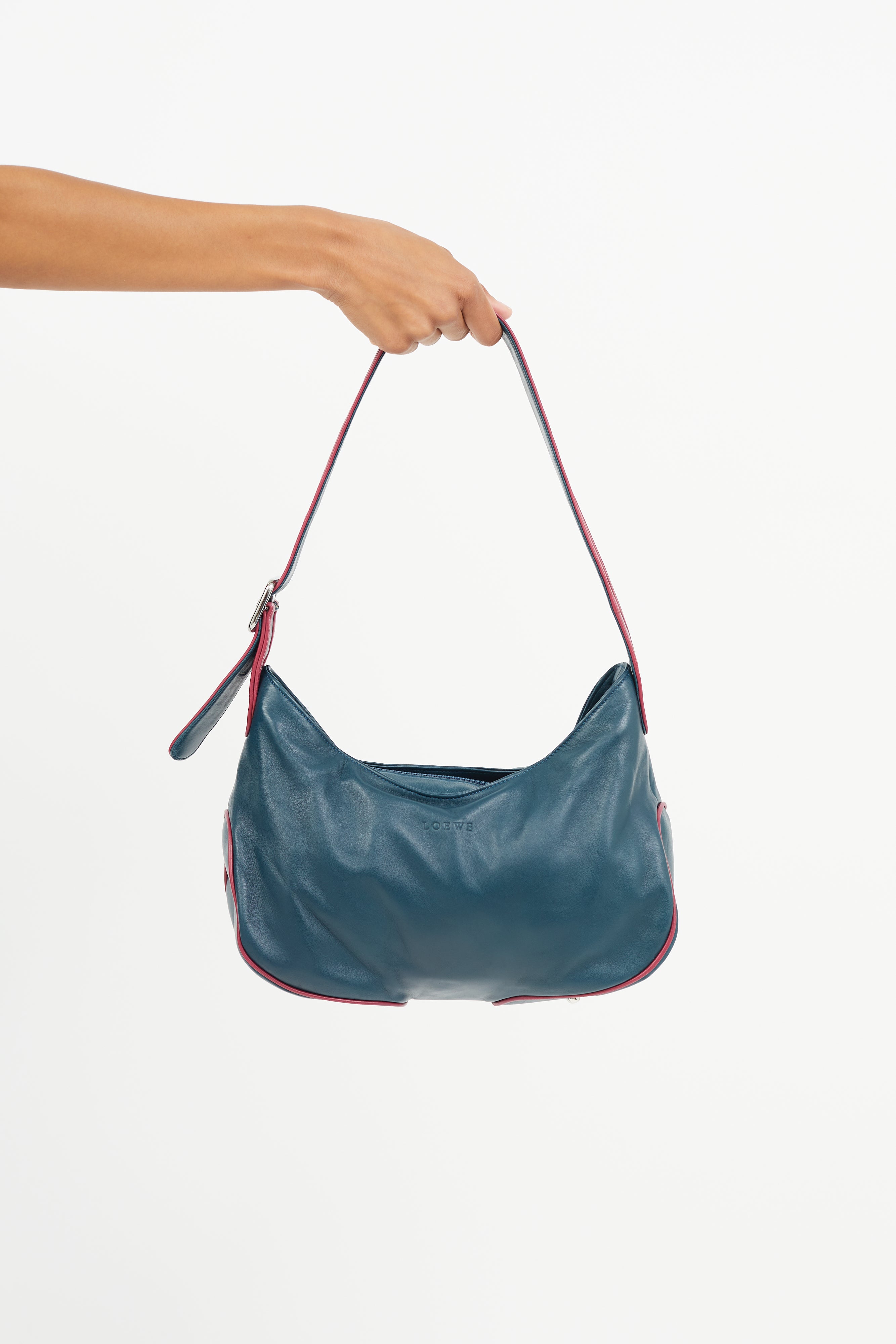 Pre-owned Loewe blue shoulder bag featuring pink trim throughout, embossed logo at front, one main compartment with one zip pocket and one slip pocket, silver tone protective feet at bottom of bag, adjustable shoulder strap, and top zip closure. Comes with original dust bag.