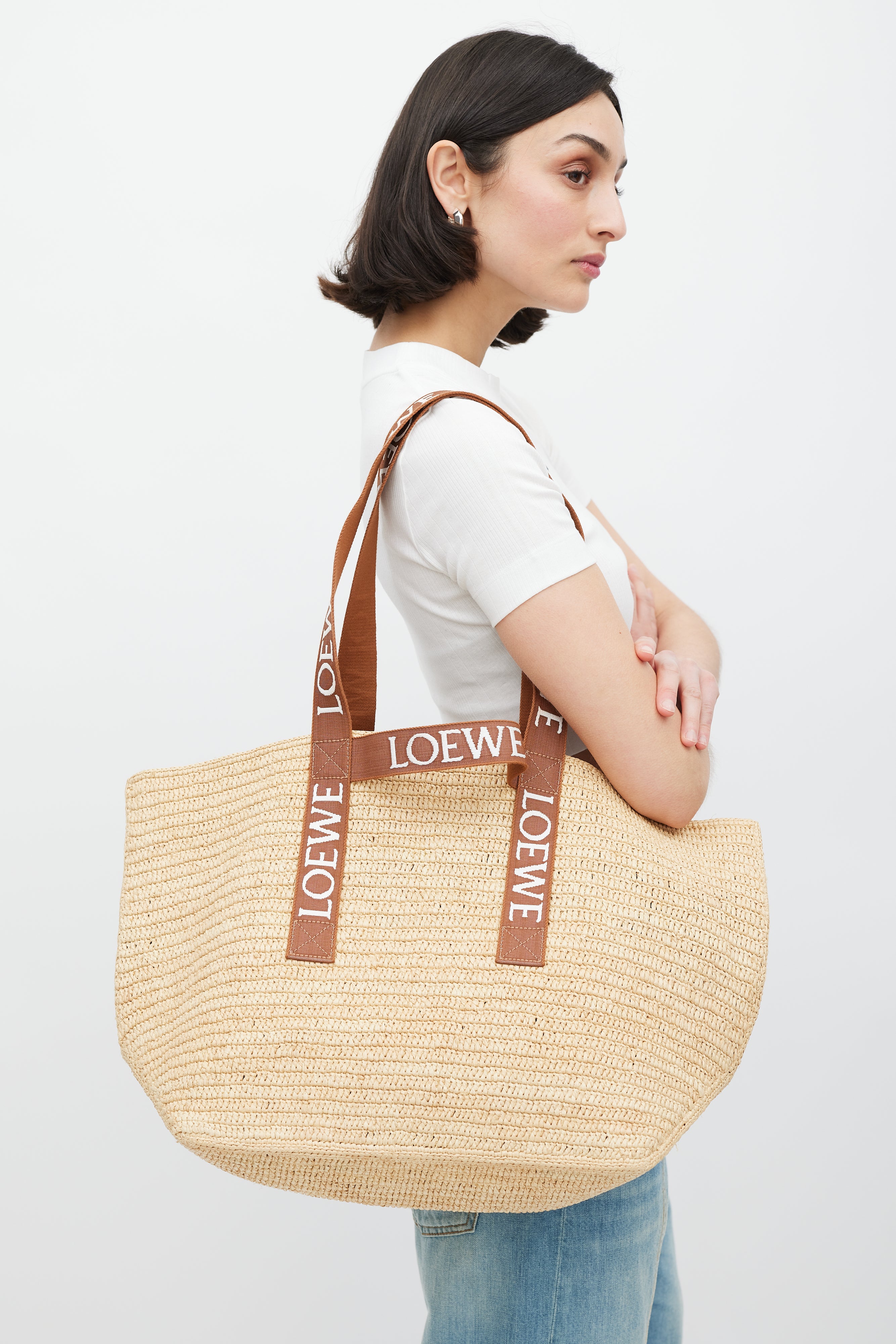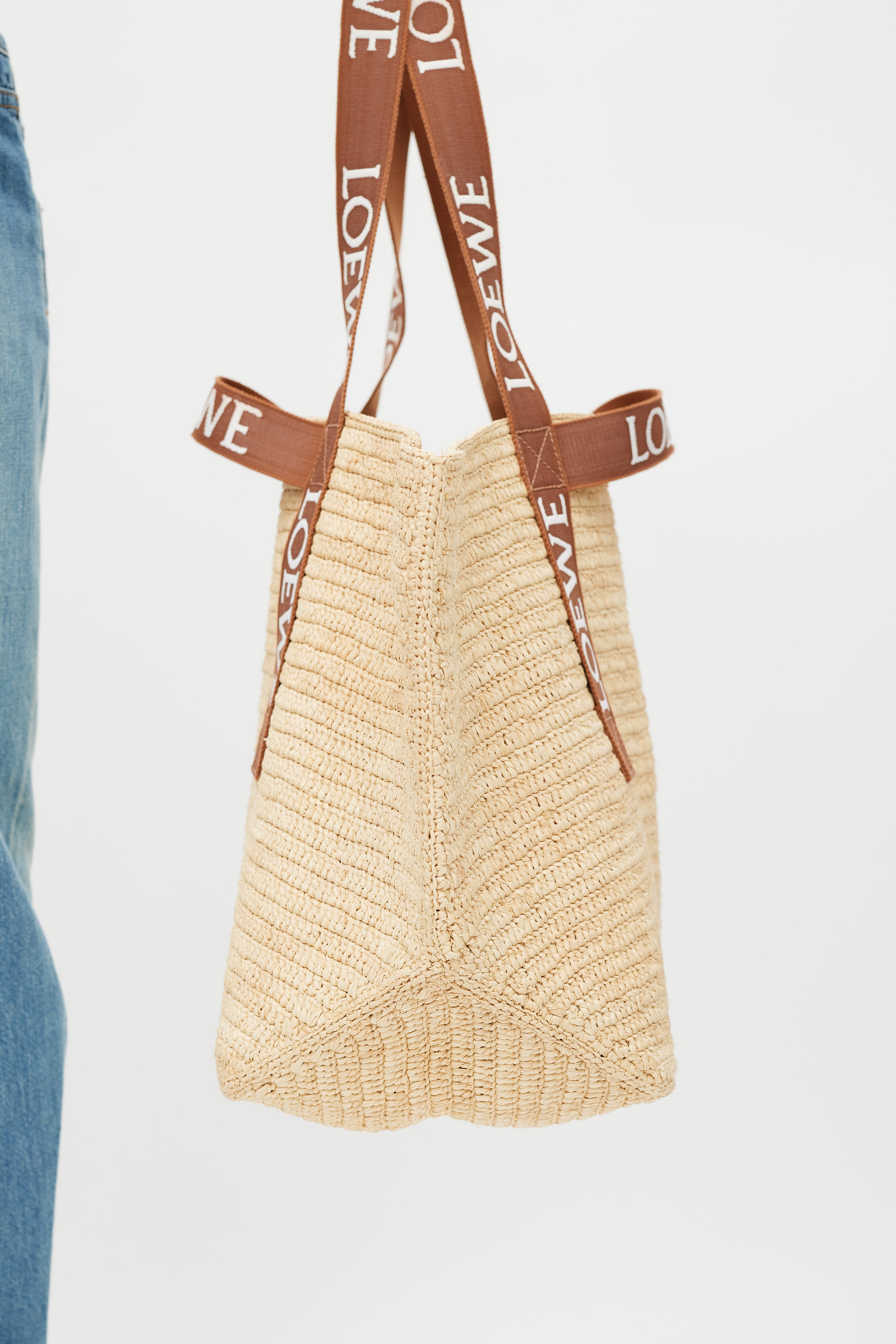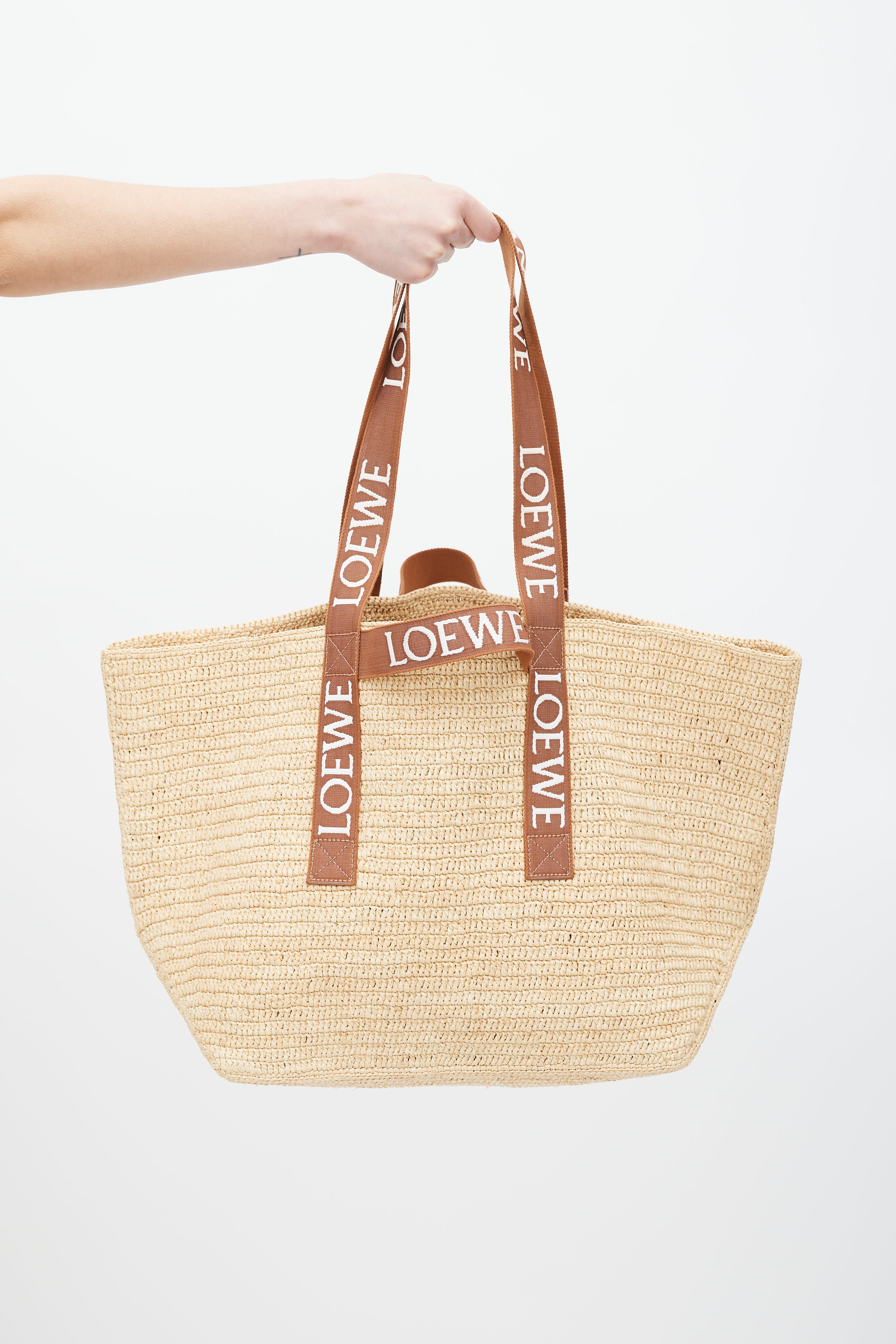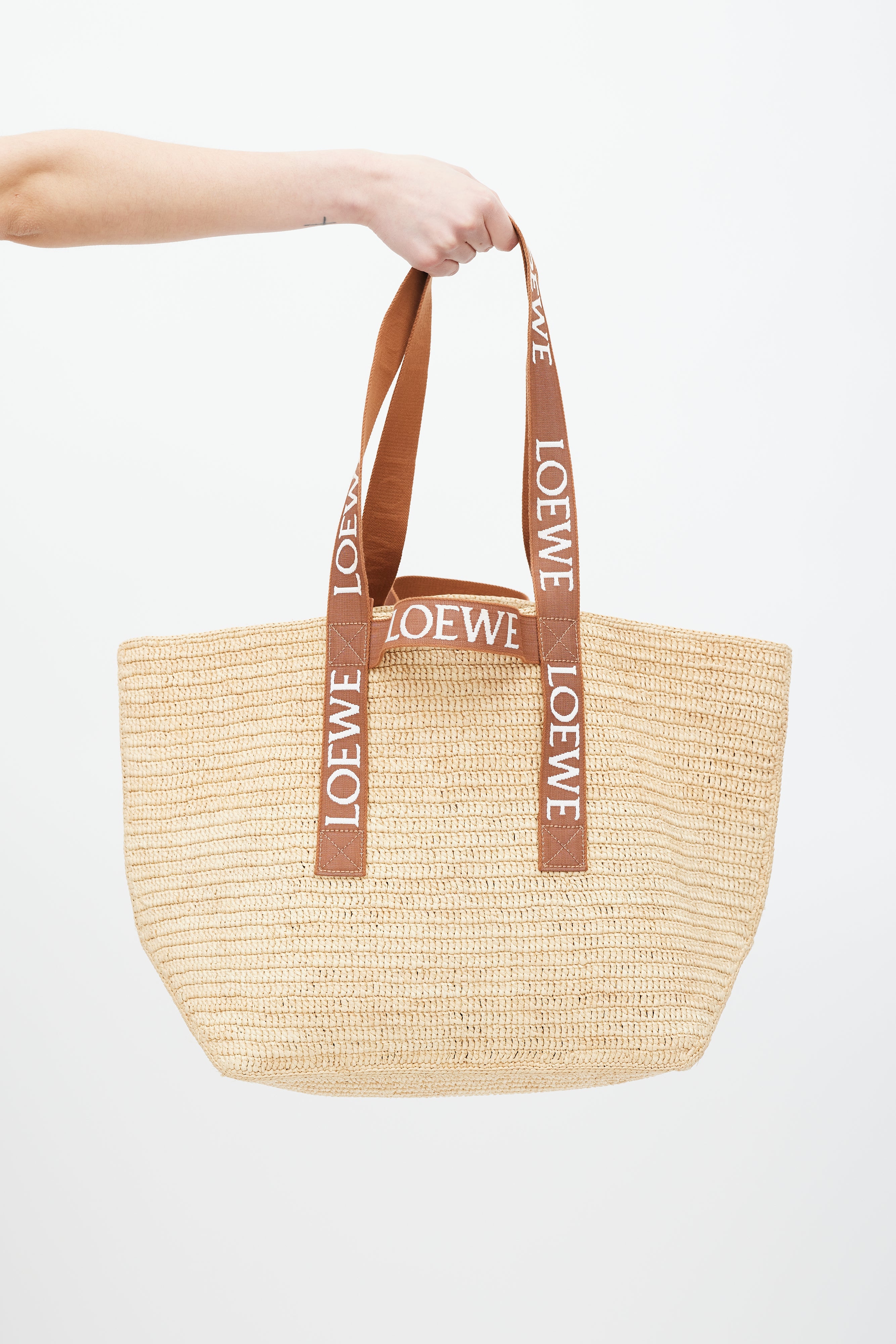 Pre-owned Loewe brown Fold Shopper woven bag featuring two top handles with white embroidered logo, two loops at sides, and one main compartment.