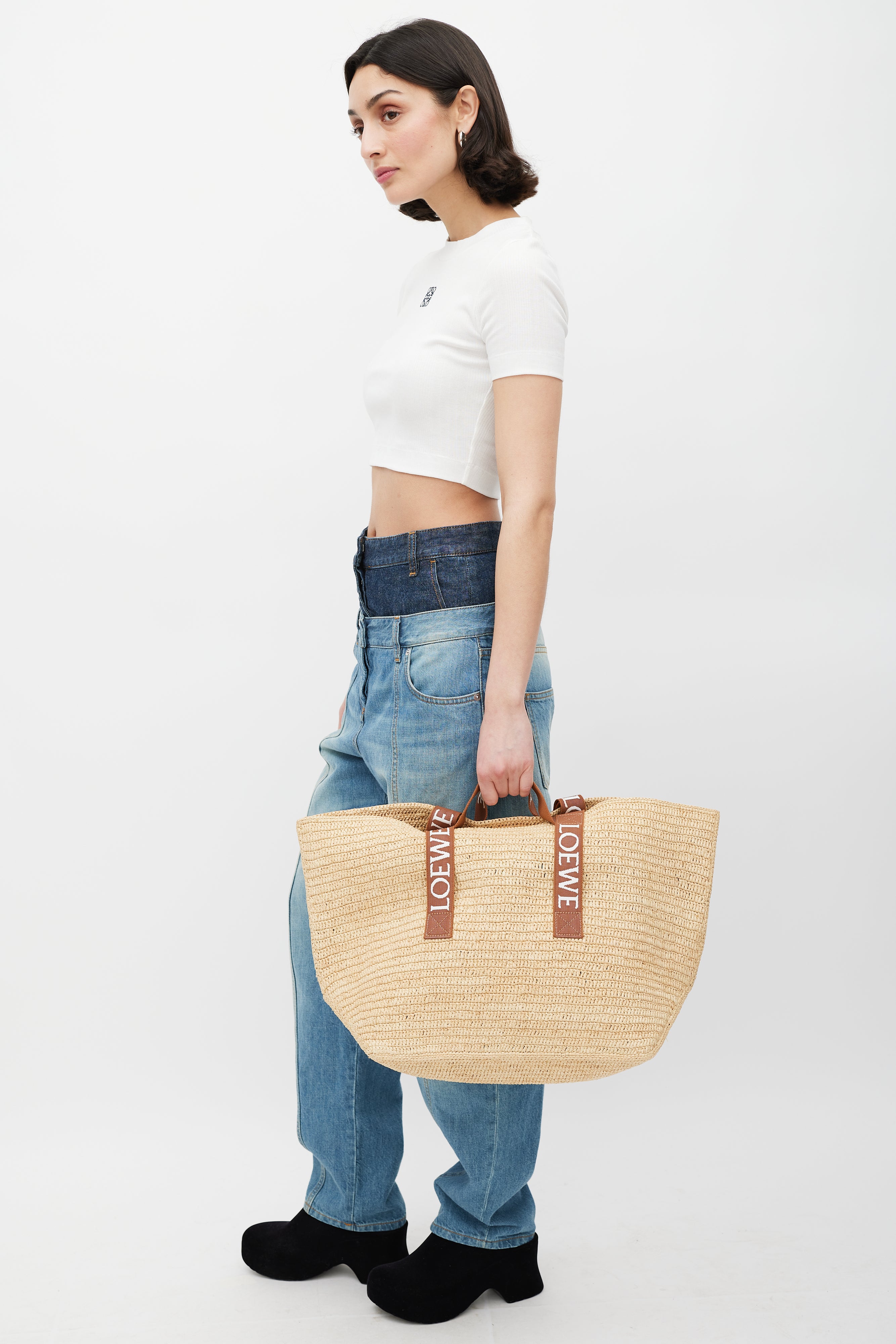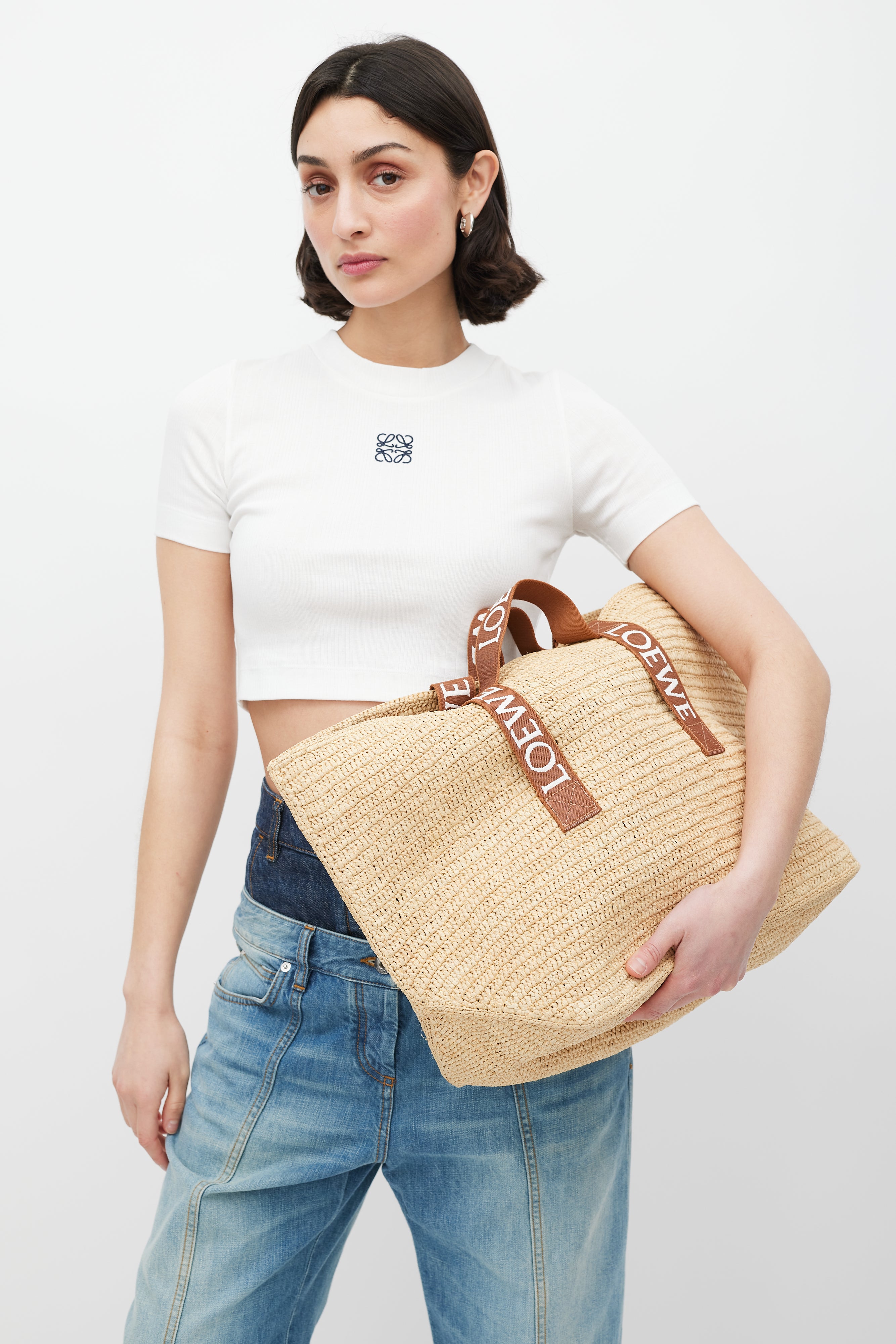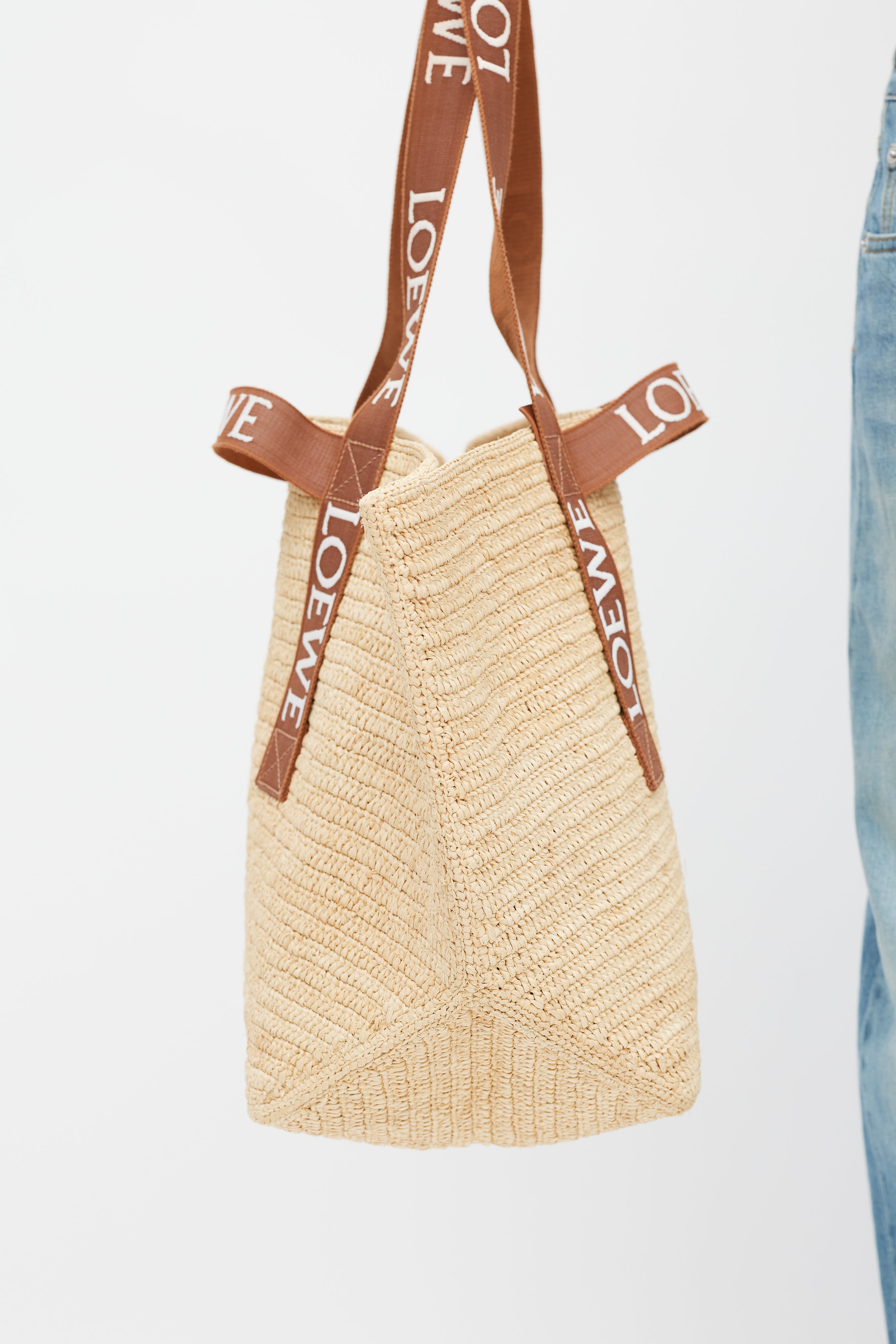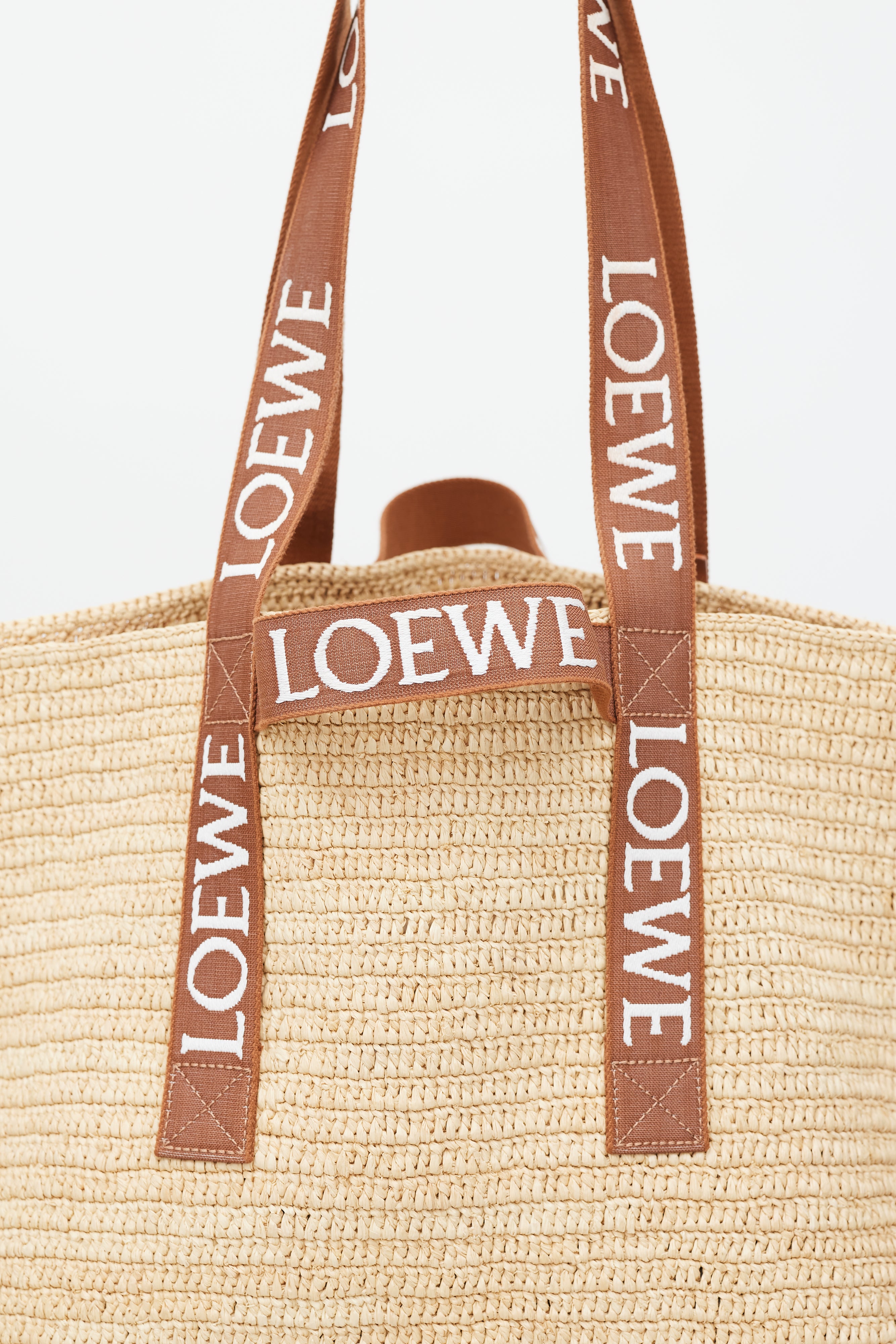 Pre-owned Loewe brown Fold Shopper woven bag featuring two top handles with white embroidered logo, two loops at sides, and one main compartment.