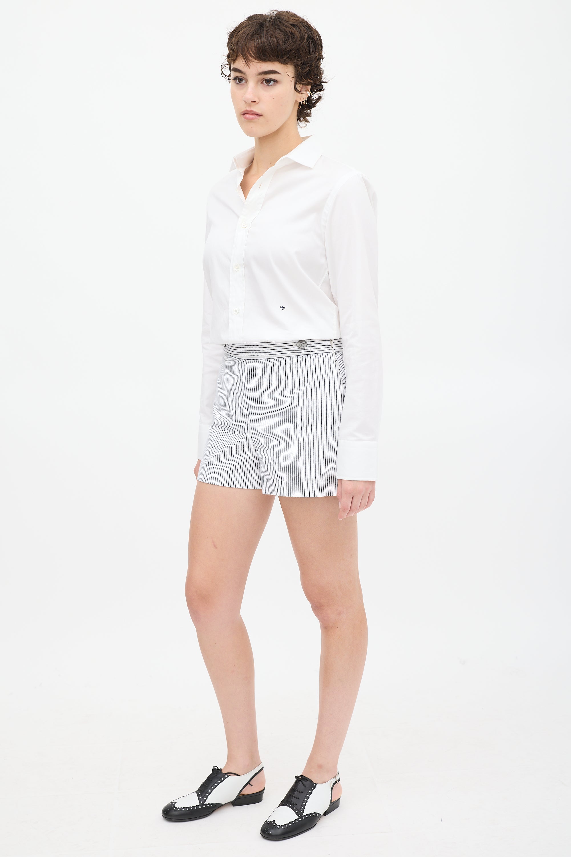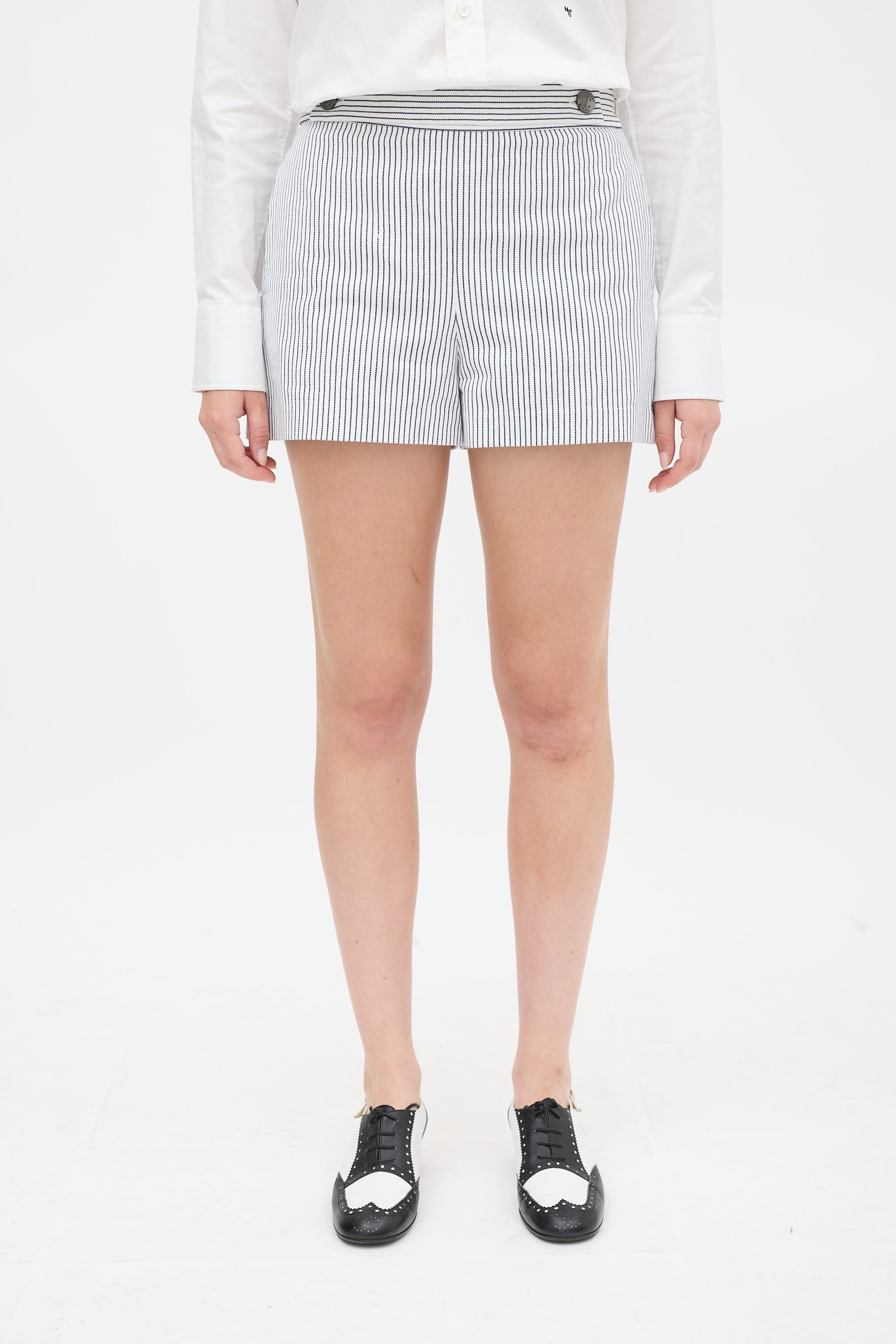 Pre-owned Longchamp white shorts featuring a blue striped pattern throughout, two slip pockets at hip, gunmetal tone anchor button hardware at waist, and zip closure at side. Lined.