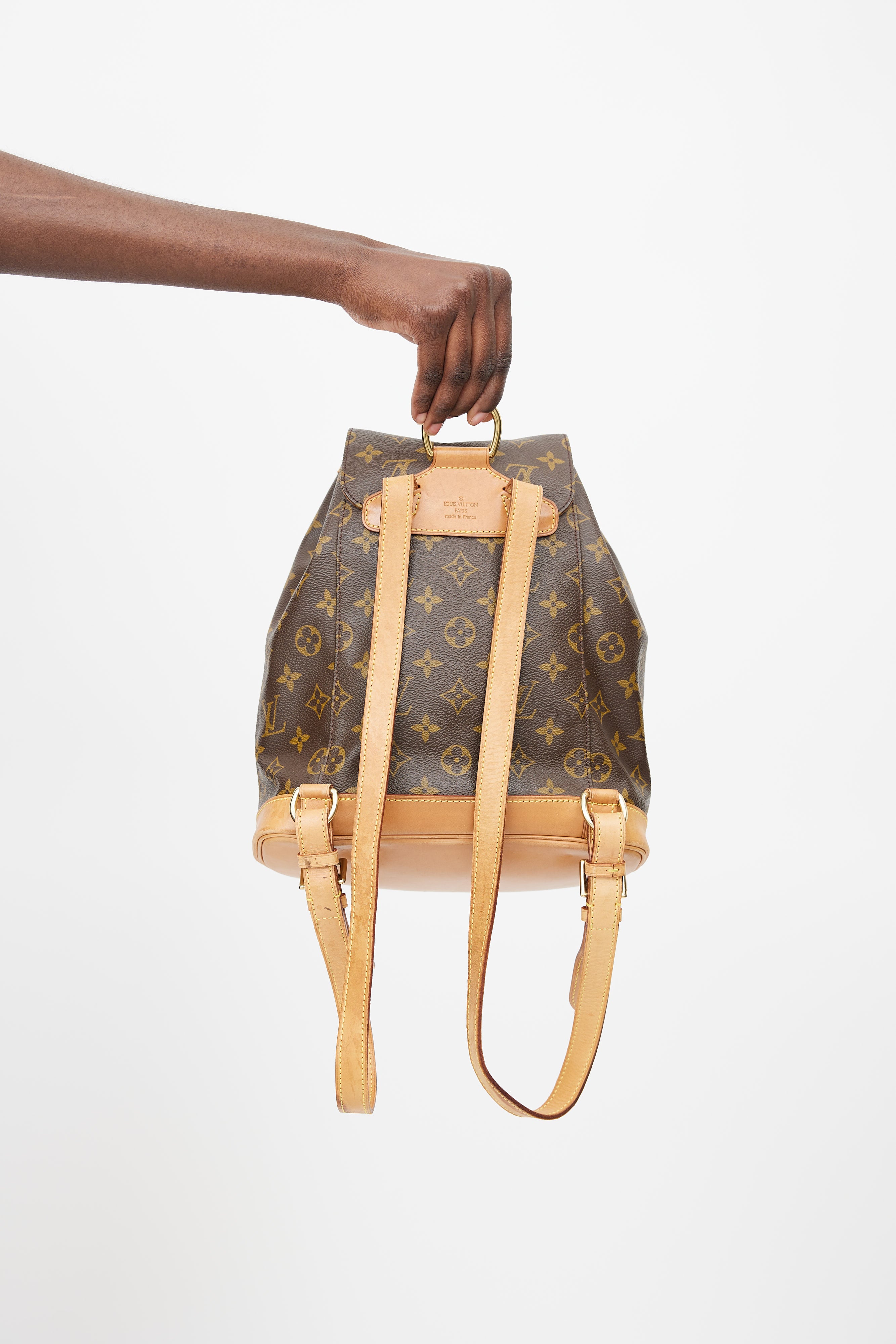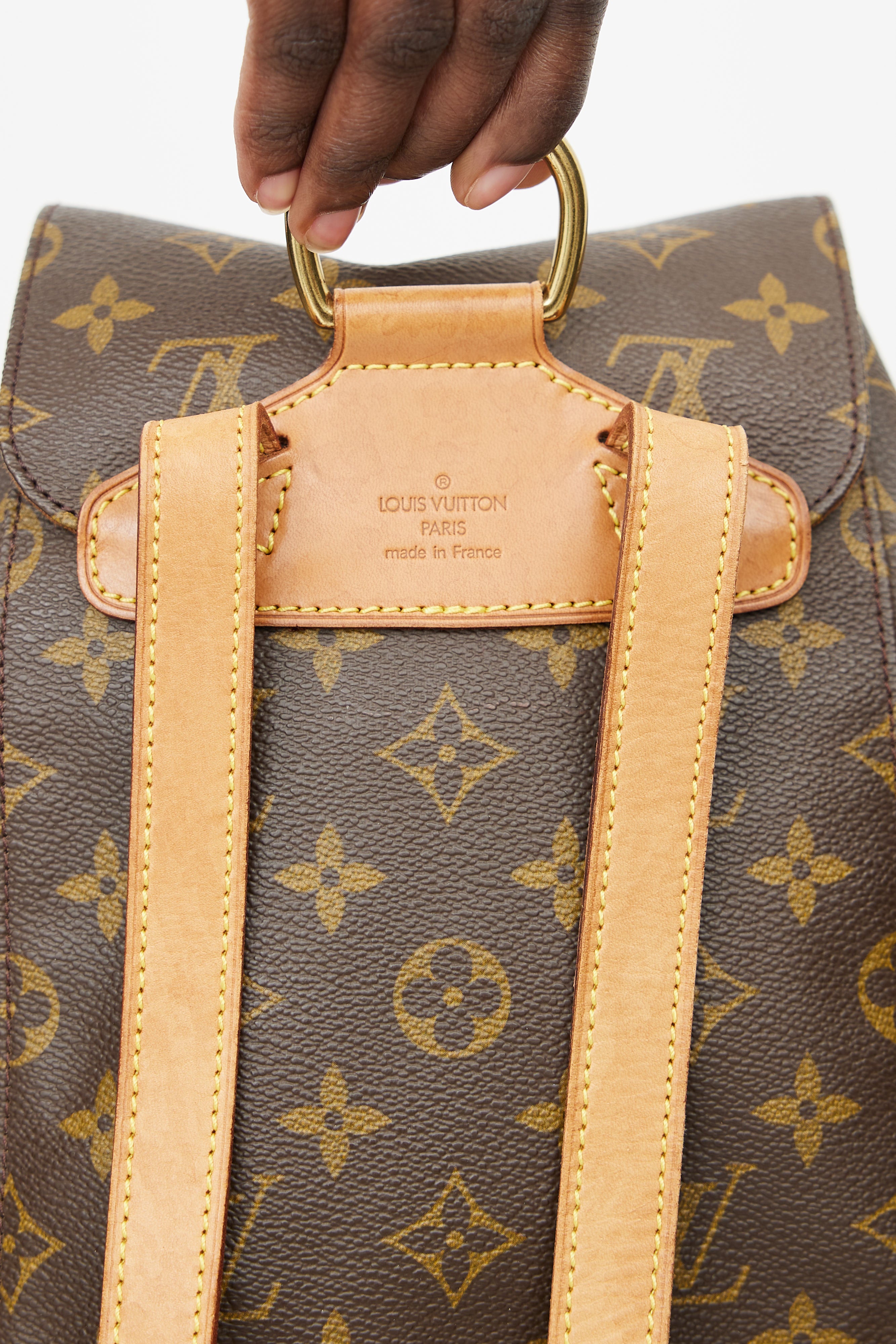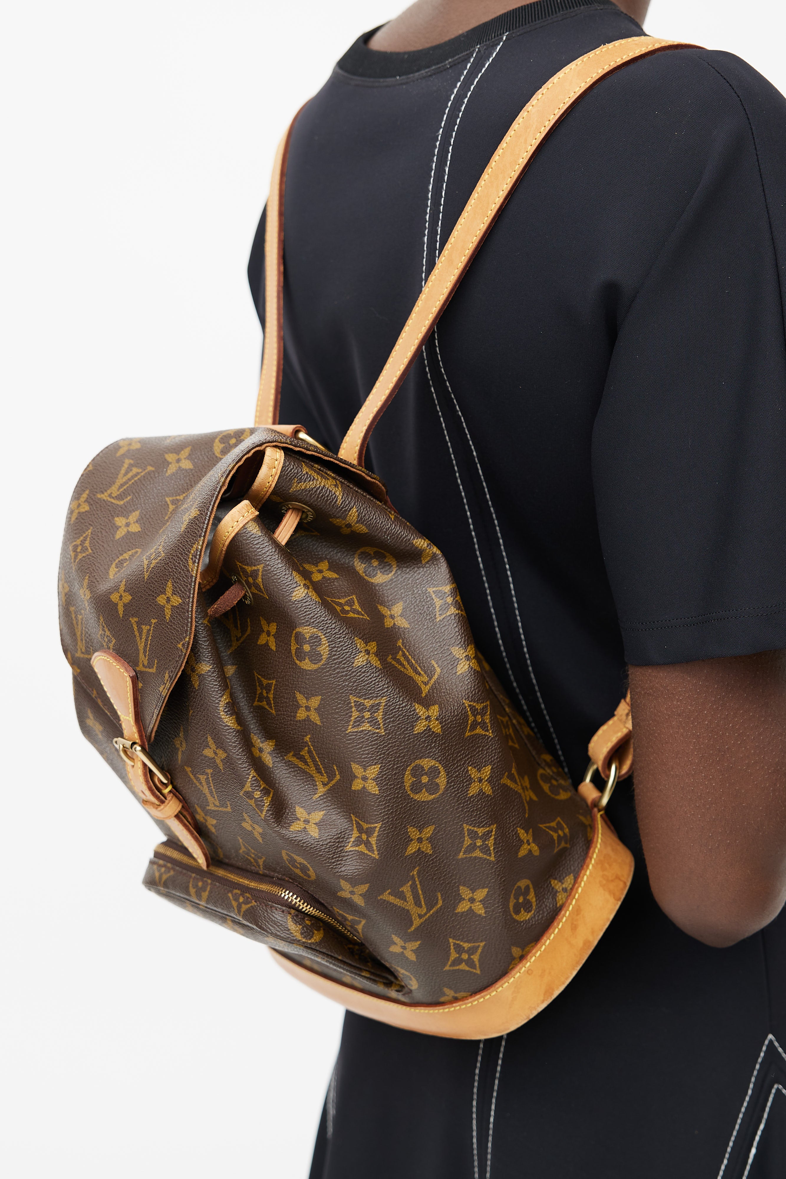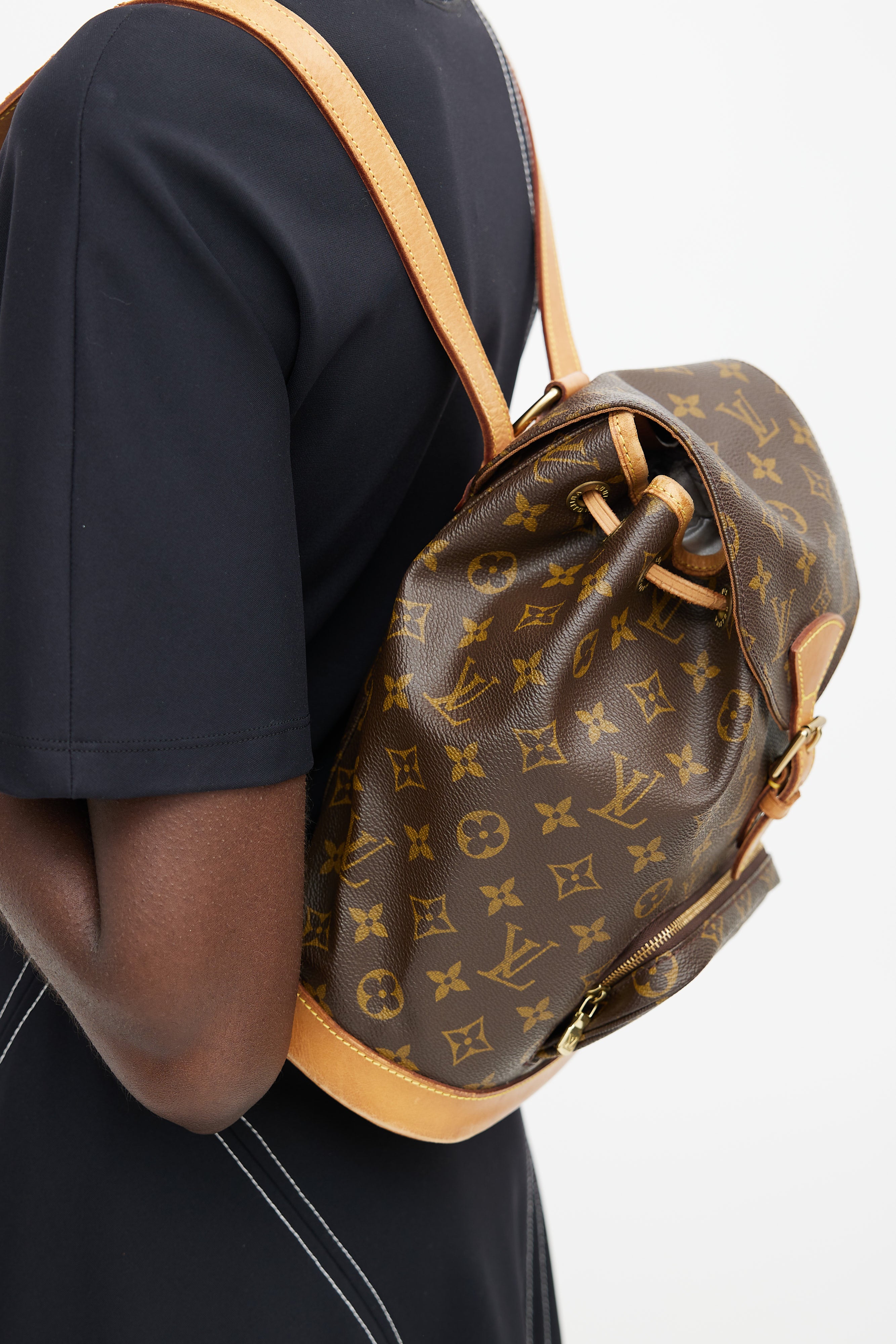 Pre-owned 1998 Louis Vuitton brown Montsouris backpack featuring monogram canvas, exterior zip pocket at face, Vachetta leather trim, top flap with strap closure, drawstring fastening at top, gold tone top handle, adjustable shoulder straps, lined main compartment, and interior slip pocket.