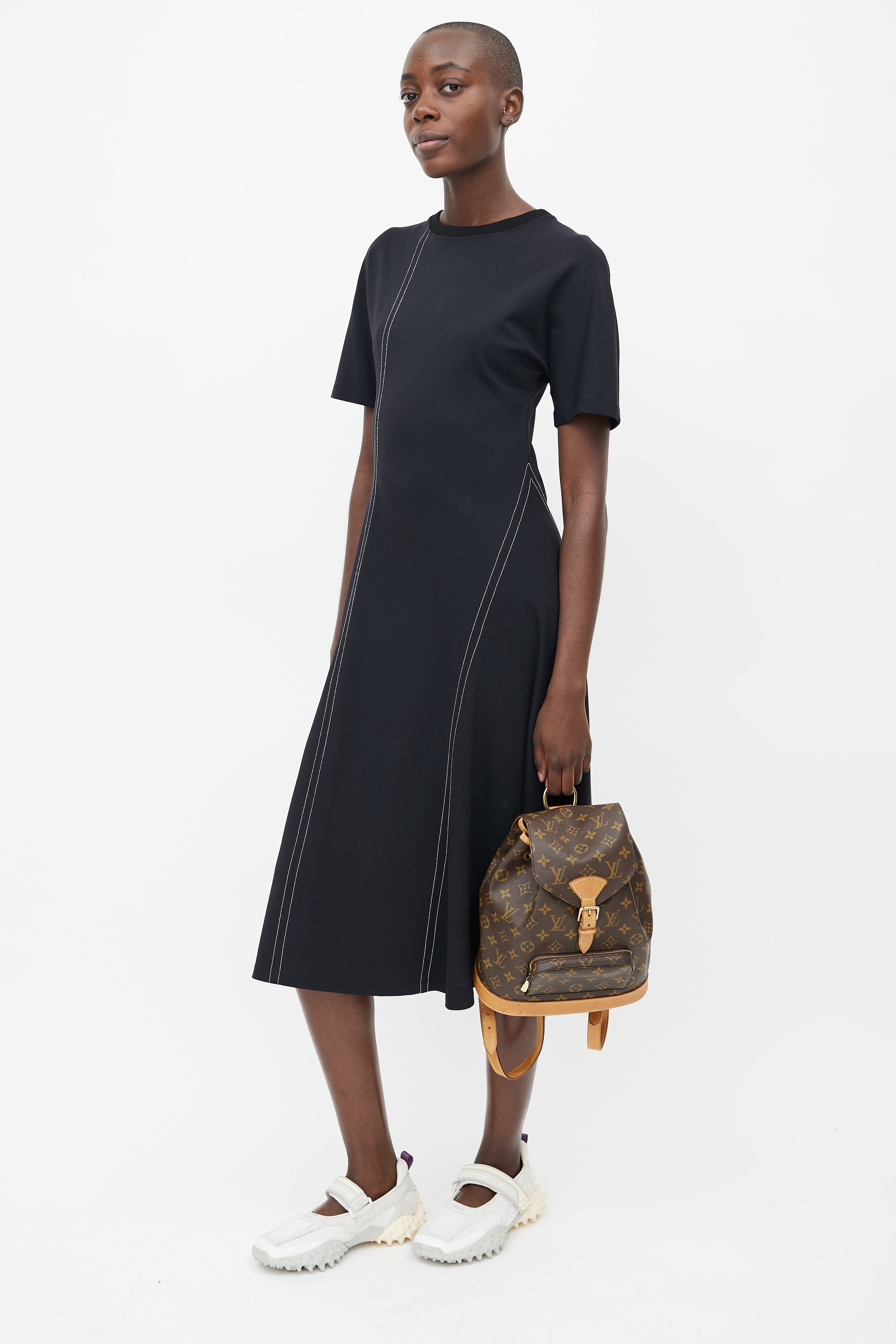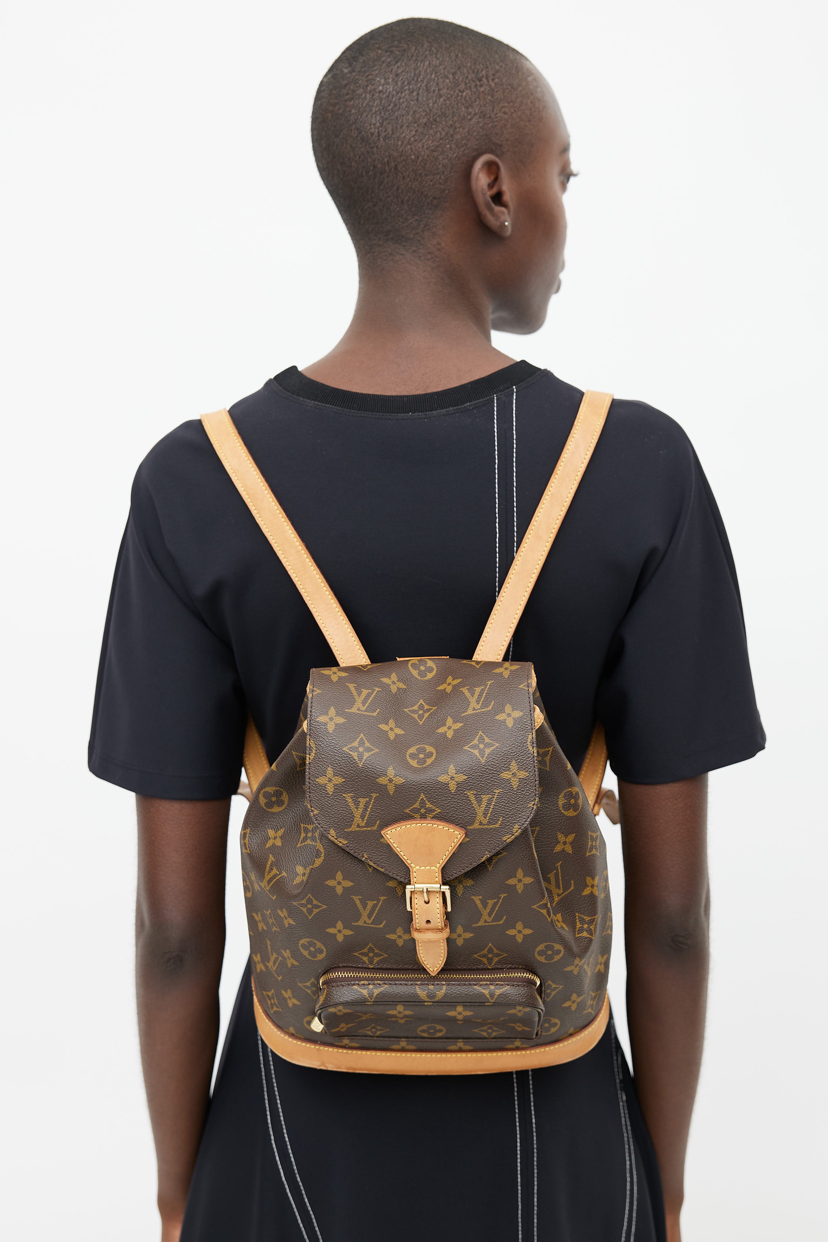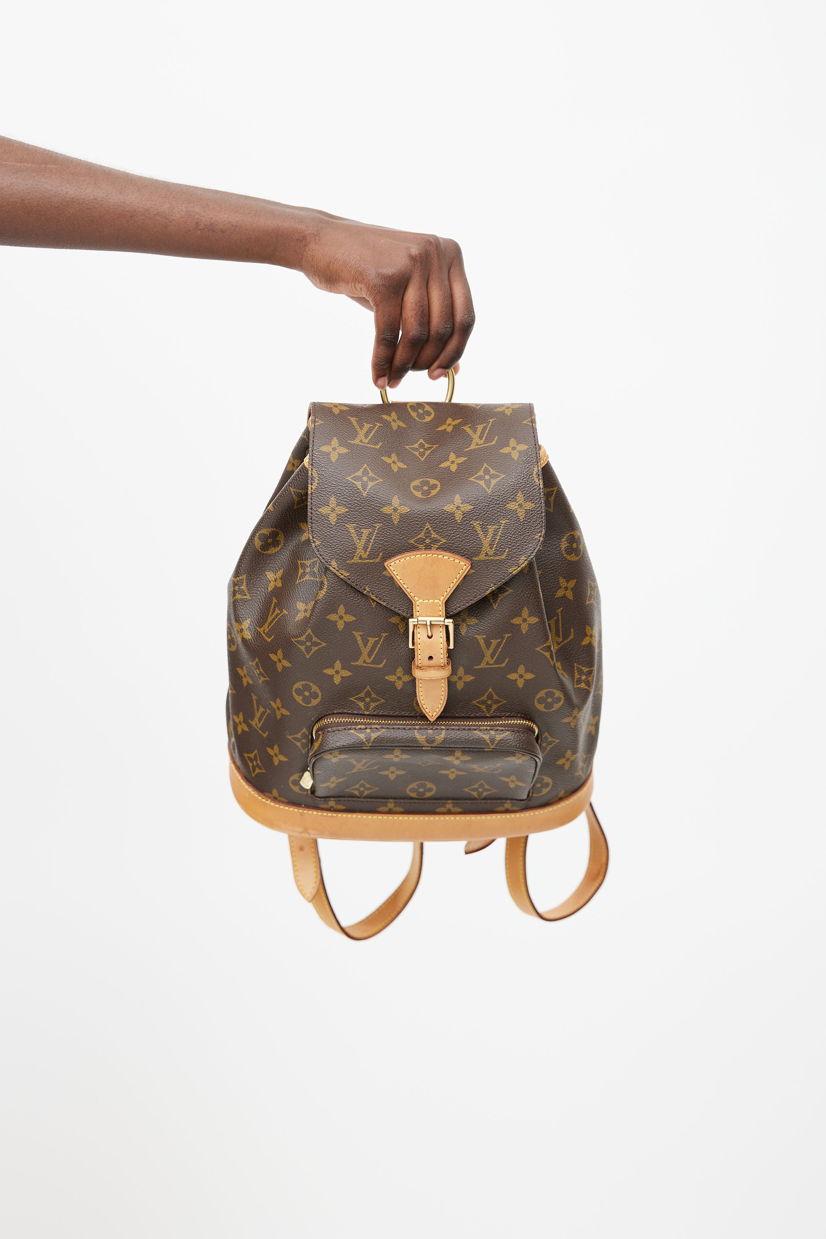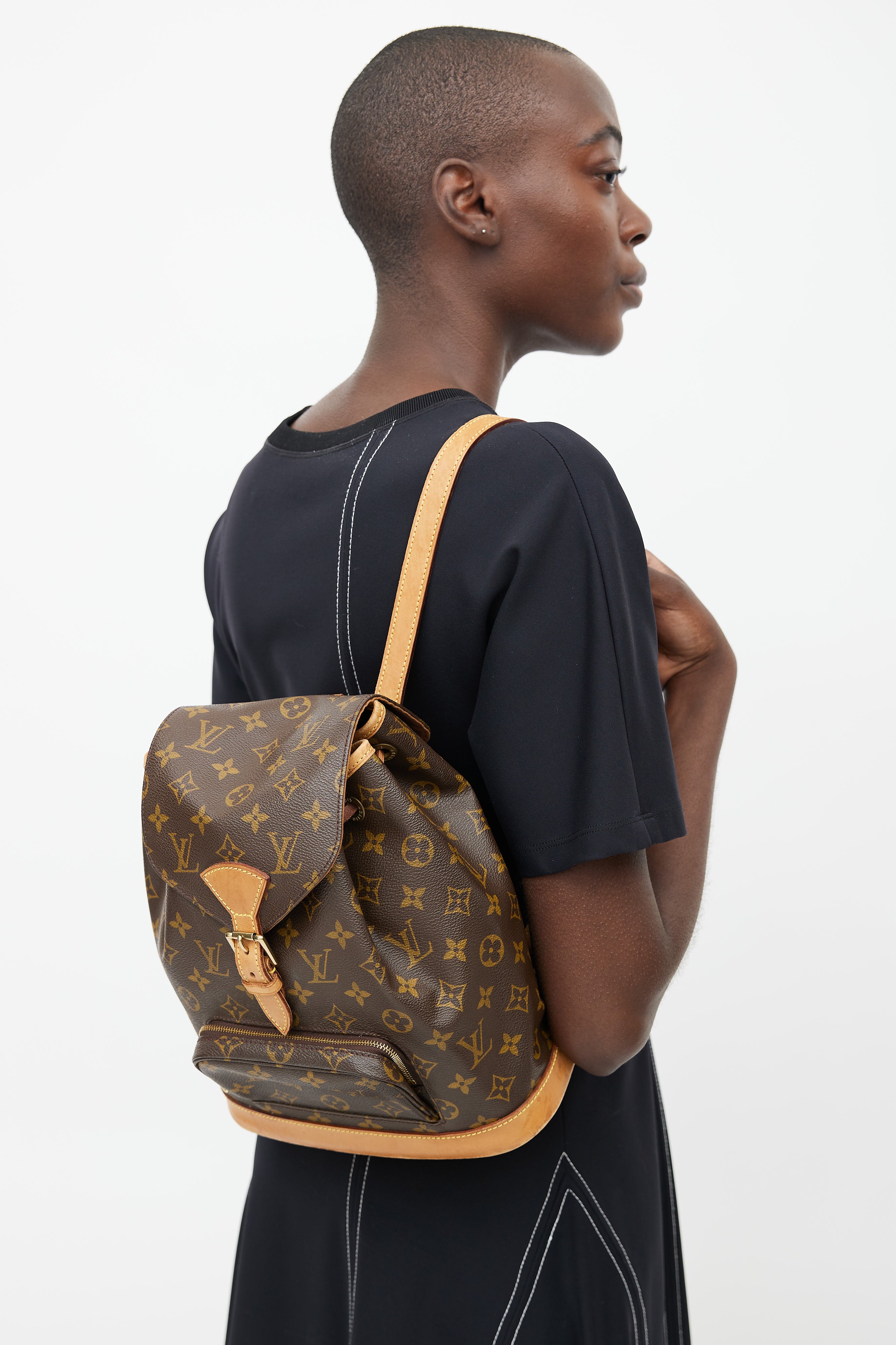 Pre-owned 1998 Louis Vuitton brown Montsouris backpack featuring monogram canvas, exterior zip pocket at face, Vachetta leather trim, top flap with strap closure, drawstring fastening at top, gold tone top handle, adjustable shoulder straps, lined main compartment, and interior slip pocket.