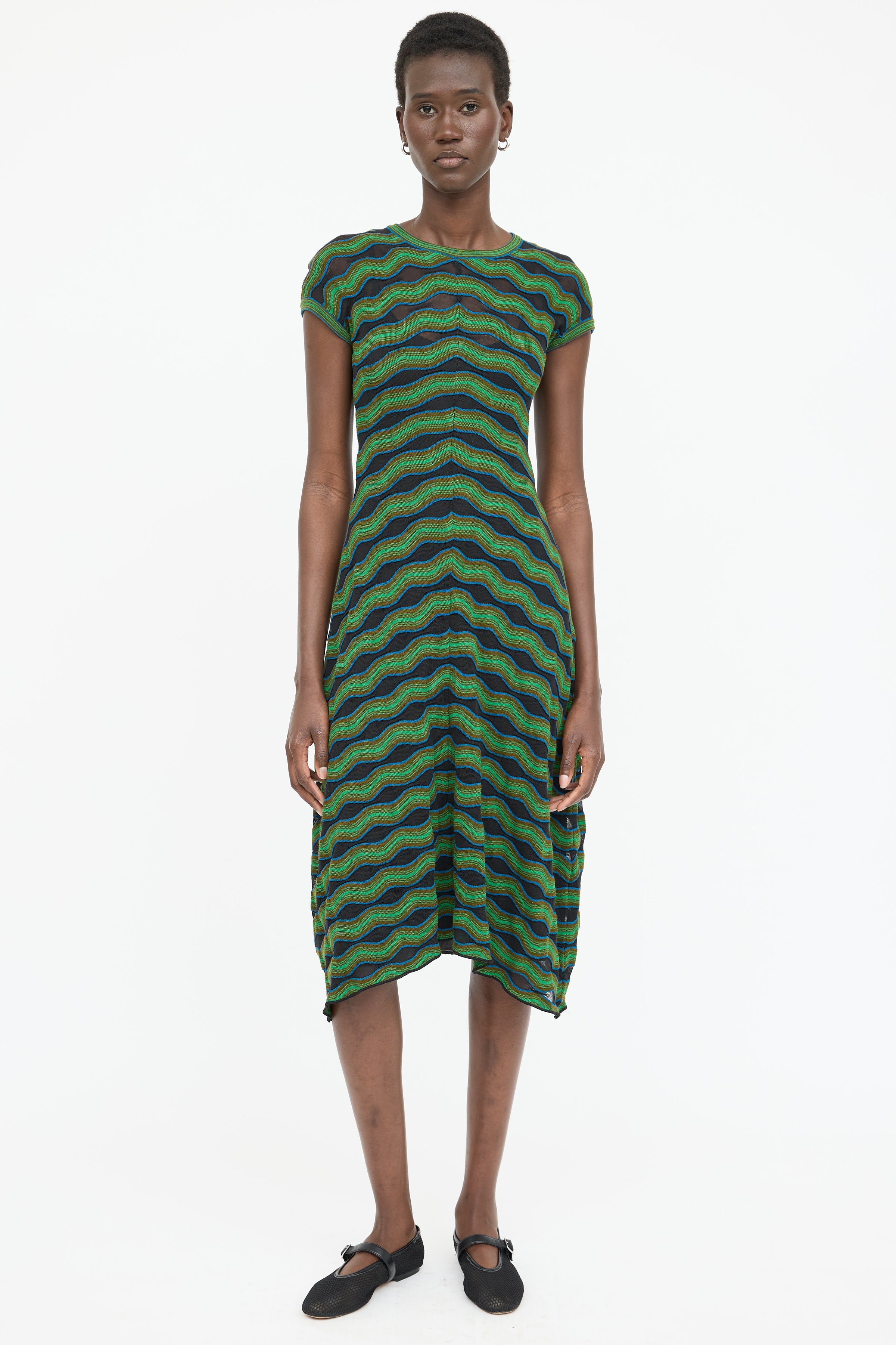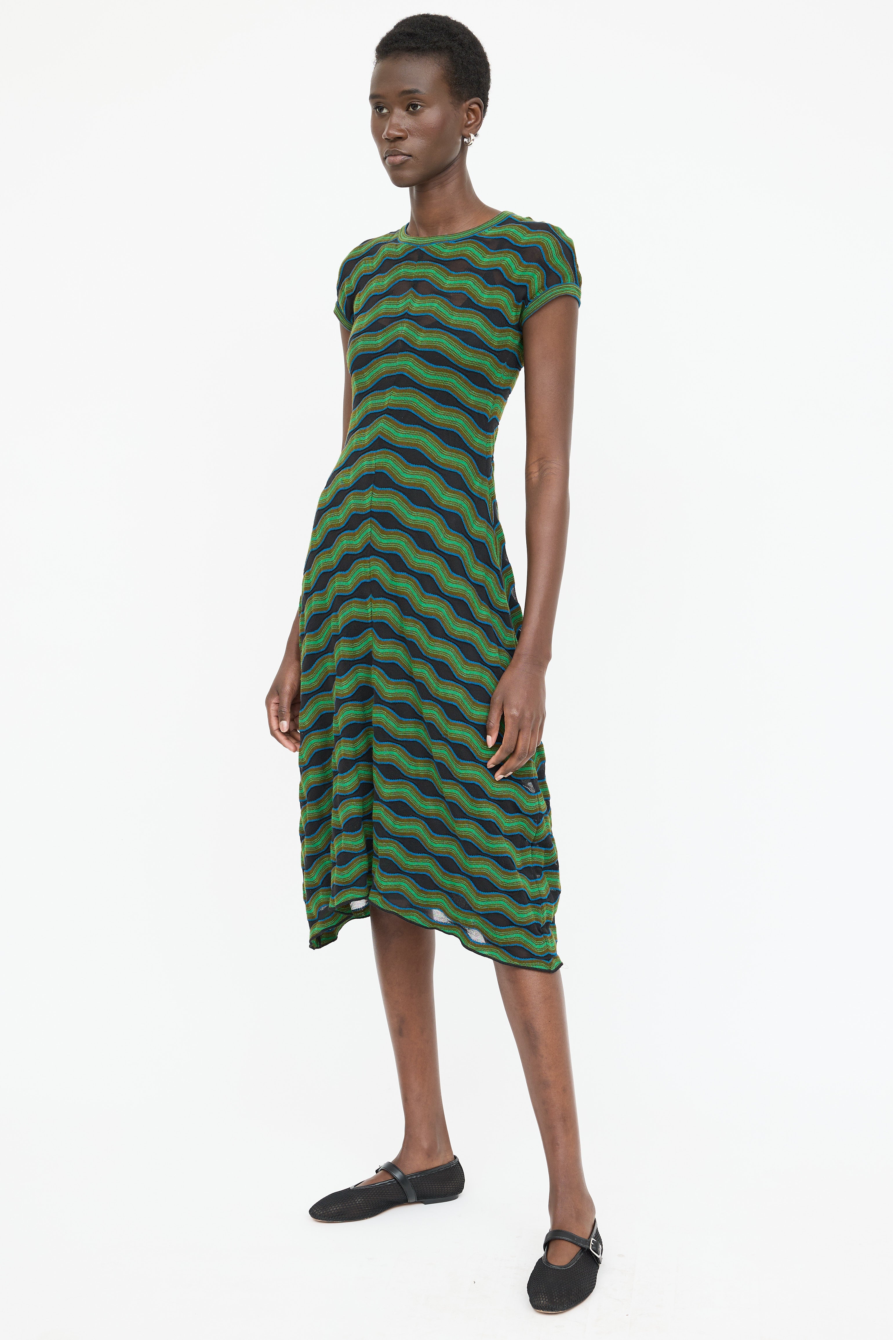 Pre-owned M Missoni green and multicolor knit sleeveless dress featuring wavy knit pattern throughout and round neckline. Includes camisole slip.