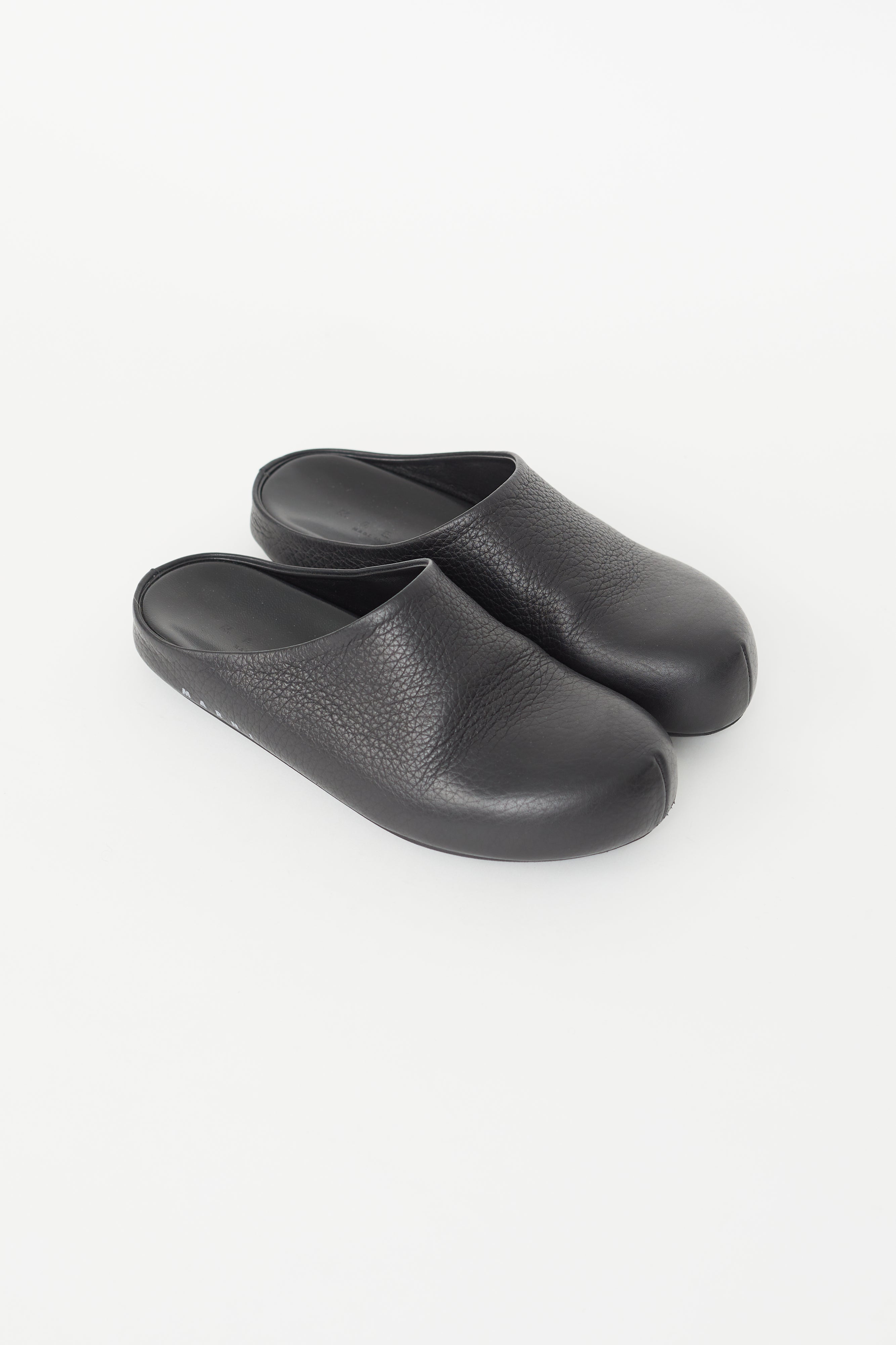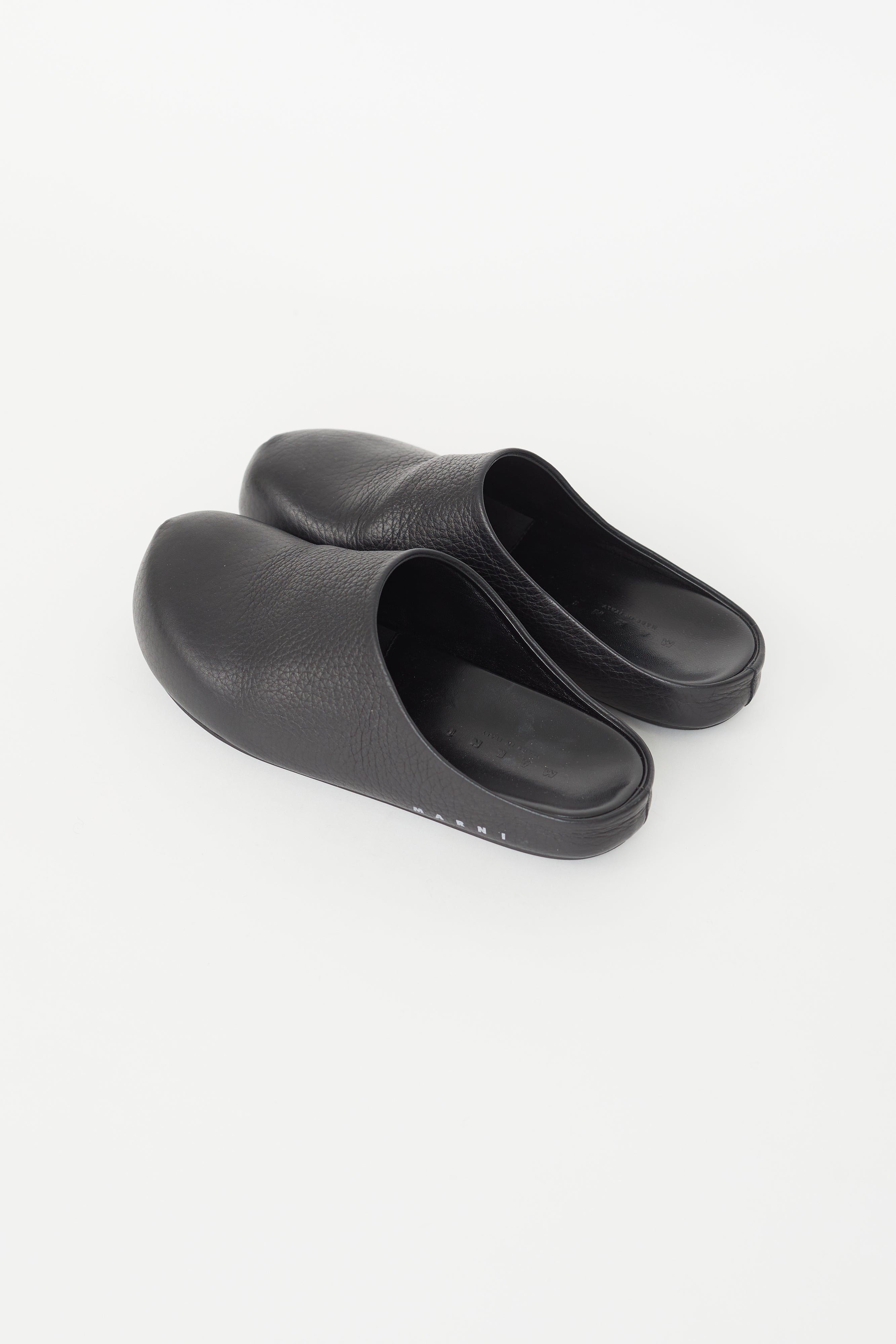 Pre-owned Marni black leather Fussbett Sabot mule featuring rounded toe, slip on entry, leather insole with embossed logo, and white logo at side. Comes with original dust bag.