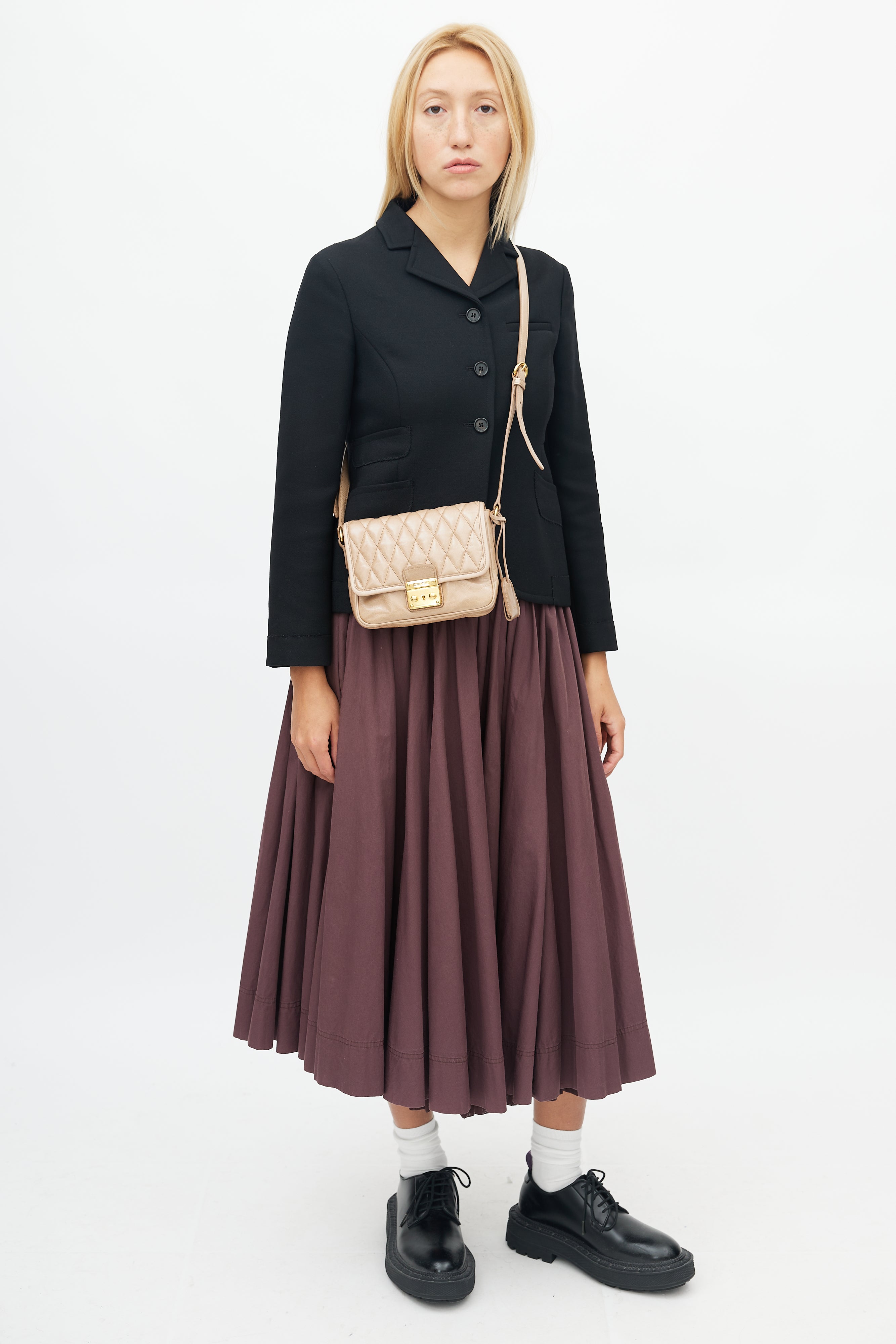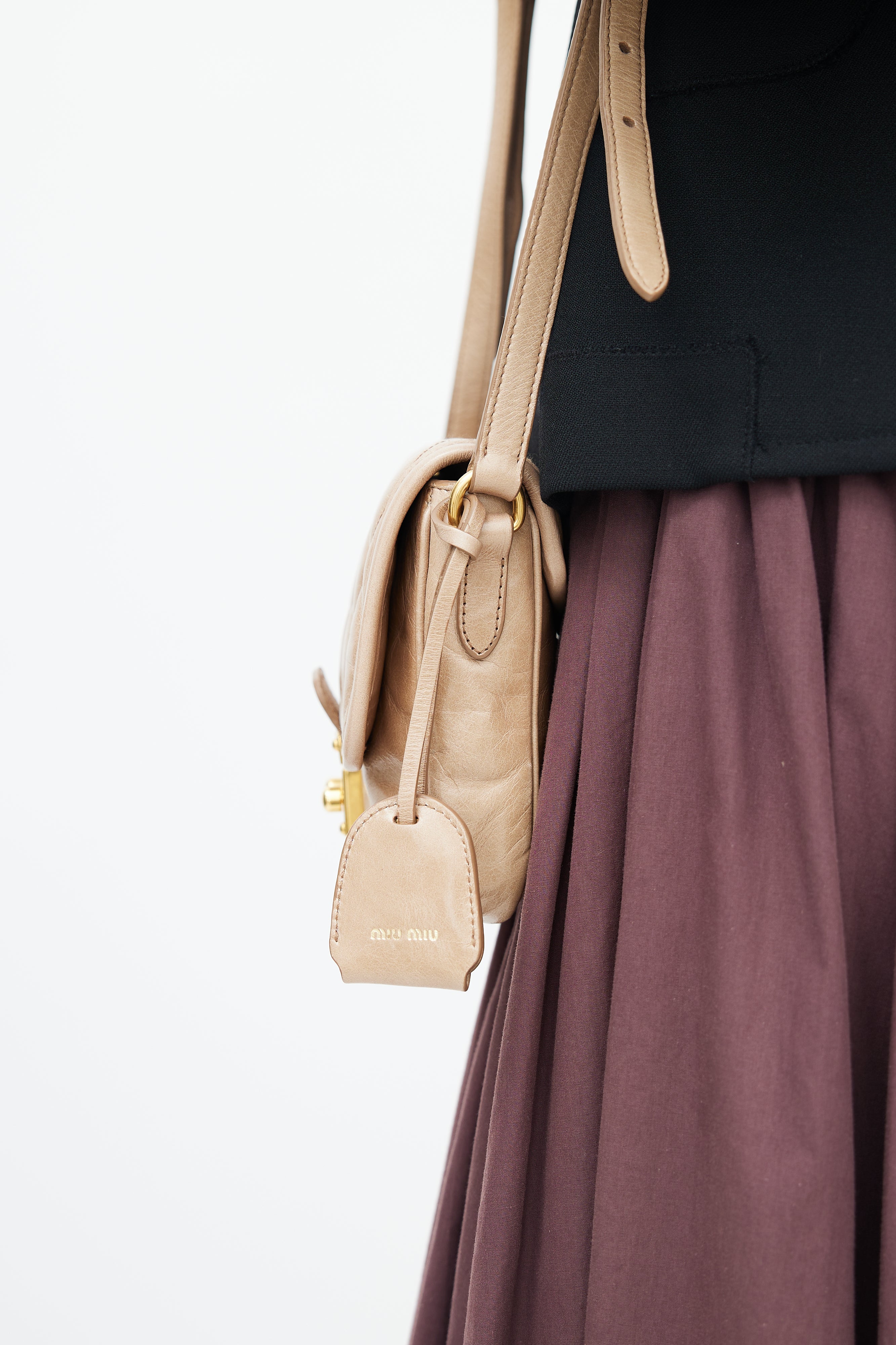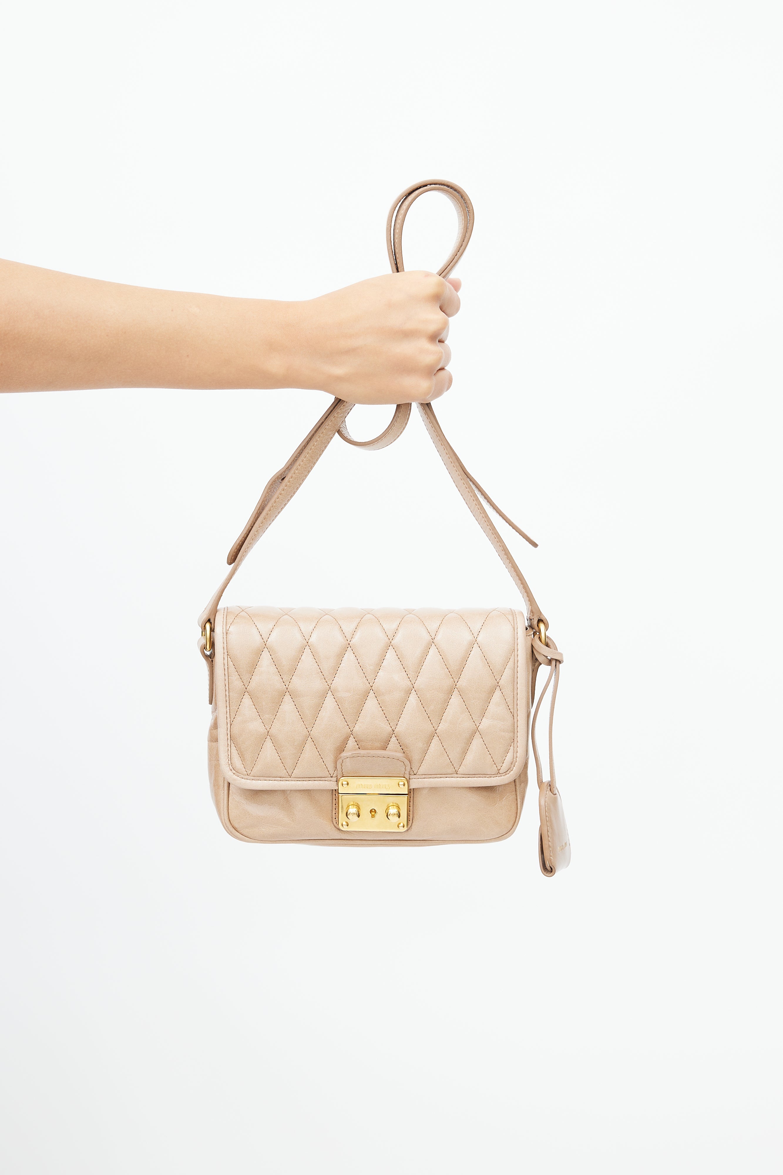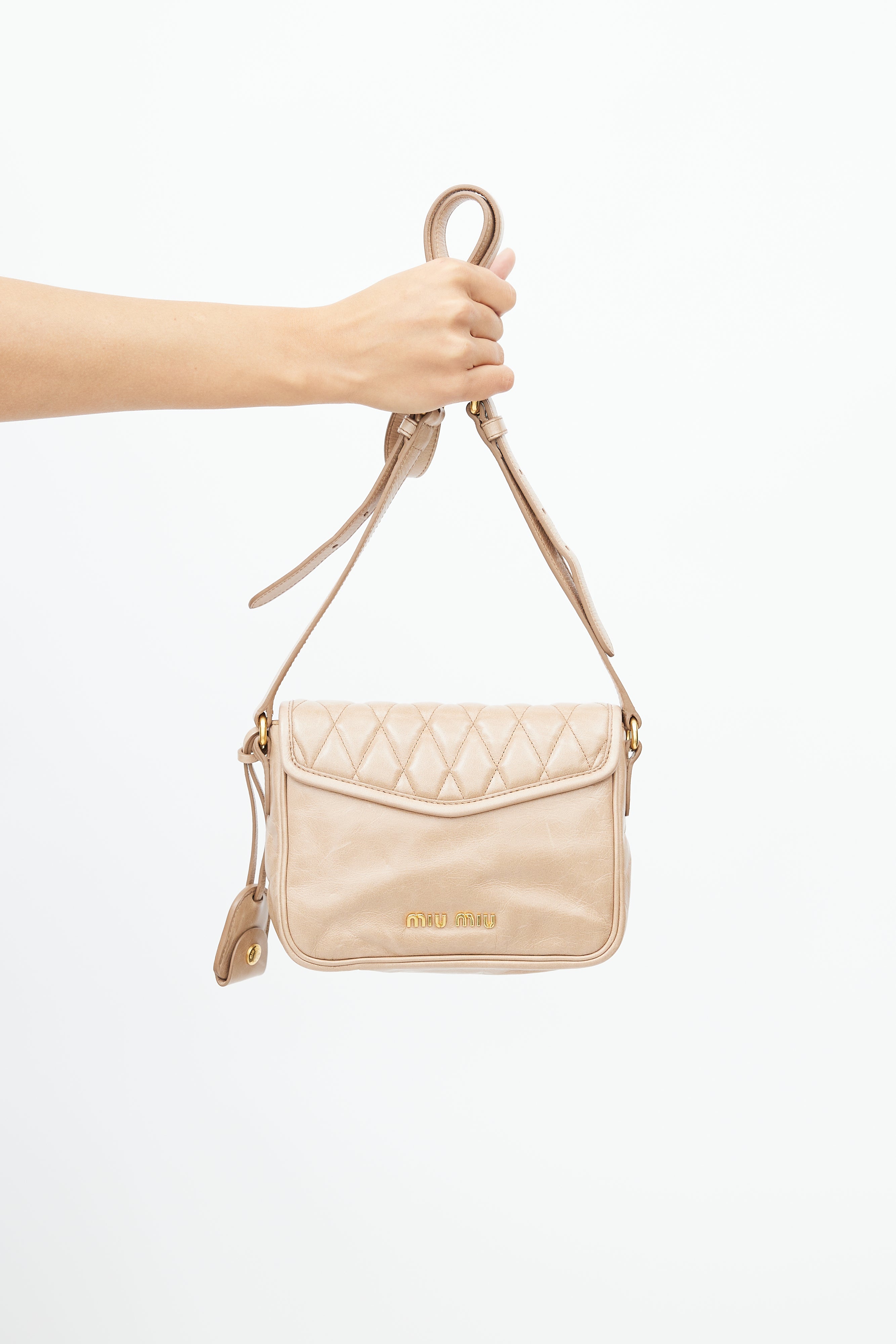 Pre-owned Miu Miu beige crossbody bag featuring quilted top flap, gold tone hardware, push lock closure at front, logo hardware at back, adjustable shoulder strap, detachable key ring, satin lining, and zip and slip pockets inside.