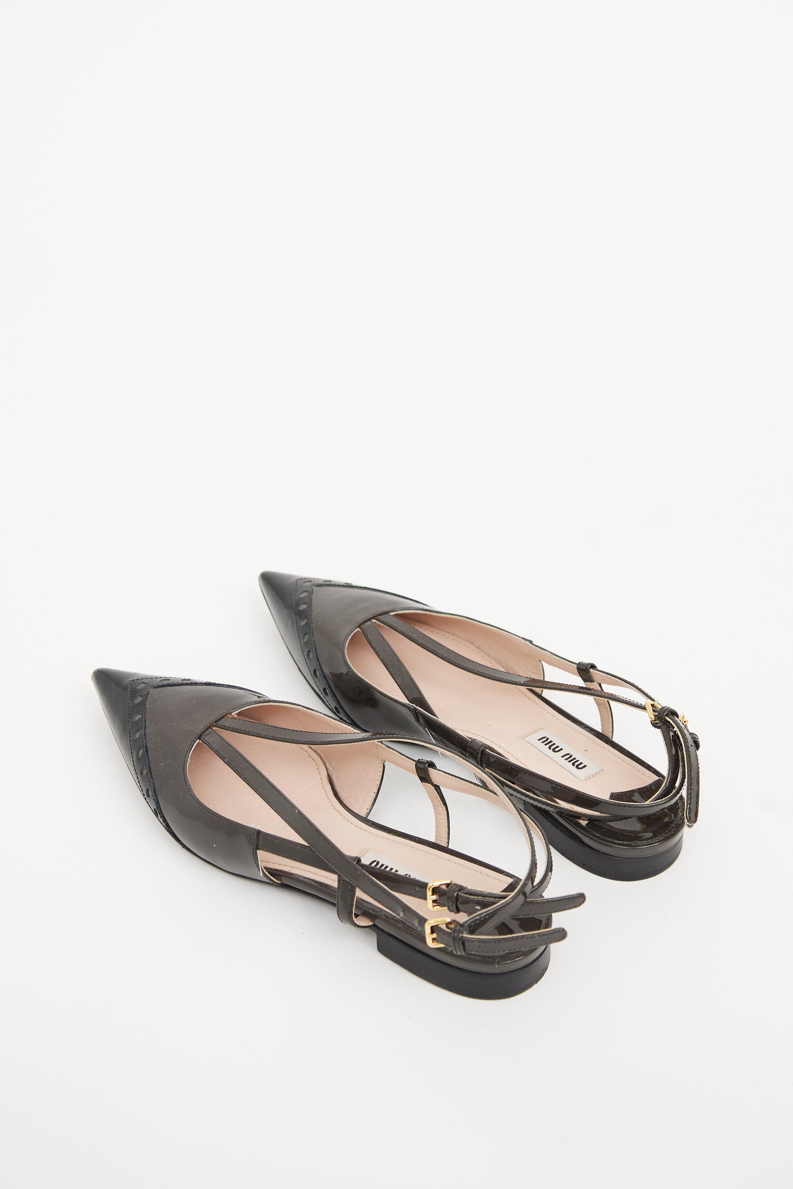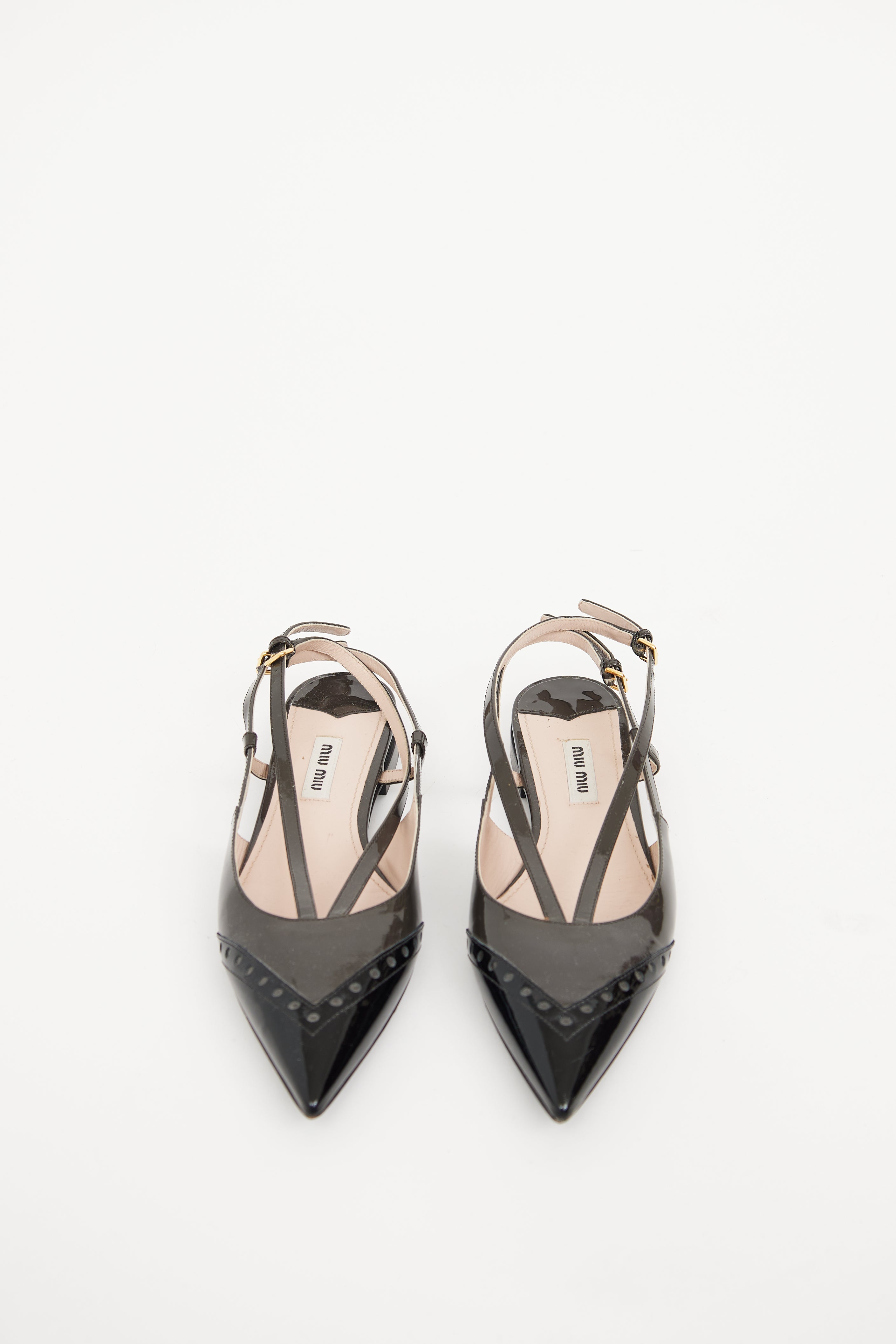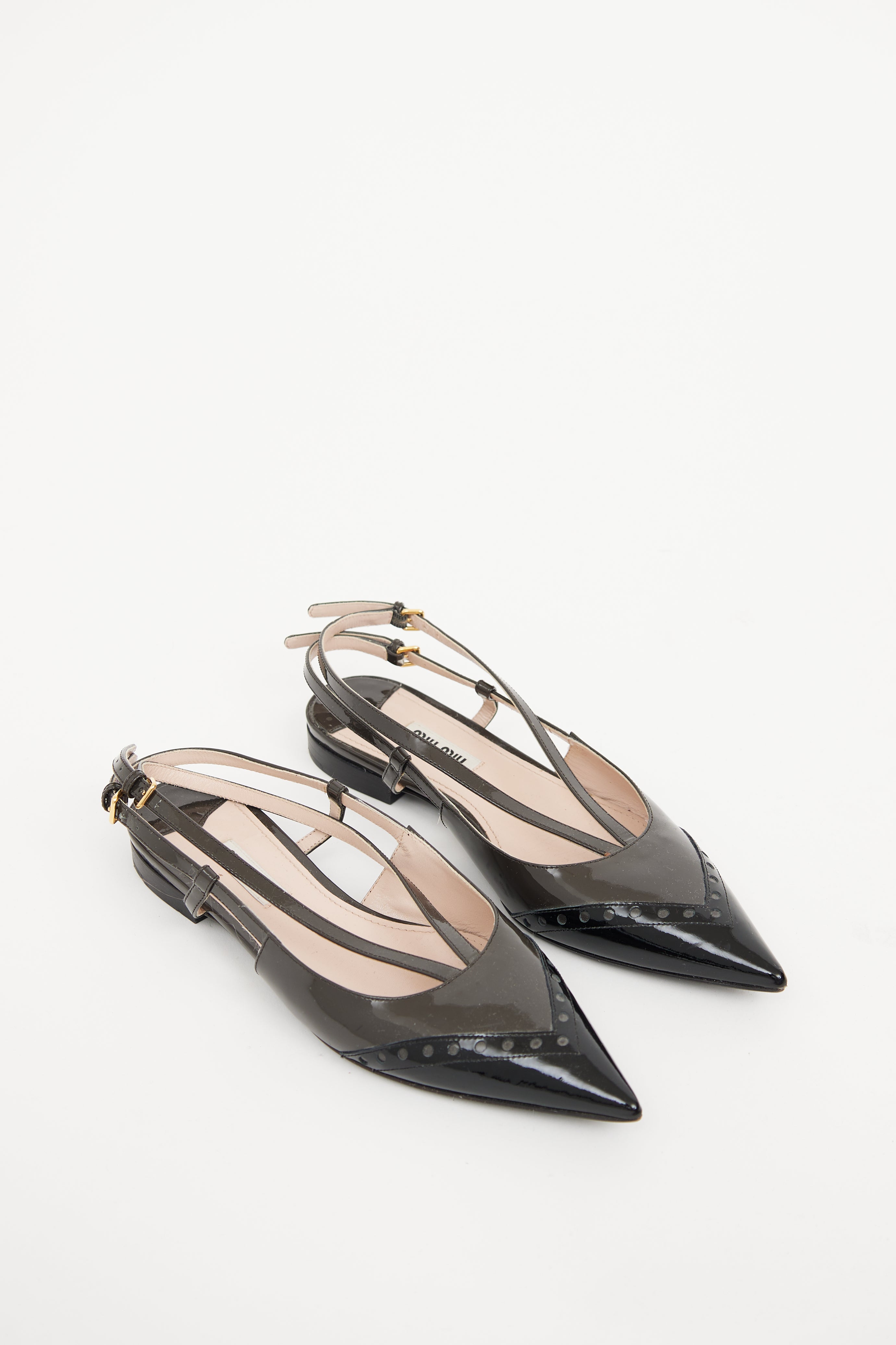 Pre-owned Miu Miu grey and black patent leather slingback flats featuring pointed toe, eyelet detail on toe box, gold tone hardware, dual adjustable ankle strap and covered block heel.