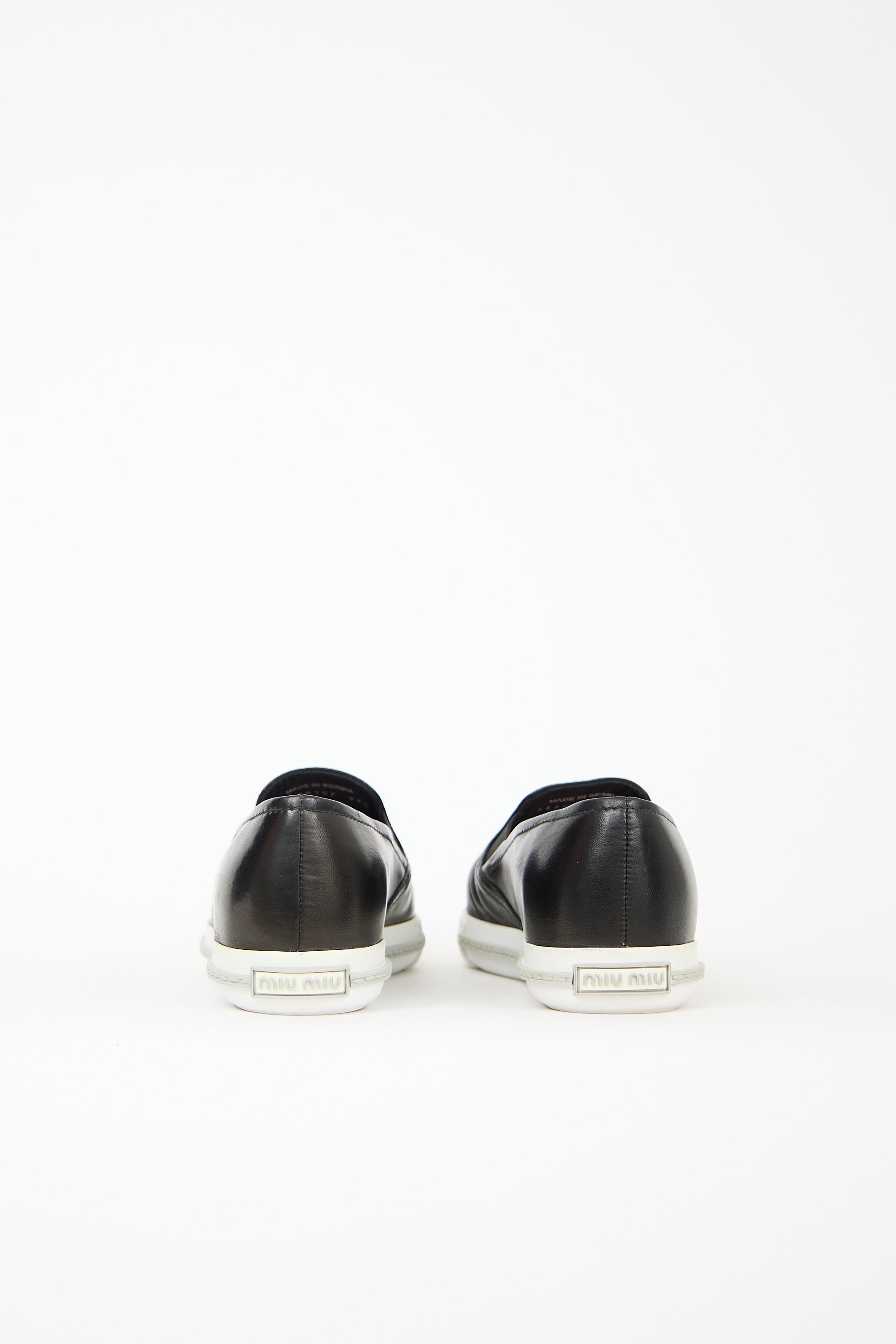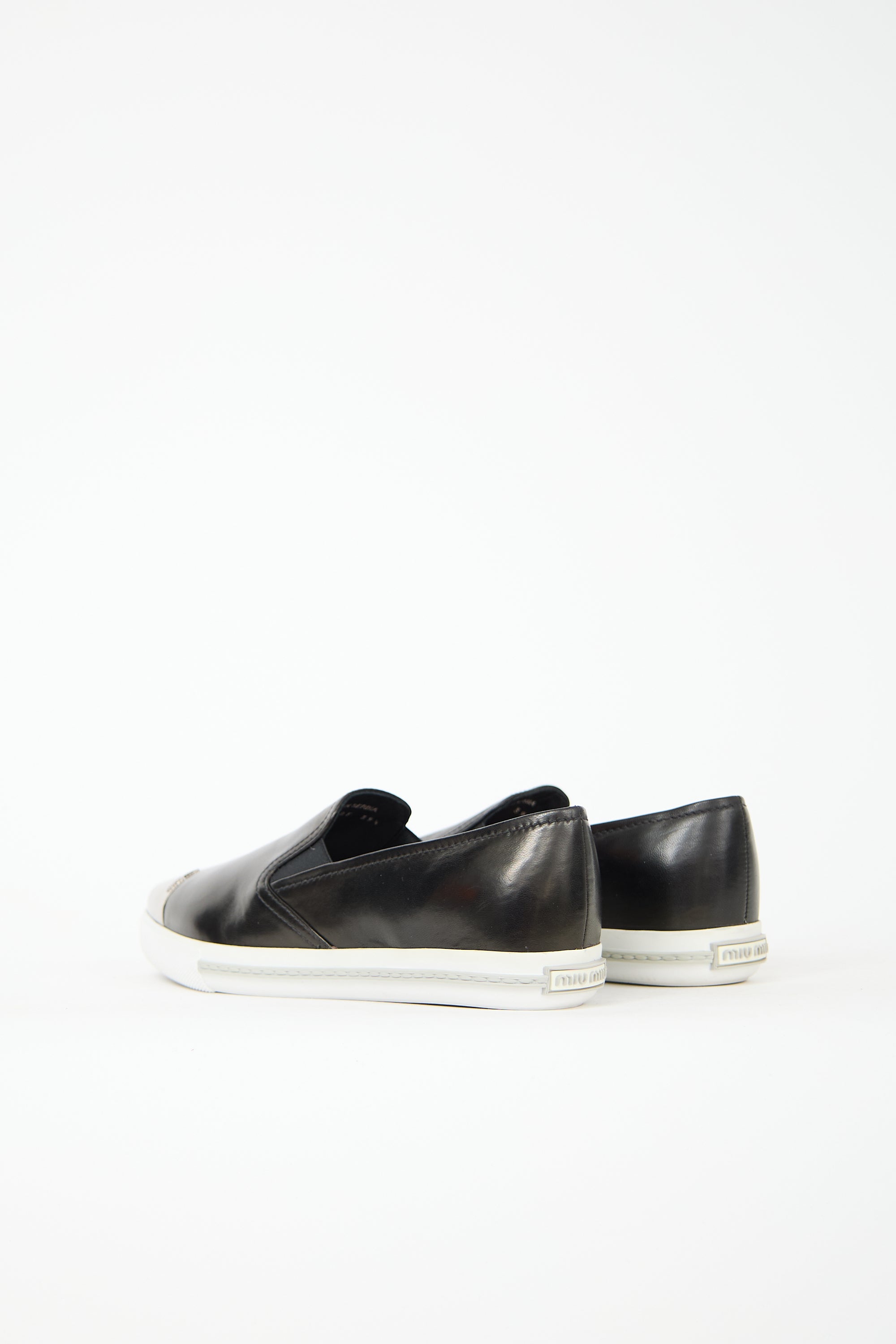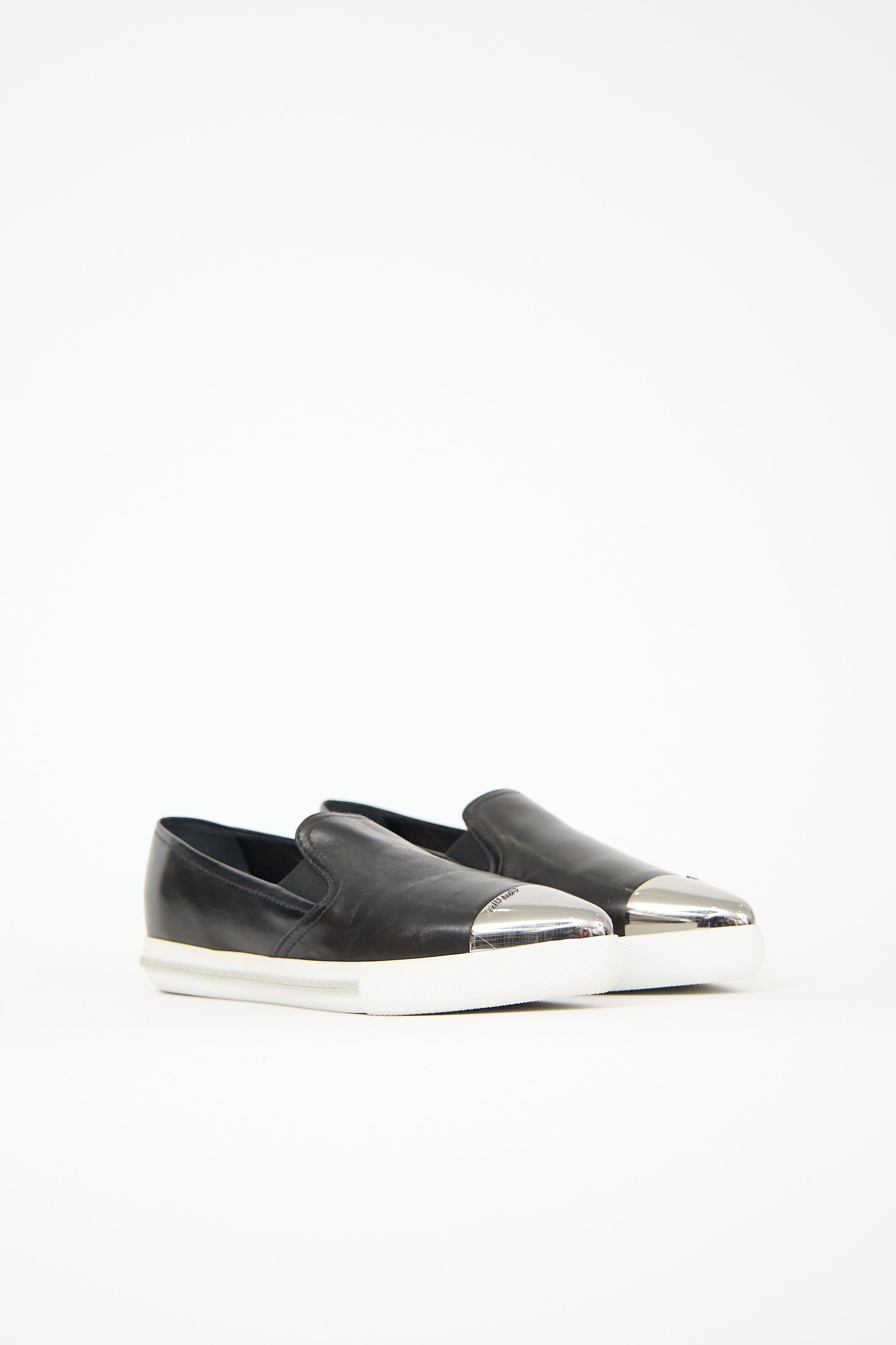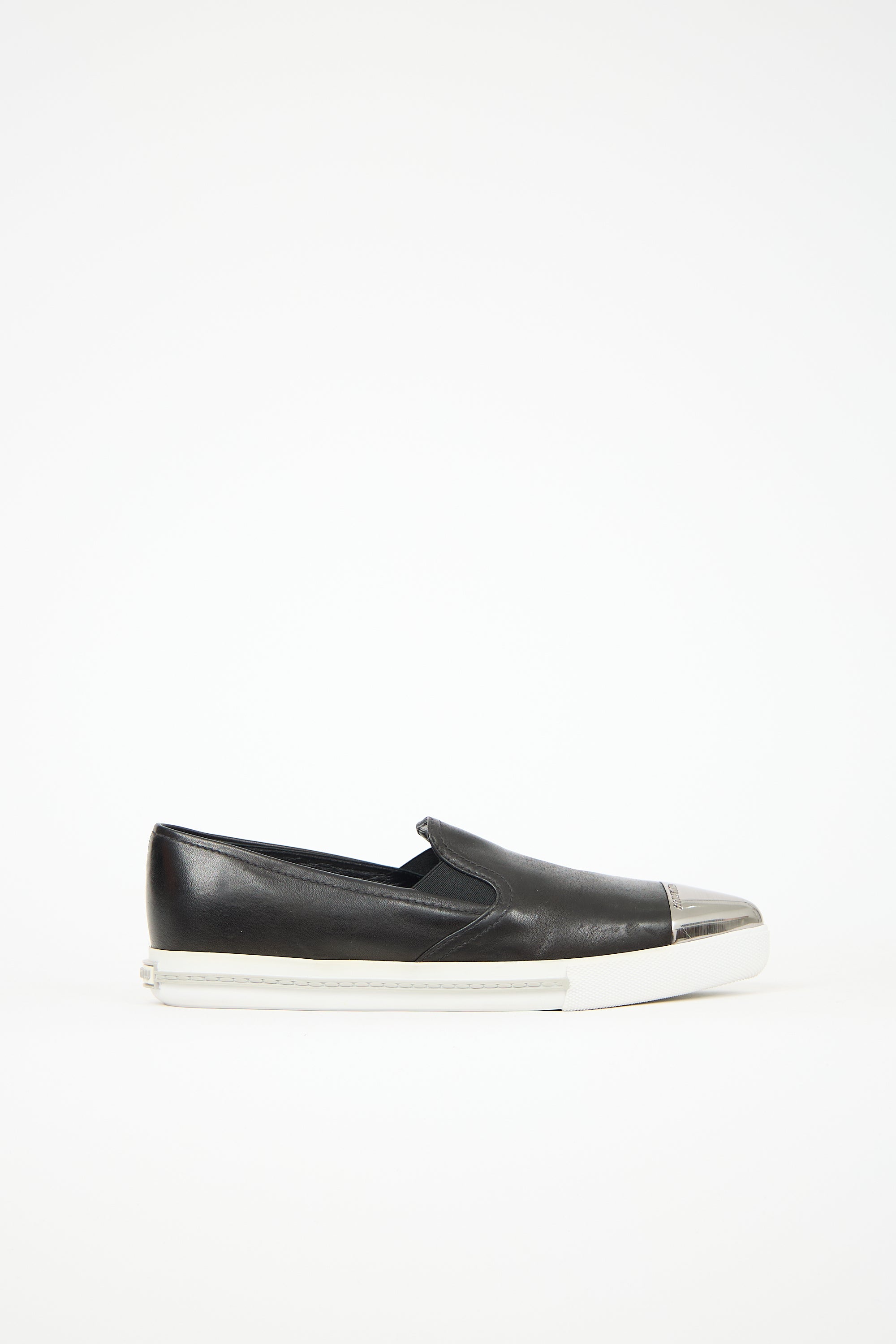 Pre-owned Miu Miu black leather slip-on sneakers featuring a pointed toe, silver tone toe cap, slip on entry, embossed logo at toe and counter, and rubber gum sole. Comes with original box and dust bag.