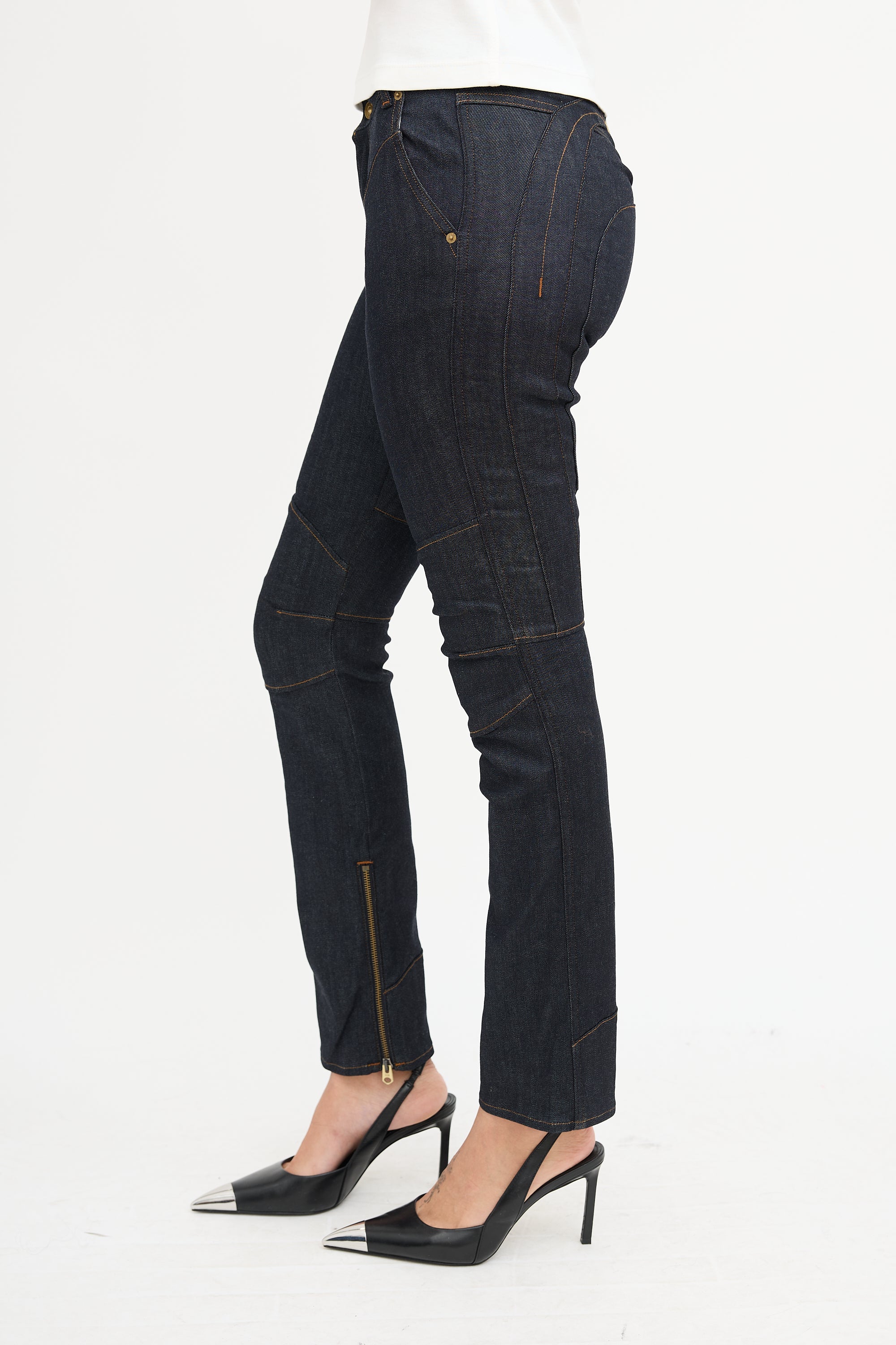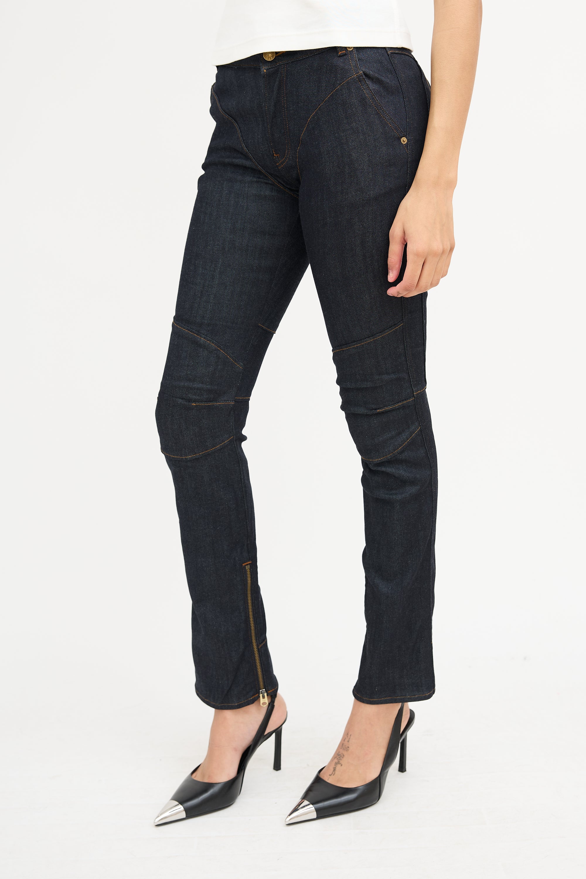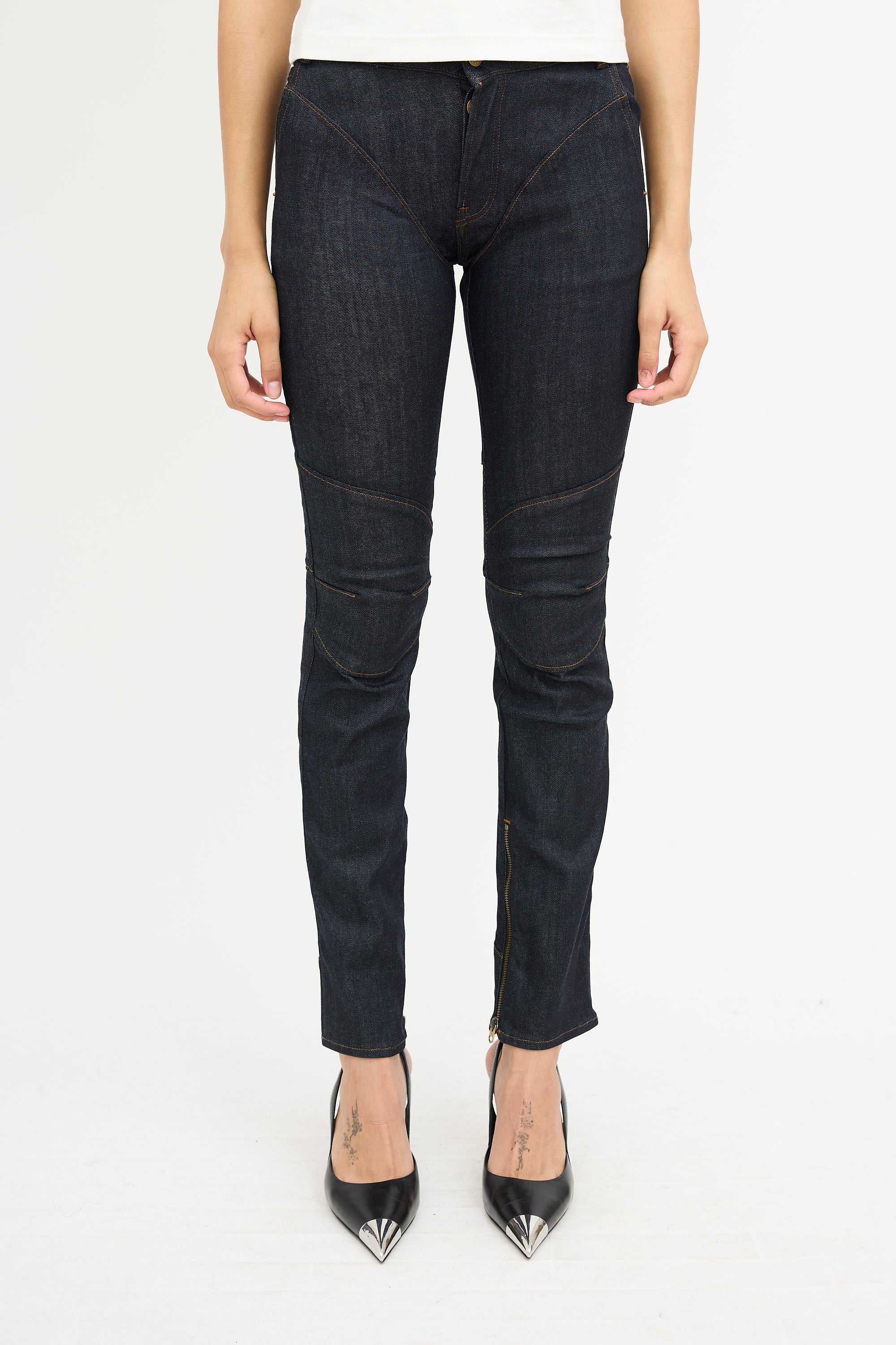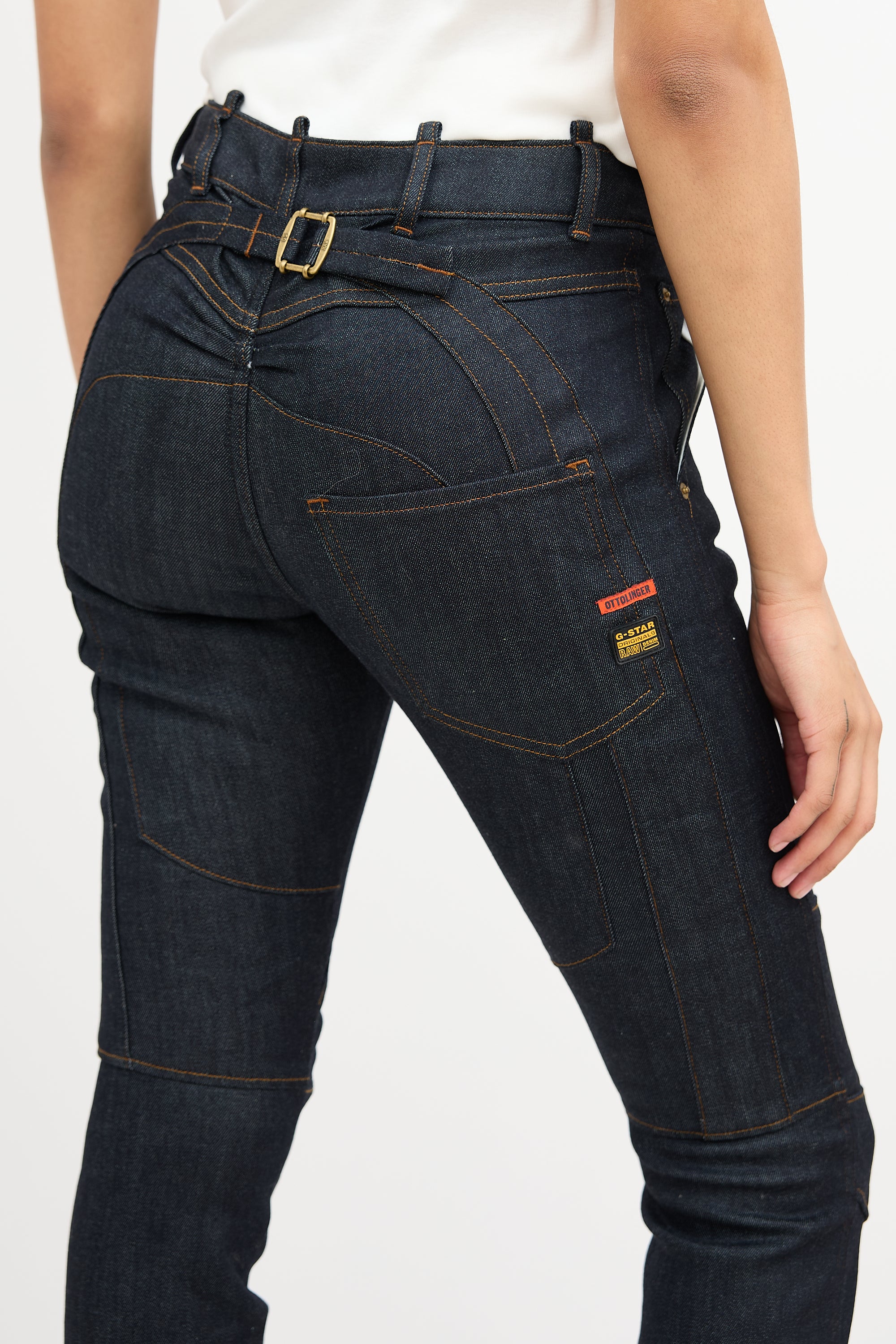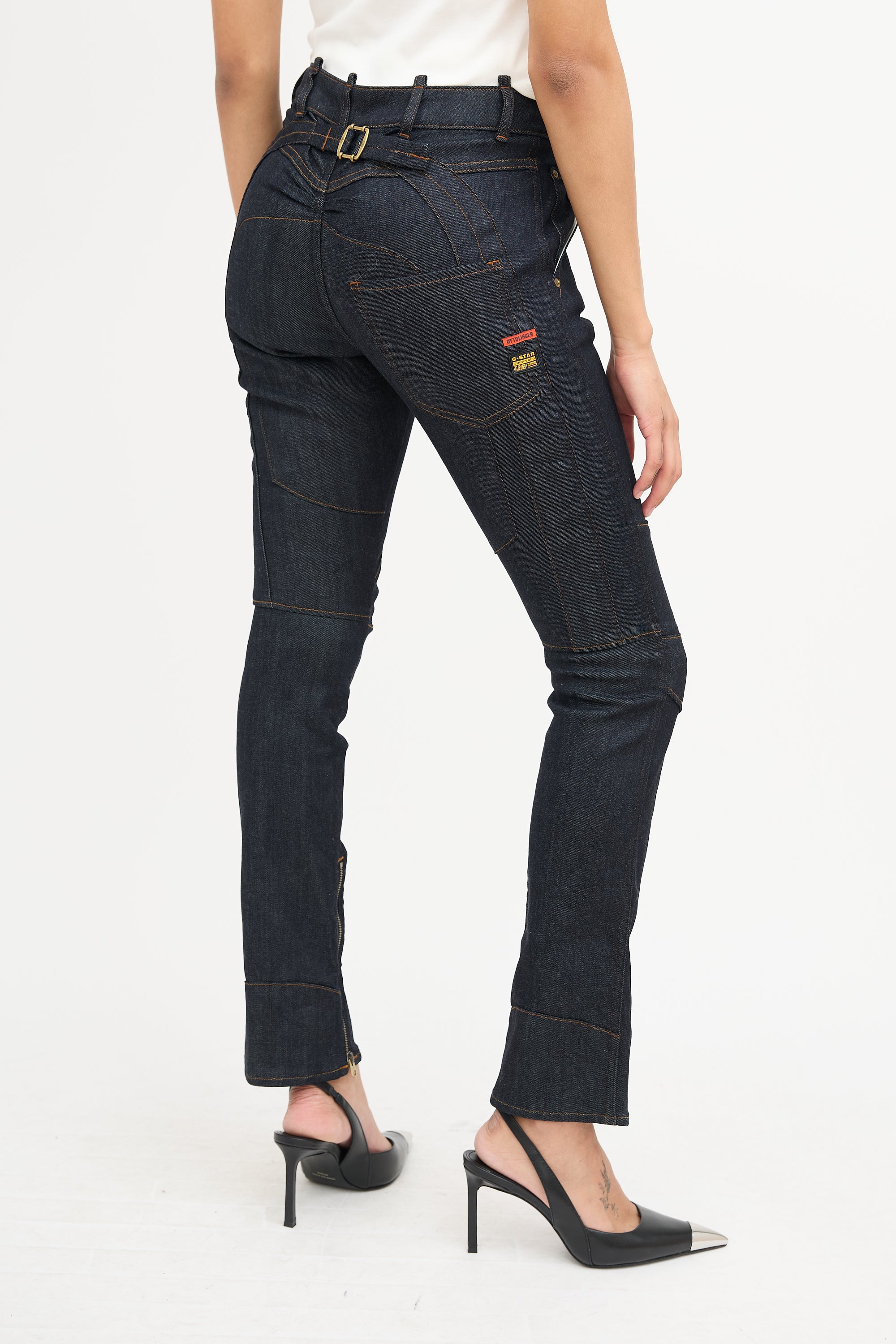 Pre-owned Ottolinger x G-Star dark wash The Denim 001 jeans featuring paneling throughout with contrast stitch, belt loops, button fly, five pocket styling, adjustable waist strap at back, and zip hem.