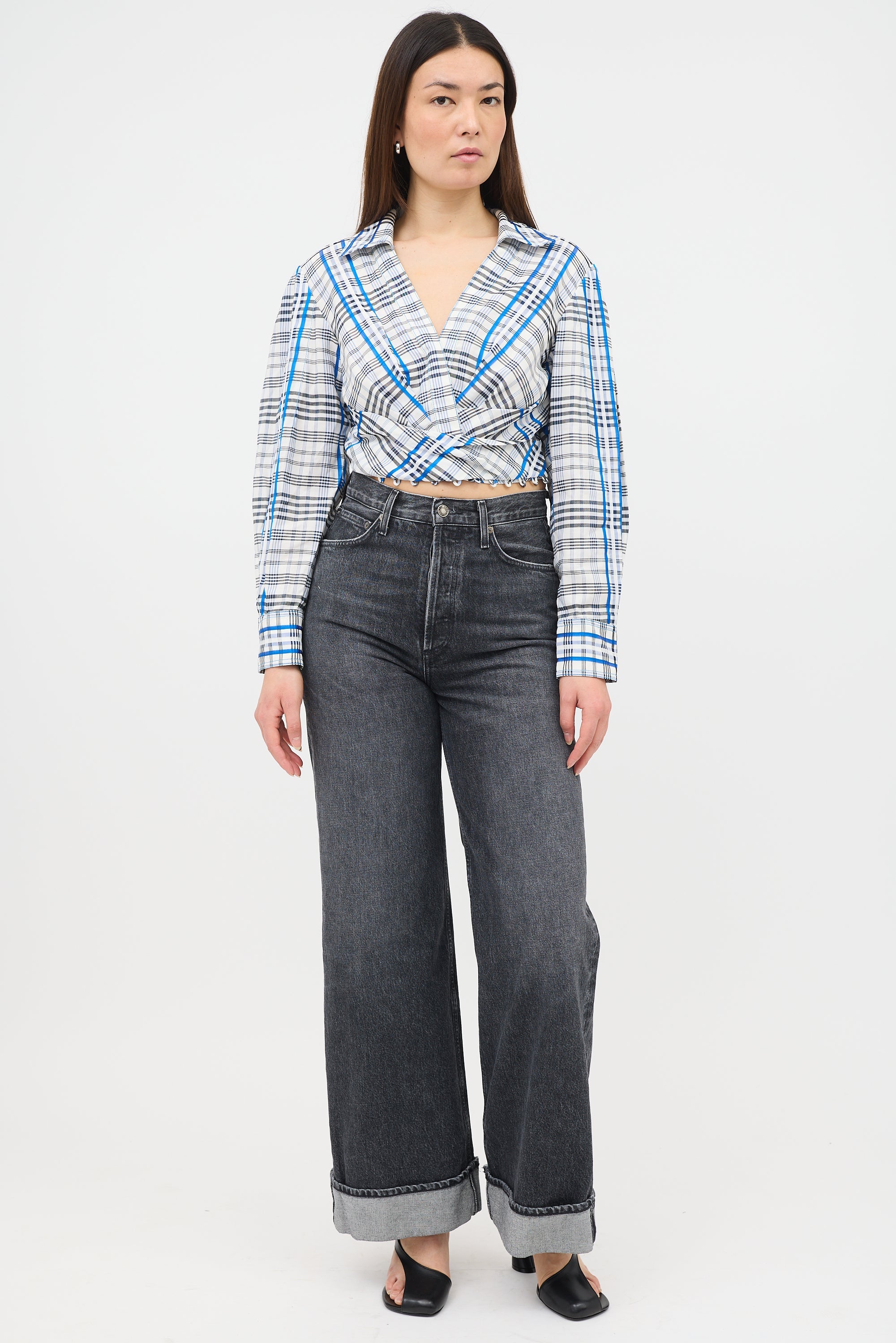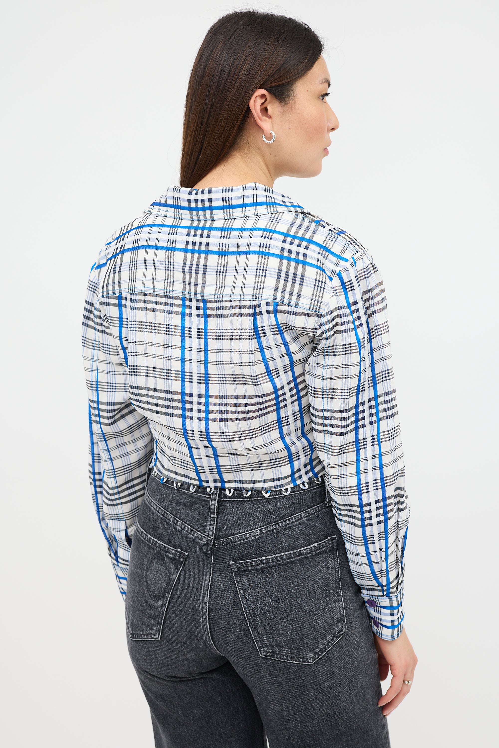 Pre-owned Prabal Gurung Spring/Summer 2018 white and blue top featuring check pattern, collared surplice neckline, wrap front, twisted waist, button loops at hem, and button cuffs with interior elastic band.