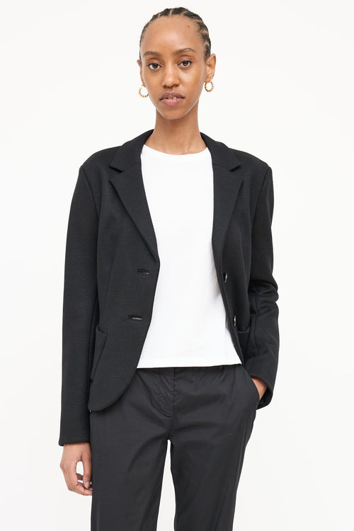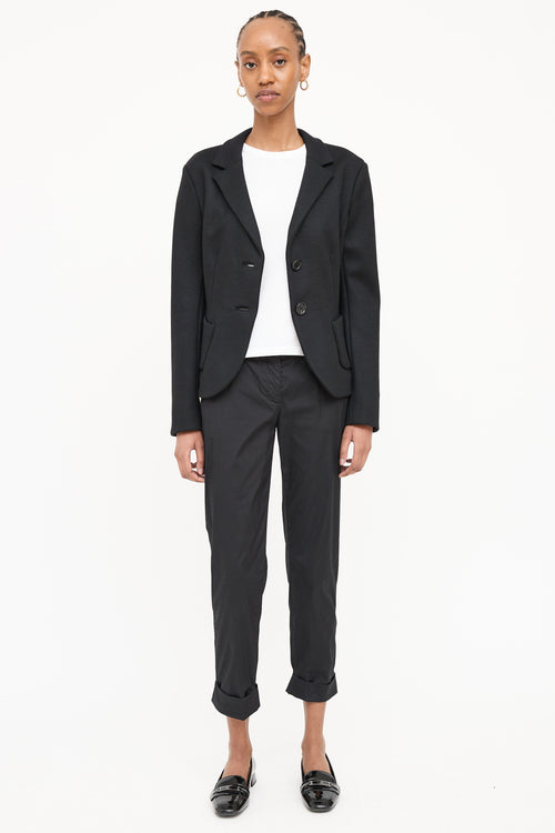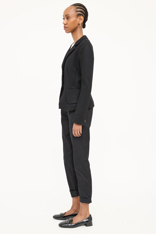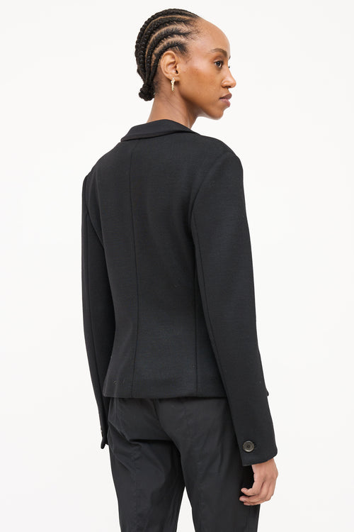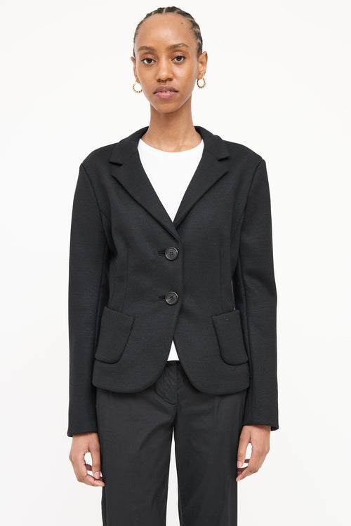 Pre-owned Prada 2012 black wool woven blazer featuring a notched lapel, long sleeves with buttoned cuffs, two patch pockets at hip, and button up closure.