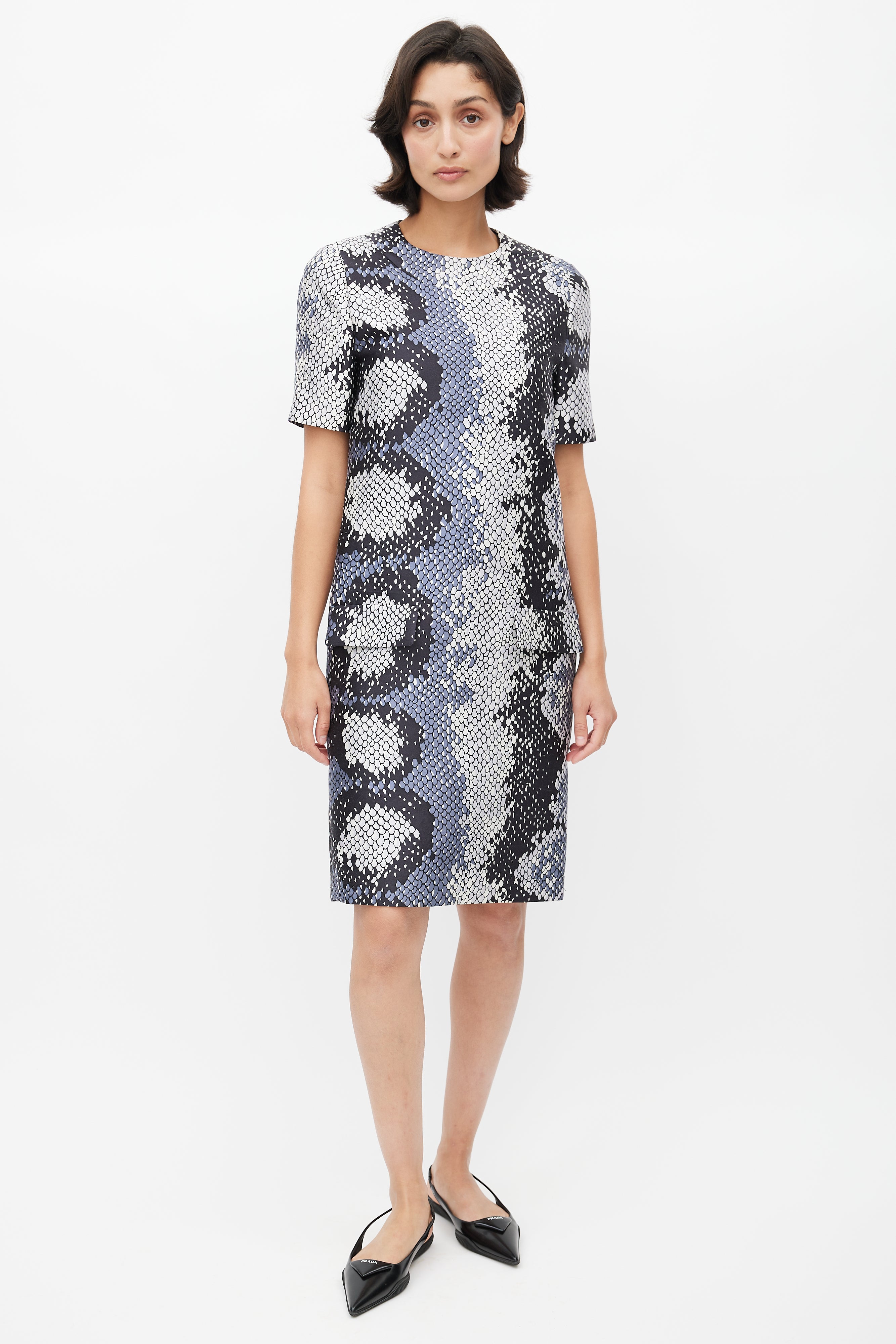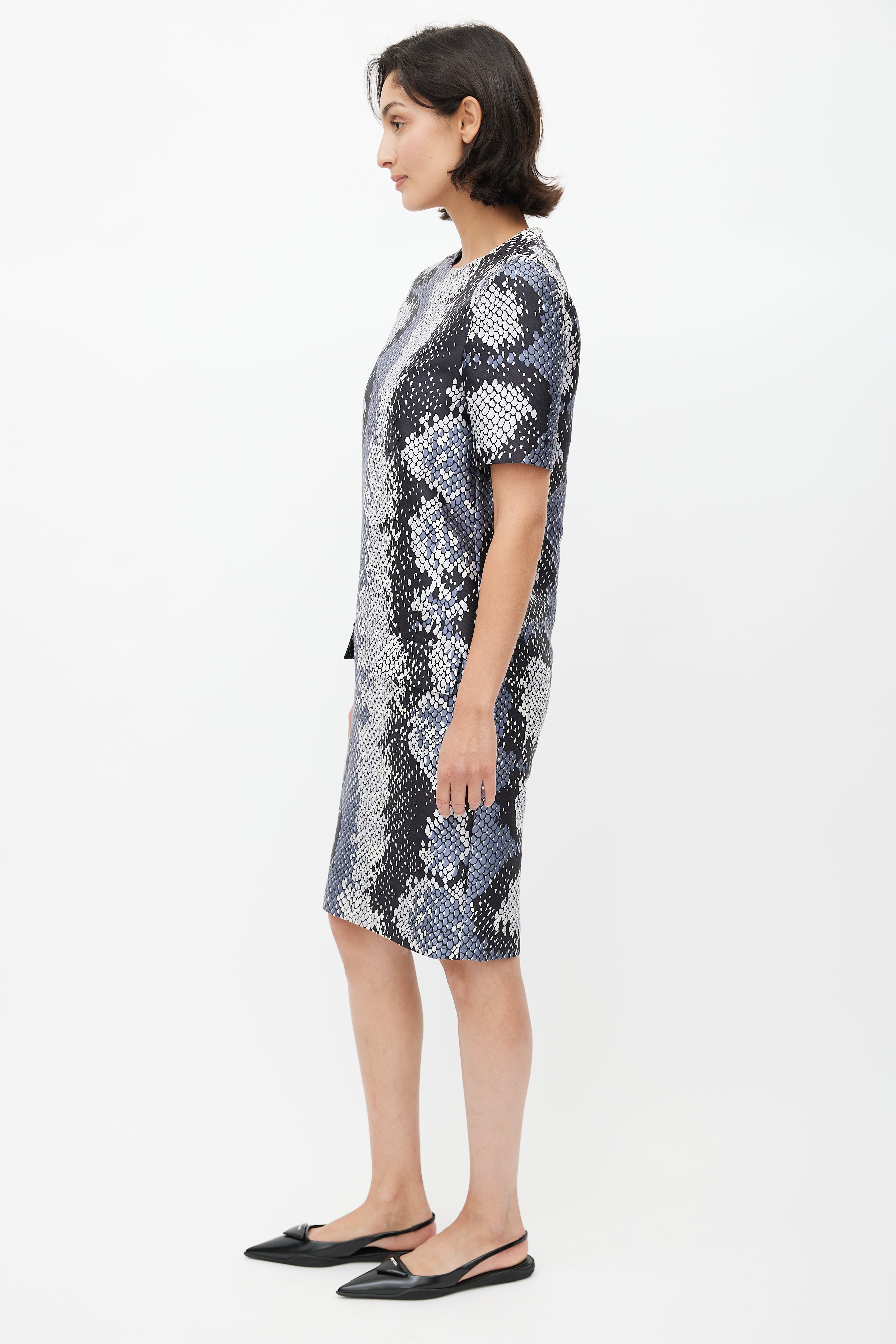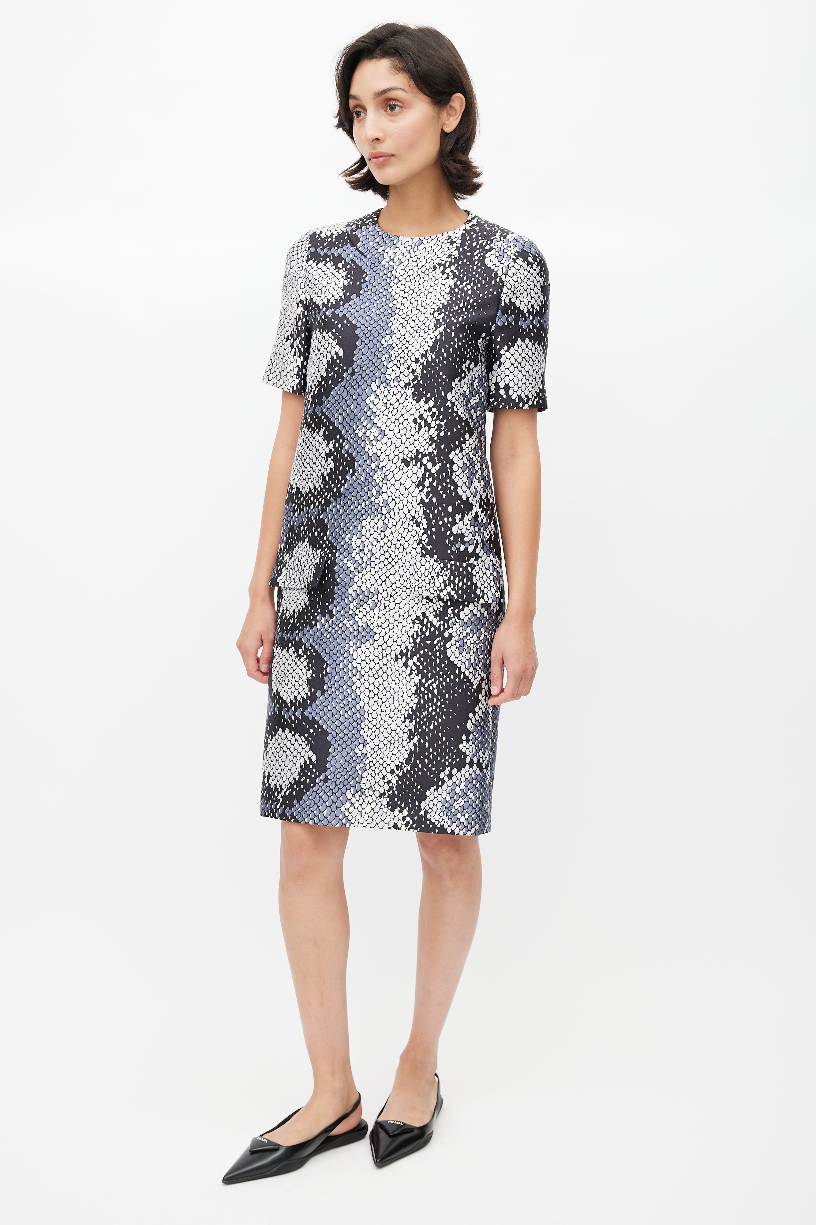 Pre-owned Prada black dress featuring a multicolour snakeskin print throughout, round neckline, short sleeves, two faux flap pockets at hip, and zip at back with hook and eye closure. Lined.