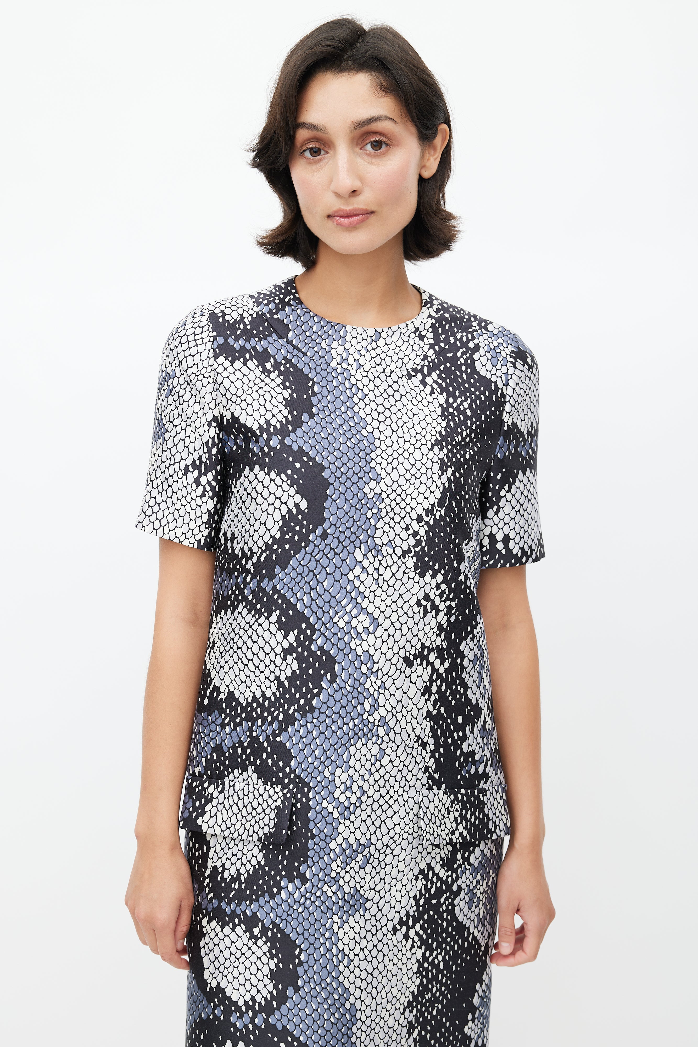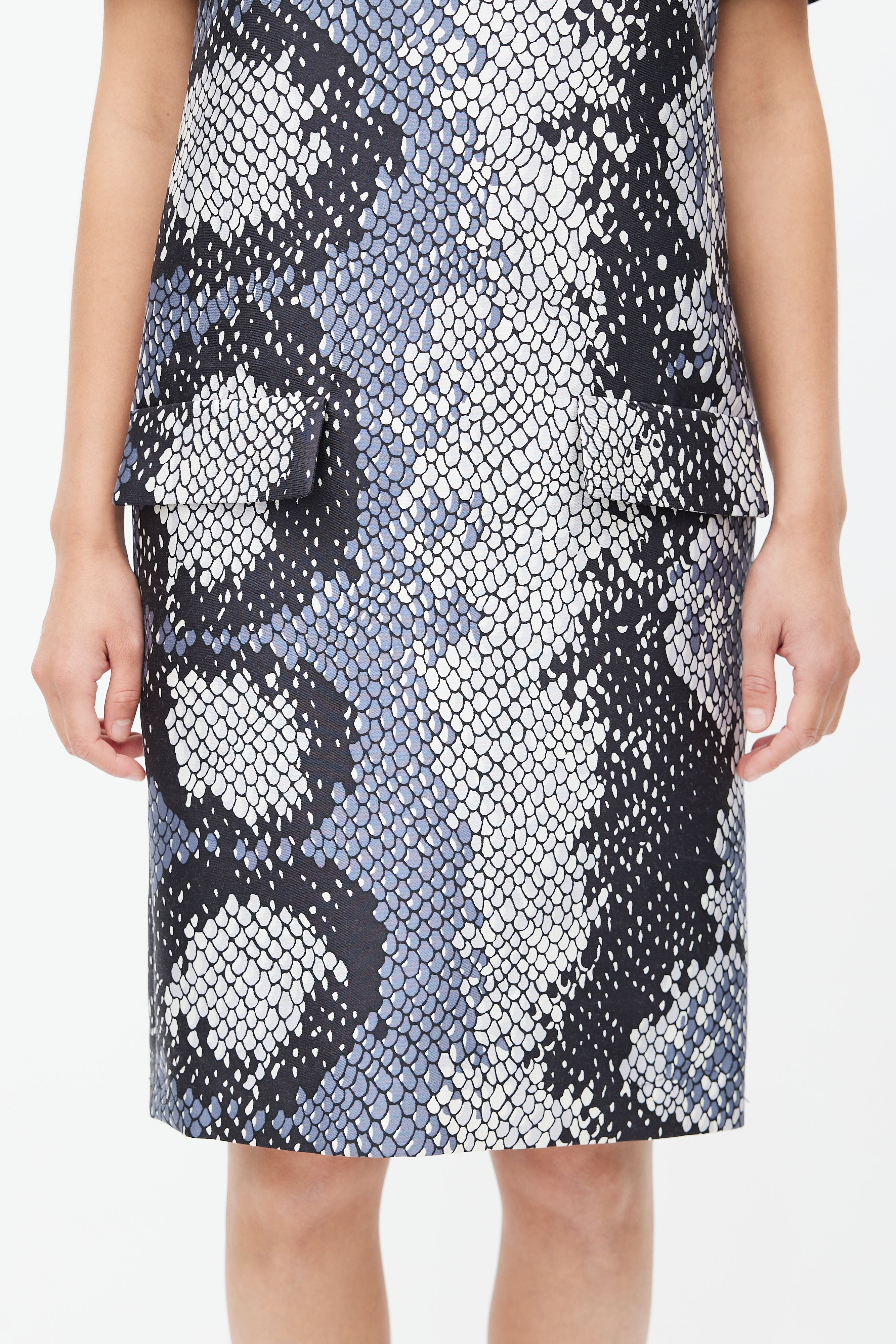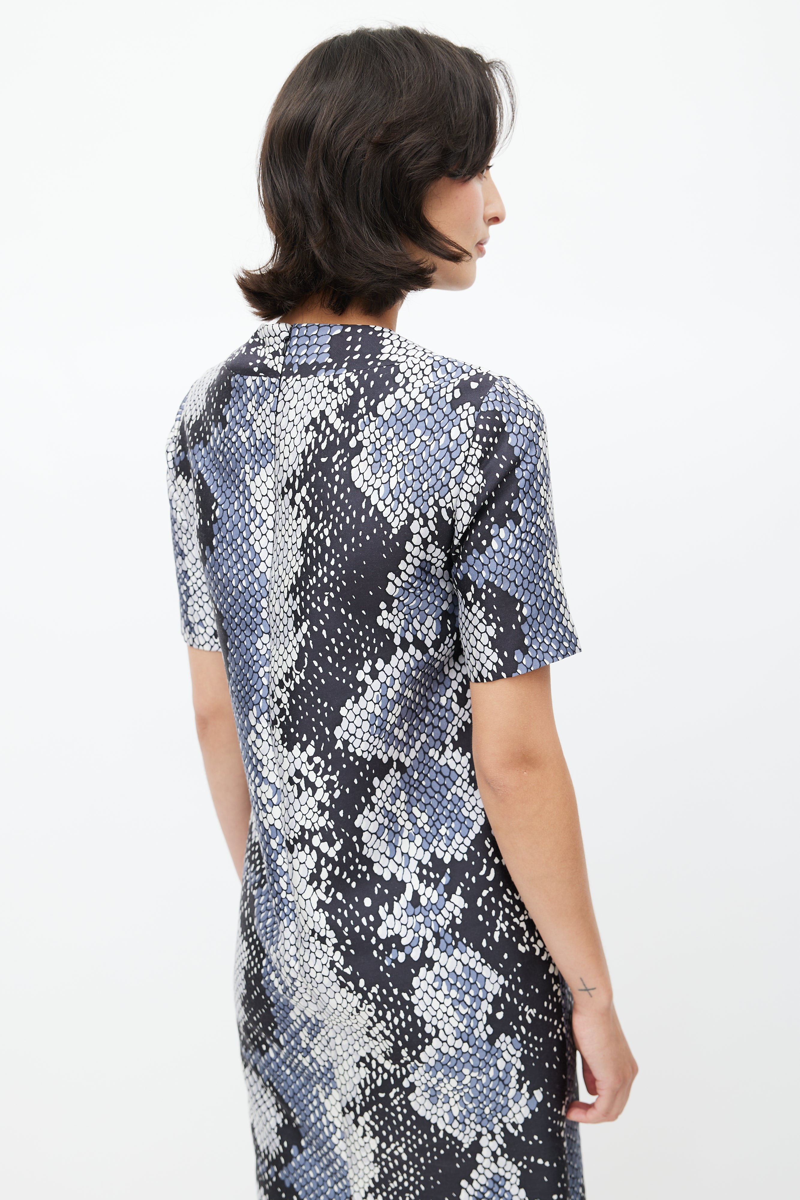 Pre-owned Prada black dress featuring a multicolour snakeskin print throughout, round neckline, short sleeves, two faux flap pockets at hip, and zip at back with hook and eye closure. Lined.