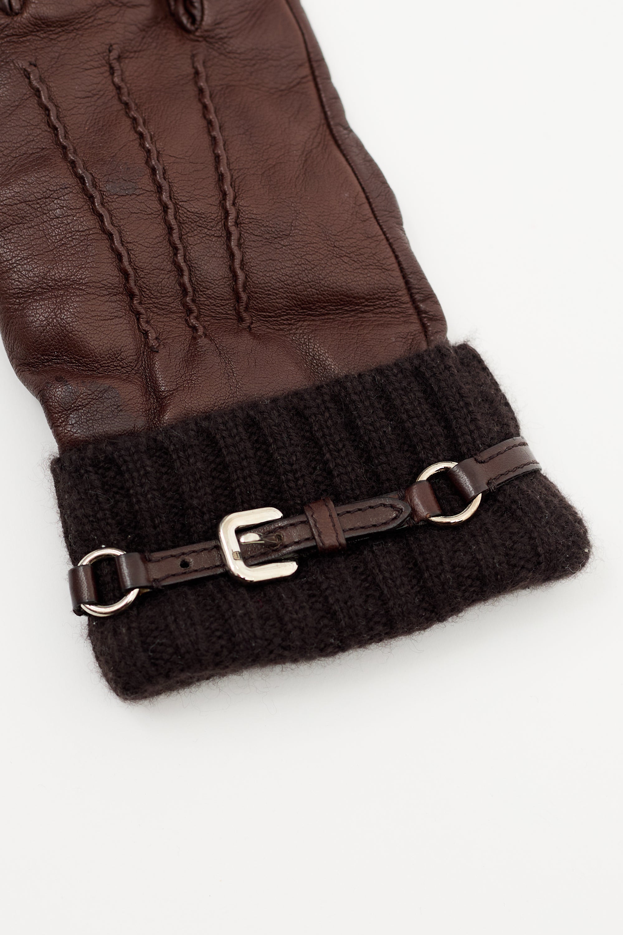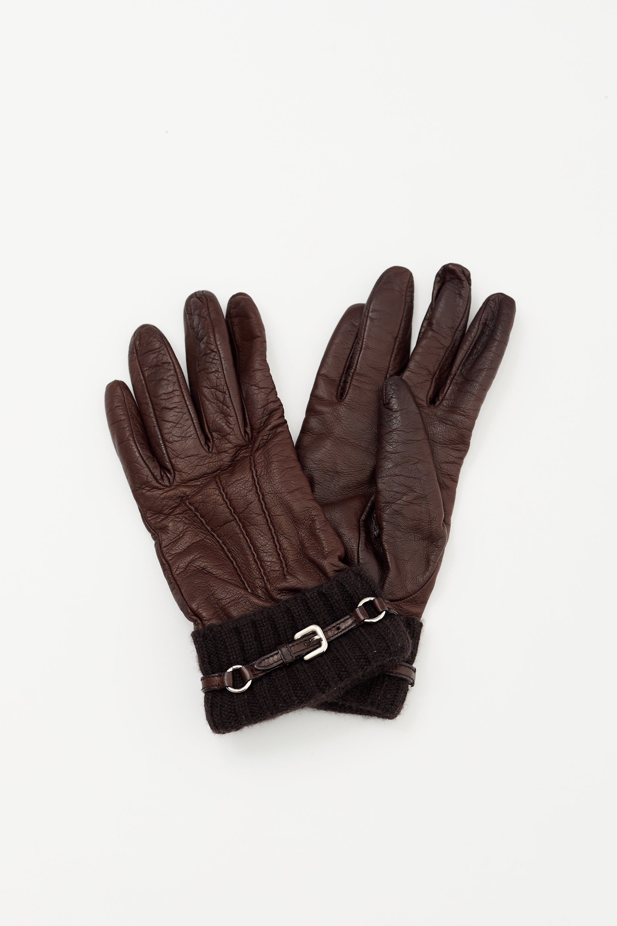 Pre-owned Prada dark brown leather gloves featuring rib knit cuffs and silver tone buckles at cuffs. Comes with original dust bag.