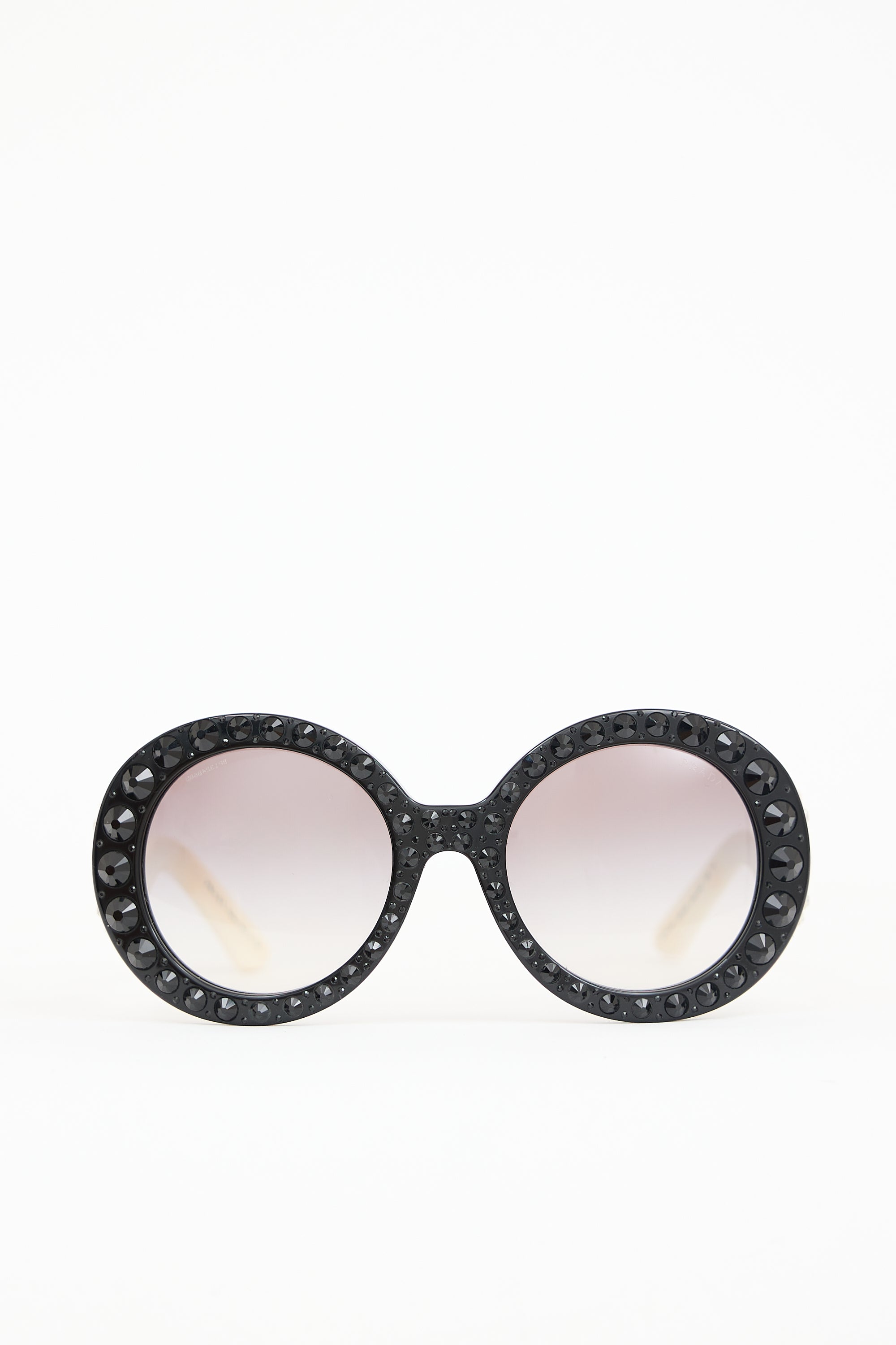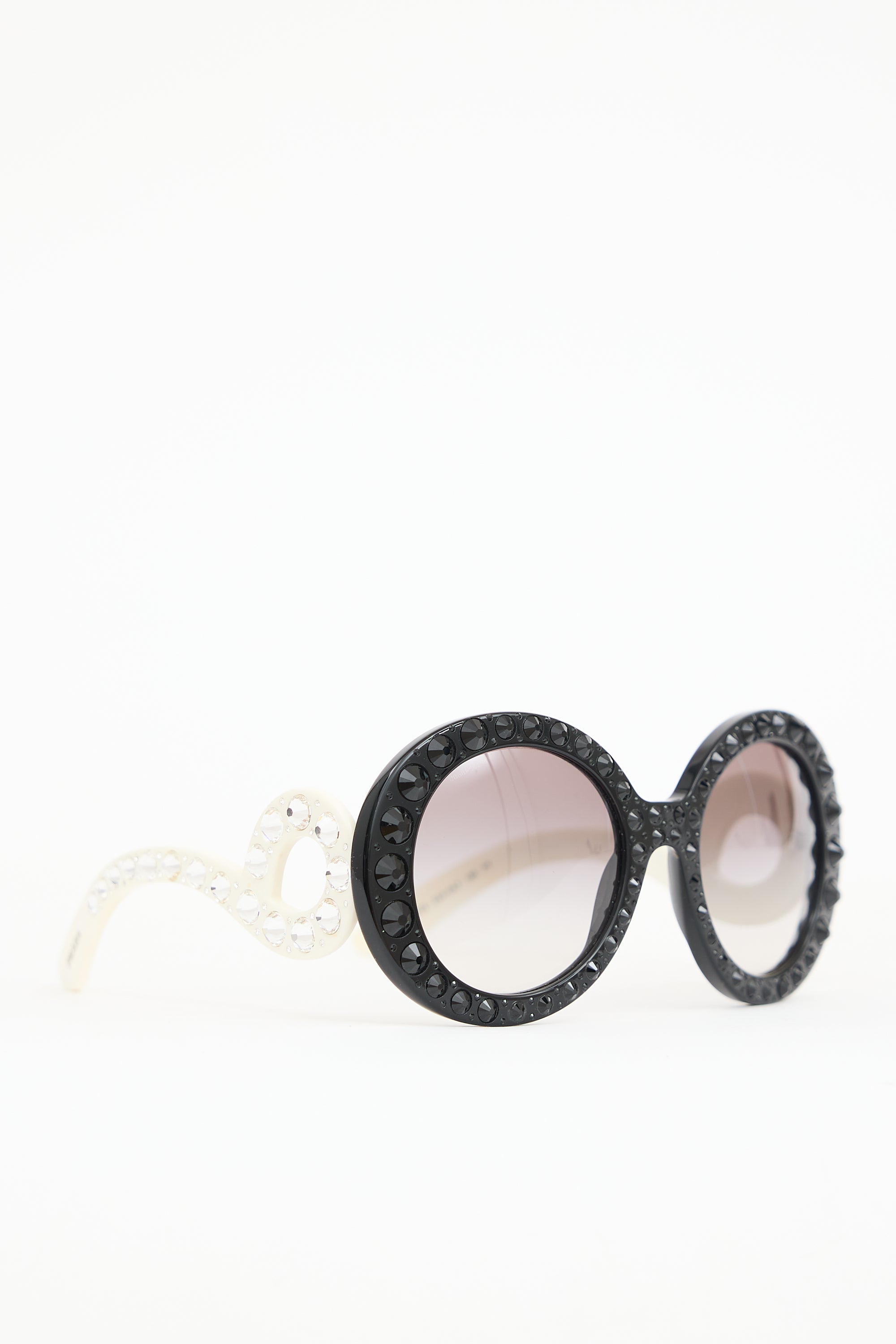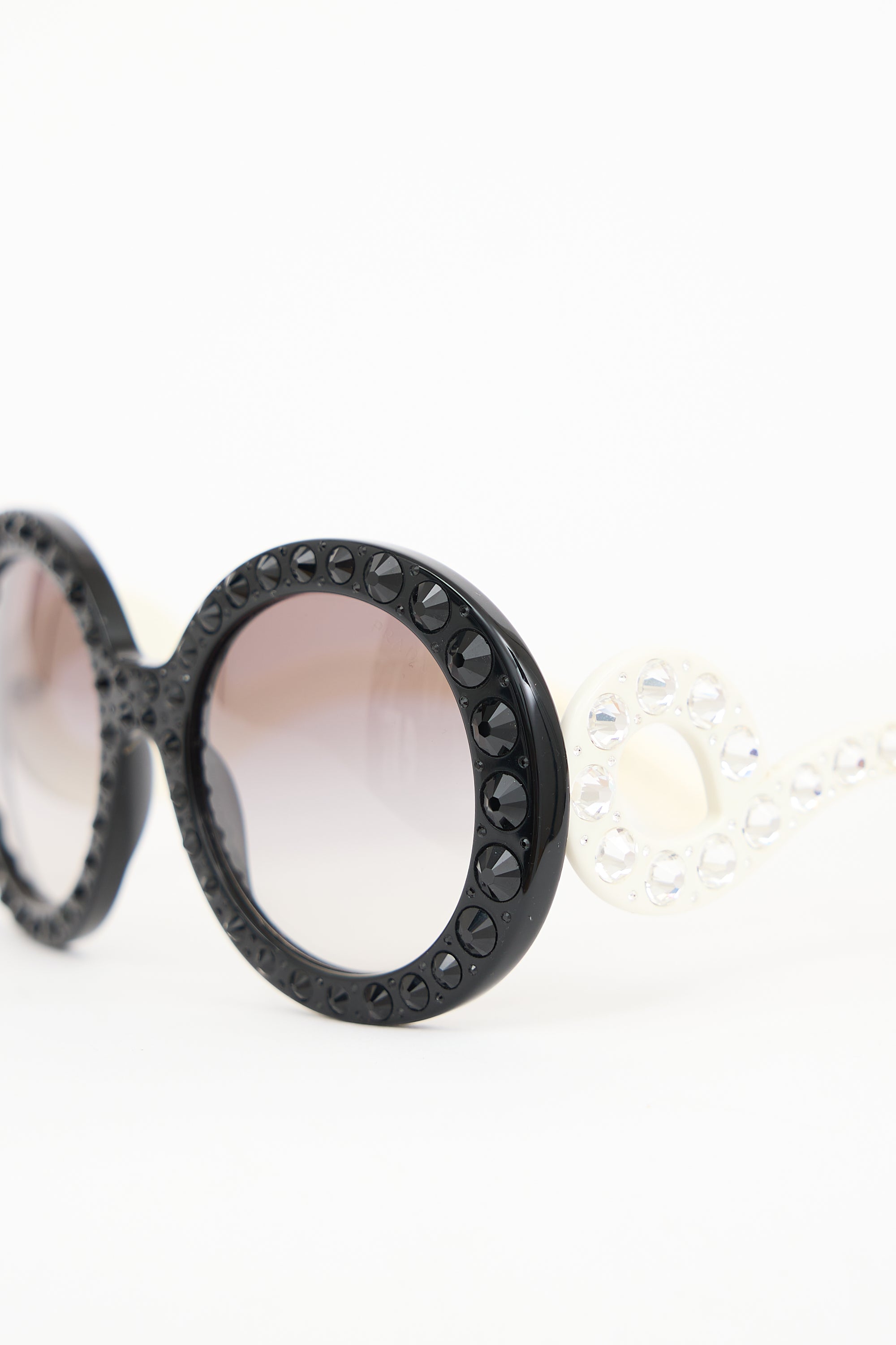 Pre-owned Prada SPR 31P sunglasses featuring grey gradient tinted lenses, black acetate round frame, sculptural white acetate arms, tonal crystal embellishment, and inset silver tone logo at arm tips.
