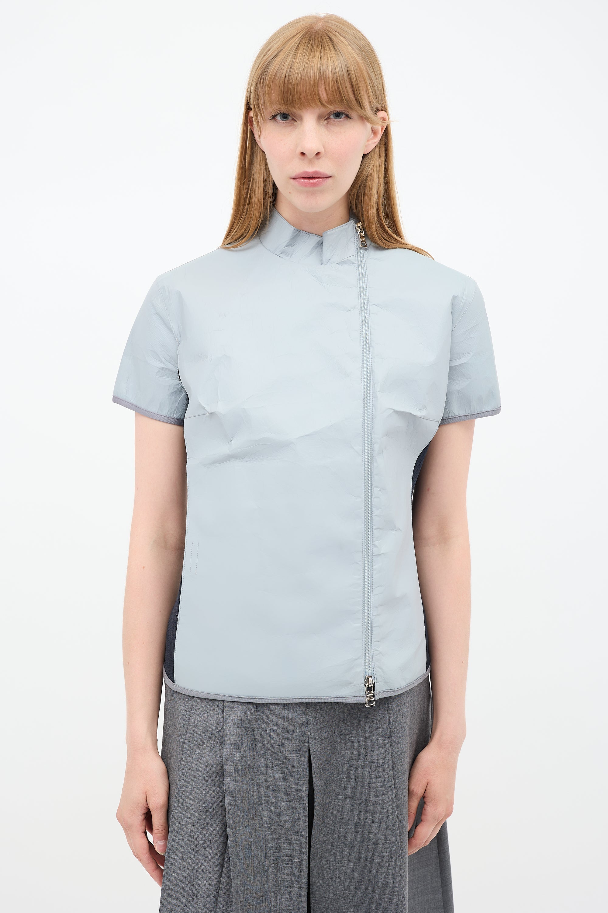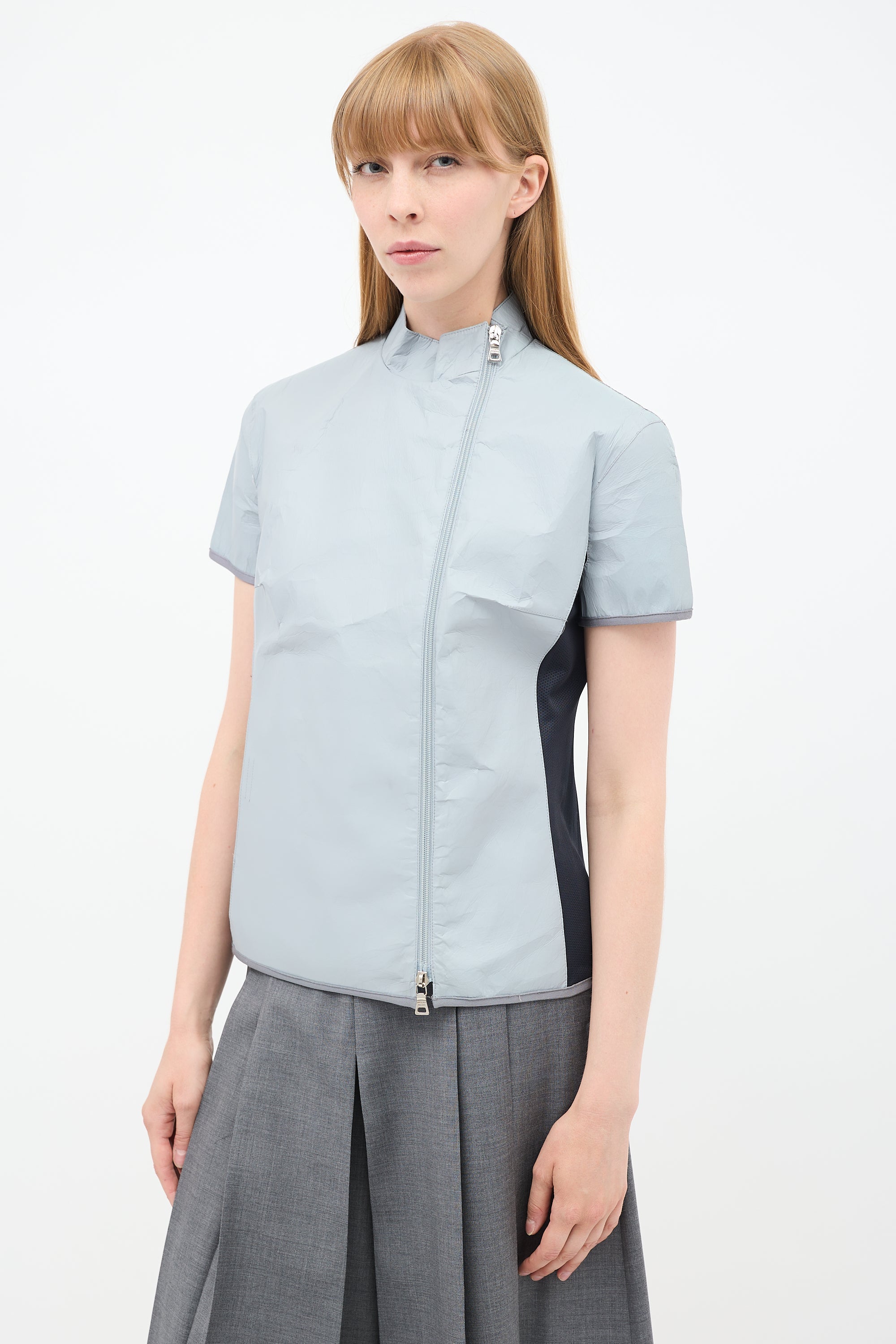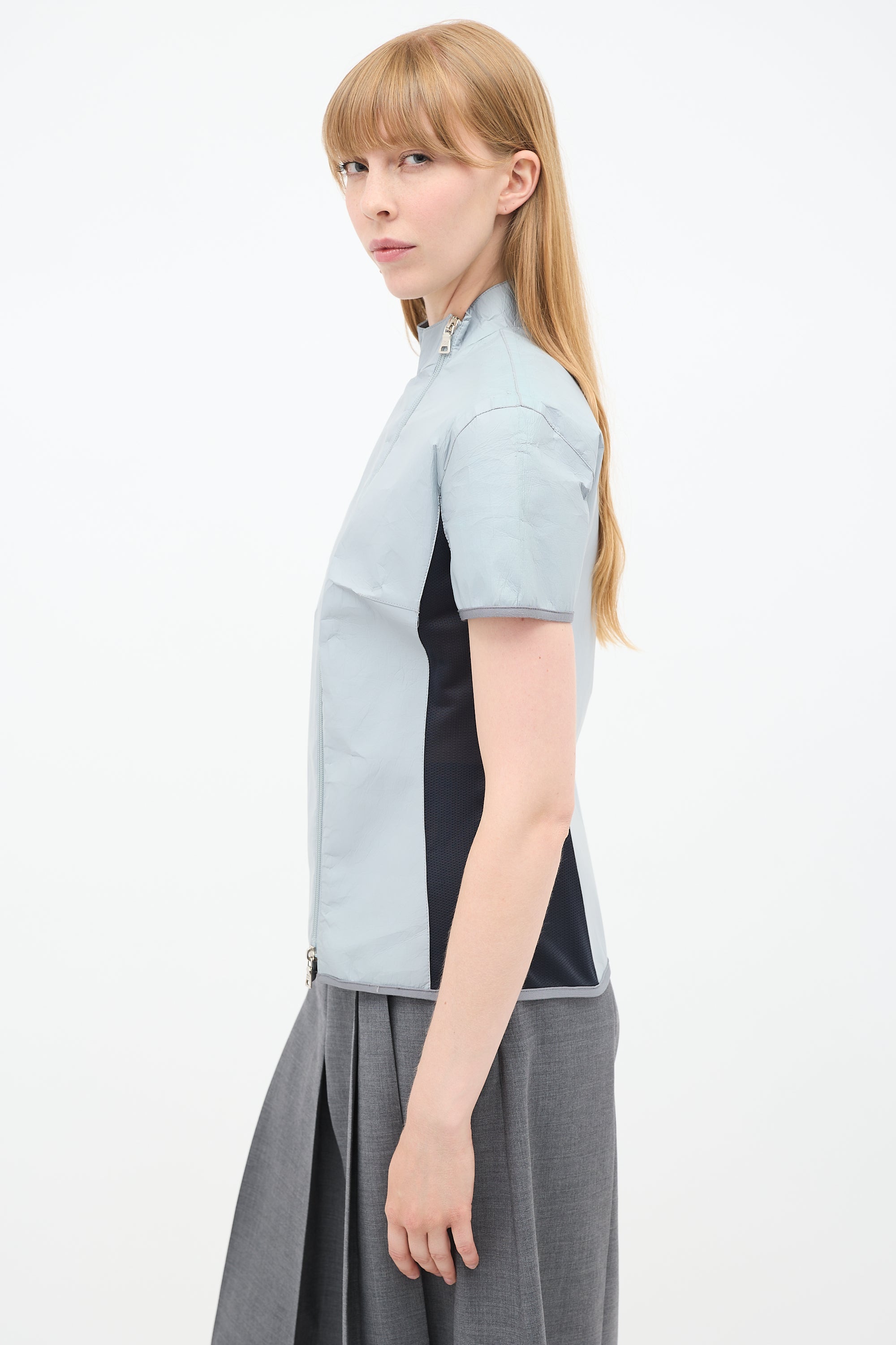 Pre-owned Prada SS 1999 blue top featuring two way zip up front, mock collar, short sleeves, and navy mesh sides. Look 48 from the collection.