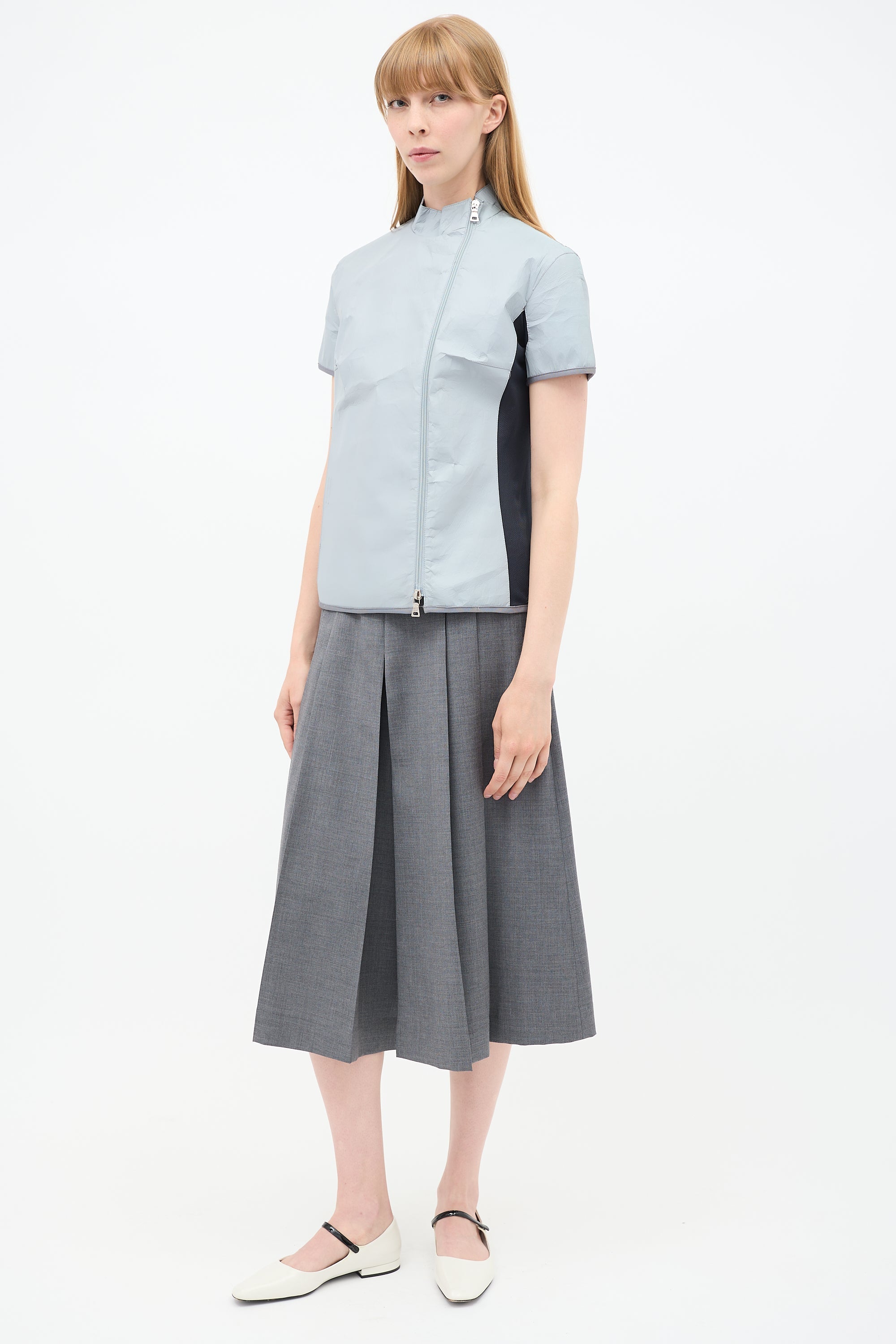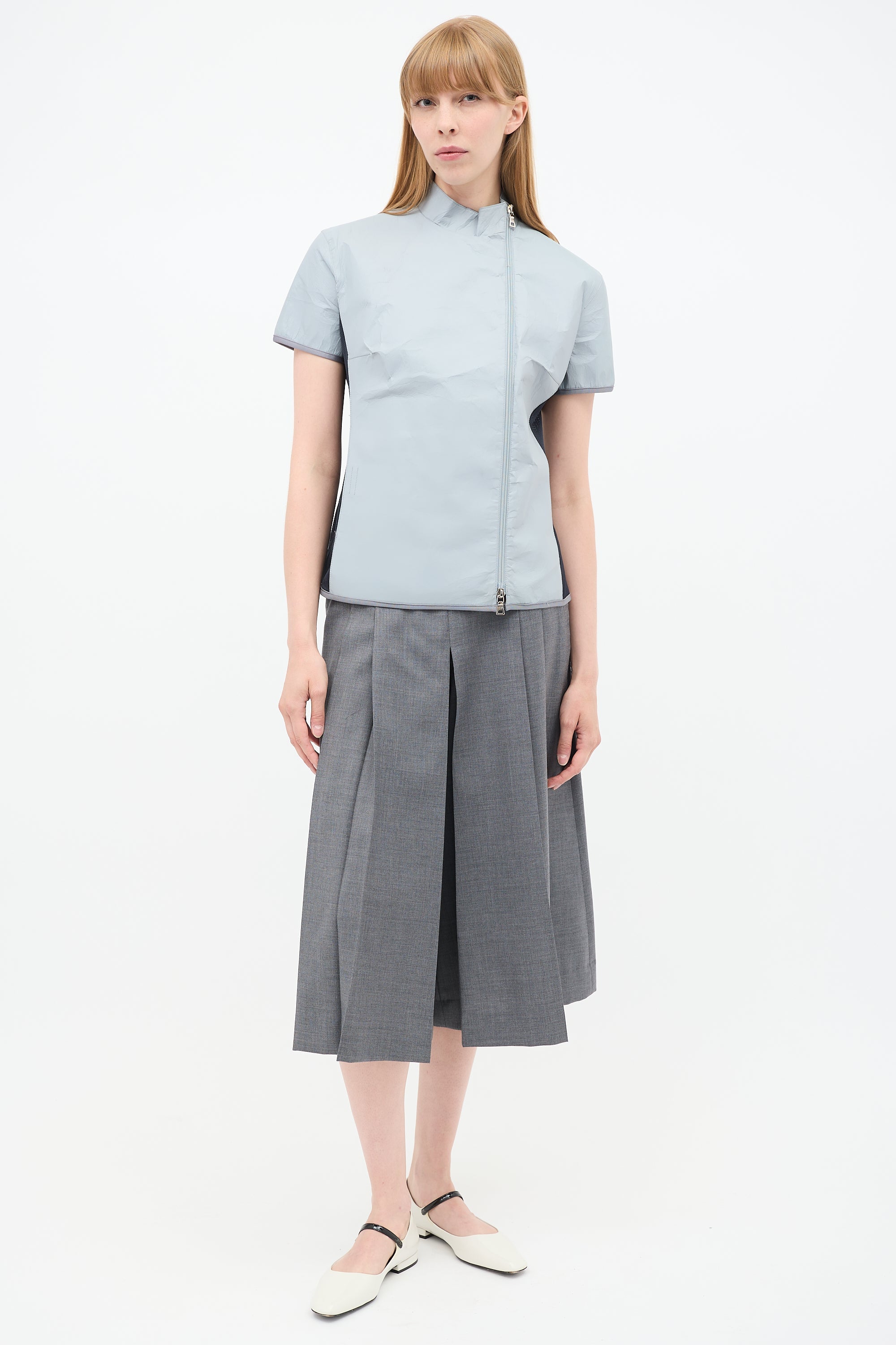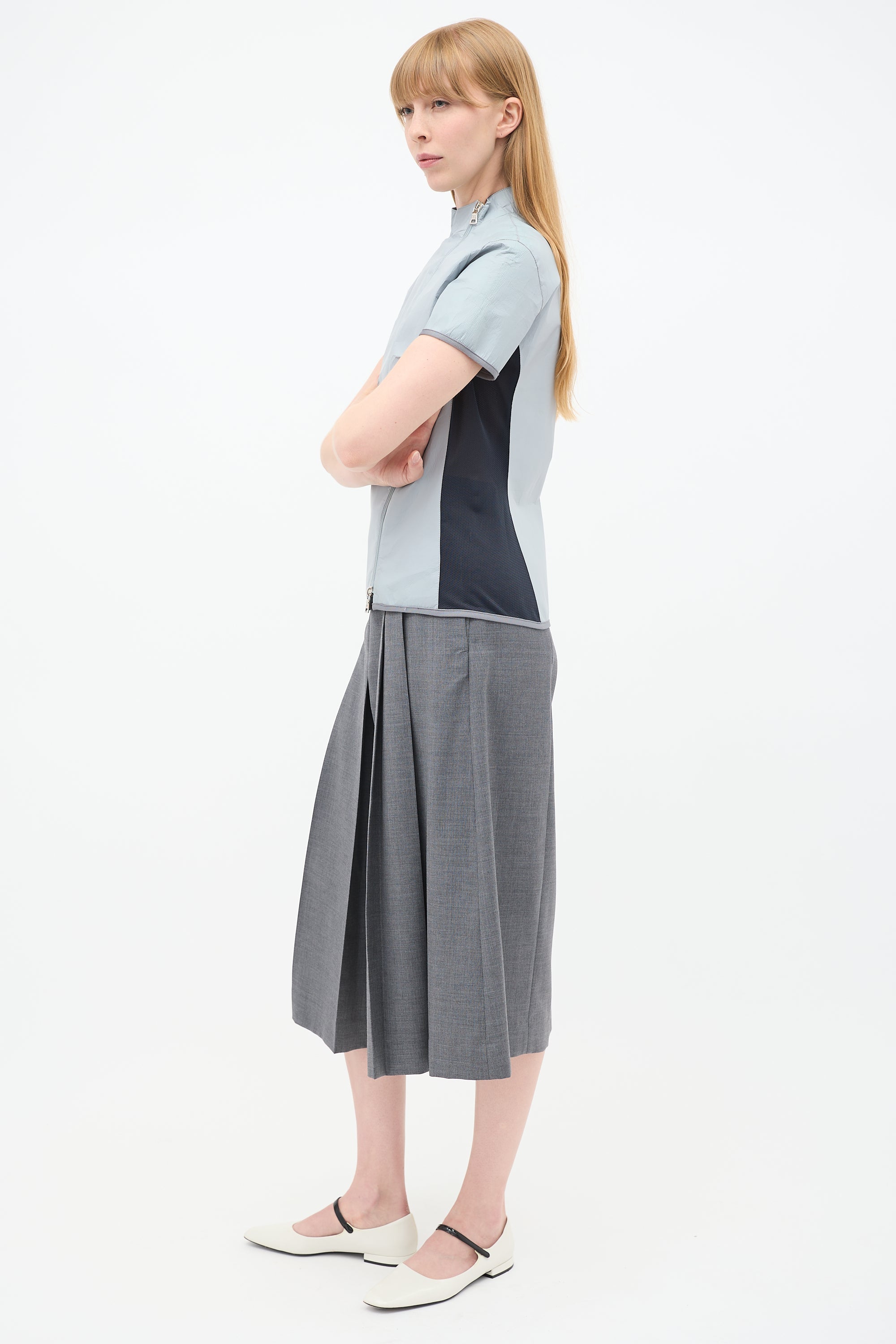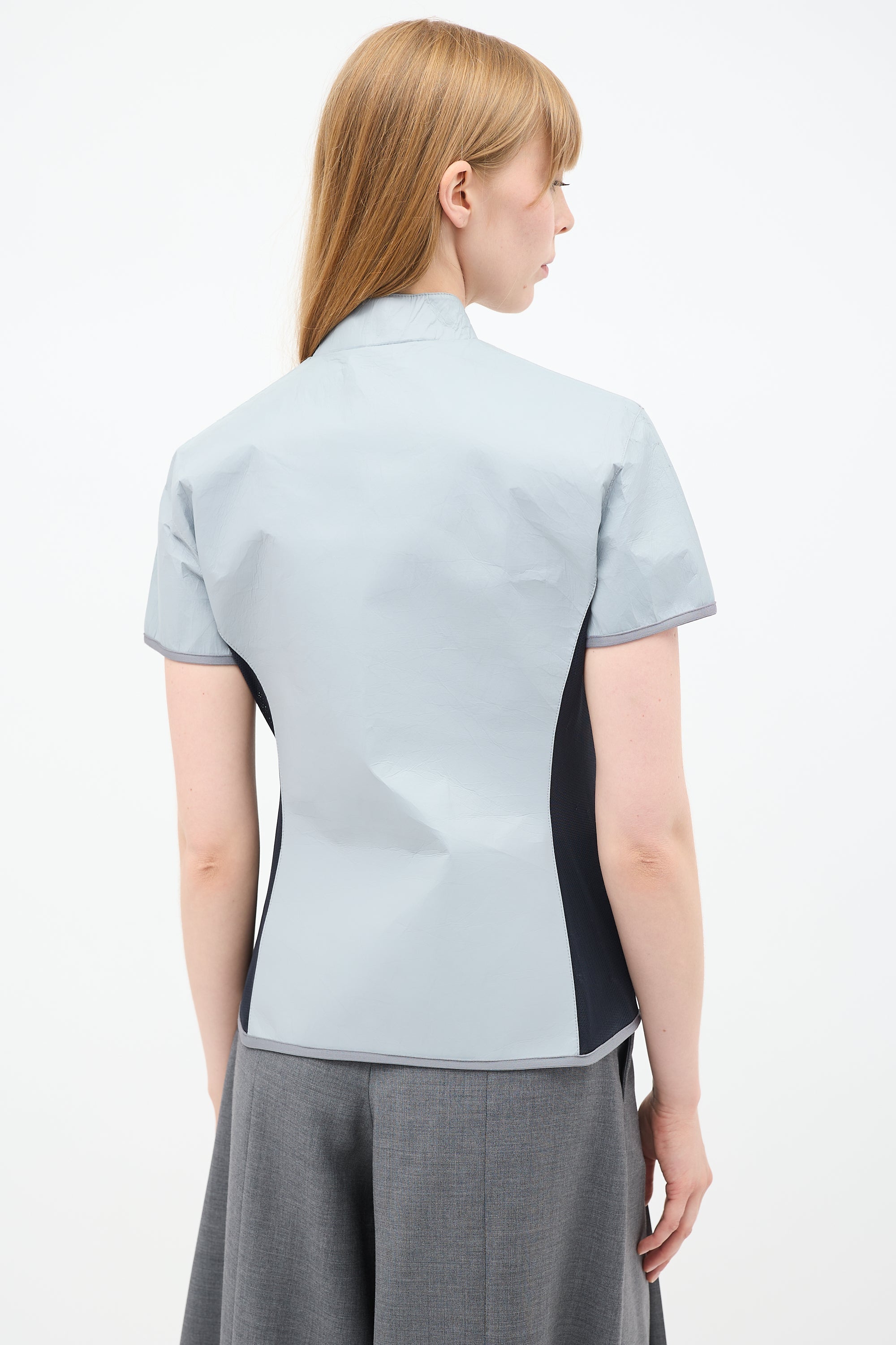 Pre-owned Prada SS 1999 blue top featuring two way zip up front, mock collar, short sleeves, and navy mesh sides. Look 48 from the collection.