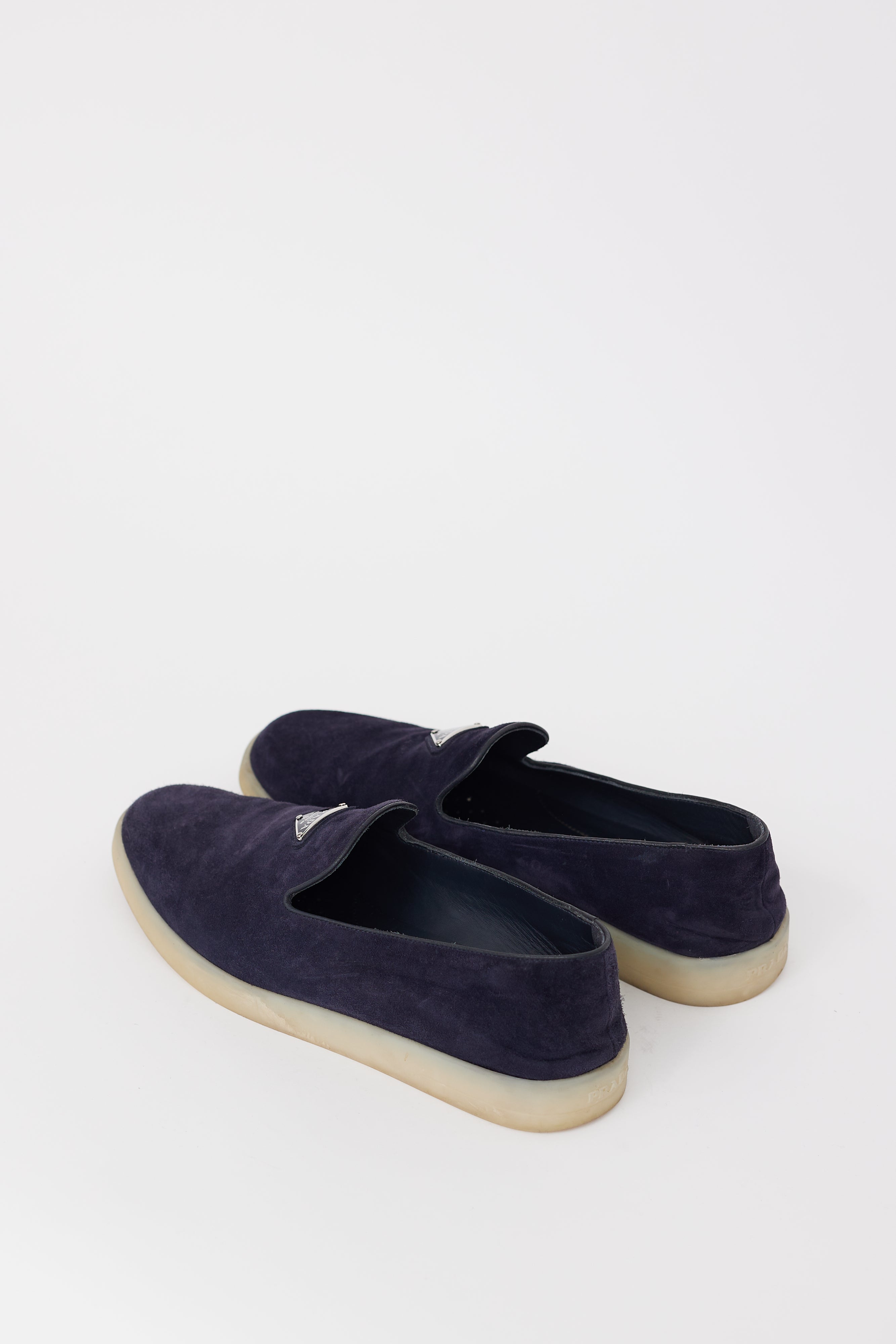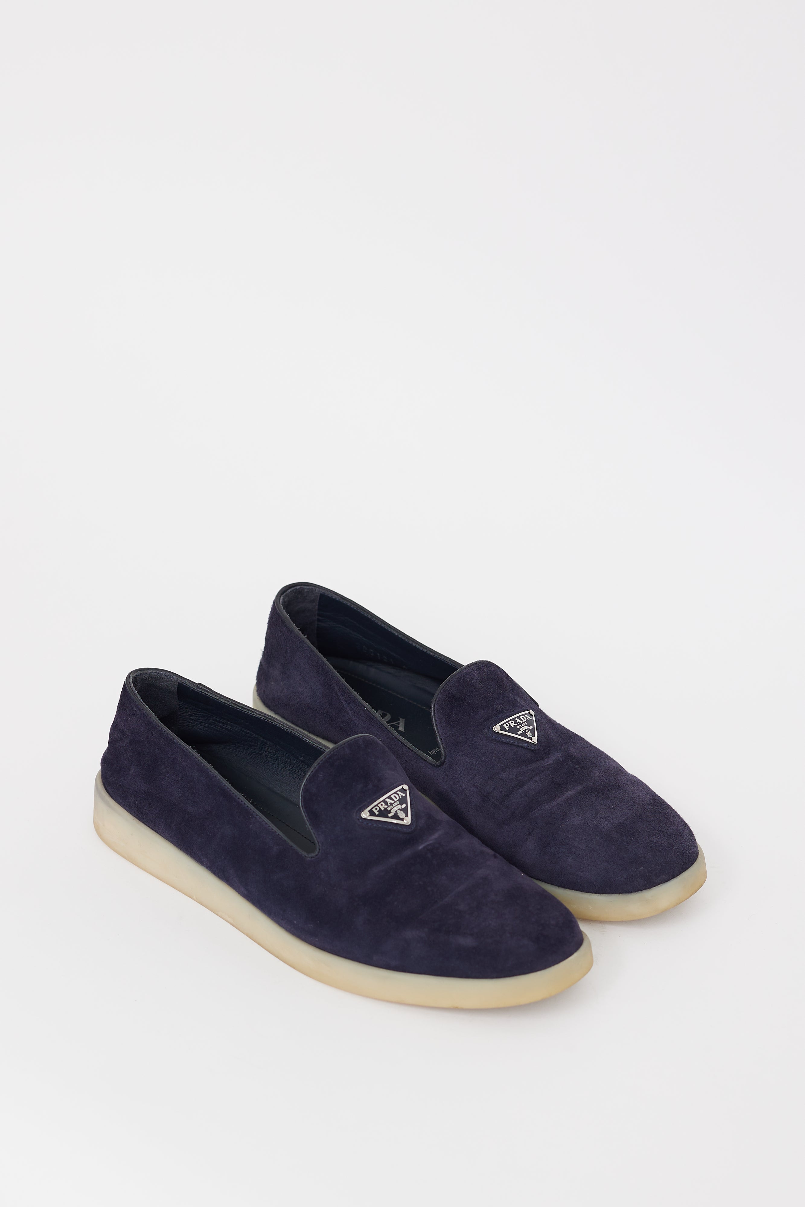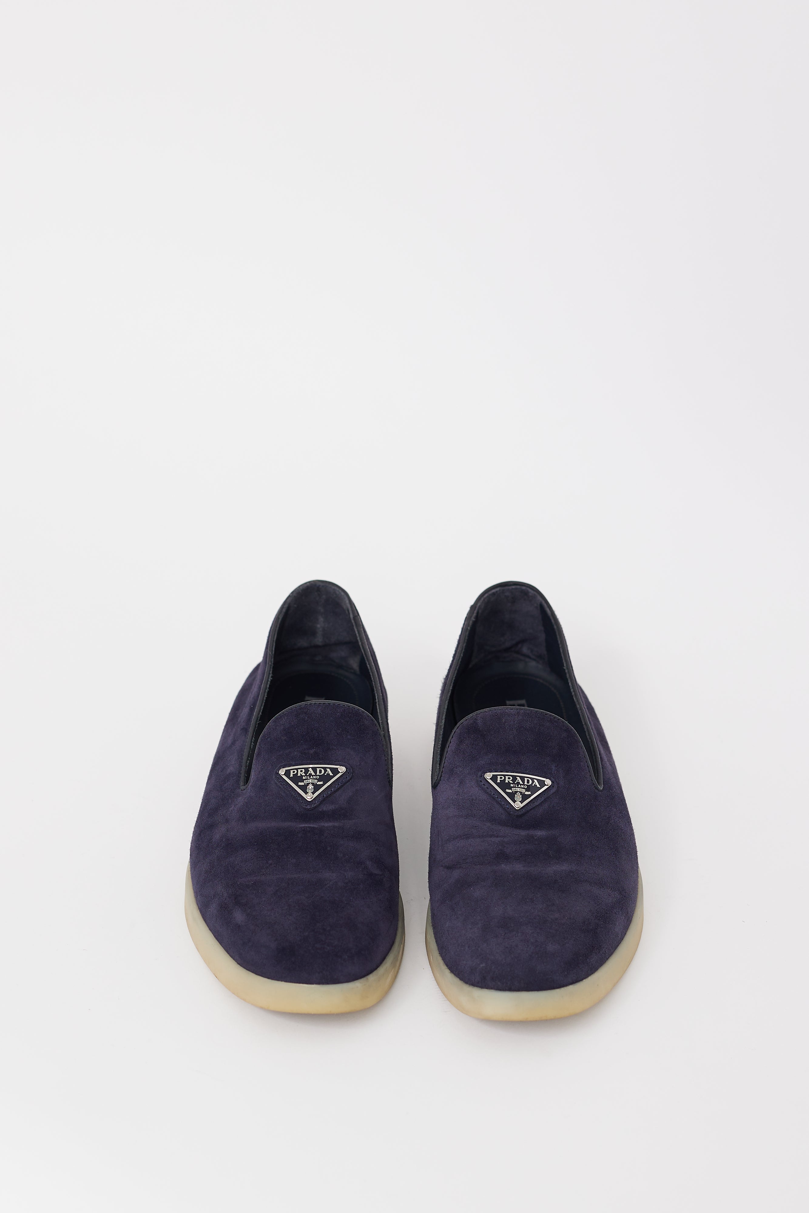 Pre-owned Prada Spring/Summer 2023 navy suede loafers featuring a wide tapered square toe, notched topline, front black enamel and silver tone metal triangle logo plaque, and beige rubber sole with embossed logo at counter. Comes with original dust bag.