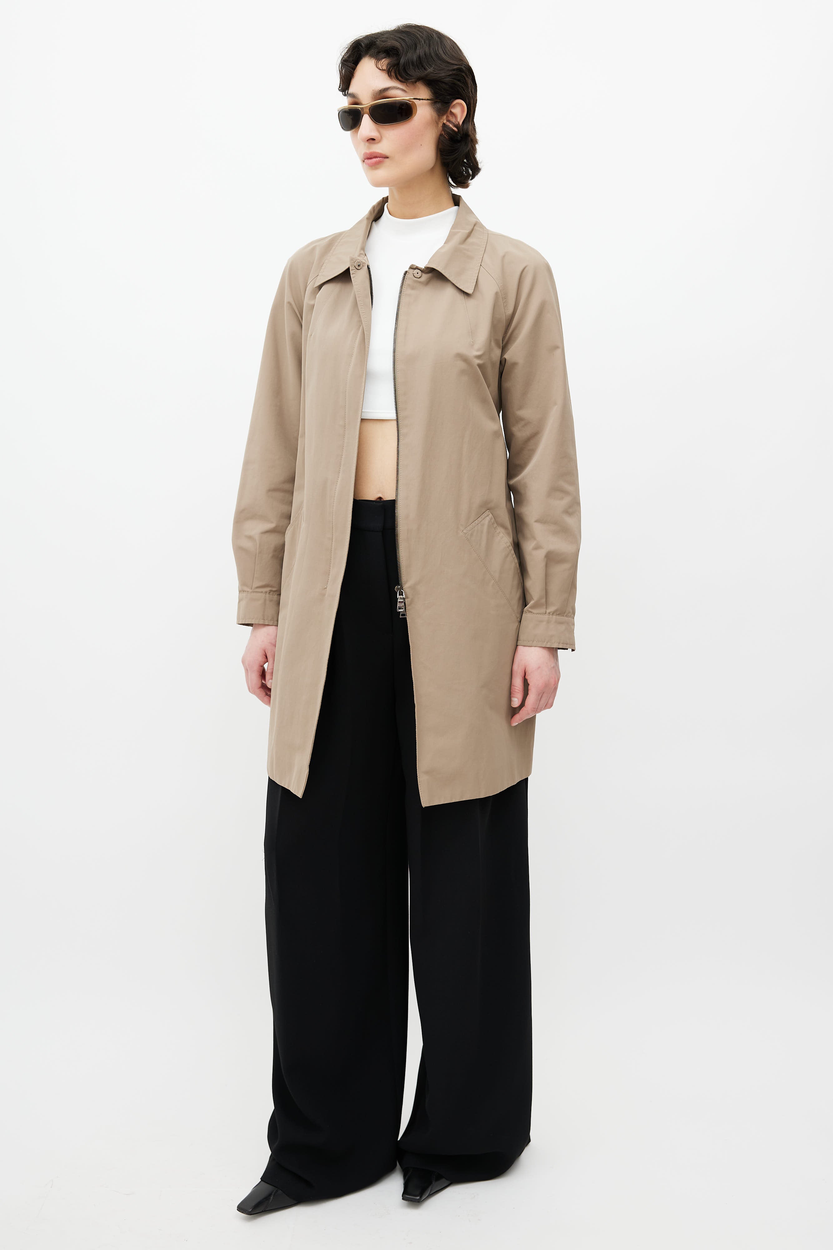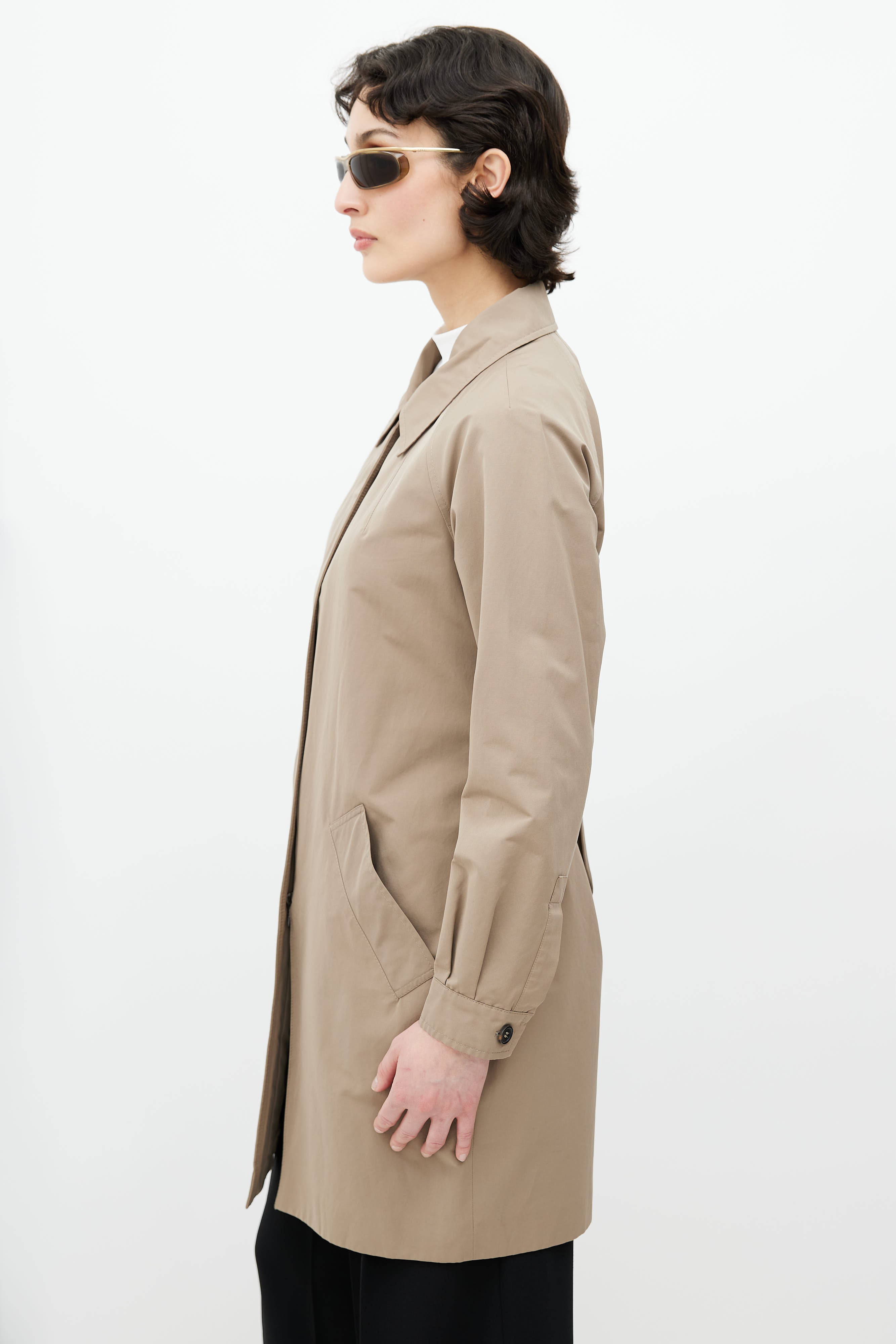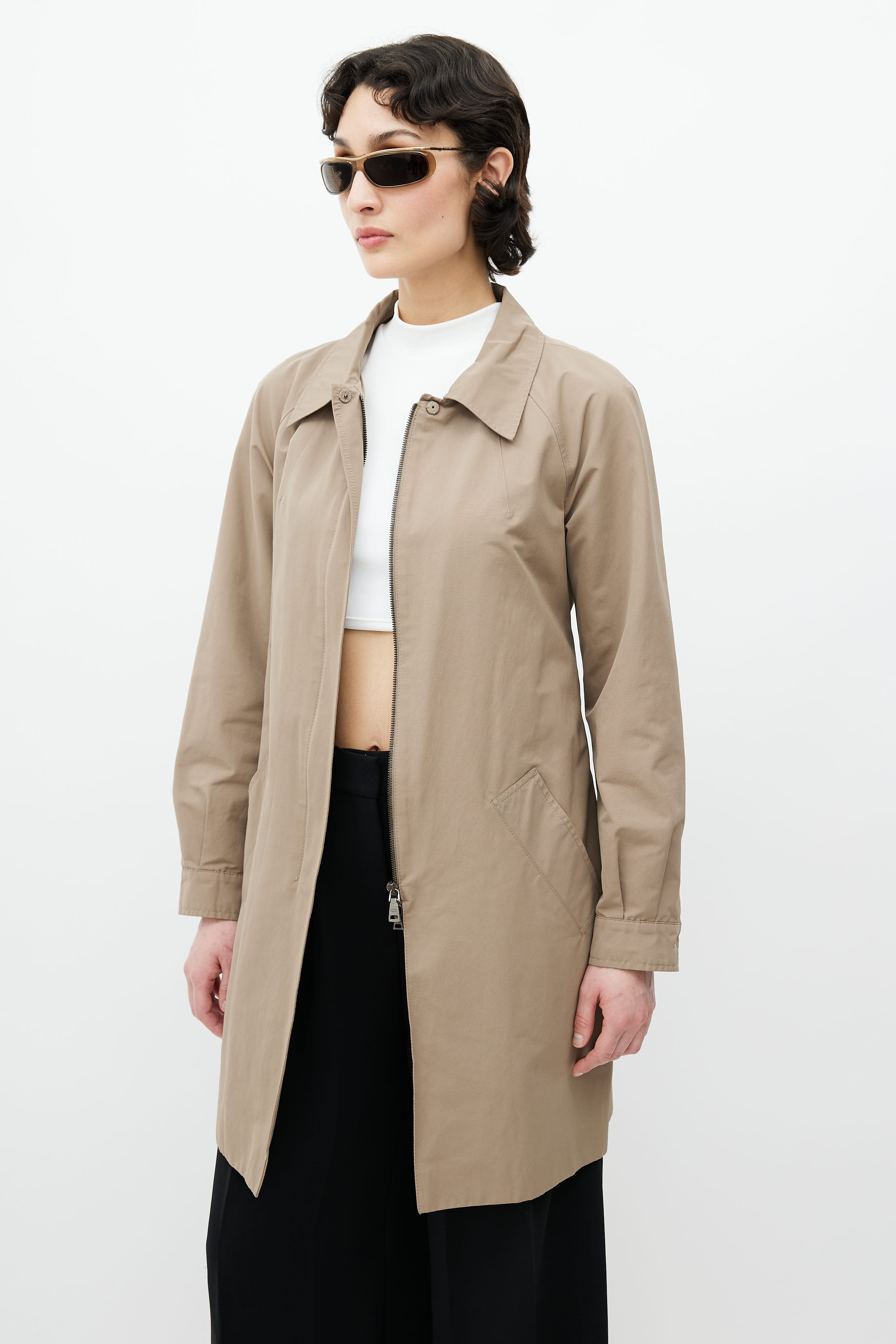 Pre-owned Prada taupe trench coat featuring pointed collar, raglan shoulders, buttoned cuffs, darting at front and back, two slash pockets at hip, tied detail at back, and concealed zip up closure. Lined.