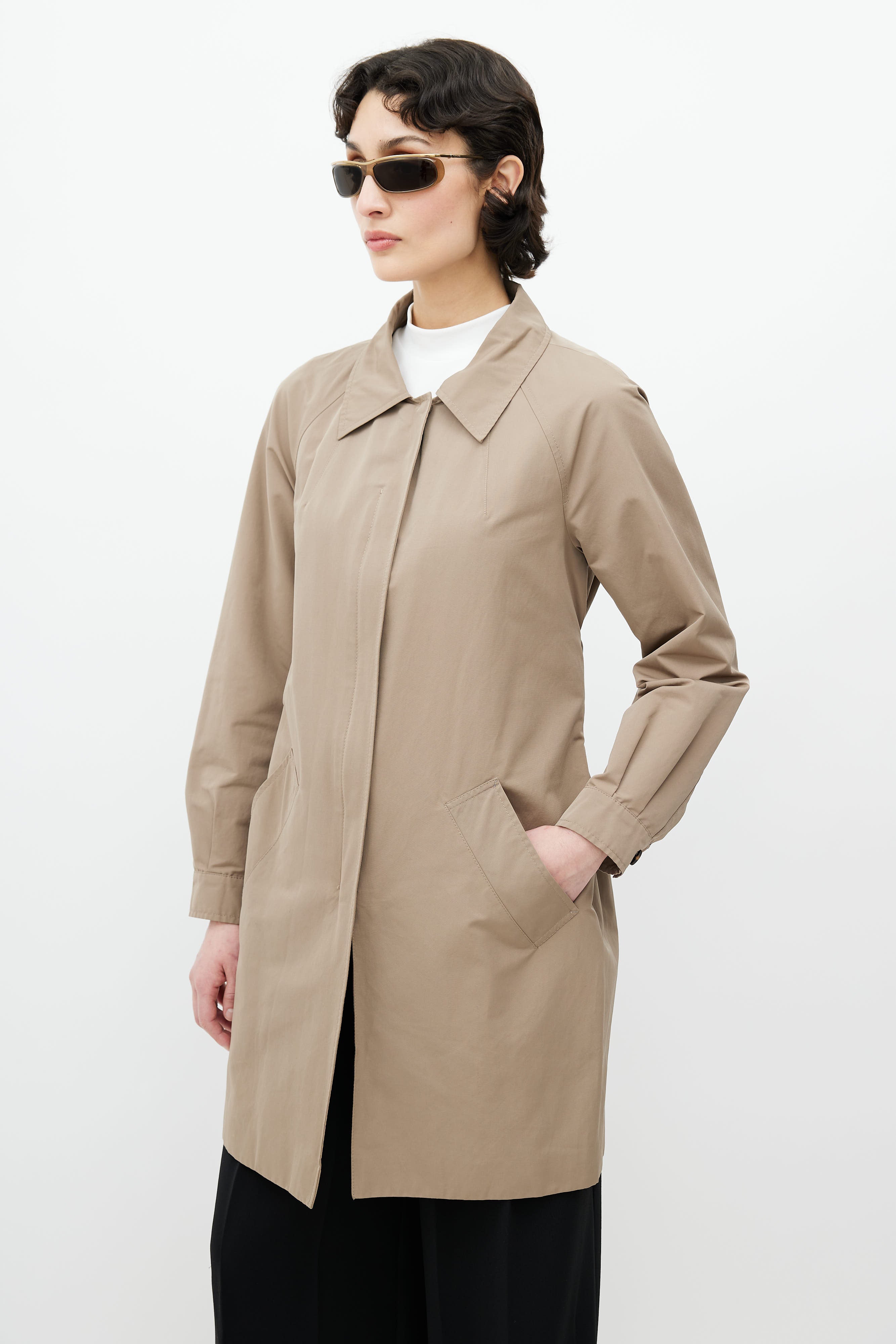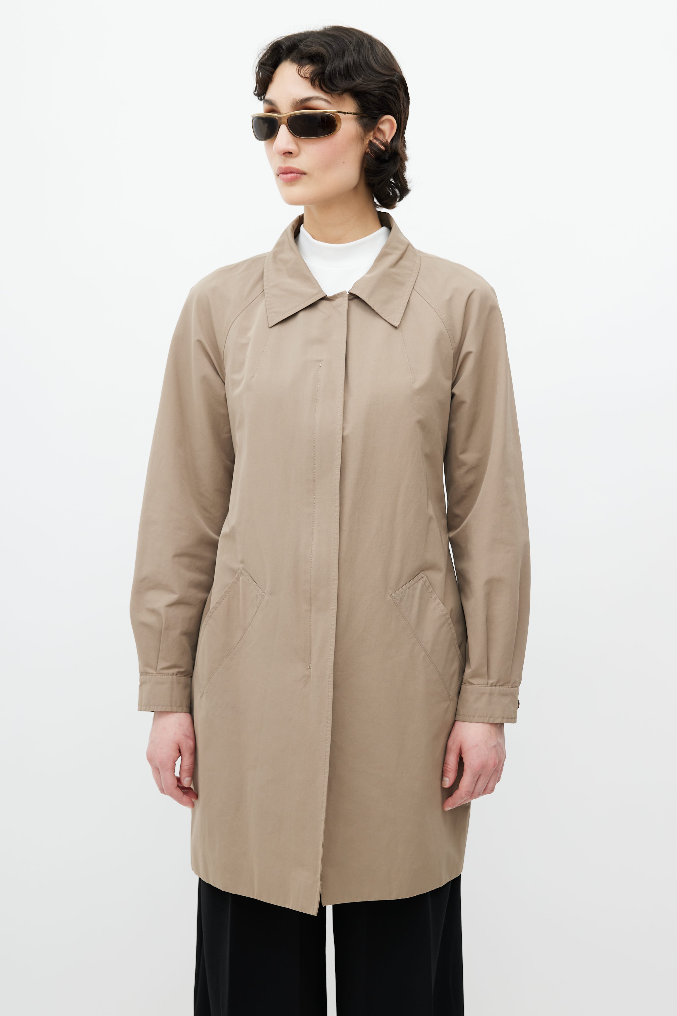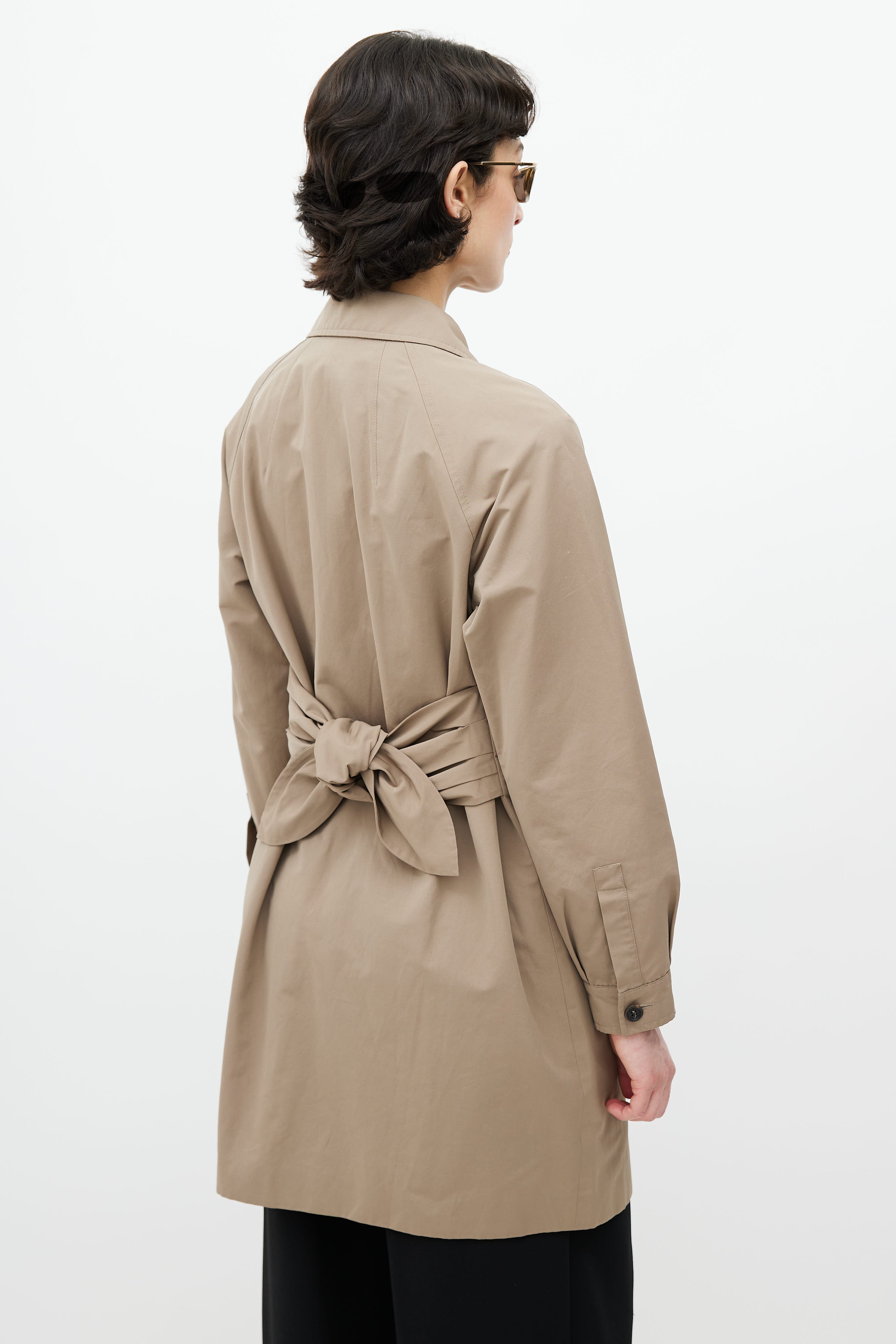 Pre-owned Prada taupe trench coat featuring pointed collar, raglan shoulders, buttoned cuffs, darting at front and back, two slash pockets at hip, tied detail at back, and concealed zip up closure. Lined.